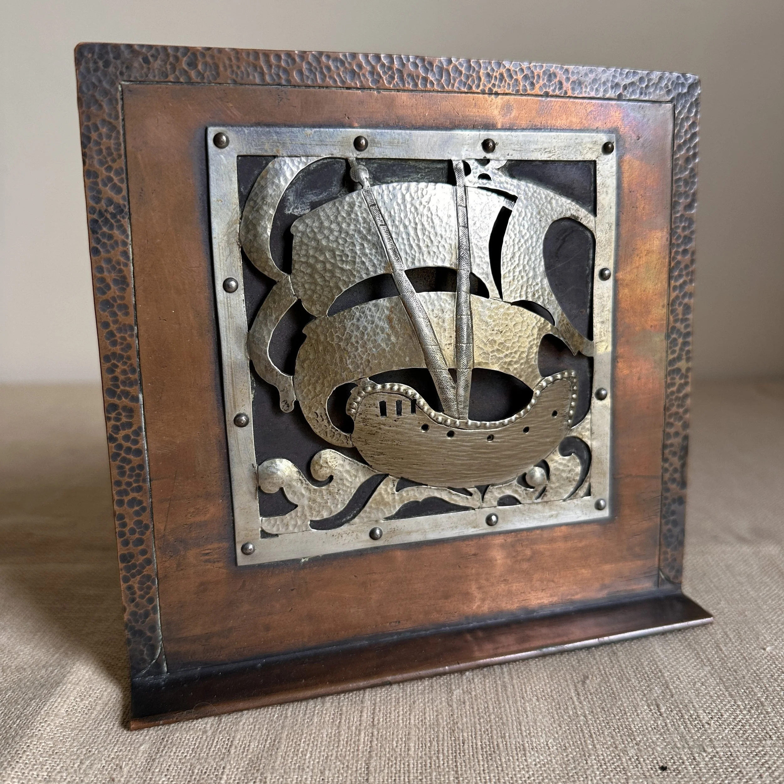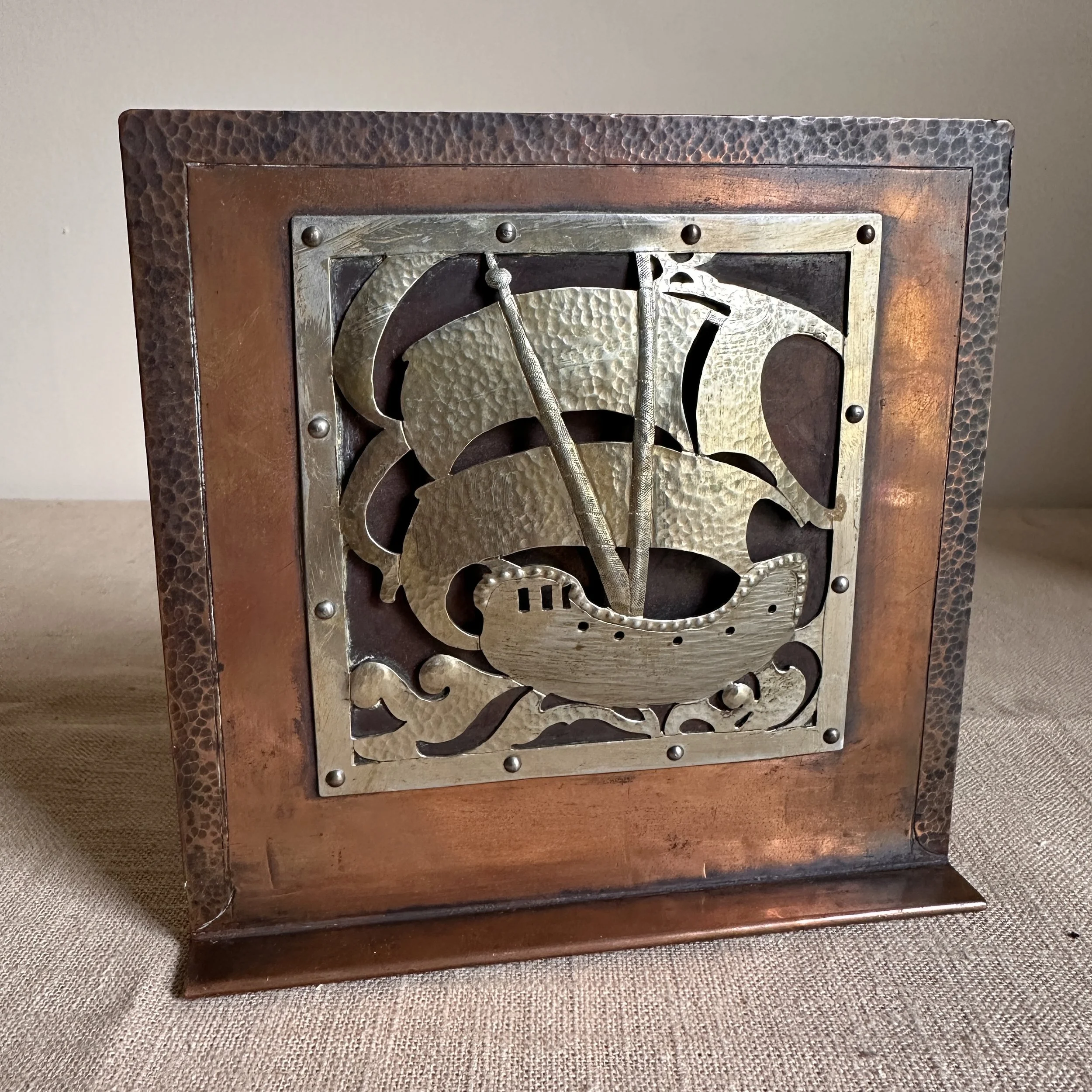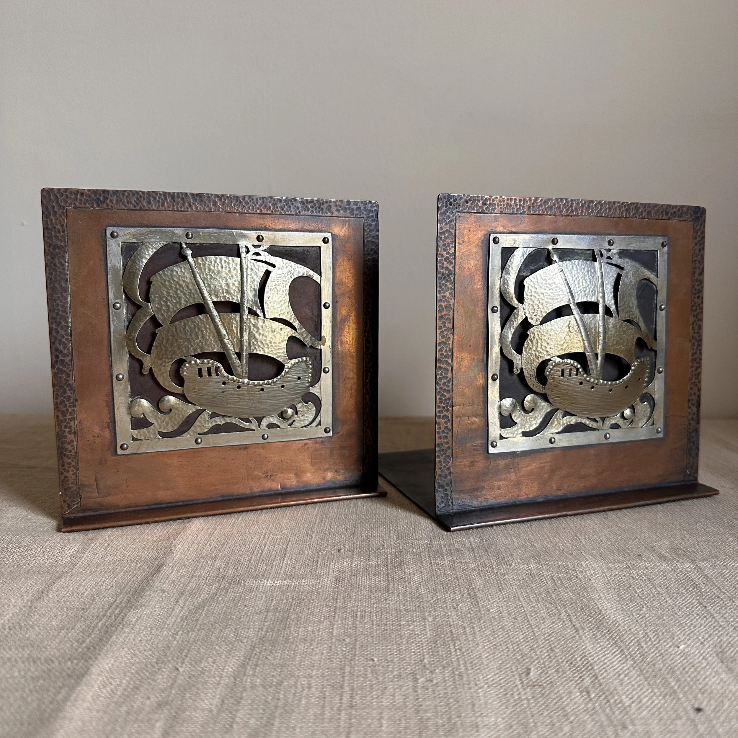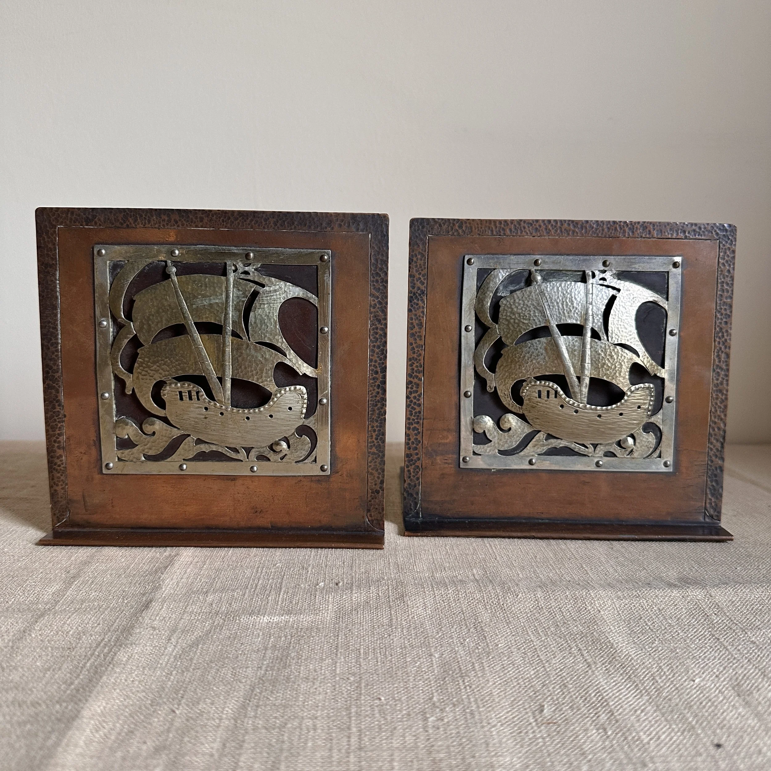 Arts & Crafts bookends circa 1910. A large and heavy pair of hammered copper bookends, each with a raised and hand cut galleon in hammered German silver. Beautifully crafted and finished, excellent condition. Unsigned. Measure 6” high, 6” wide and 5” deep. SOLD