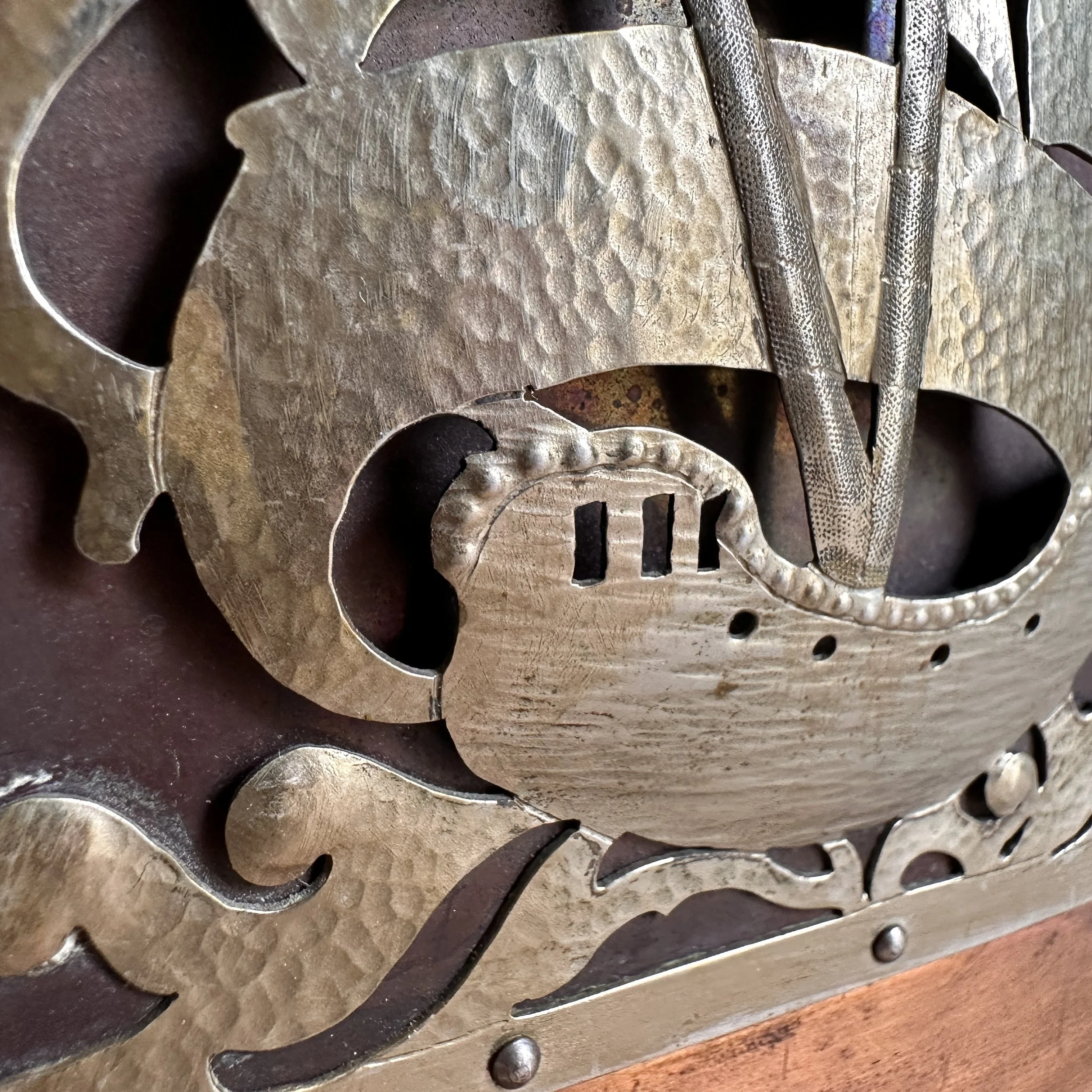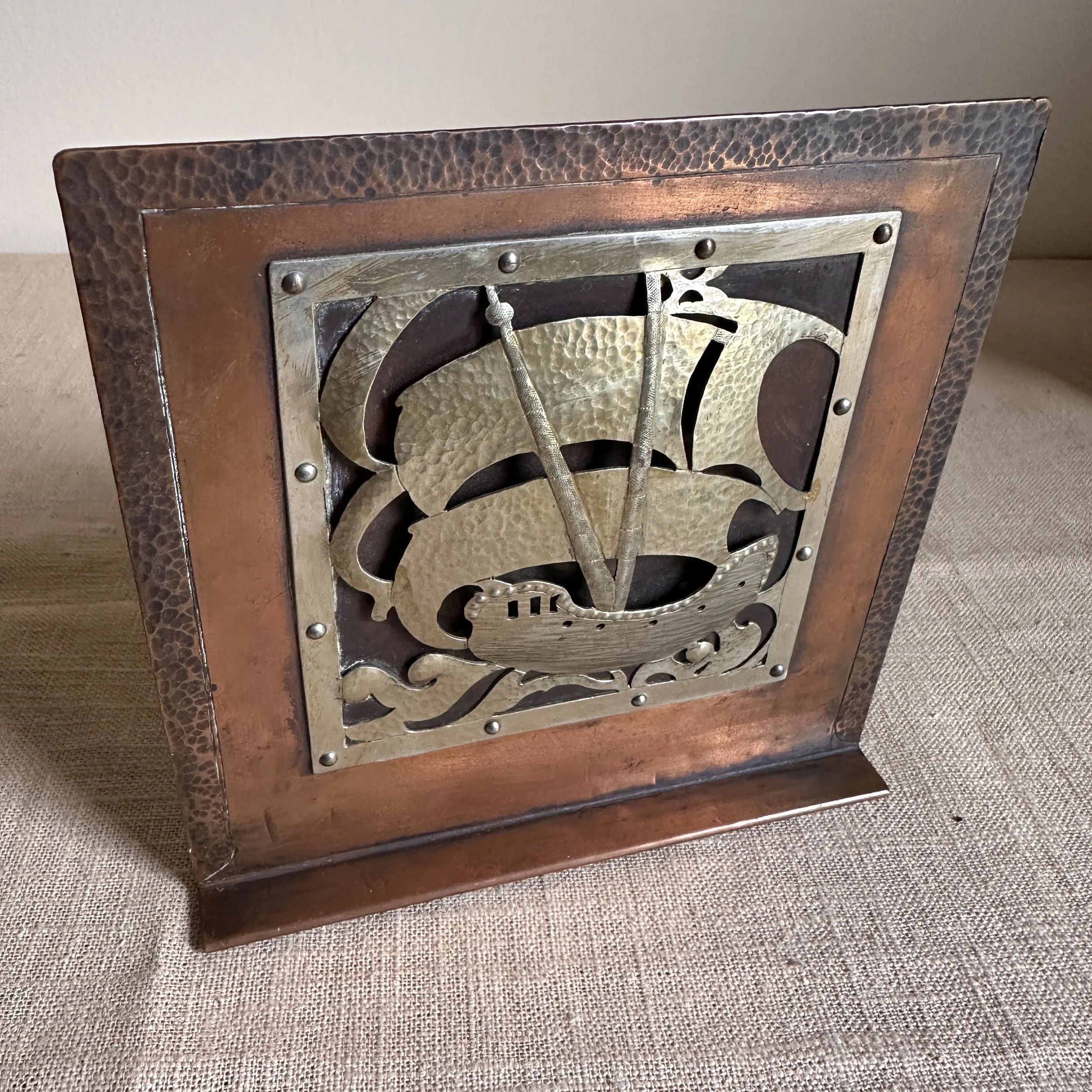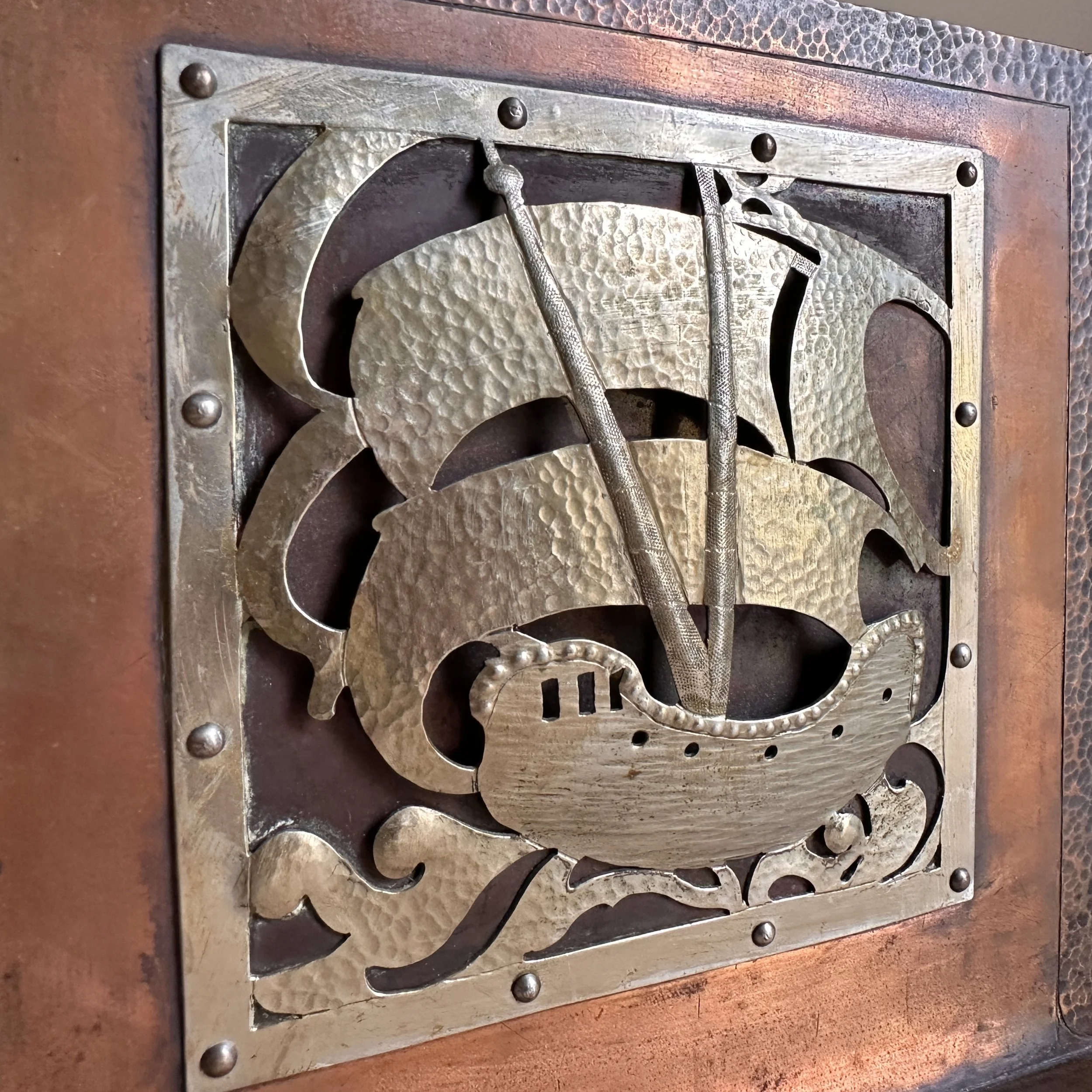 Arts & Crafts bookends circa 1910. A large and heavy pair of hammered copper bookends, each with a raised and hand cut galleon in hammered German silver. Beautifully crafted and finished, excellent condition. Unsigned. Measure 6” high, 6” wide and 5” deep. SOLD