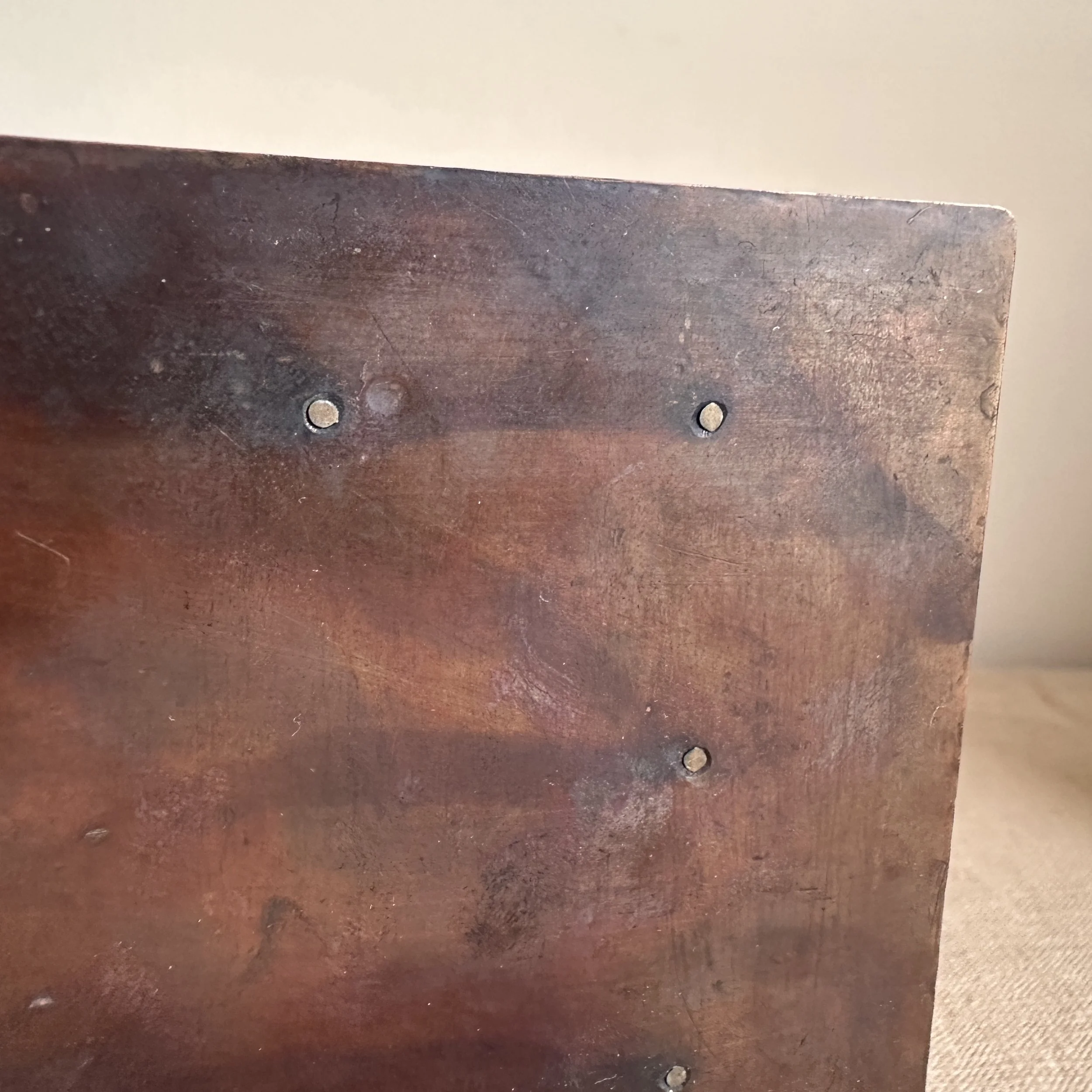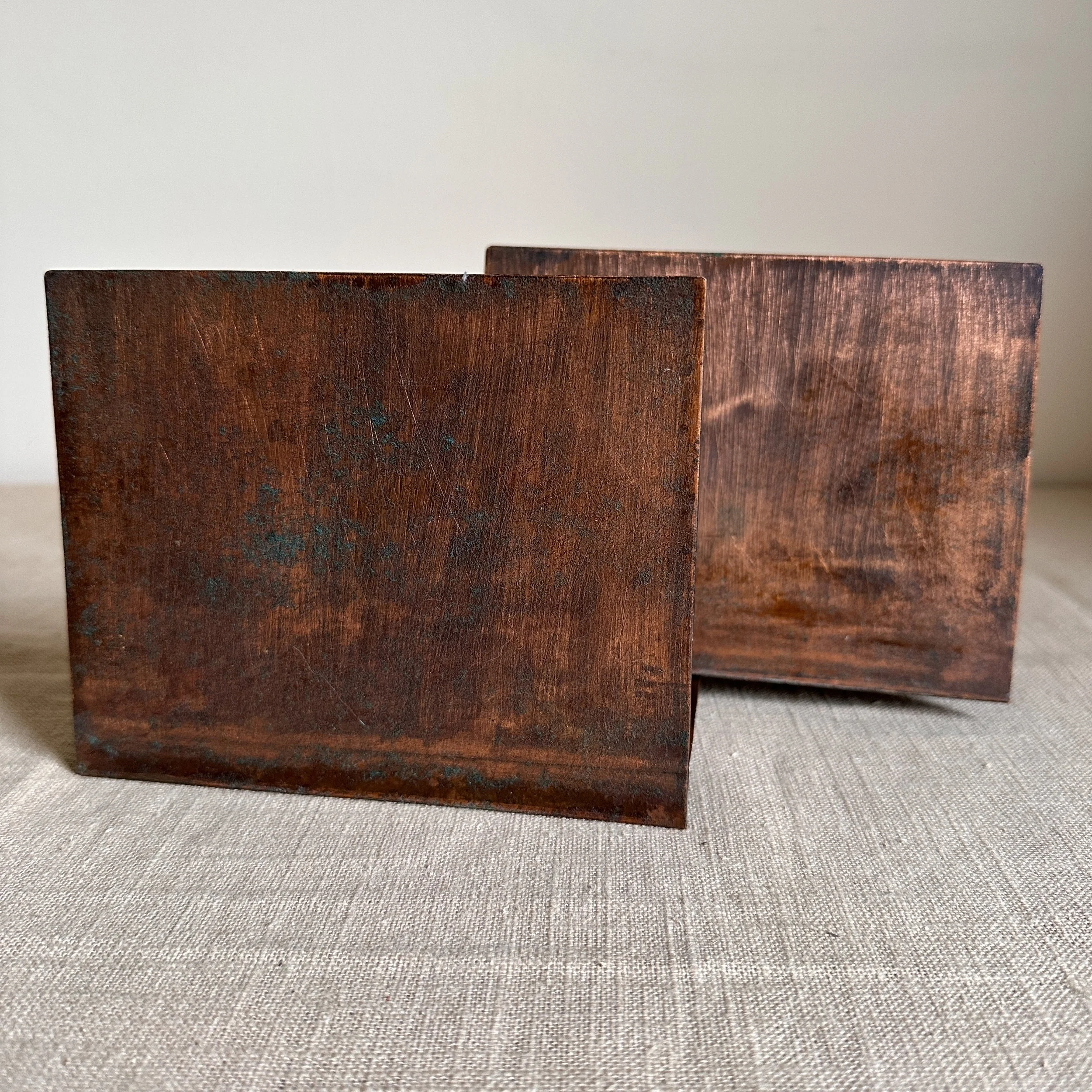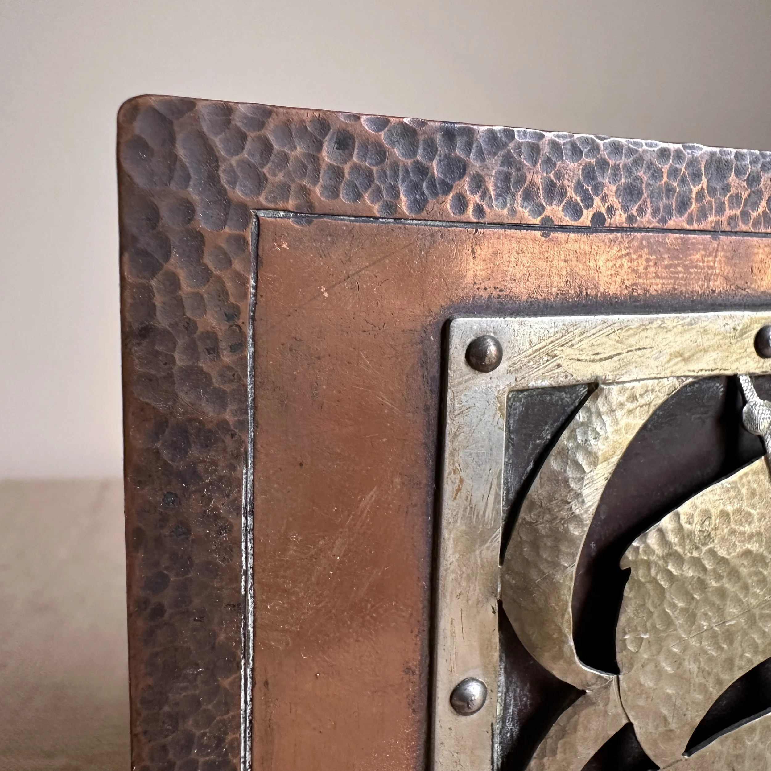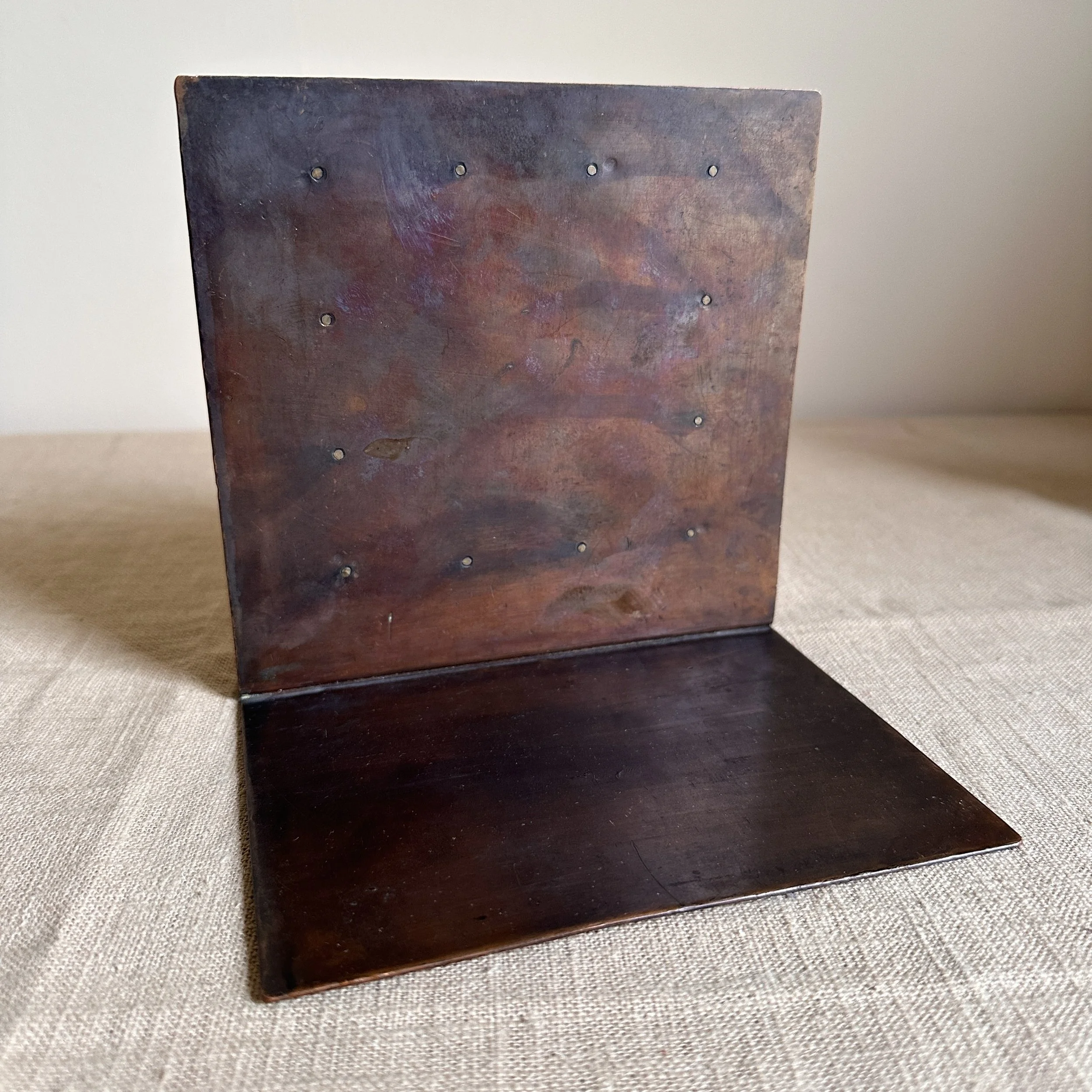 Arts & Crafts bookends circa 1910. A large and heavy pair of hammered copper bookends, each with a raised and hand cut galleon in hammered German silver. Beautifully crafted and finished, excellent condition. Unsigned. Measure 6” high, 6” wide and 5” deep. SOLD