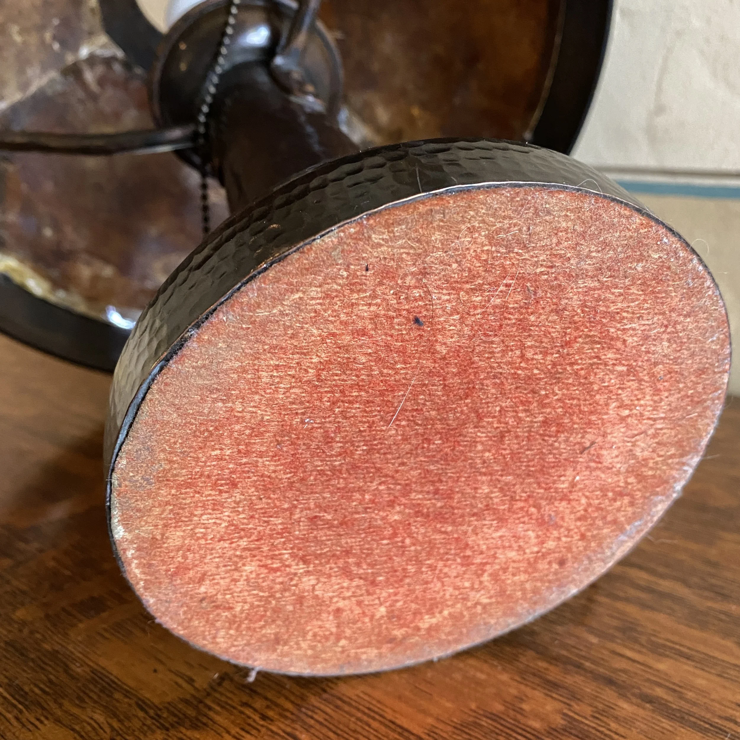 Grand Rapids Arts & Crafts hammered copper & mica lamp, Grand Rapids, MI circa 1910. This lamp is part of a series of lamps which have commonly been attributed to Benedict Art Studios, it is now believed these are part of the Grand Rapids school of lighting. This lamp has the best proportions of all the lamps from this maker, a flaring base rises gently to support three hammered copper arms, with a three panel mica shade. A fine dark brown patina in excellent condition with original dark modeled mica & original red felt on base. Rewired with silk cord. Measures 17” tall and shade is 14” wide. SOLD
