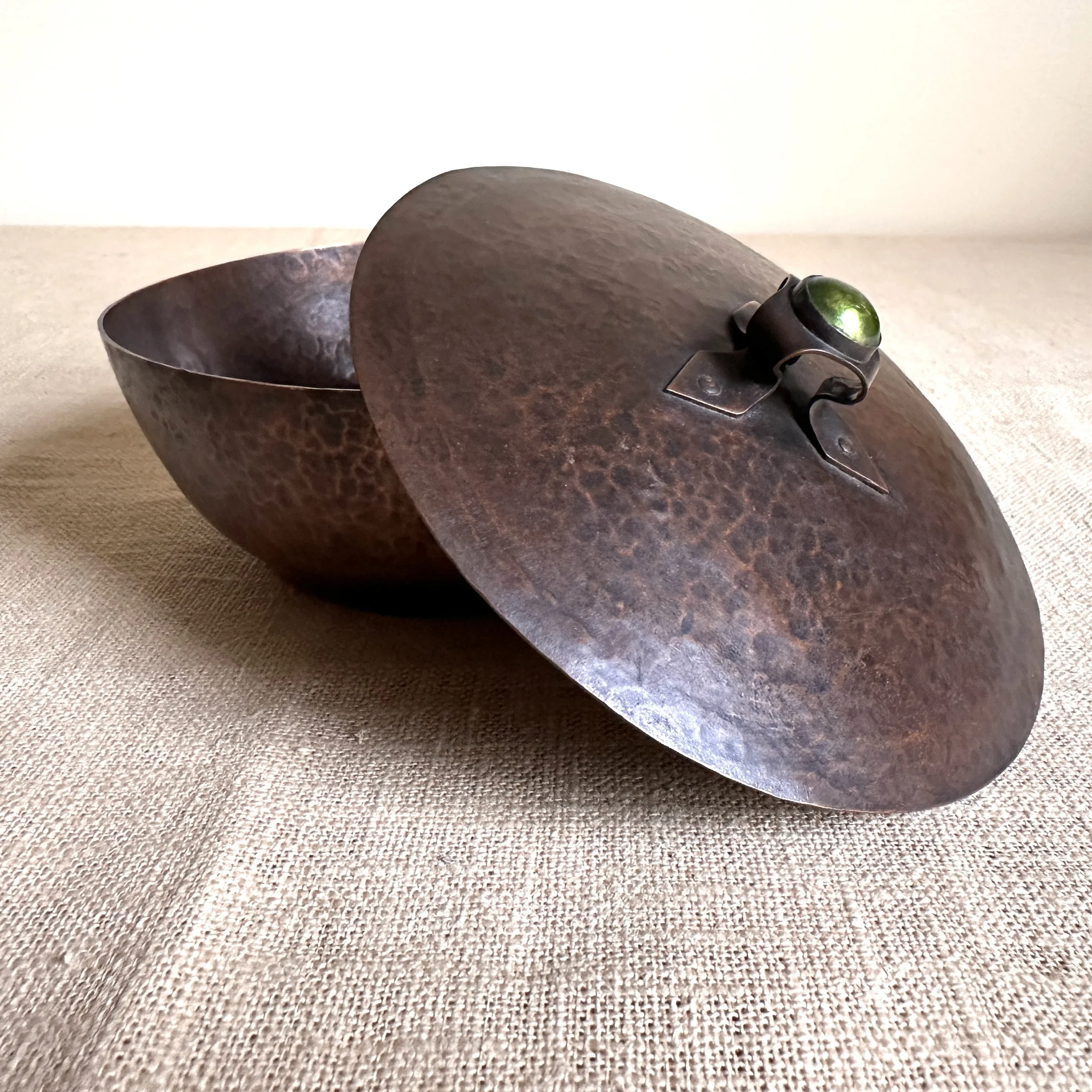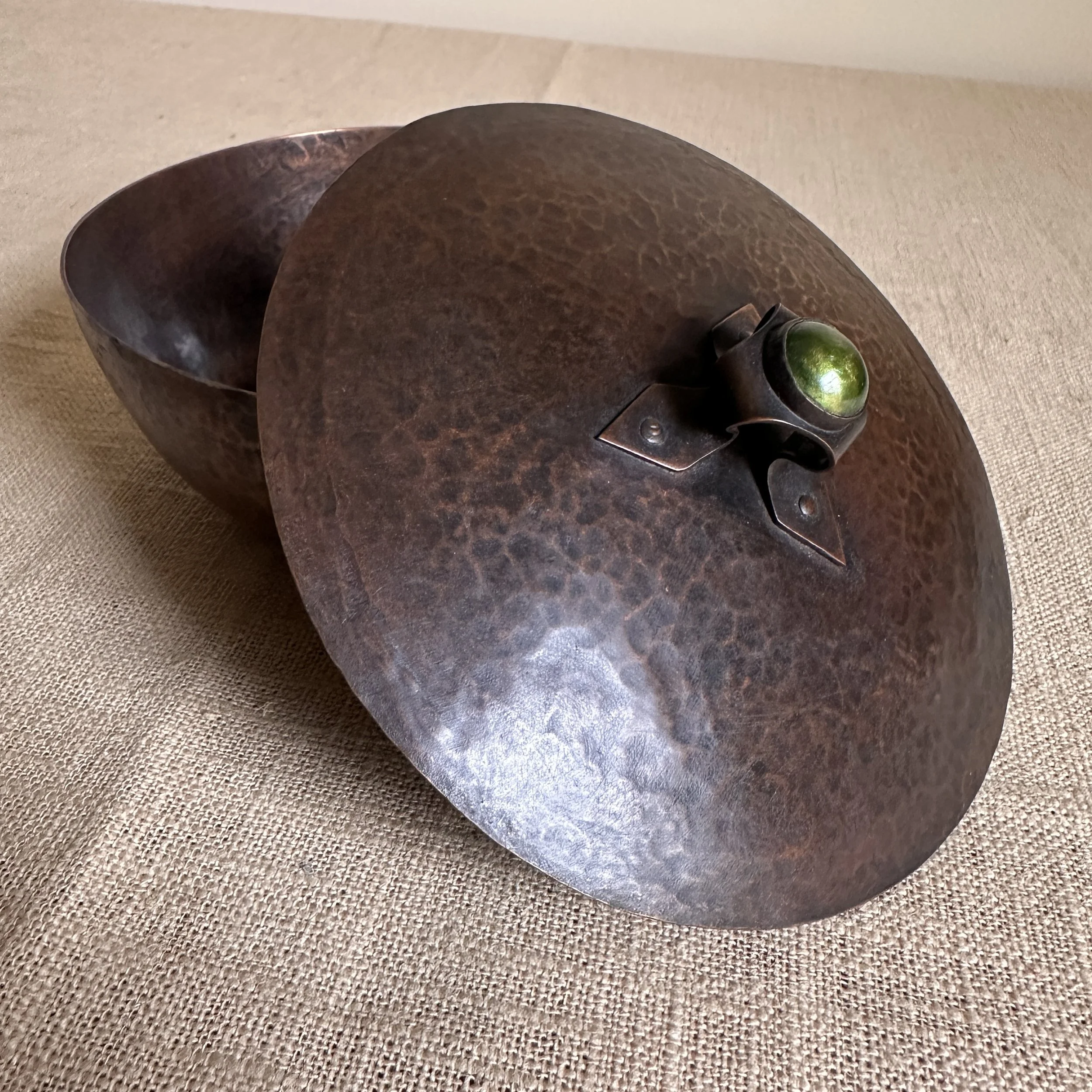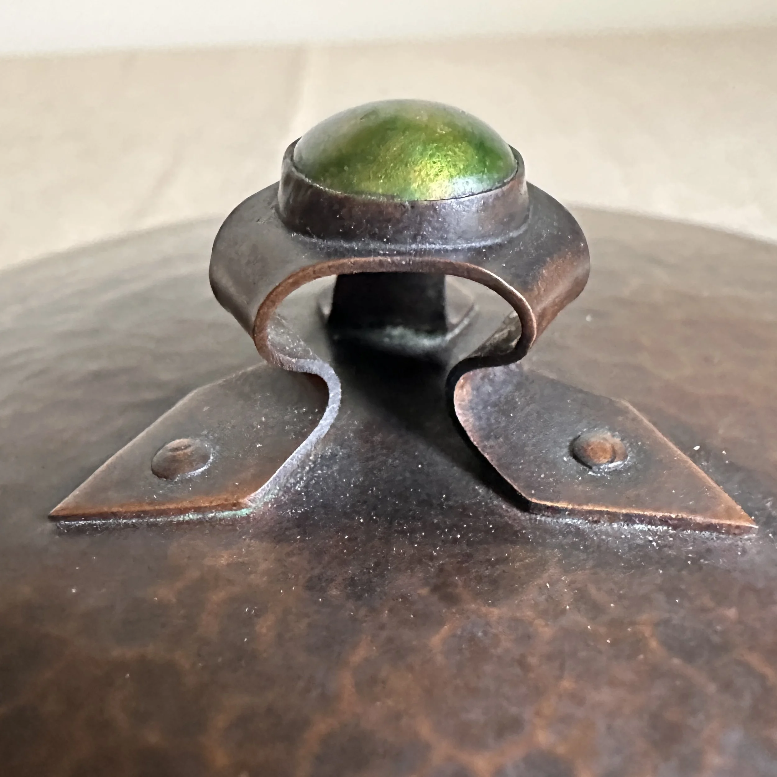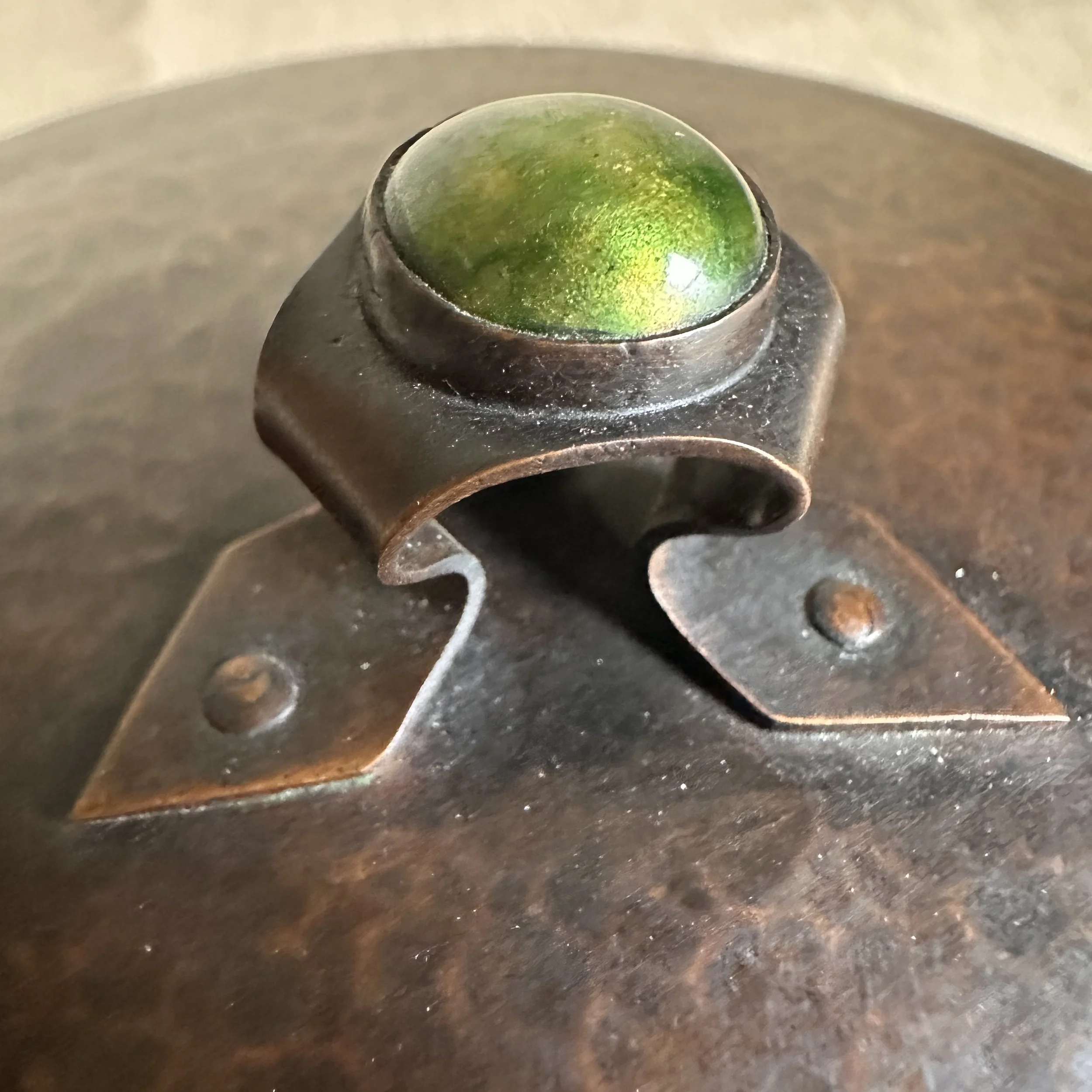Boston Society of Arts & Crafts box circa 1910. A hammered copper box with a raised finial capped with a green enamel cabochon. Fine new patina, unsigned as with much of the Boston metalwork. Measures 5” wide and 3.25” tall. $400
