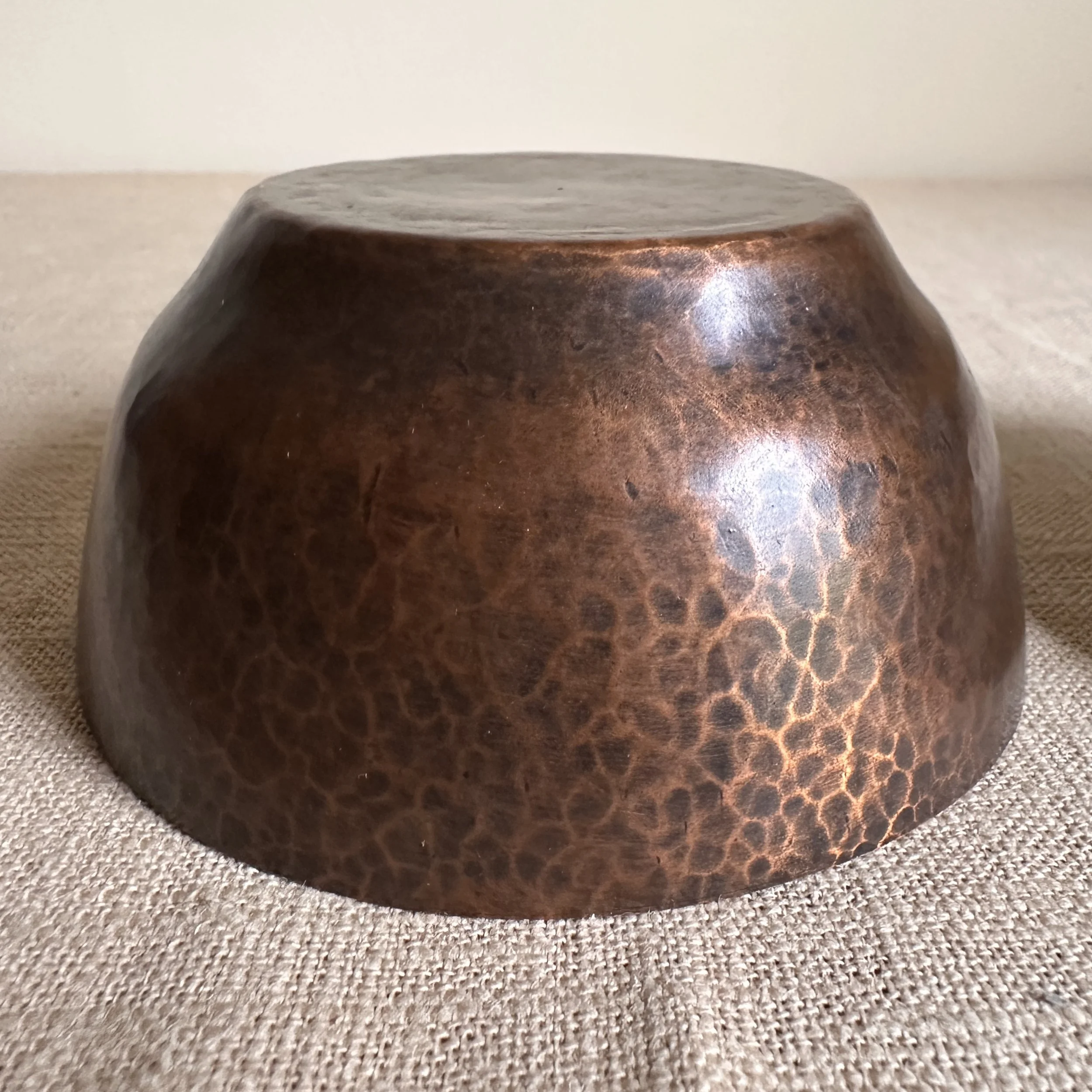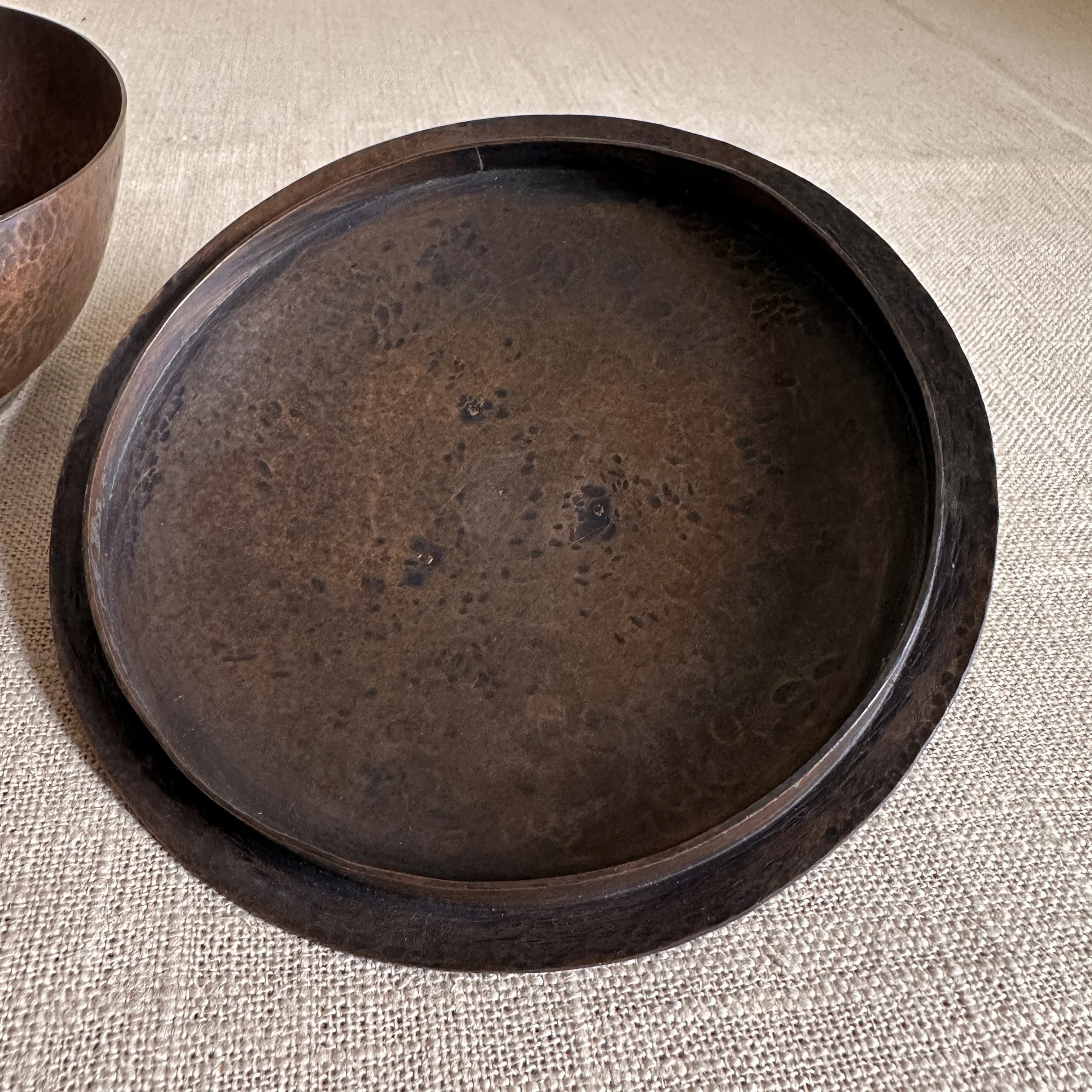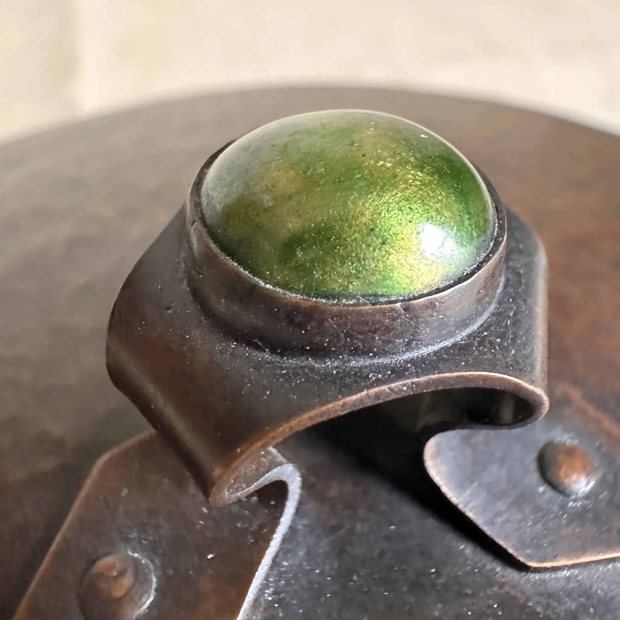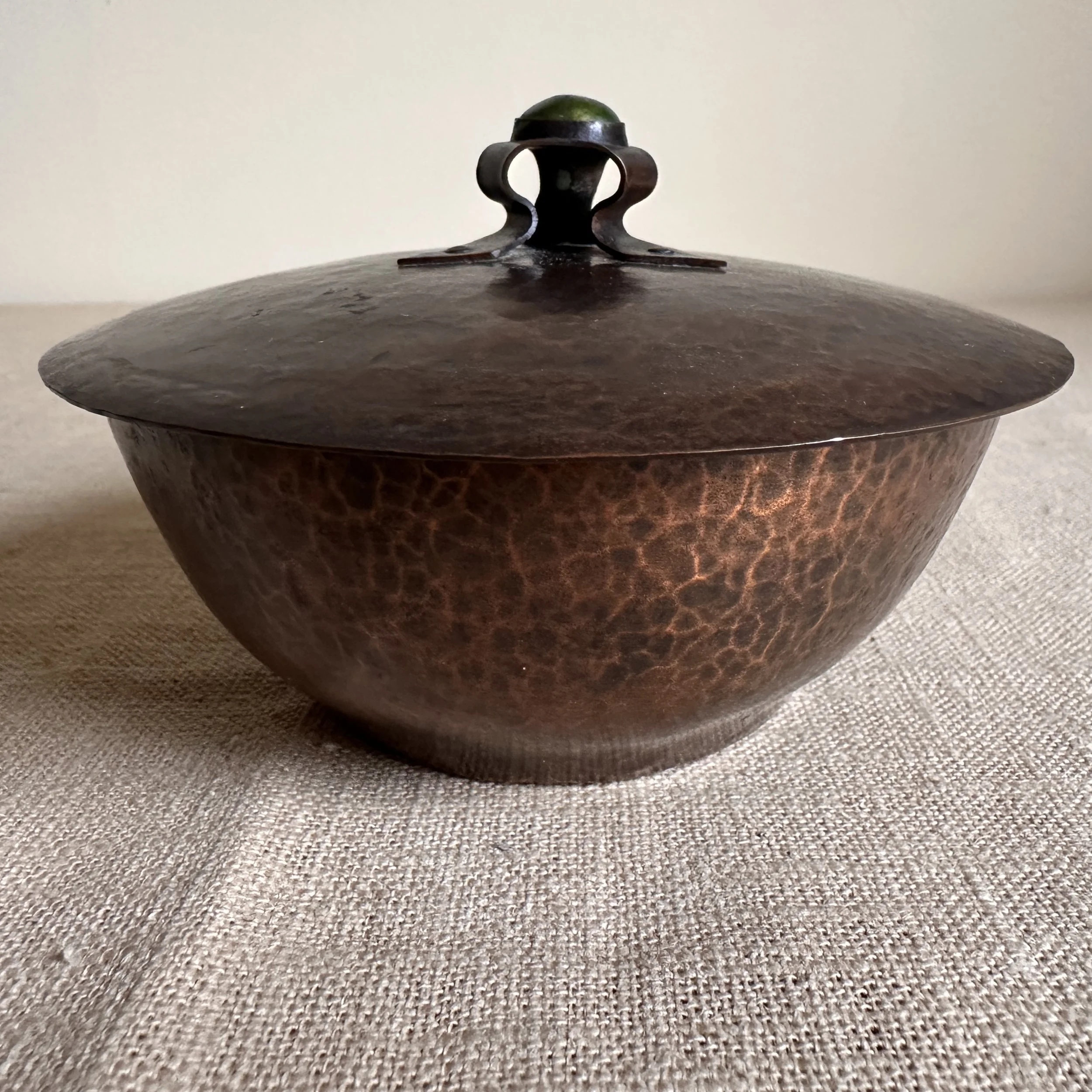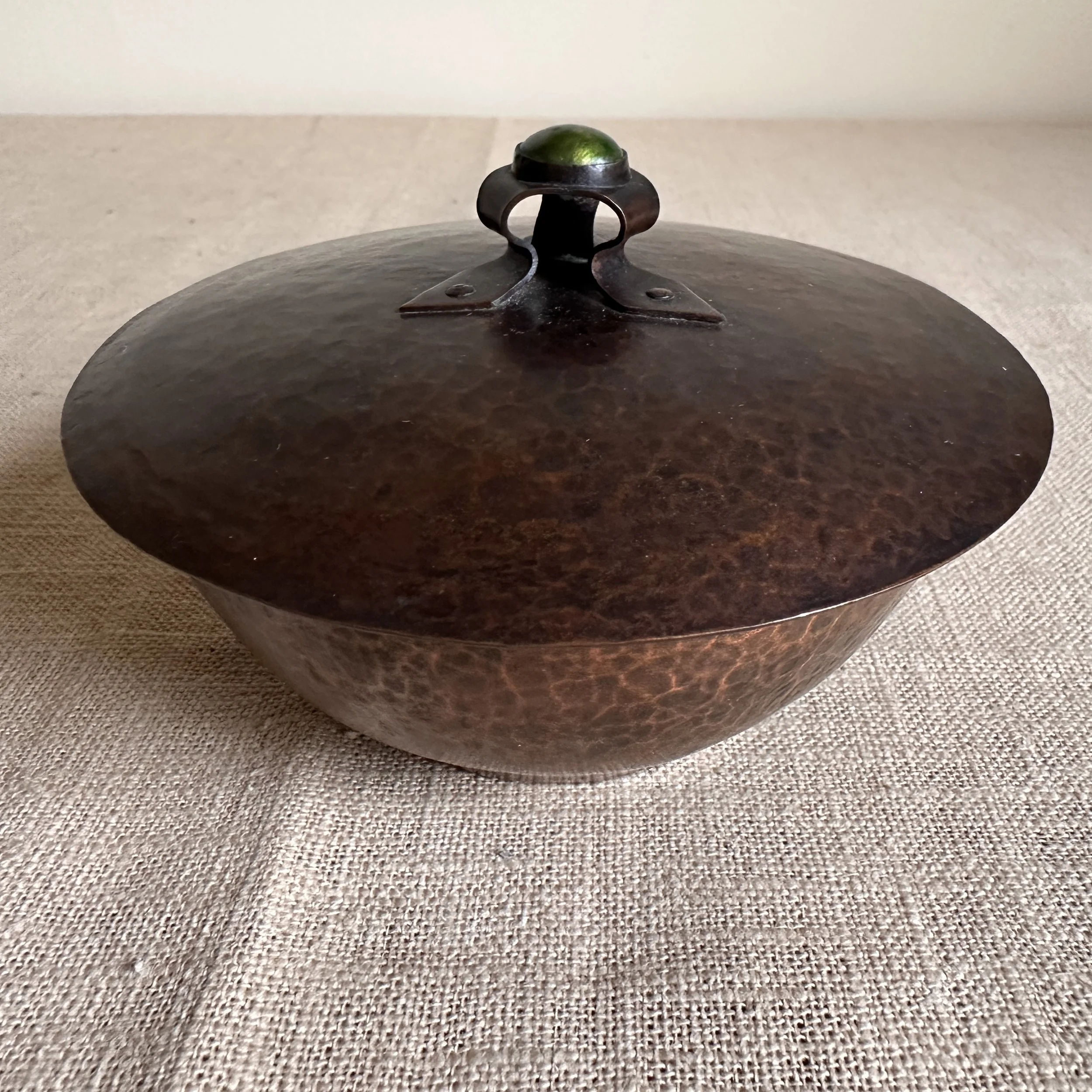 Boston Society of Arts & Crafts box circa 1910. A hammered copper box with a raised finial capped with a green enamel cabochon. Fine new patina, unsigned as with much of the Boston metalwork. Measures 5” wide and 3.25” tall. $400
