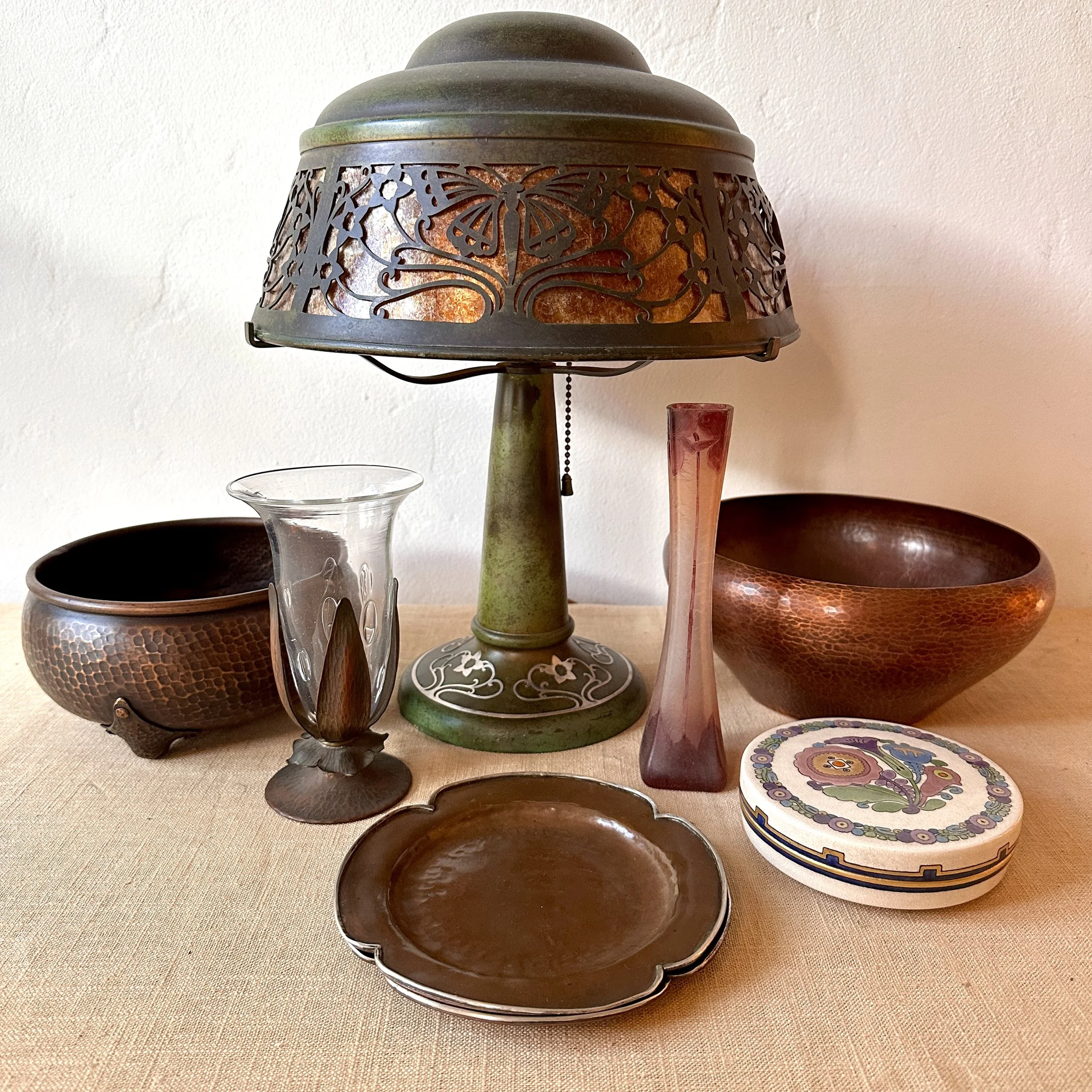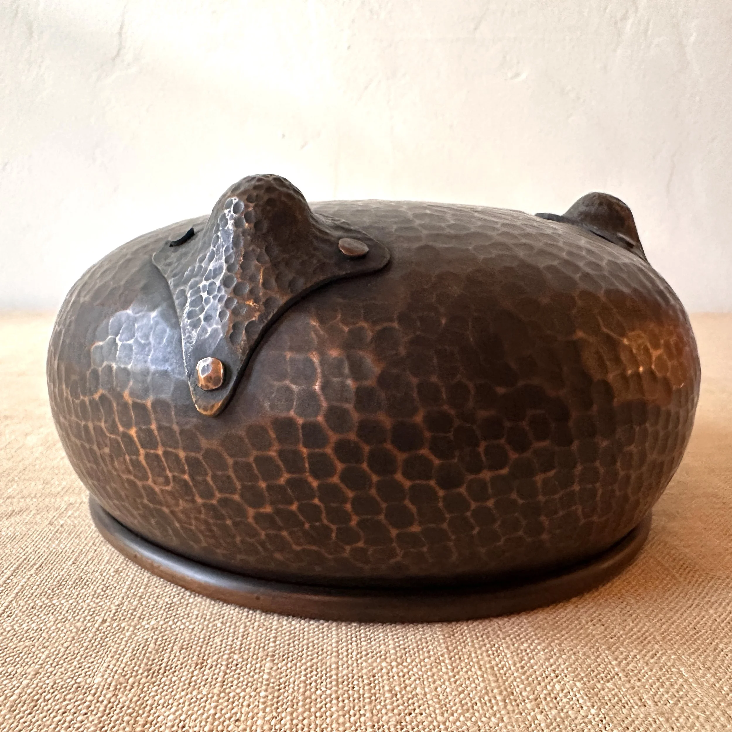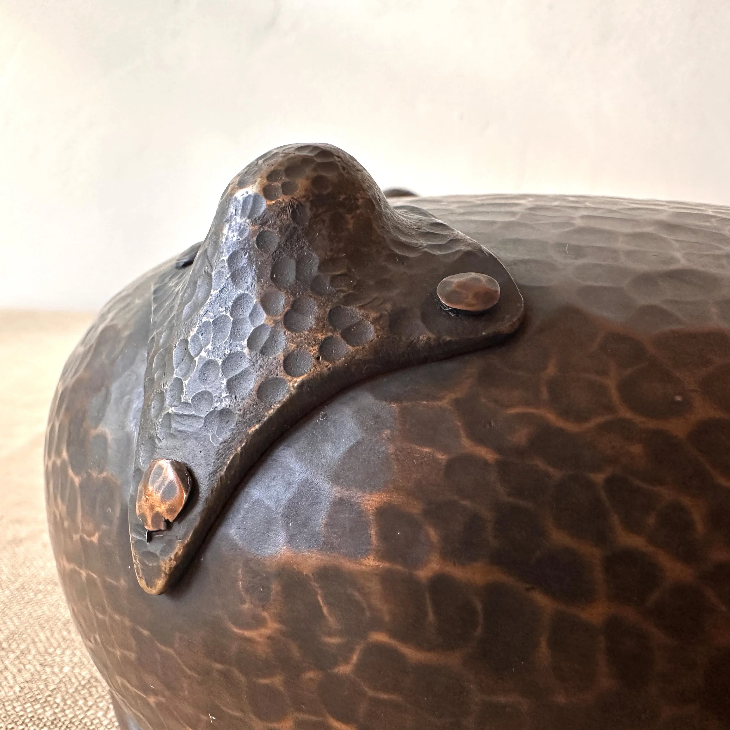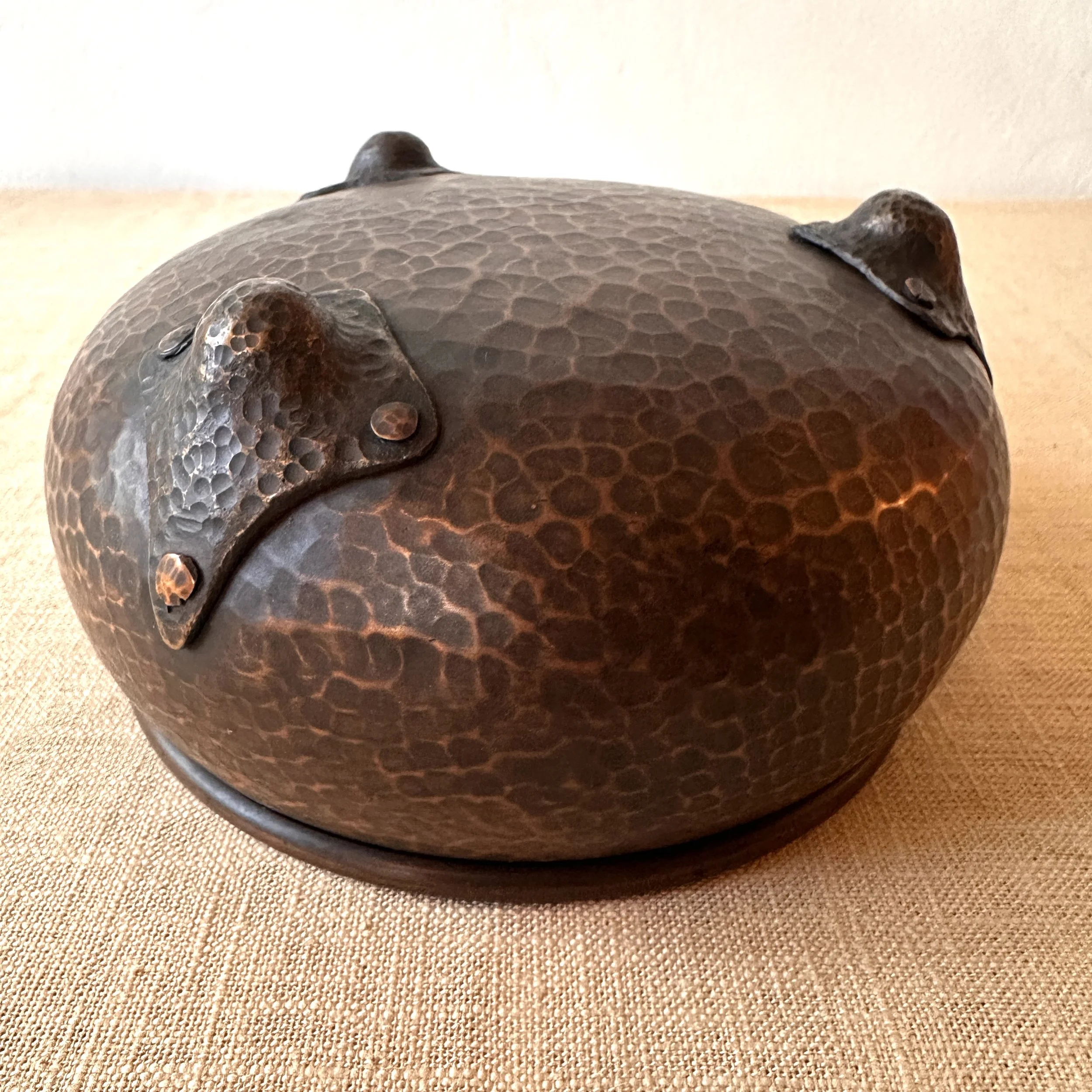 Gustav Stickley nut bowl, New York circa 1908. The largest of these nut bowls in hammered copper with three large riveted feet. Excellent recent deep brown patina. These bowls are getting harder to find. Measures 7” wide and 3.5” tall. SOLD