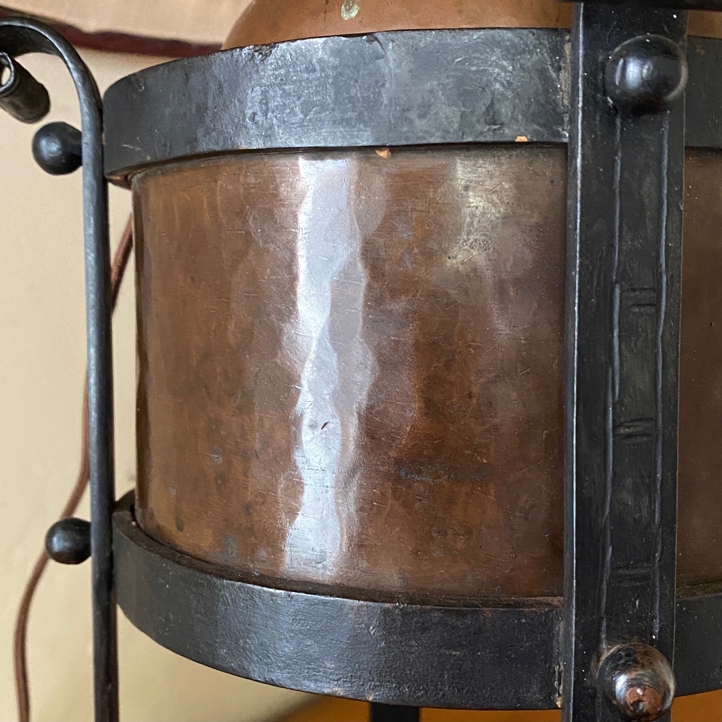 Gustav Stickley oil lamp No. 376, Eastwood NY circa 1906. A rare & large lamp form in wonderful condition. This lamp is well documented across the Gus catalogs with both a wicker shade and a reticulated copper shade. The base is supported by four hand wrought iron feet with delicate scrolls at each end. The ironwork features hammered line work across the surface. The central hammered copper canister is secured with iron ball screws and the oil can with a hammered dome sits flush into the canister opening. The Duplex oil works are 100% original and have been completely retained, the new electrical rewire was professionally finished to not disturb any of these parts. The Japanese wicker shade sits atop a round hanger which clips onto the oil font. The shade is in pristine condition and lines up with the original catalog width of 17.5” wide. Interior supports a double wire cloth lining, one small area of staining visible on inside. Gorgeous original patina to both copper and iron. Unsigned, about half of the known examples of this form appear unsigned. Measures 23.5” tall (top of shade support), iron feet at 10” across & 13” on diagonal wide, shade is 17.5” wide at bottom. SOLD
