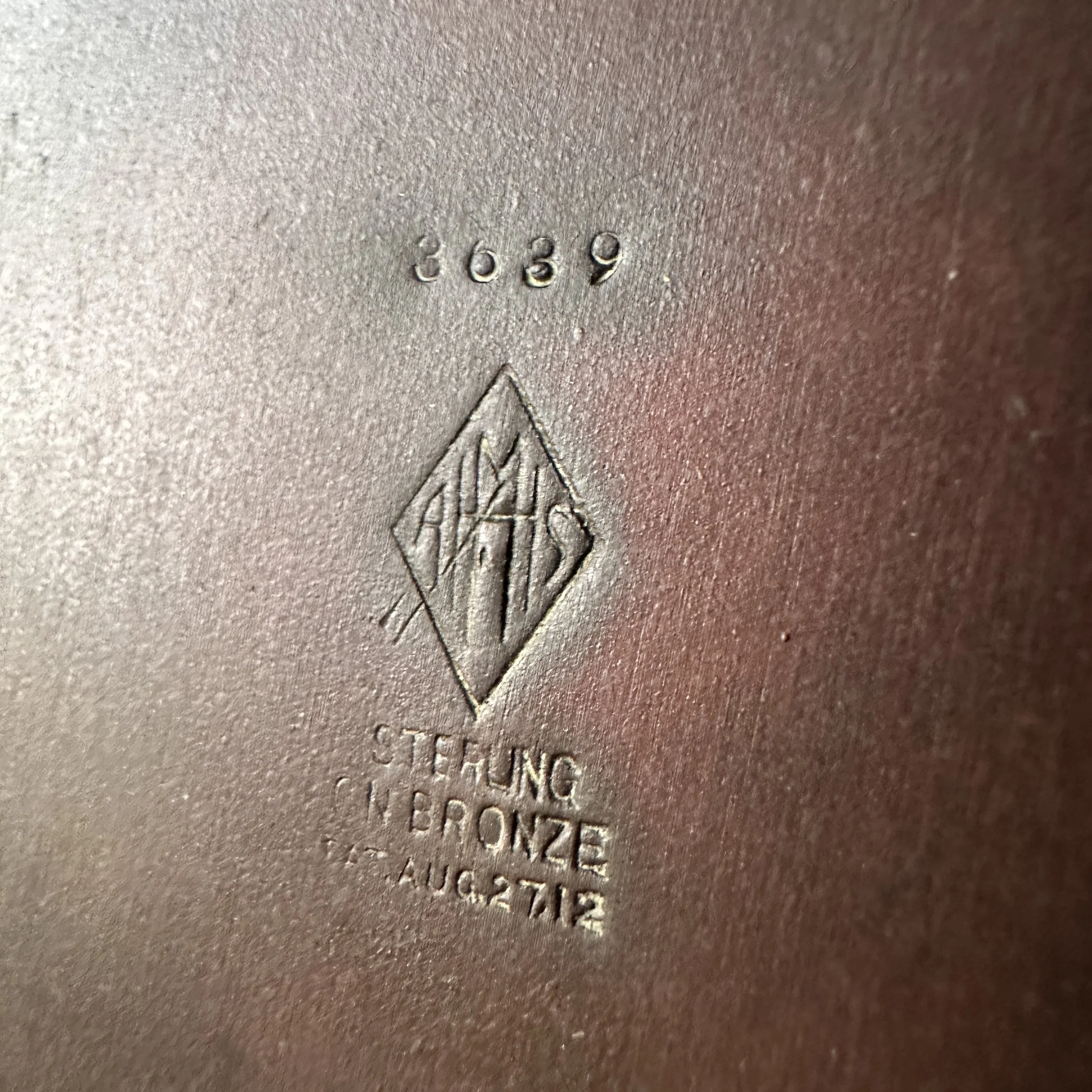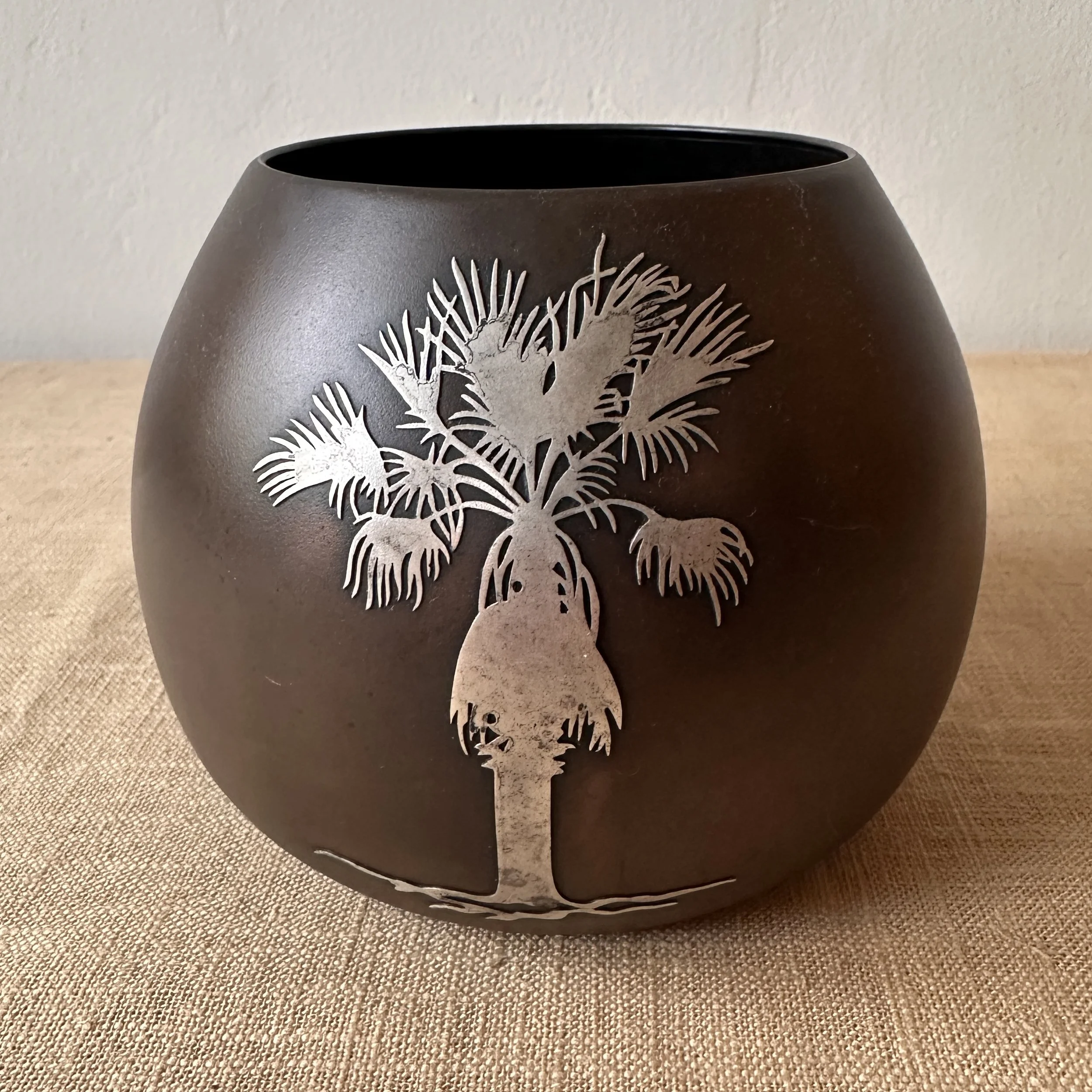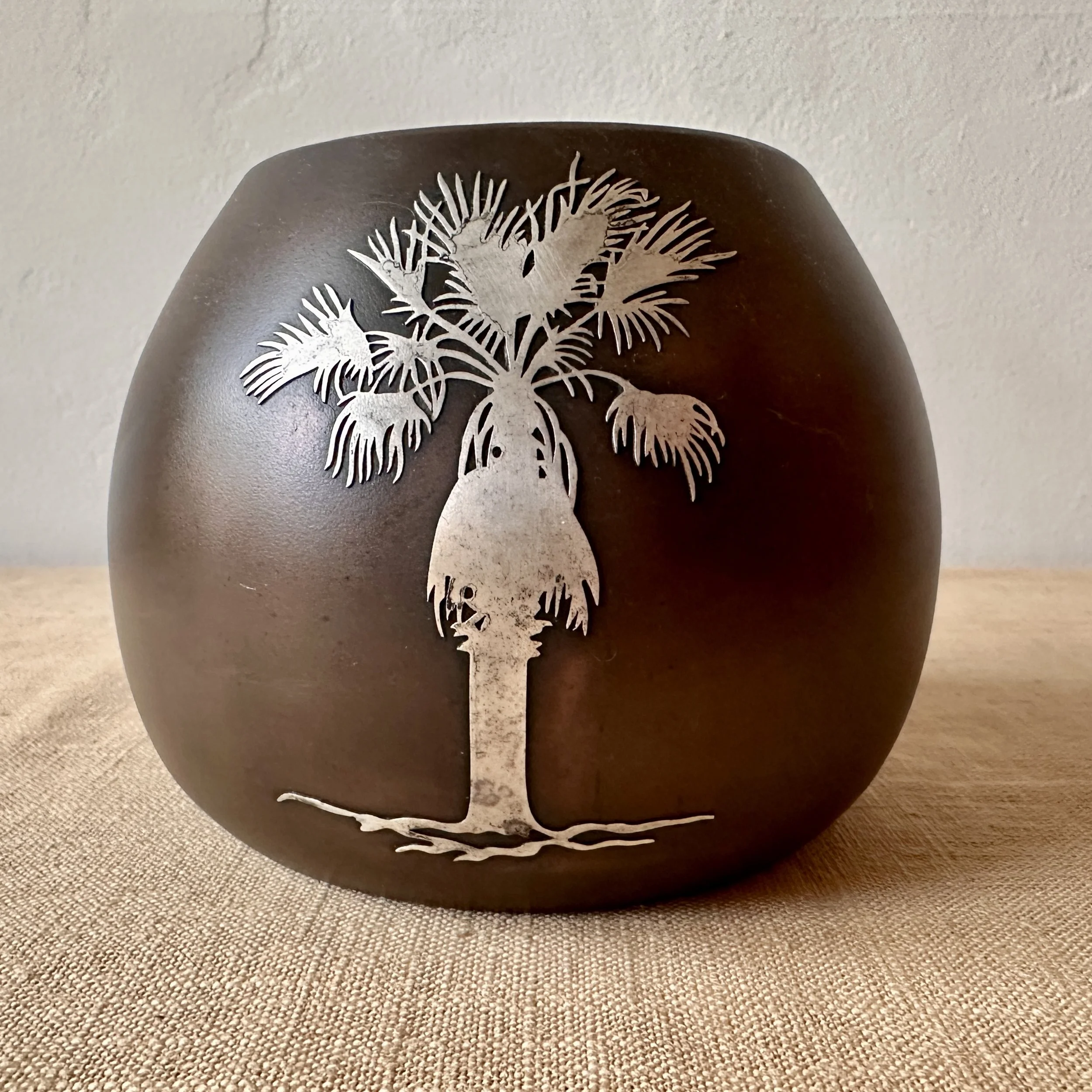 Heintz Art Metal vase, Buffalo NY circa 1912. A large squat vessel with a fan palm silver overlay. Nice original patina, a few small markings to back side. Signed. Measures 4.5” tall and 5.75’ wide. SOLD