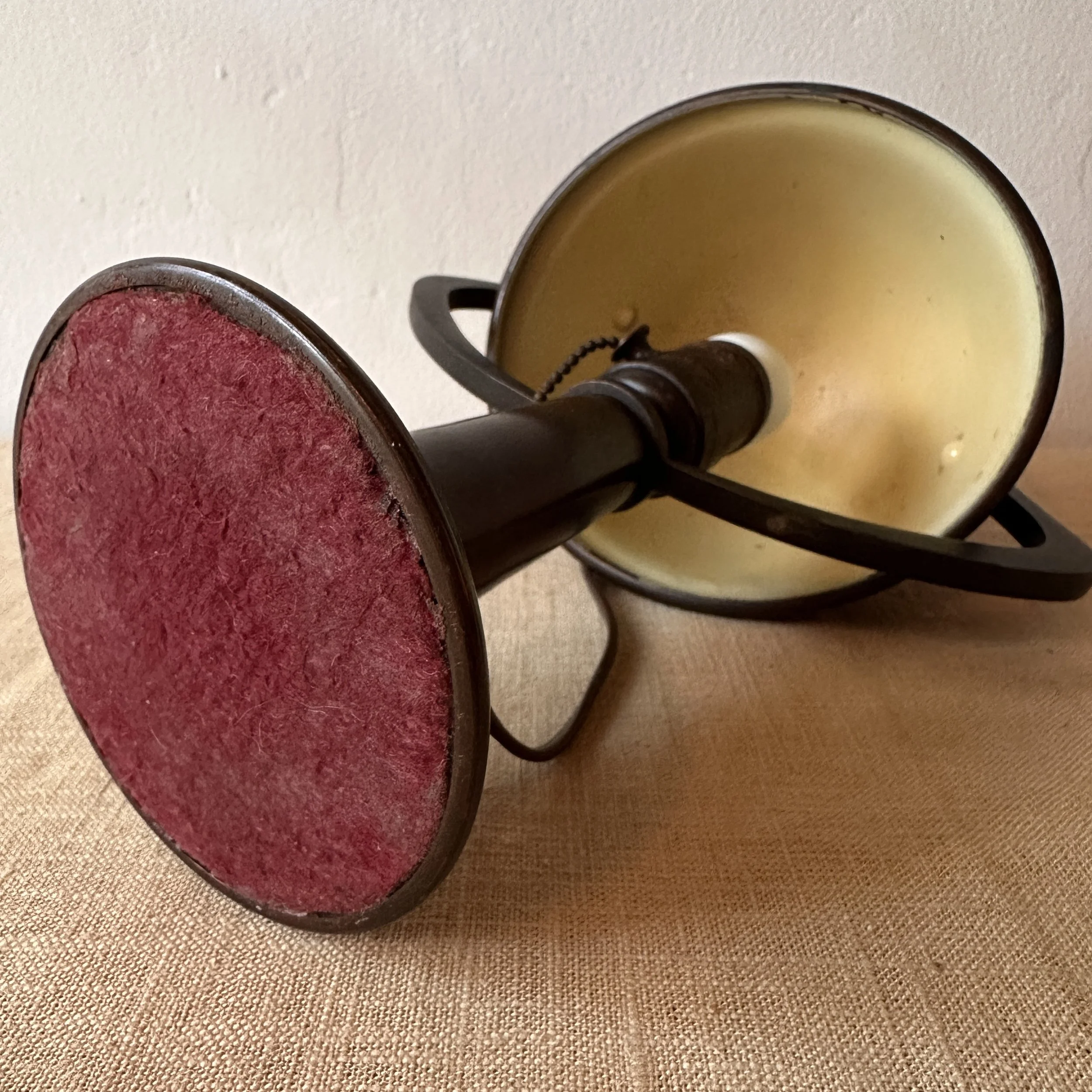 Heintz Art Metal helmet lamp, Buffalo NY circa 1912. A bronze lamp with Sterling silver overlay, fine original brown patina. Original red felt, missing Heintz sticker. Measures 10.5” tall. $600