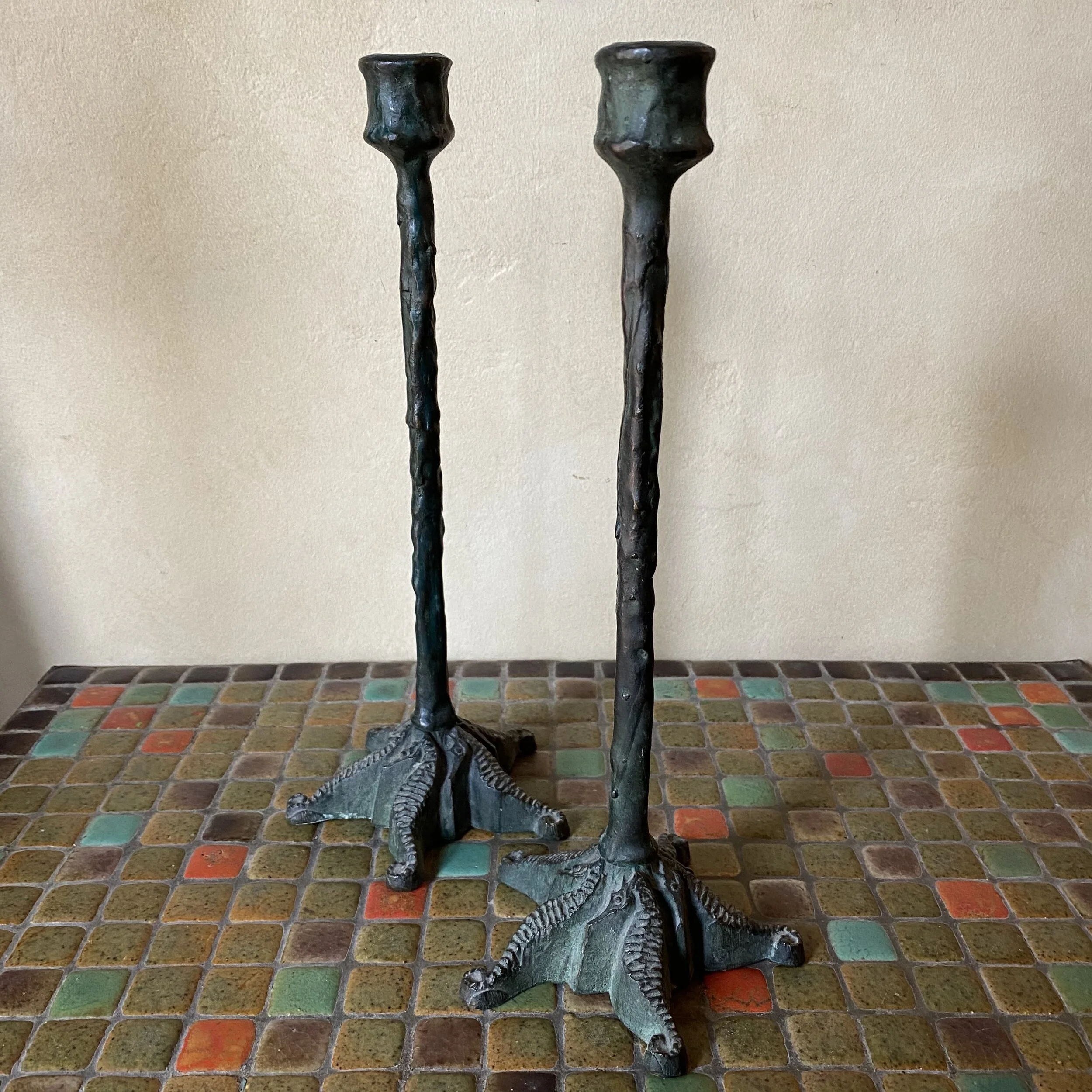 ET Hurley large bronze candlesticks with seahorse feet in a starfish shape. The shafts are cast to mimic dripping candle wax. Original sea green patina, measures 13” tall and quite heavy. Signed and dated 1914 under base. Rare form. $SOLD