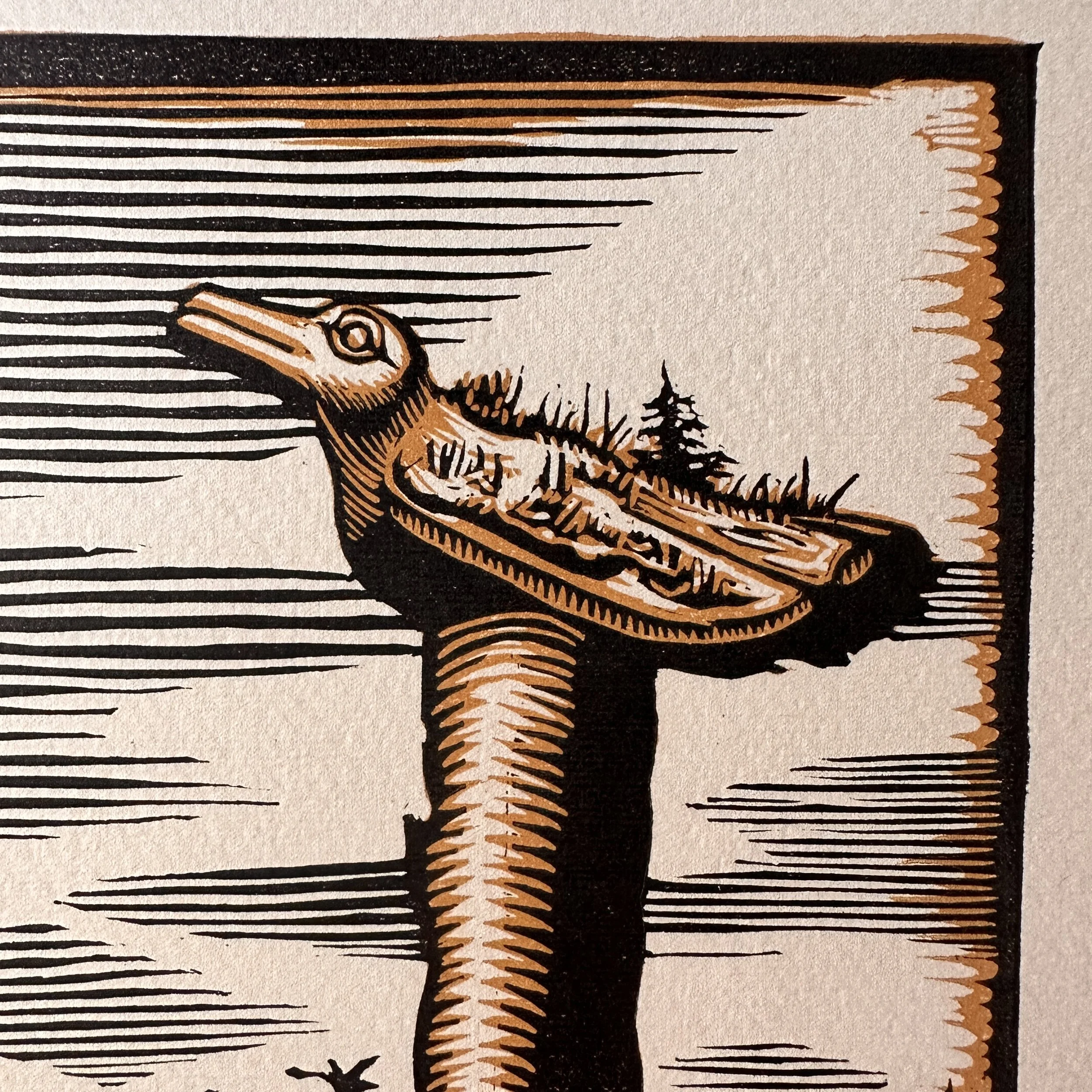 Robert Bruce inverarity “Lone Totem” color woodblock, Seattle WA circa 1932. Mint condition original color woodblock print, never framed or hung. This image depicts a moss covered totem on the Queen Charlotte Islands. Paper measures 13” by 10” and image is 6” by 7”. $2200