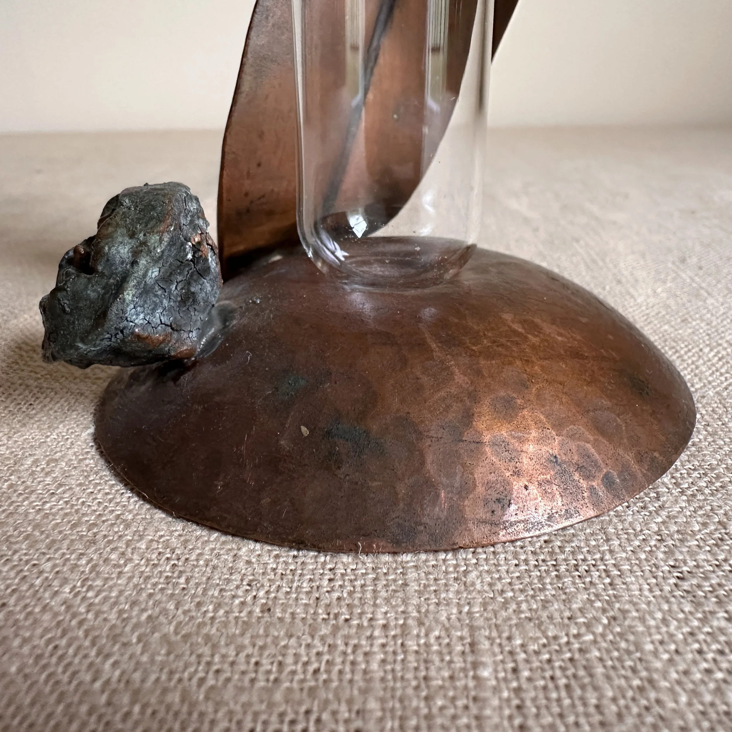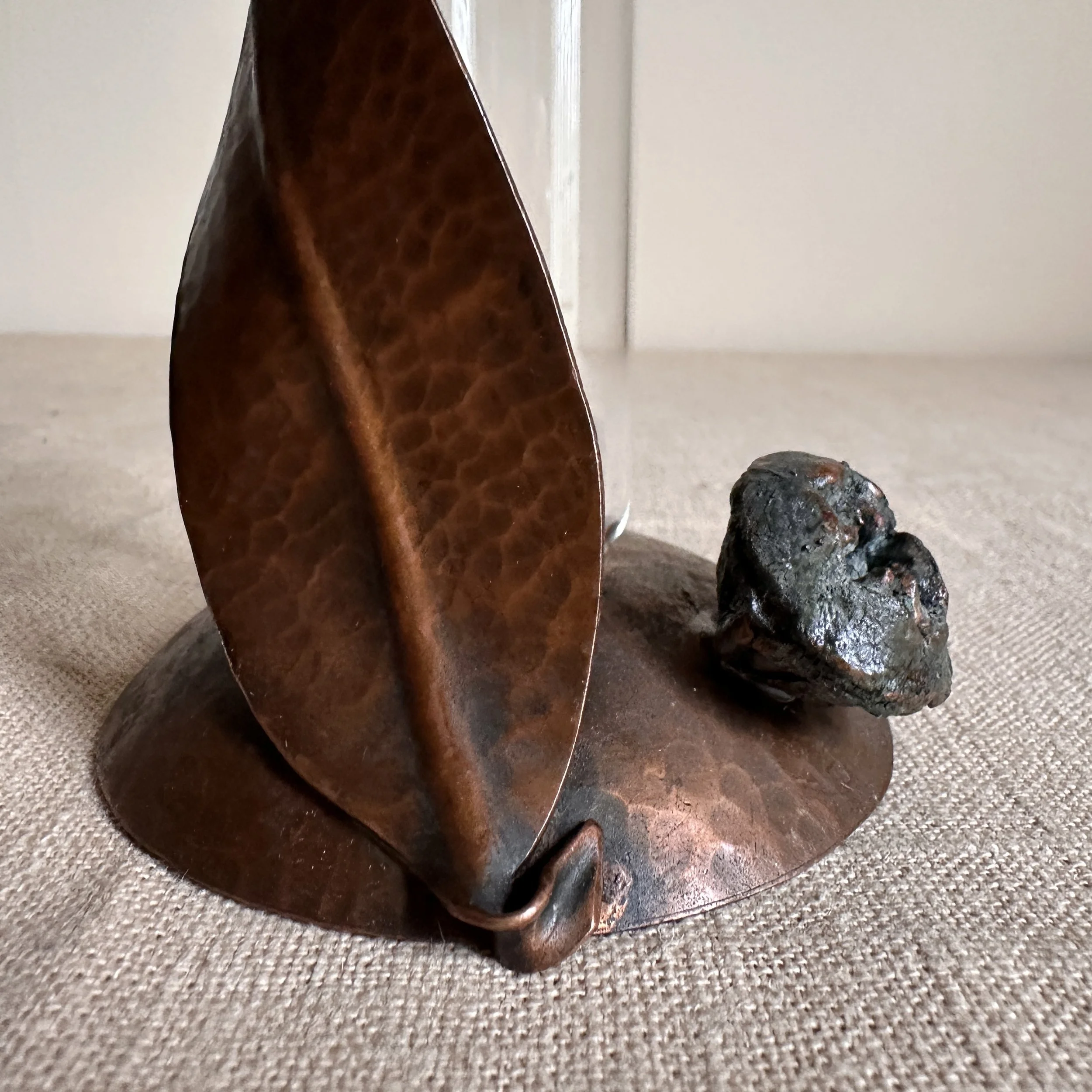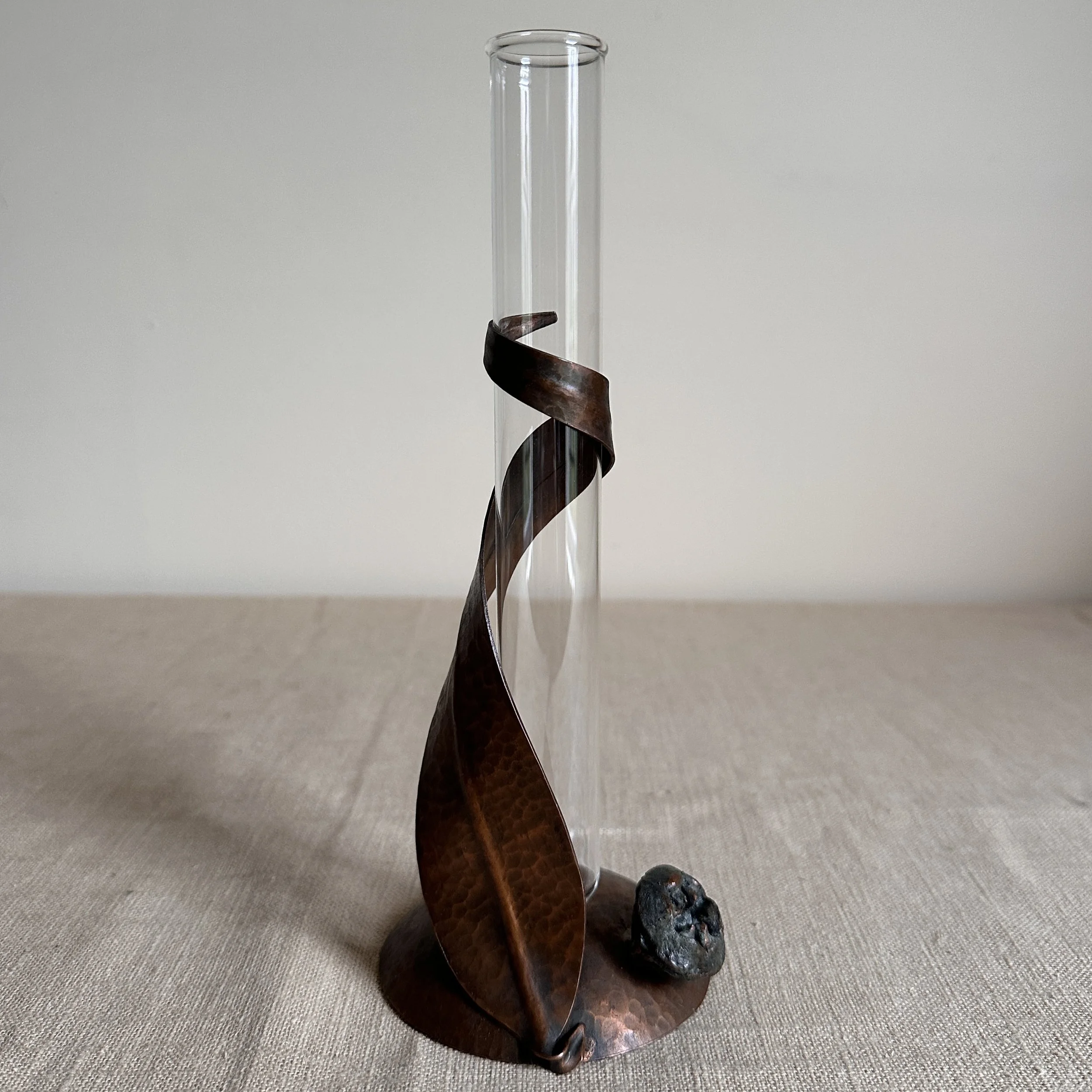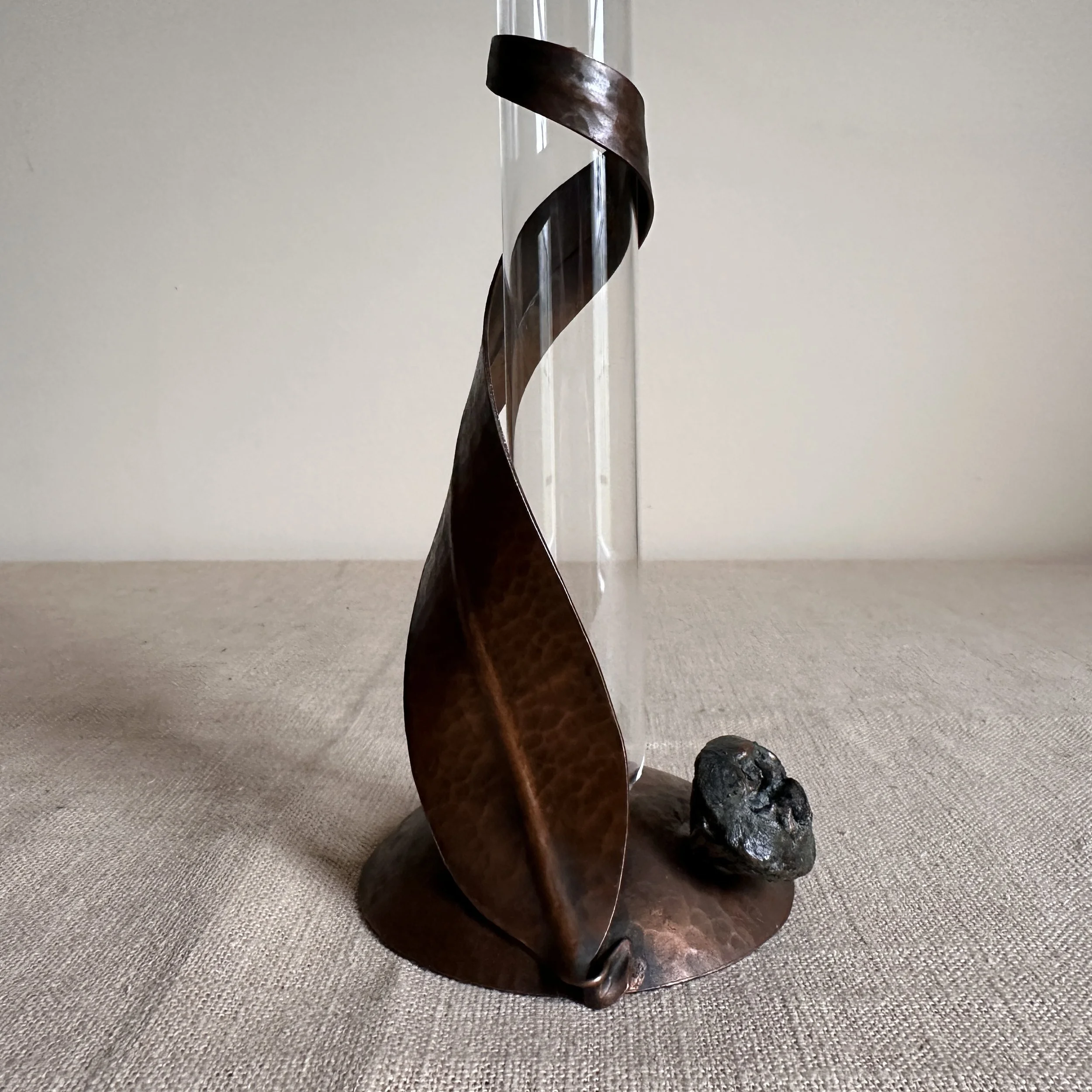 Jauchen’s Copper Shoppe bud vase, San Fransisco CA circa 1920. A hammered copper bud vase with twisting copper eucalyptus leaf and applied seed pod to base. We have seen this form sign by Jauchen’s, this example unsigned. Excellent coniditon. Measures 8.5” tall with glass, 6.25” tall to copper tip, 3.25” wide. $600