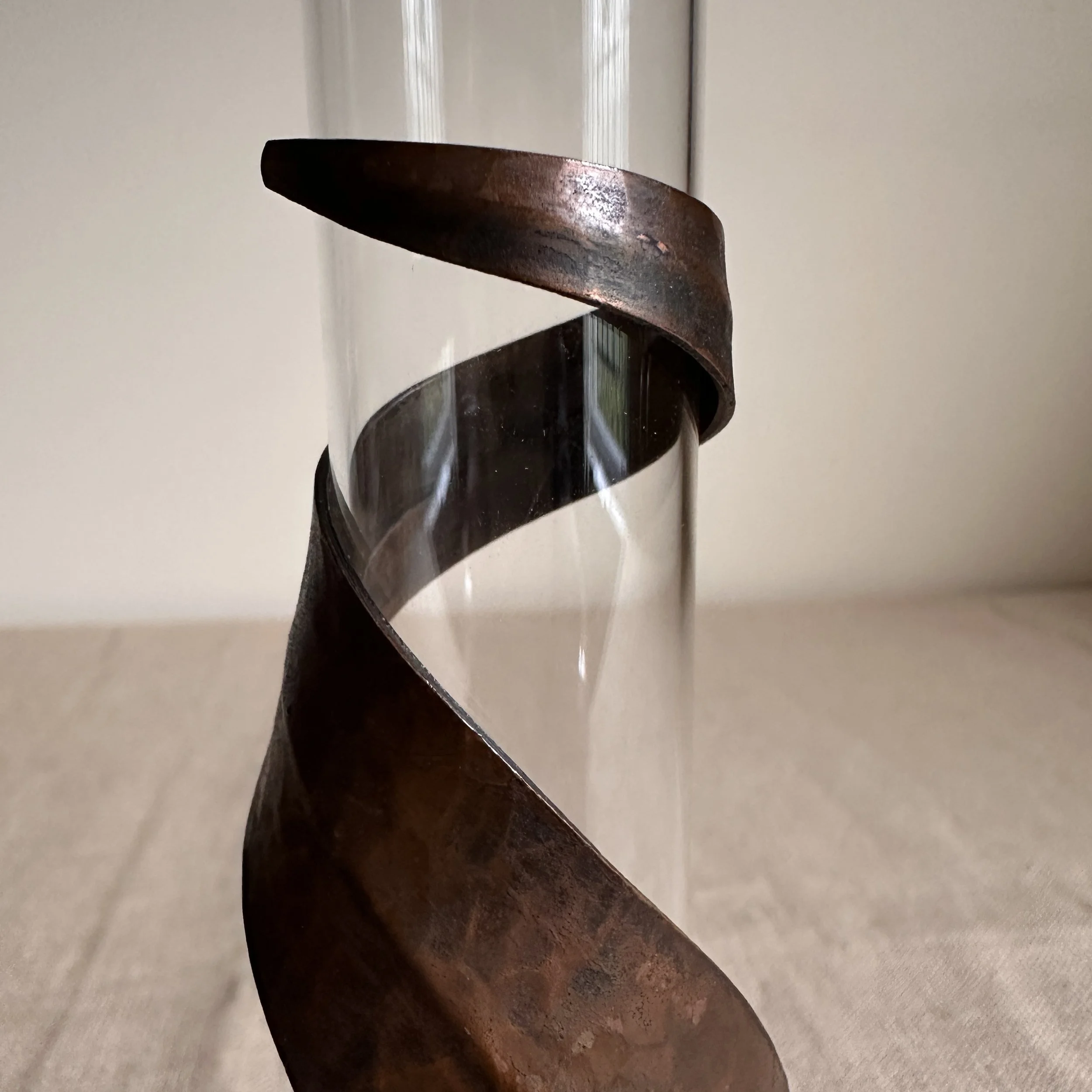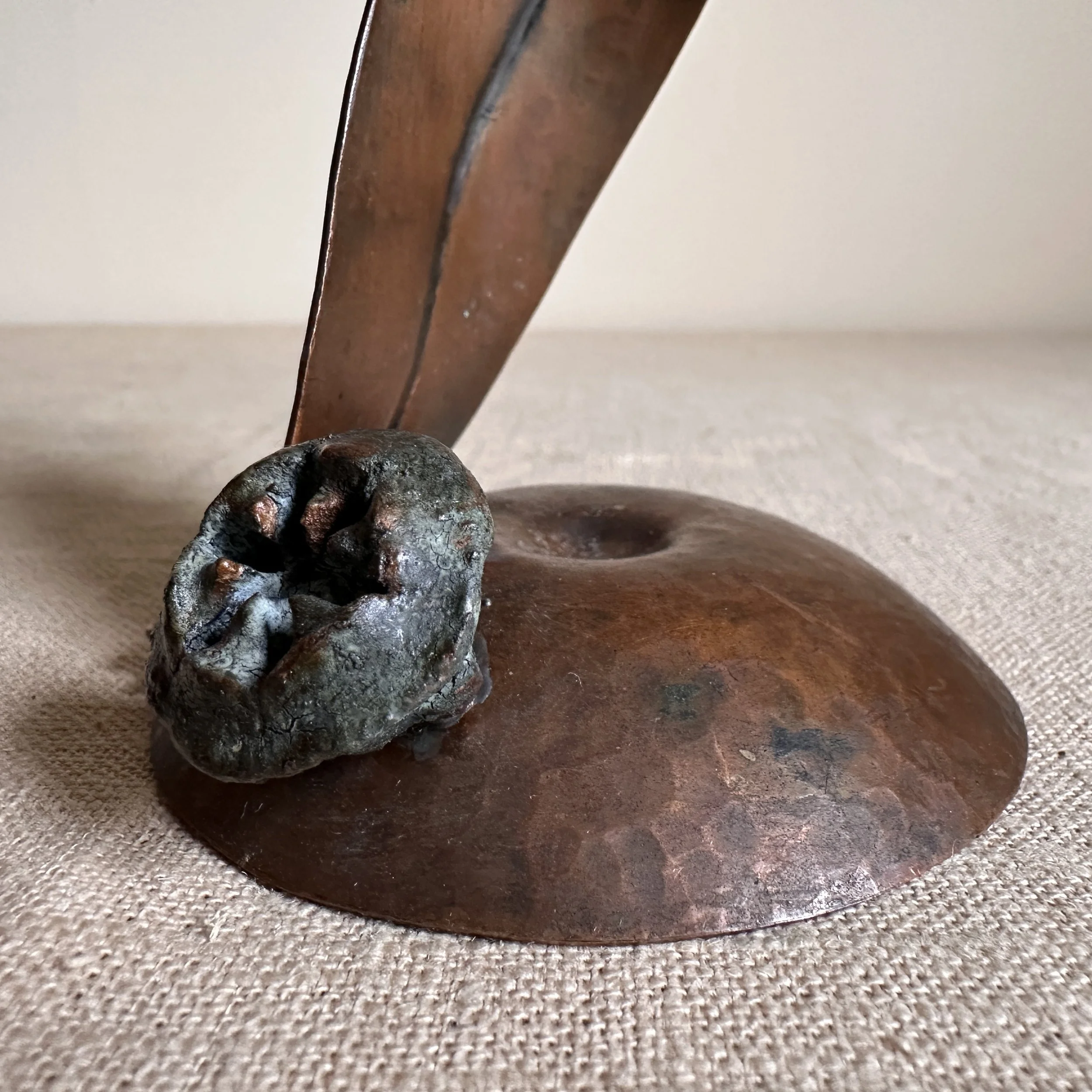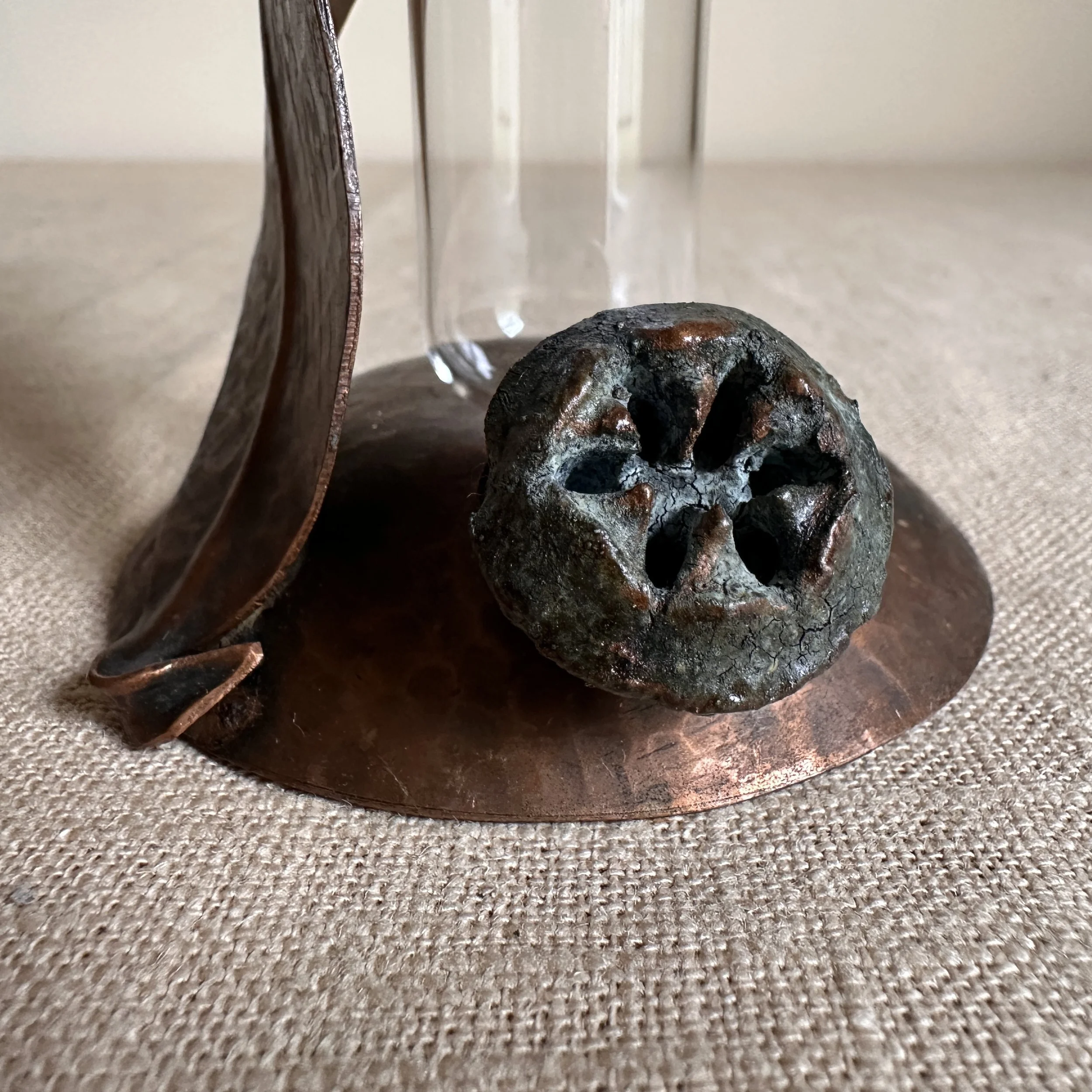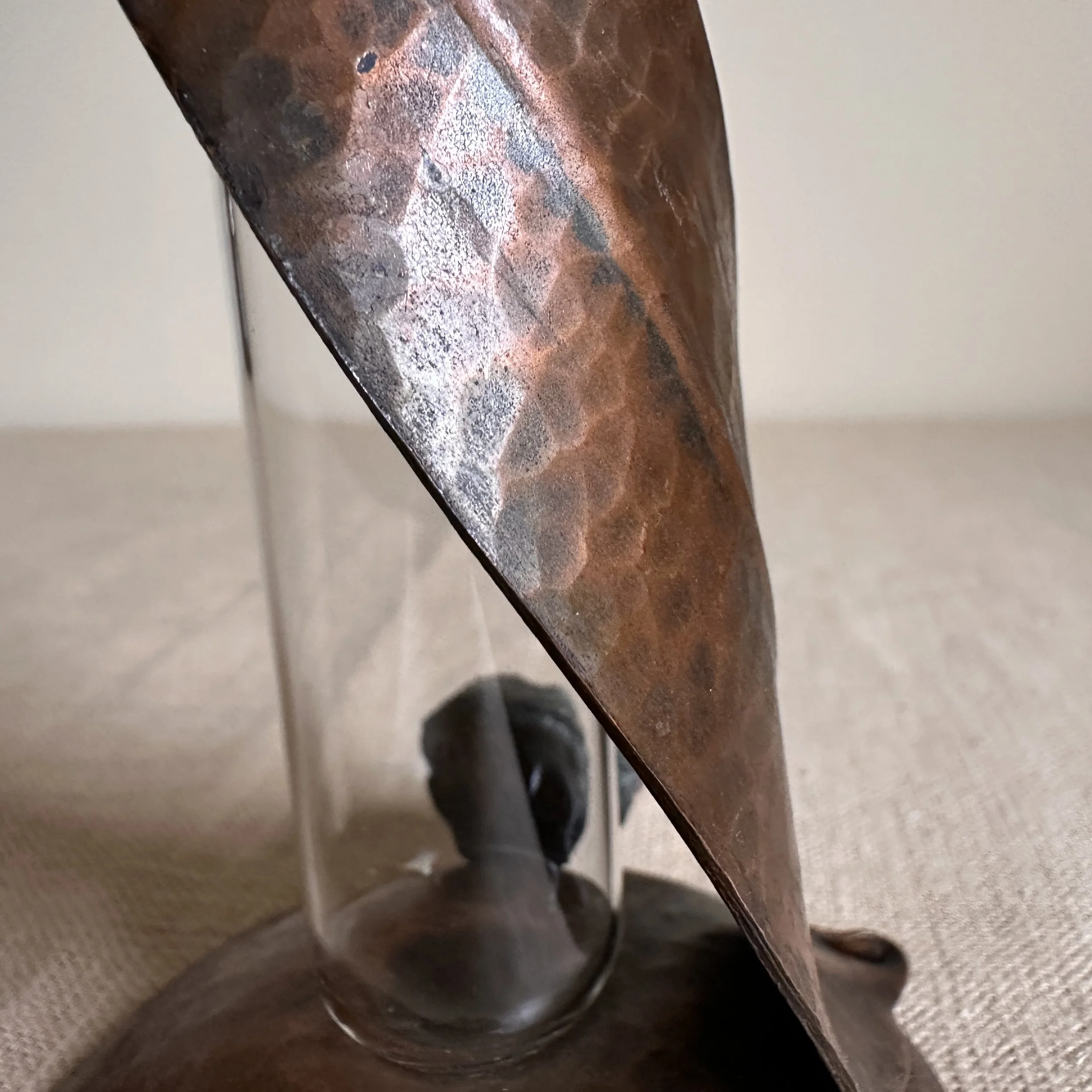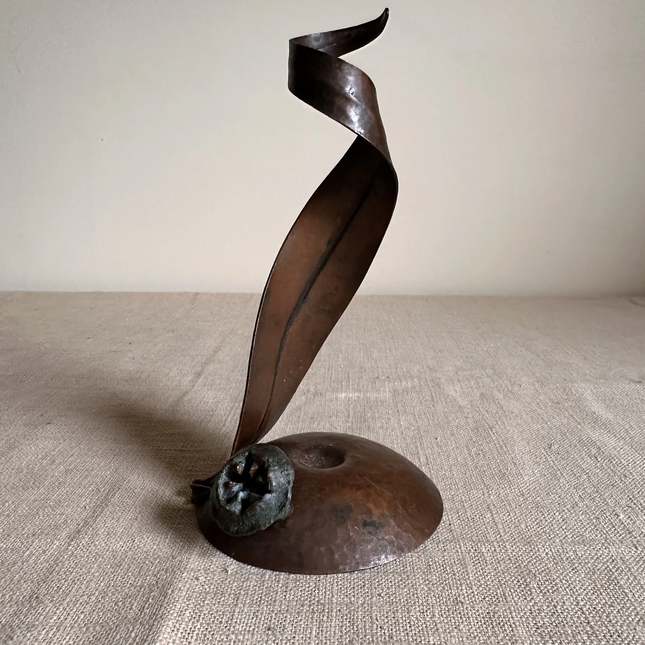 Jauchen’s Copper Shoppe bud vase, San Fransisco CA circa 1920. A hammered copper bud vase with twisting copper eucalyptus leaf and applied seed pod to base. We have seen this form sign by Jauchen’s, this example unsigned. Excellent coniditon. Measures 8.5” tall with glass, 6.25” tall to copper tip, 3.25” wide. $600
