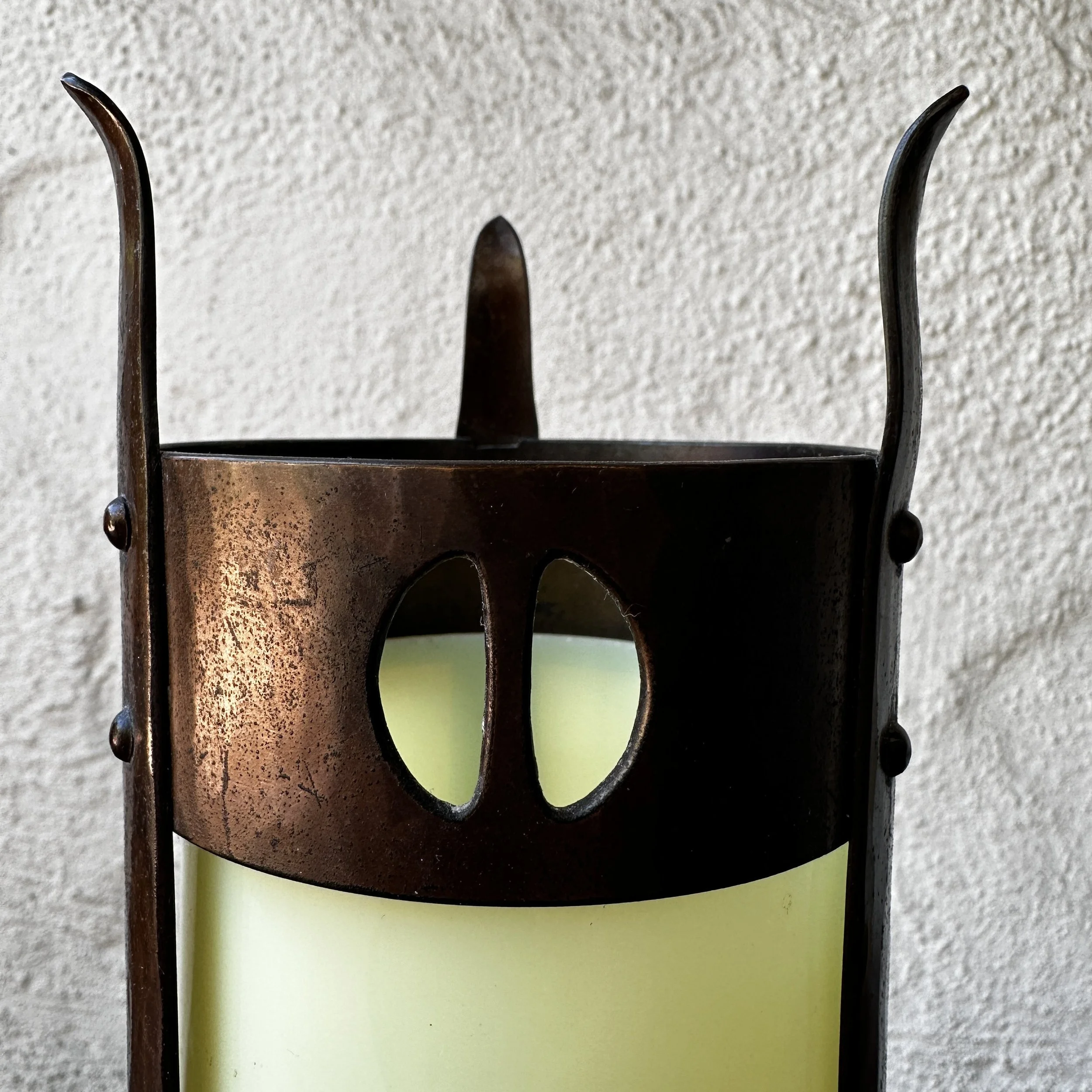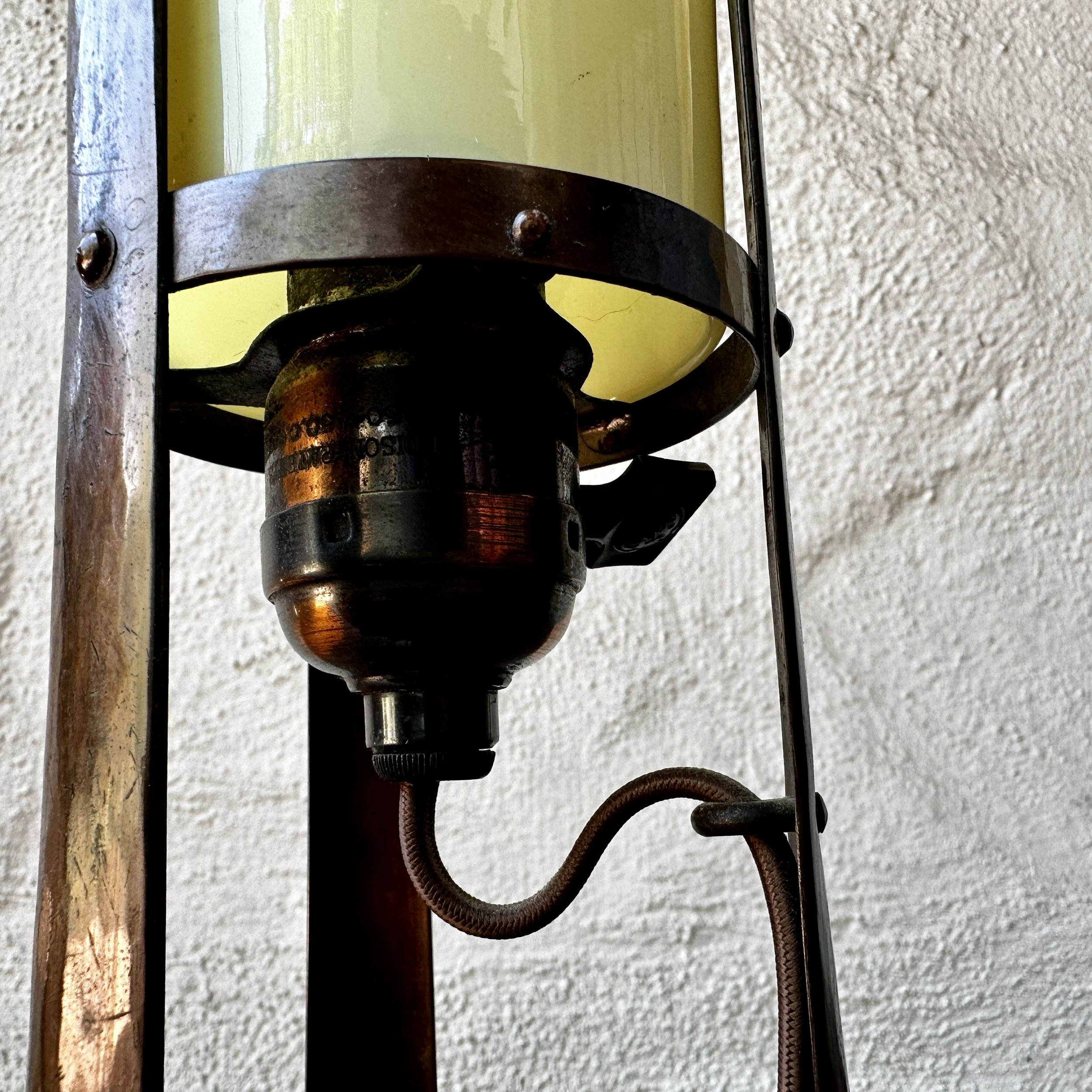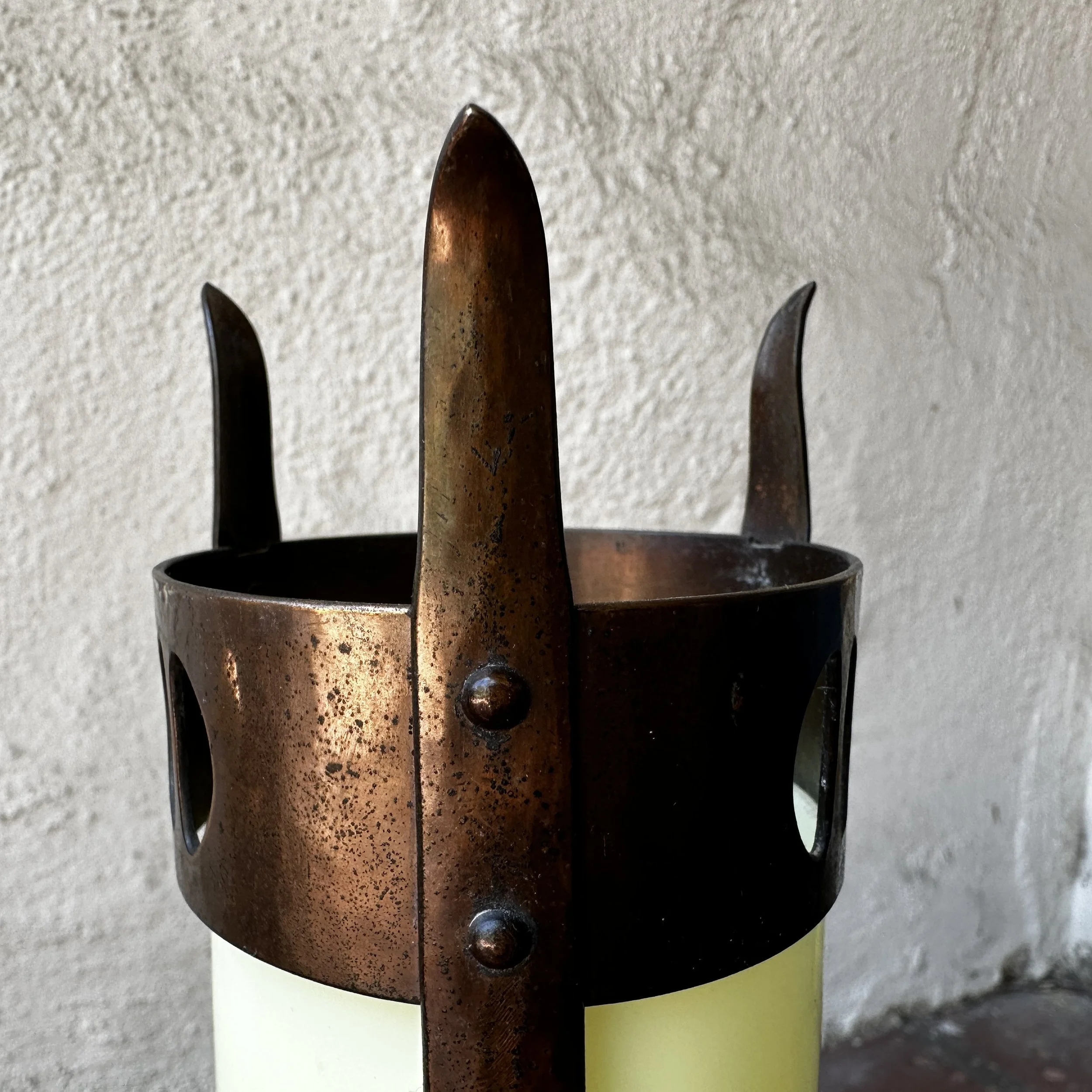 Jesson Birkett & Co. Copper lamp, London England circa 1904. Finely hammered copper domed stand with three soaring riveted hammered posts, connected with circular bands to hold a frosted glass cylinder shade. Base set with three riveted Ruskin ceramic cabachons. Original patina with minor surface pitting. This is the only known copy to have surfaced of this rare and early JB&Co lamp as pictured in period advertisements and their first catalog. Measures 17” tall with the base at 8” wide. SOLD