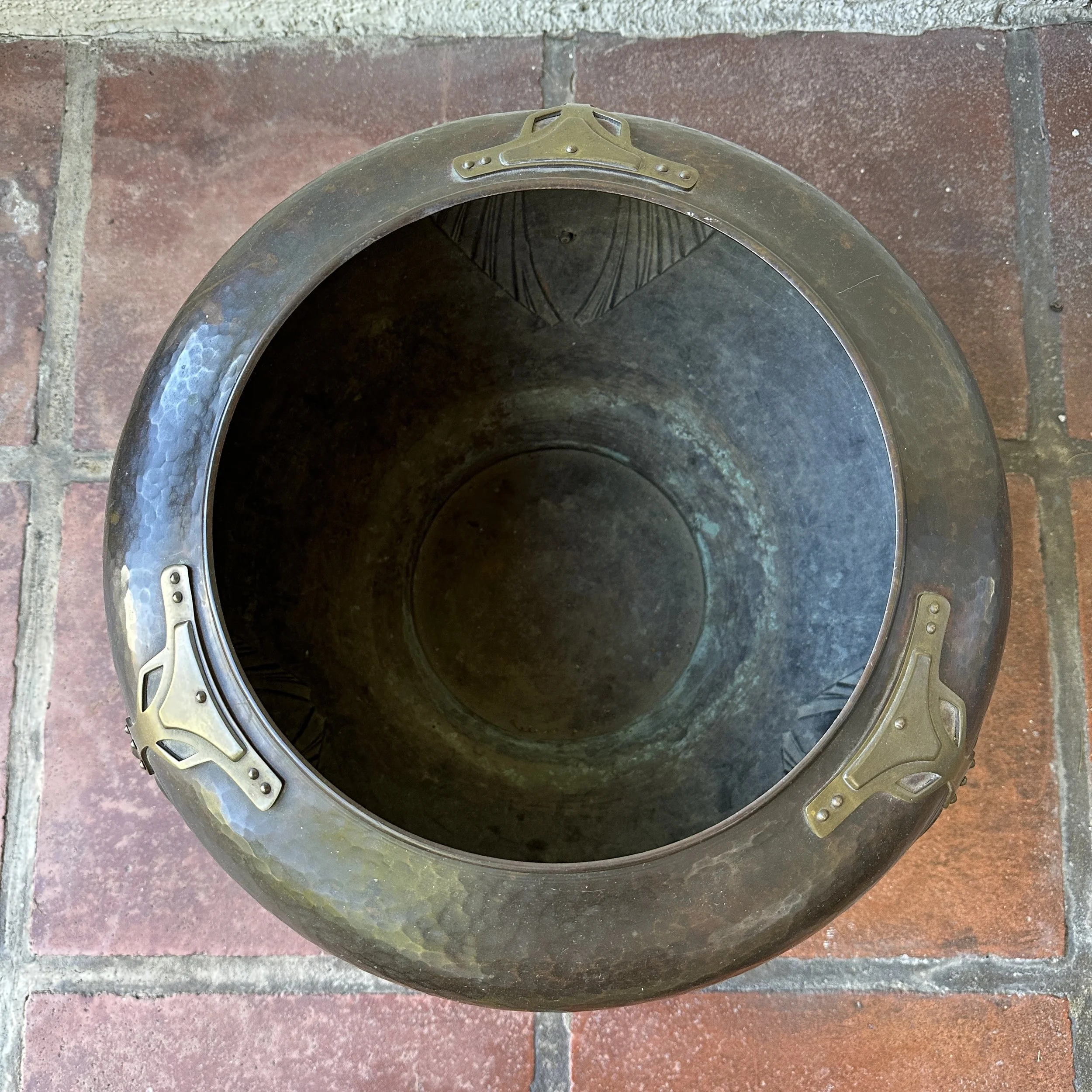 Jugendstil pinecone jardiniere, Germany circa 1904. A phenomenal & large hammered copper jardiniere with three pinecone designs. The central pinecone crosshatch is an applied secondary work of copper attached via two rivets on the interior, creating a dramatic dimensional effect. The branch is represented with an applied and riveted bronze jugendstil element above each pinecone. Retains its deep rich reddish brown patina, excellent condition overall. Measures 14.5” wide & 11” tall, weighs almost 7 pounds. SOLD