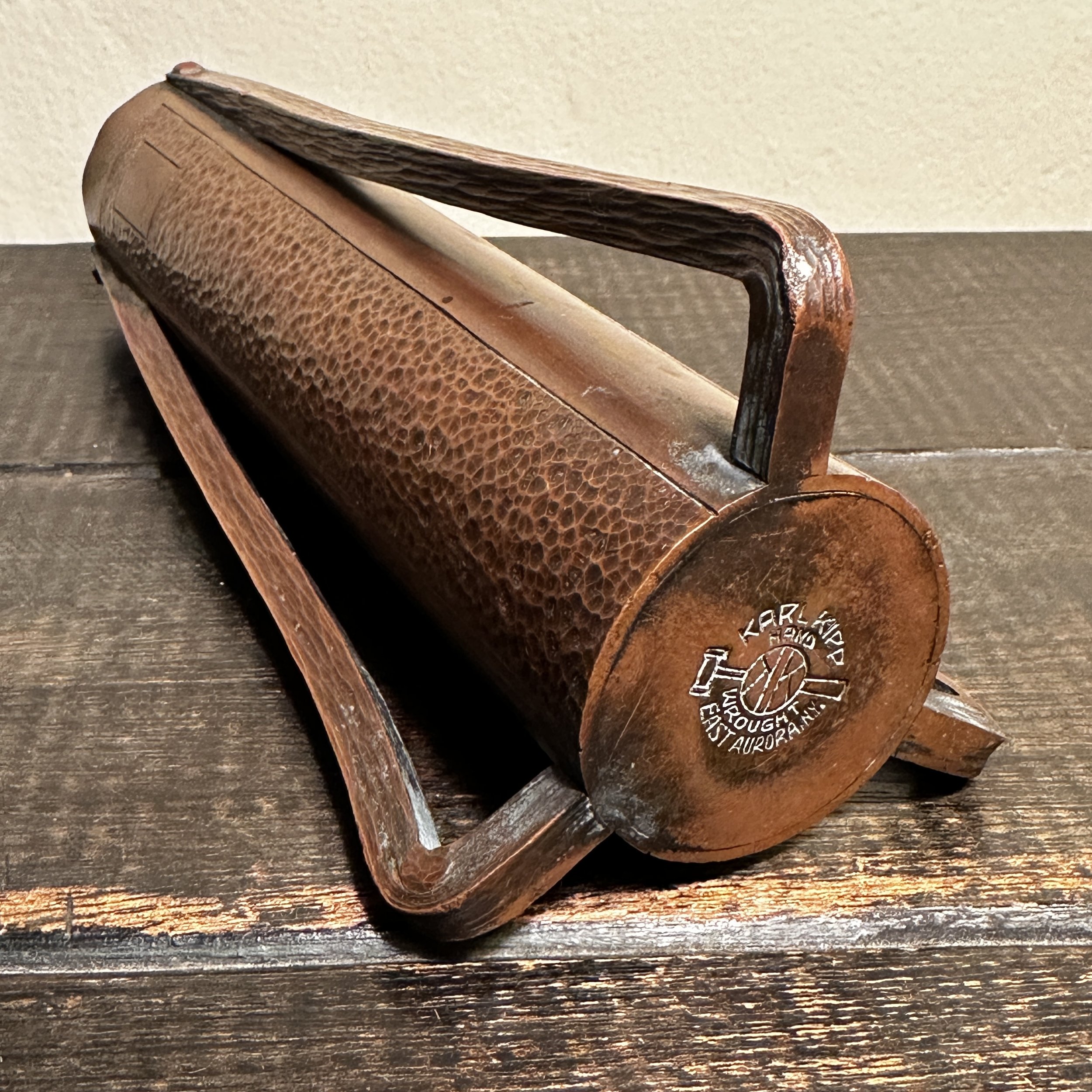 Karl Kipp / Tookay Shop buttress vase, East Aurora NY circa 1912. A very rare form, a hammered copper round vase, supported by three flaring buttress legs riveted at top, finished with long Viennese style rectangular panels. Signed with large Karl Kipp mark. Perfect original caramel patina. Measures 7.5” tall & 1 5/8” wide without legs. SOLD