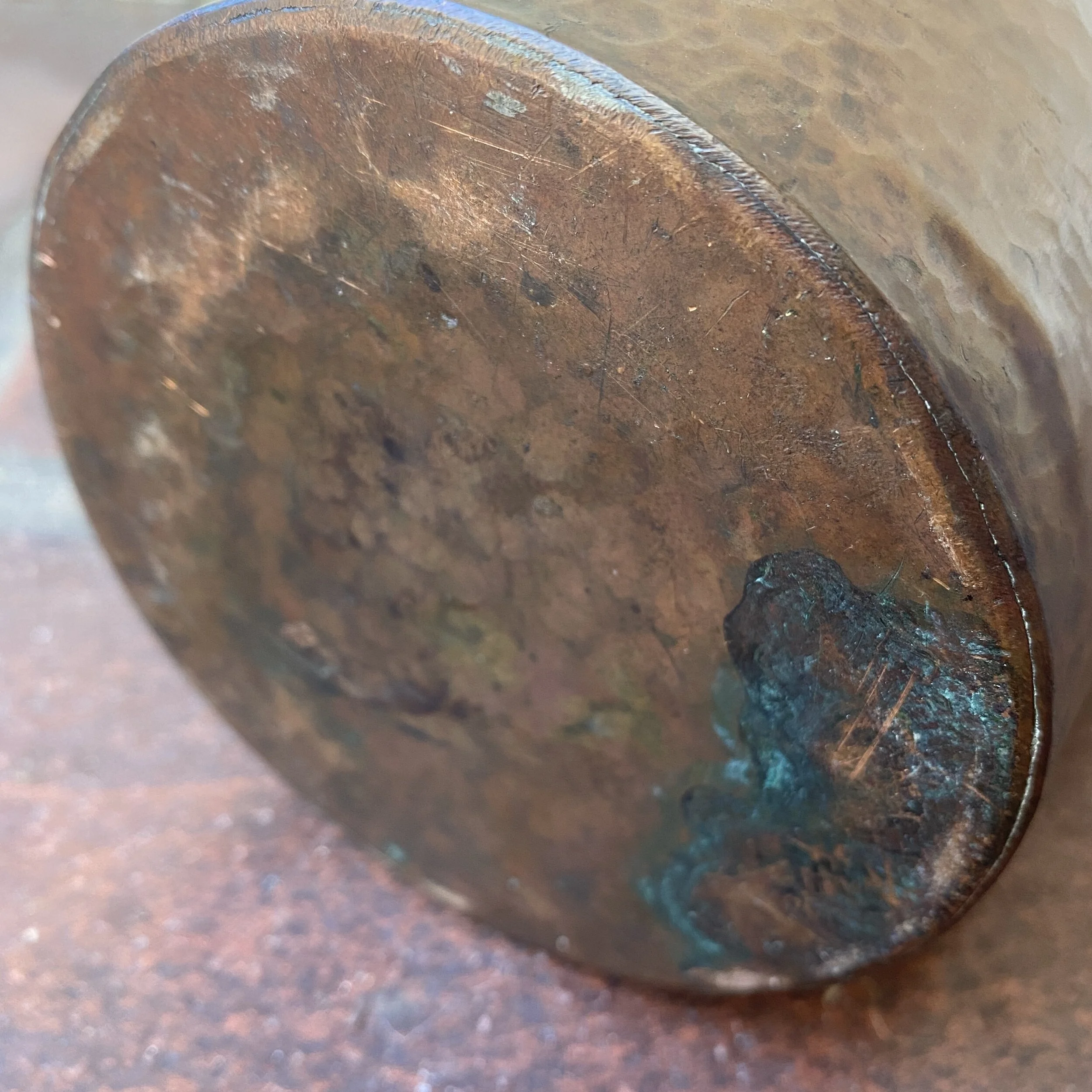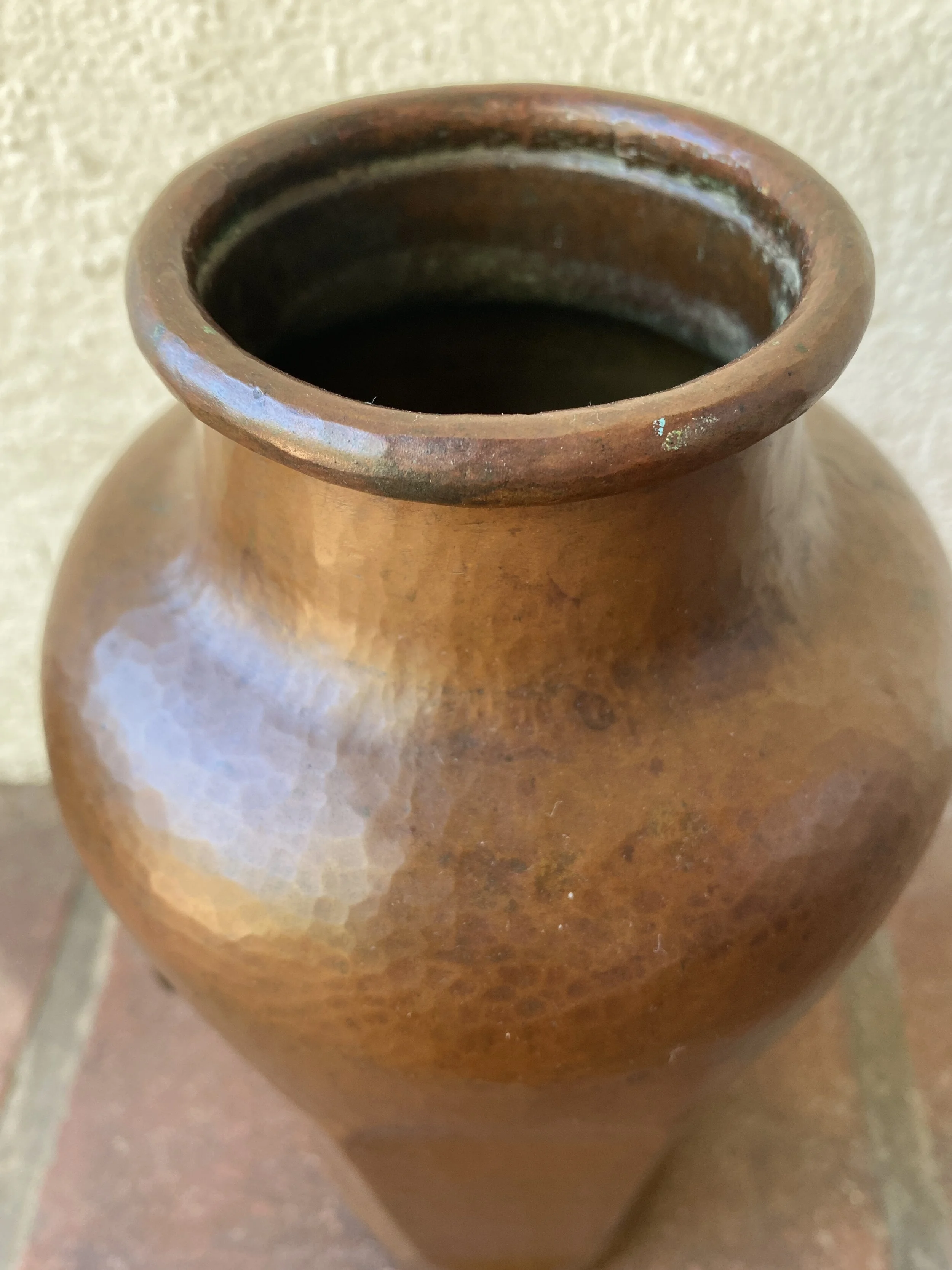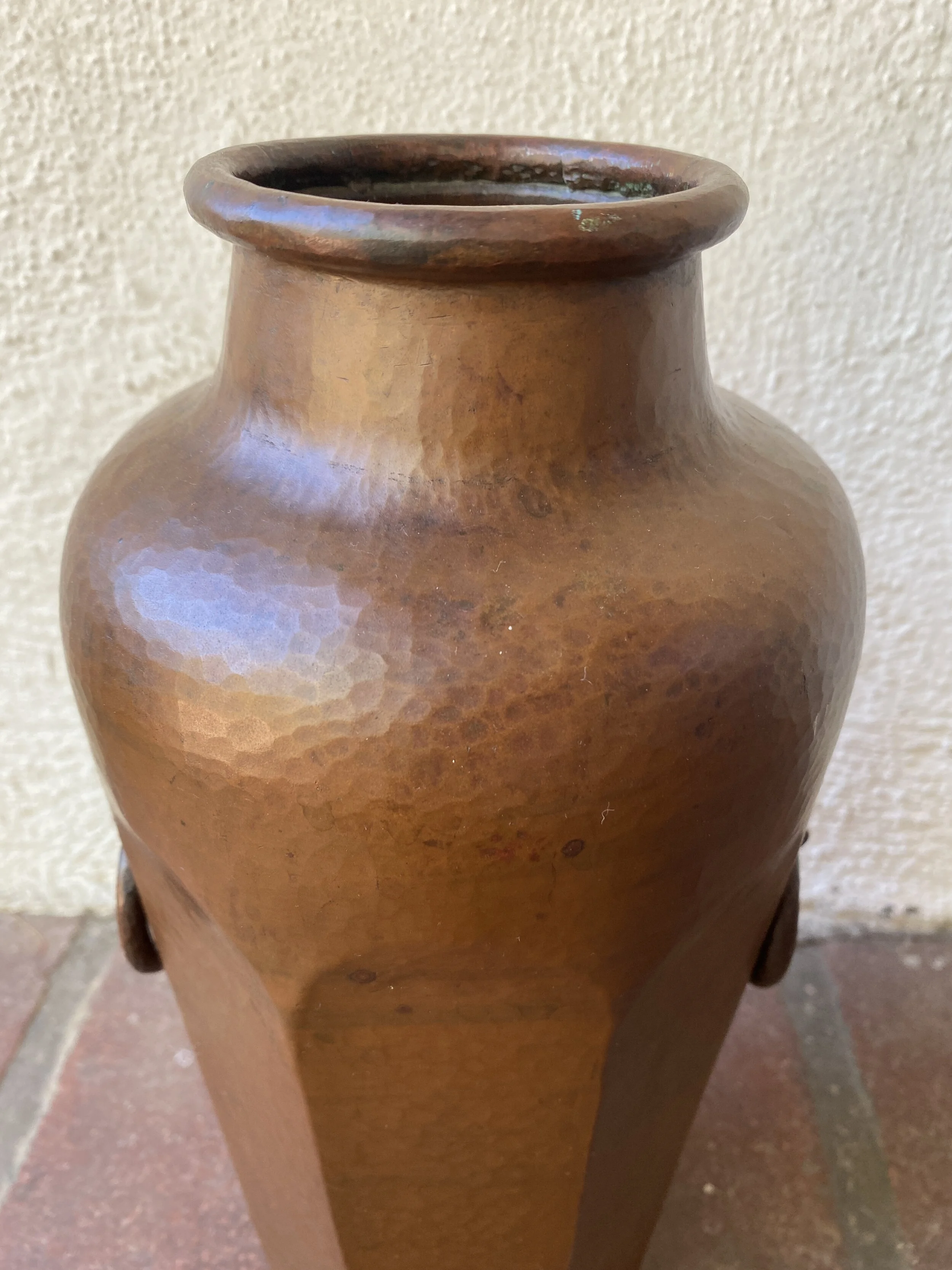 Limbert hammered copper vase, Grand Rapids Michigan circa 1908. This exceedingly large vase is one of two known vases in this form made by the Grand Rapids Russian coppersmiths for Limbert. The vase is not drilled and was not made for use as a lamp base yet it has many of the same design features as known Limbert lamps as seen in the flush side panels and the two handles. Incredible hammering throughout this vase, retains the original patina. Wonderful details in the large rolled rim, the long strap hinges supporting the unique 90 degree stop handles. Some oxidation and minor wear, please see images for details on condition. Measures 13” tall by 6” wide at the shoulders. SOLD