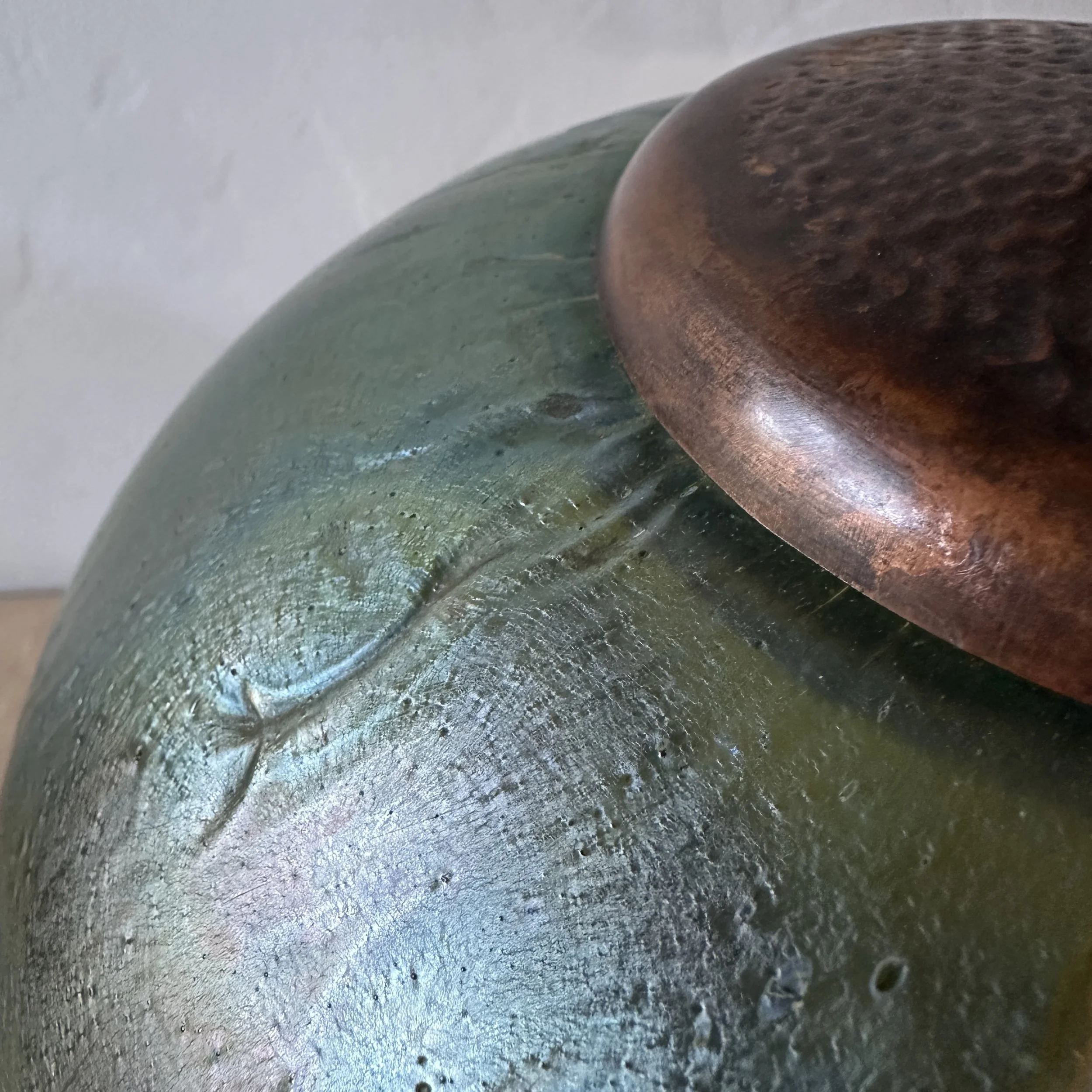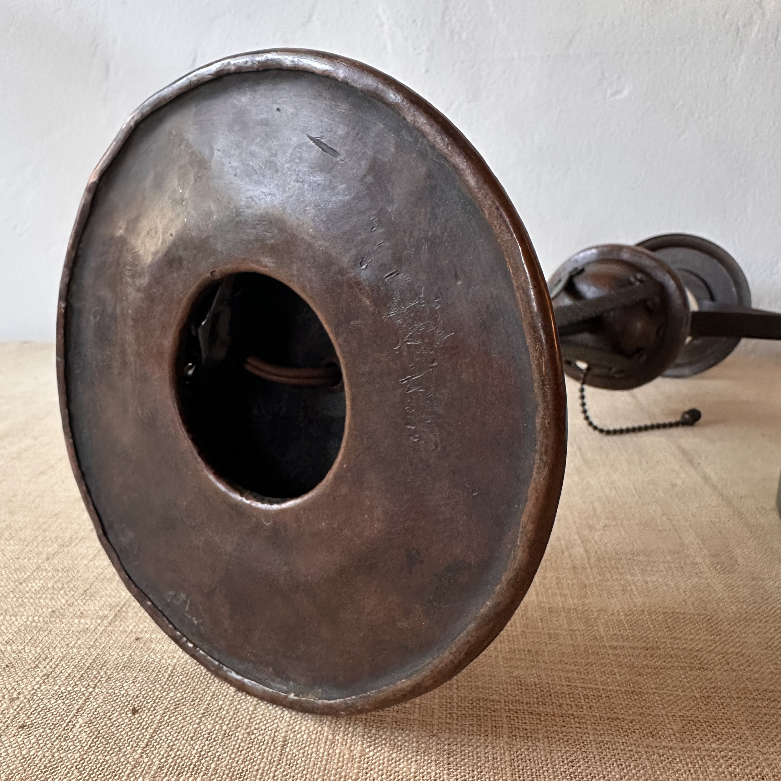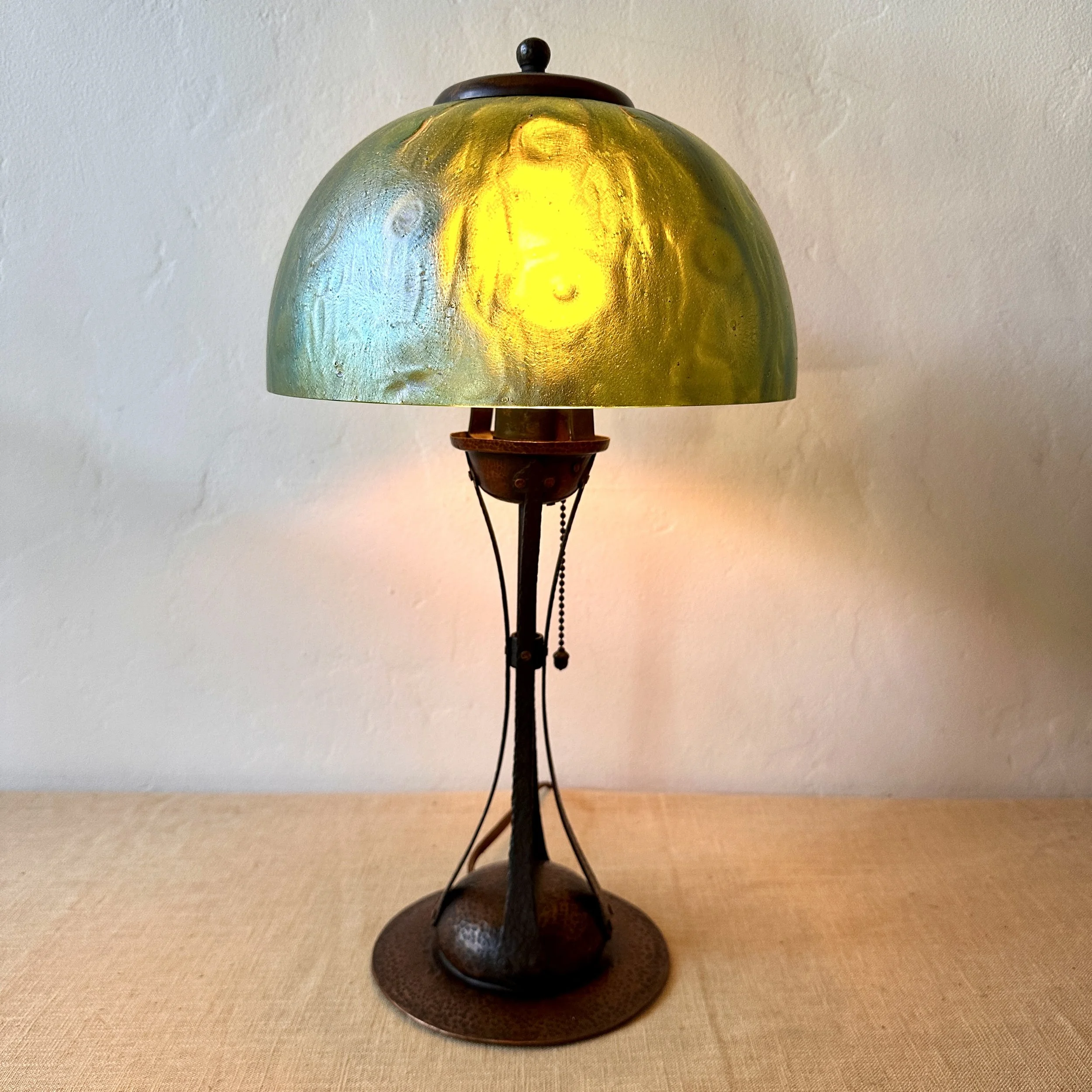 Art Nouveau Loetz table lamp circa 1905. Lamp comprised of a hammered copper strap work and riveted base rising to hold a single socket and armature. The Loetz shade is in the Crete Rusticana line with a Silberrisis iridescence finish, the surface has a tree bark like texture with woody knots. Click here to see examples of this Loetz line of glass. Shade supported by copper platform, hammered cap and finial. Shade likely a period conversion with rough edge under cap, shade otherwise in excellent condition. Original patina to copper base. Measures 18” tall, shade is 9.5” wide. SOLD