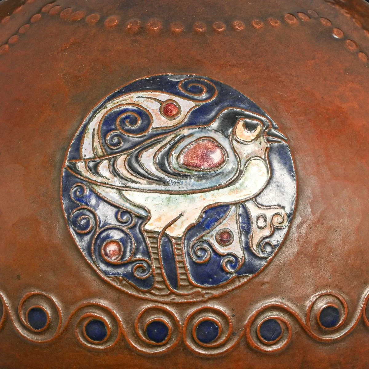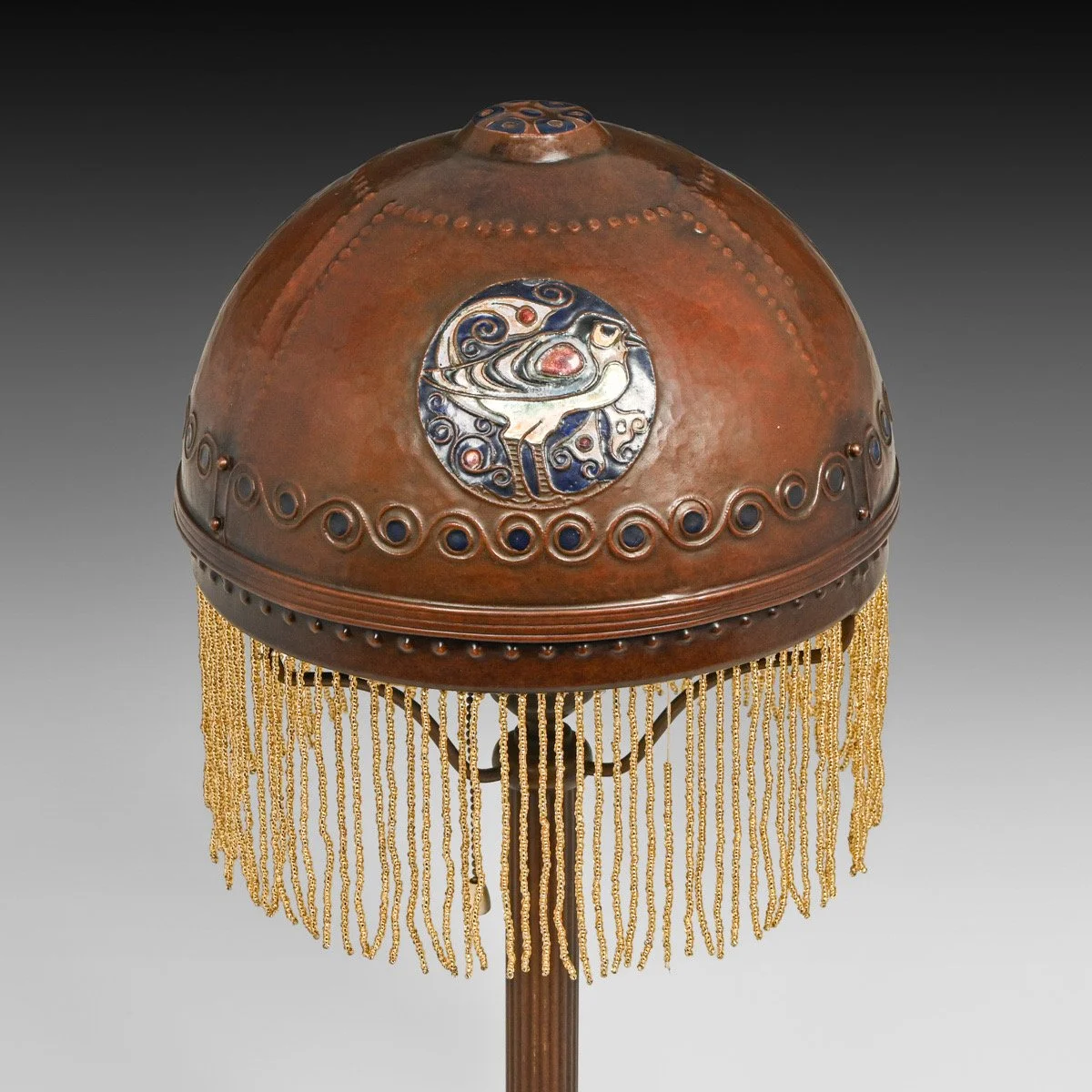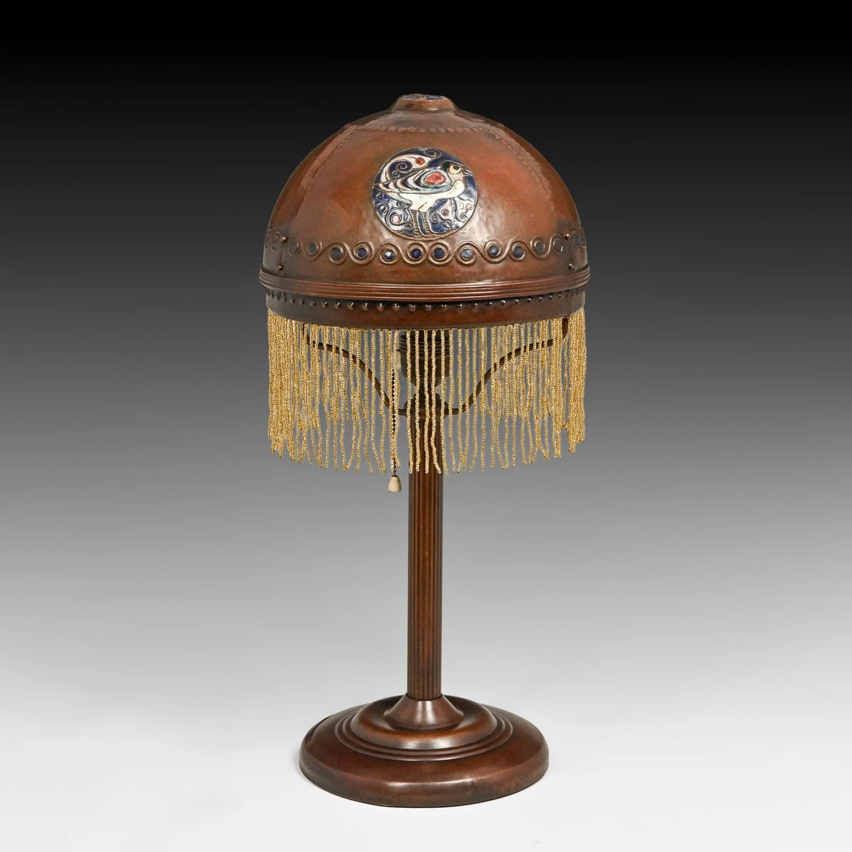 A rare hammered copper and enamel desk lamp. This identical shade was pictured on a variant base in a German art periodical, possibly a larger version. This lamp came from a Berlin collection, the only known example to surface. Shade of finely hammered copper with swirling dot decorations around the body and leading to domed cap, deep blue enamel in recesses. There are three birds around the shade, all done in enamels in shades of blue, black, maroon and white. Shade fitted to a ribbed copper shaft and weighted base. Beaded gold glass fringe, added by owner decades prior due to loses on original beading. TOne of only a few known Vierthaler light fixtures. Measures 20” tall and shade is 9” wide. $7,500
