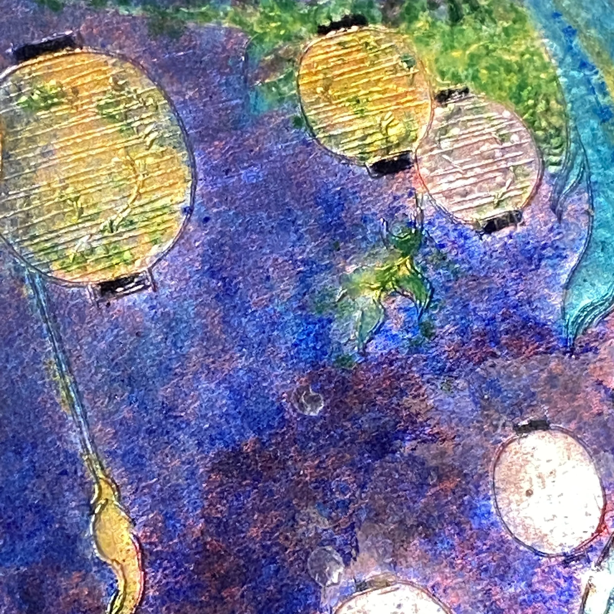 Frank Marshall copper & enamel chamber stick, Boston Society of Arts & Crafts circa 1905. A large, rare & extraordinary hammered copper chamber stick set with an oversized curved enamel panel by Frank Marshall featuring a roosting peacock surrounded by floating Japanese lanterns. Perhaps the only extant example of this form, we have yet to see another surface. The enamel has detailed copper hammering, etching and repoussé work under the vivid enamel, typical of Marshall work. The enamel has a minimum of ten colors melting across the design, outlined in black enamel and set behind a folded copper border opening in the back plate. The heavy copper chamber stick is hand crafted; the classic Boston border around the lower edge, a large original flaring hand hammered removable bobeché, a folded thick copper handle is riveted on the back and the enamel is protected by a secondary copper back plate. Unsigned as is typical of this work. An original rich dark brown patina is intact, enamel in pristine condition, very minor bend to edge of front raised copper panel on base. This is one of the largest Boston enamel objects to surface, see scale set with other period examples. Measures 7.5” tall, 5.5” wide and 5.5” deep, enamel is just about 4” tall and 3” wide, weighs just under 2 pounds. The beauty of this form is the enamel is set upright to display visually unlike the more typical box designs. SOLD