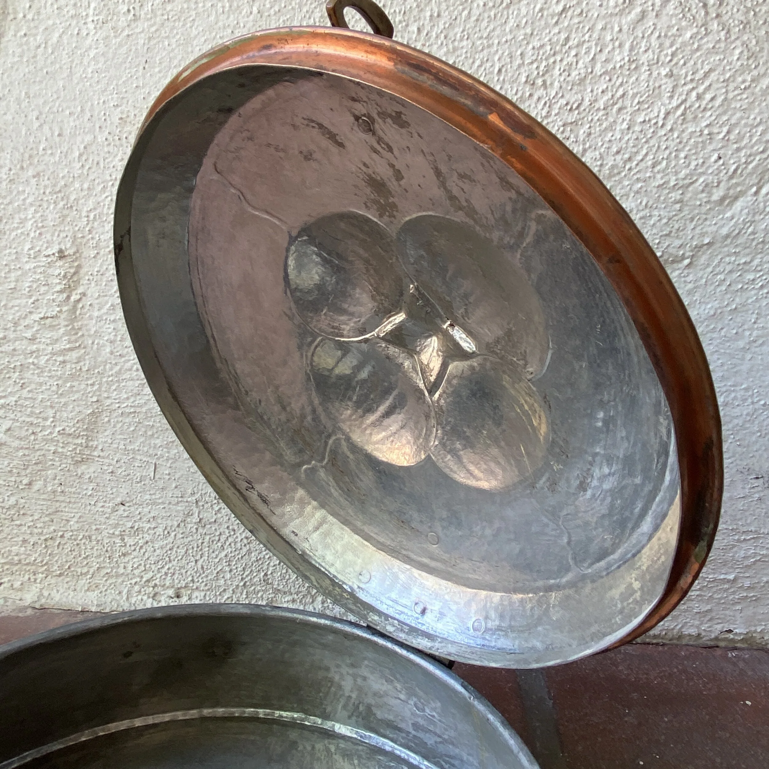 Friedrich Müller hammered copper bread box, Nürnberg Germany circa 1906. Müller was an individual coppersmith creating unique handmade pieces outside of any manufacturing firm. While in Nürnberg, he studied closely with Peter Behrens. This large piece is unsigned yet has the characteristic hallmarks of his work - same handle design & object form as seen in other signed pieces of his work. The large bread box is hand hammered across the entire form with a wonderful hammered floral motif rising in the center. The handle and hinge are Jugendstil cast pieces in brass. Measures 15” wide and 7” tall. Some of the best German Arts & Crafts work we have handled. SOLD