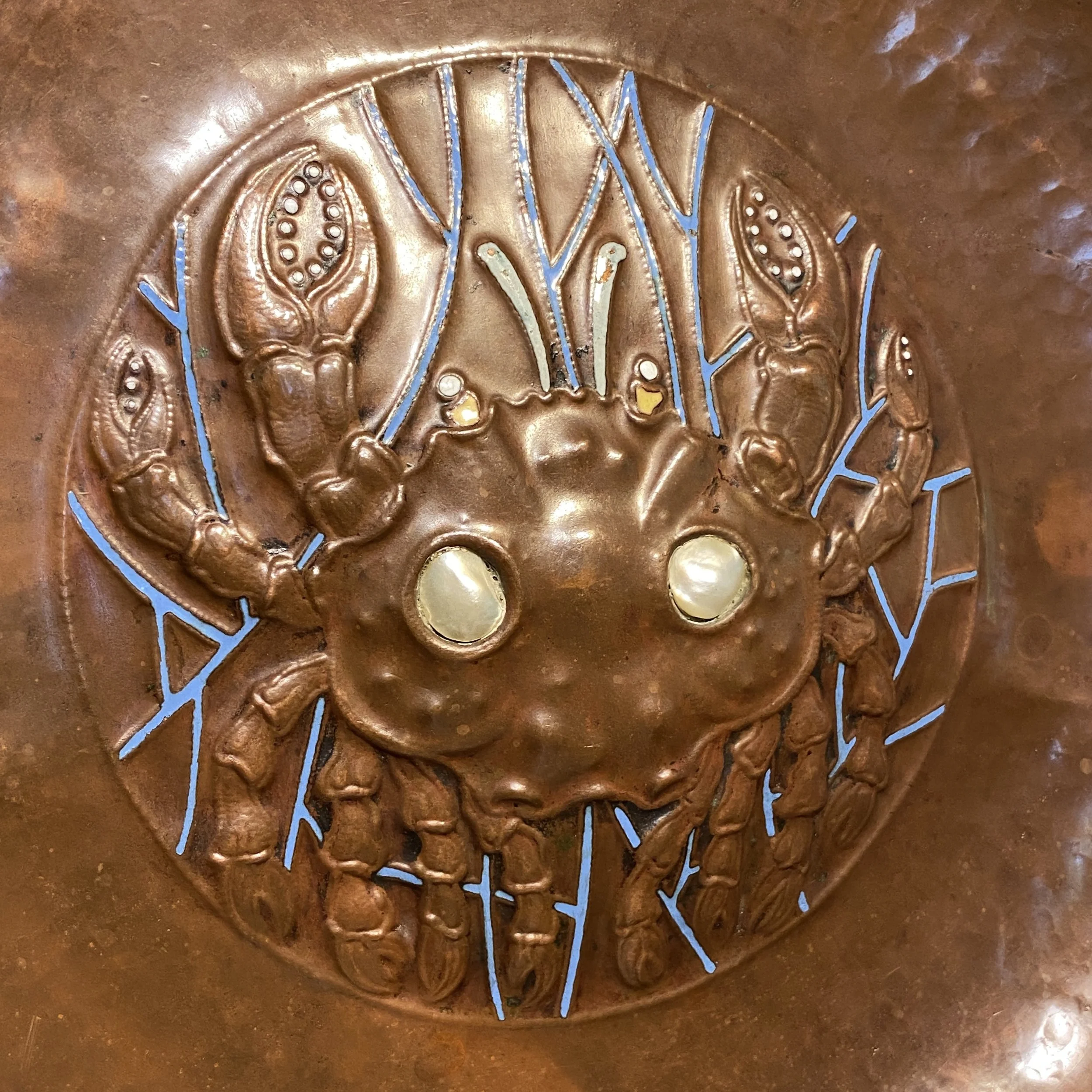 Ludwig Vierthaler school for Winhart & Co. copper crab charger, Munich Germany circa 1908. This incredible hammered copper tray features a central hand worked crab with mother of pearl “stones” surrounded by blue enameled coral. This charger was featured in KUNST UND HANDWERK in 1908, an article on the work done at the Munich Royal Academy of Art. The caption mentions Victor Surbek as the possible designer, with all the work crafted by Winhart & Co. This is clearly a design taught by Ludwig Vierthaler based on his sea motif themes used on his pieces for Winhart at this time. The tray is hand crafted, featuring six lobes around the edge, the central crab is completely hand worked as seen in the hammering details on the reverse. The enamel is worked in blue, white & yellow on the crab legs & antenna and the surrounding coral. Rarely seen on Winhart forms, a key feature on Vierthaler works, are the large & deeply embedded mother of pearl stones on the crab body. Vierthaler strove to include a part of the ocean in his work as a tribute to the influence on his designs. Mint original condition and patina. Measures 10” wide and 1.25” tall. SOLD
