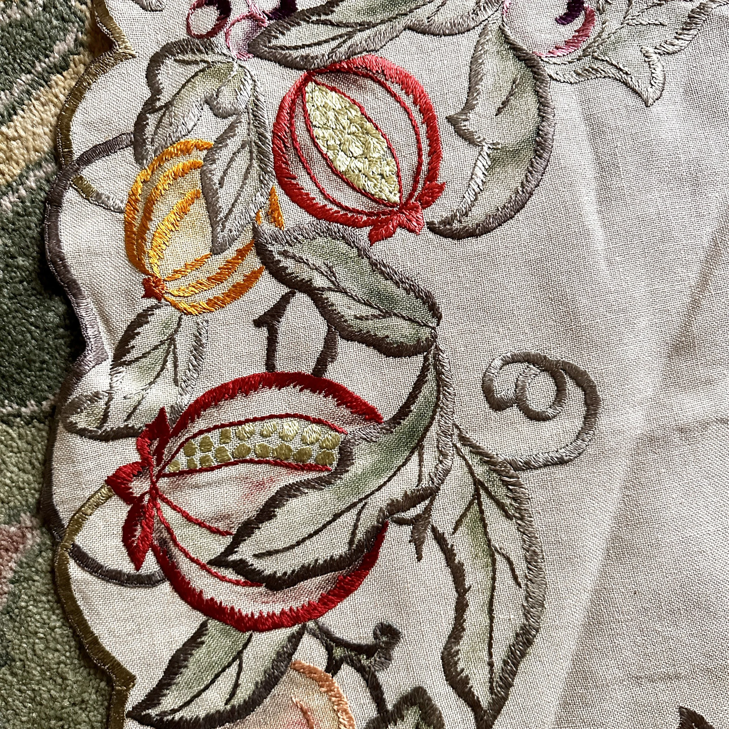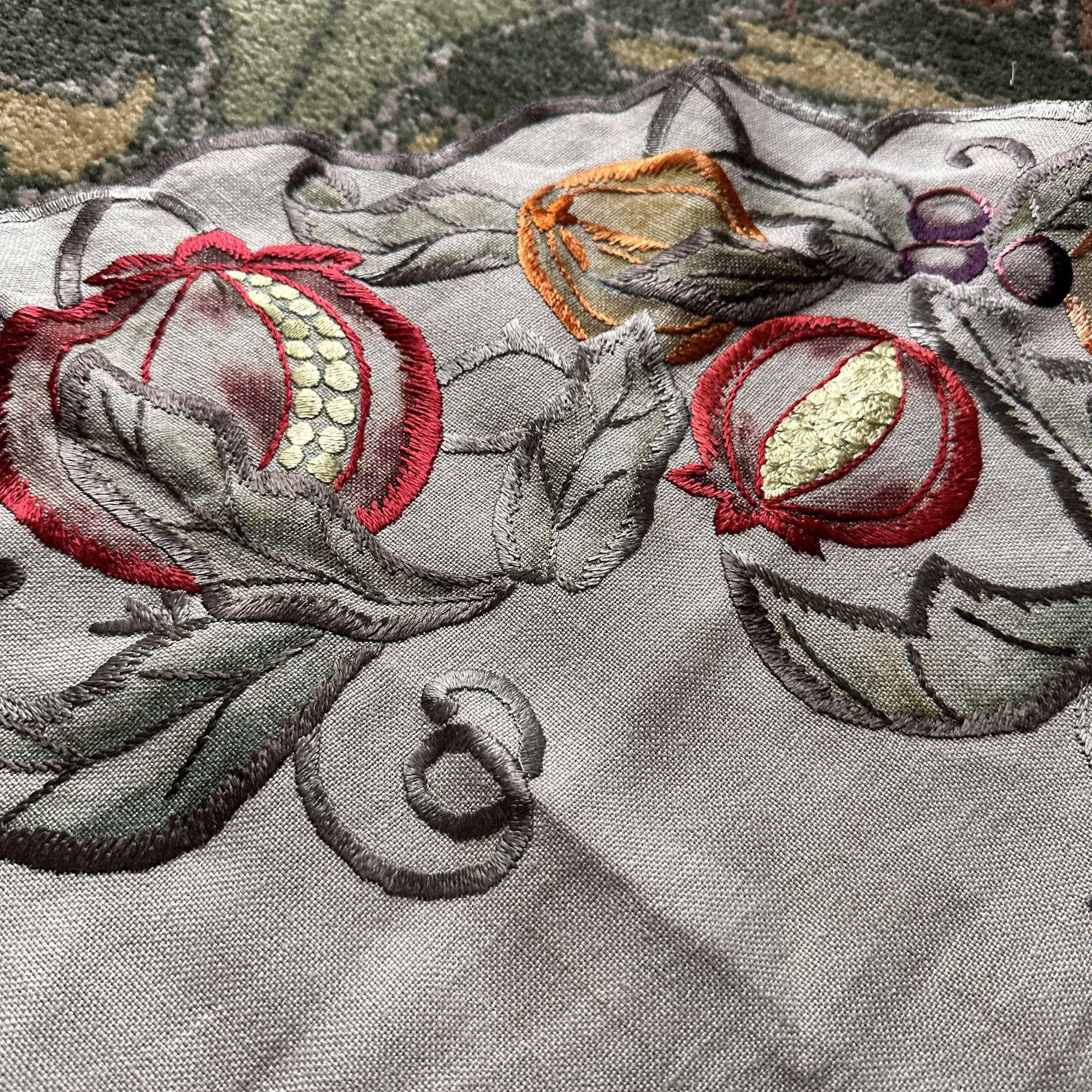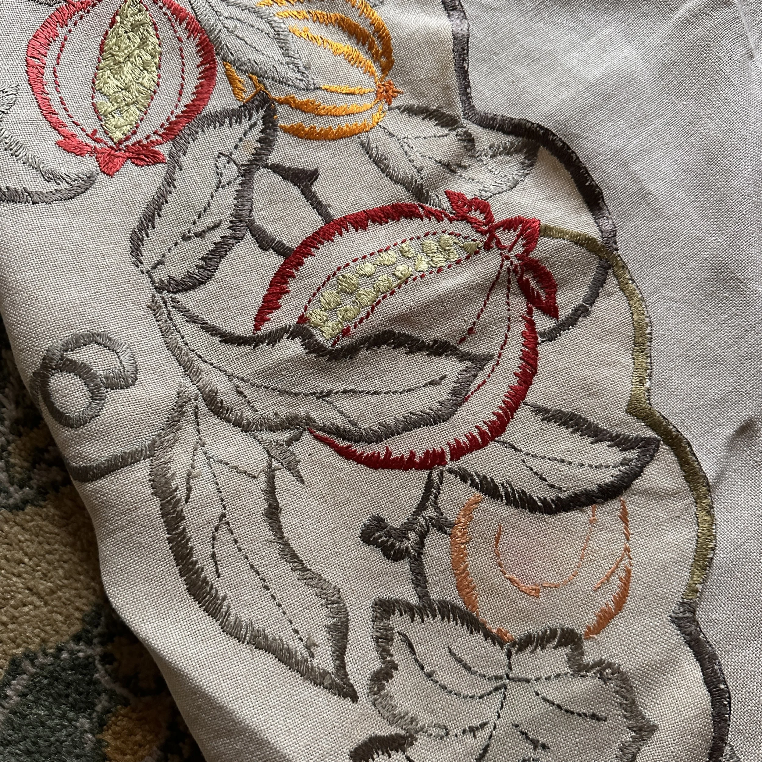 Arts & Crafts table linen circa 1915. A large linen embroidered with pomegranates, oranges and grapes. Embroidery accented with painted linen around patterns. Overall very good condition, no holes or major stains. Measures 44” across. $150