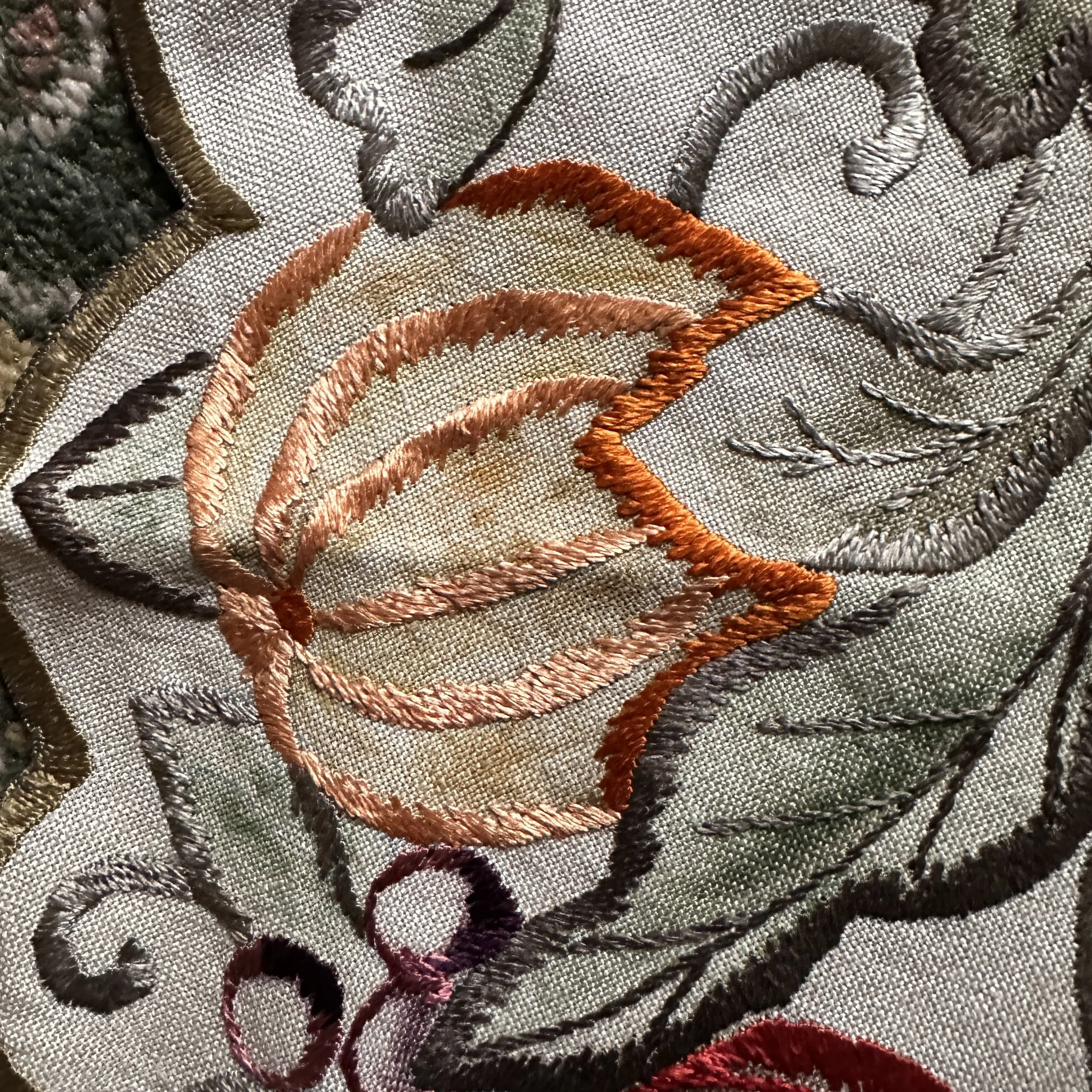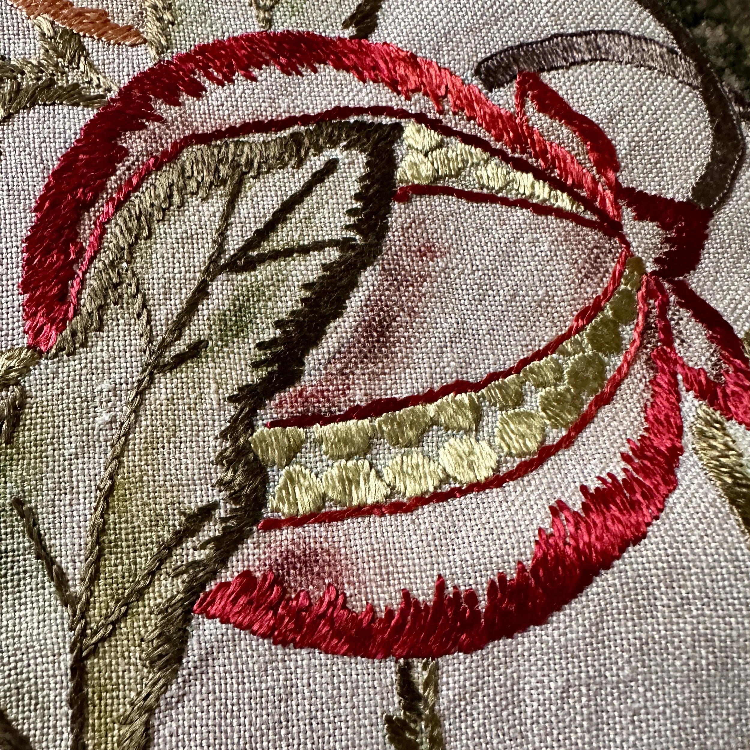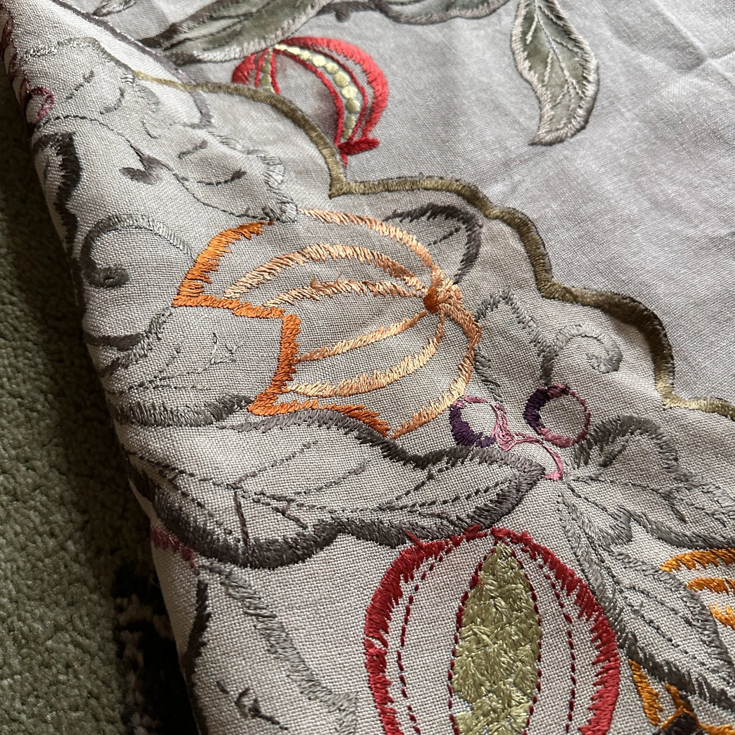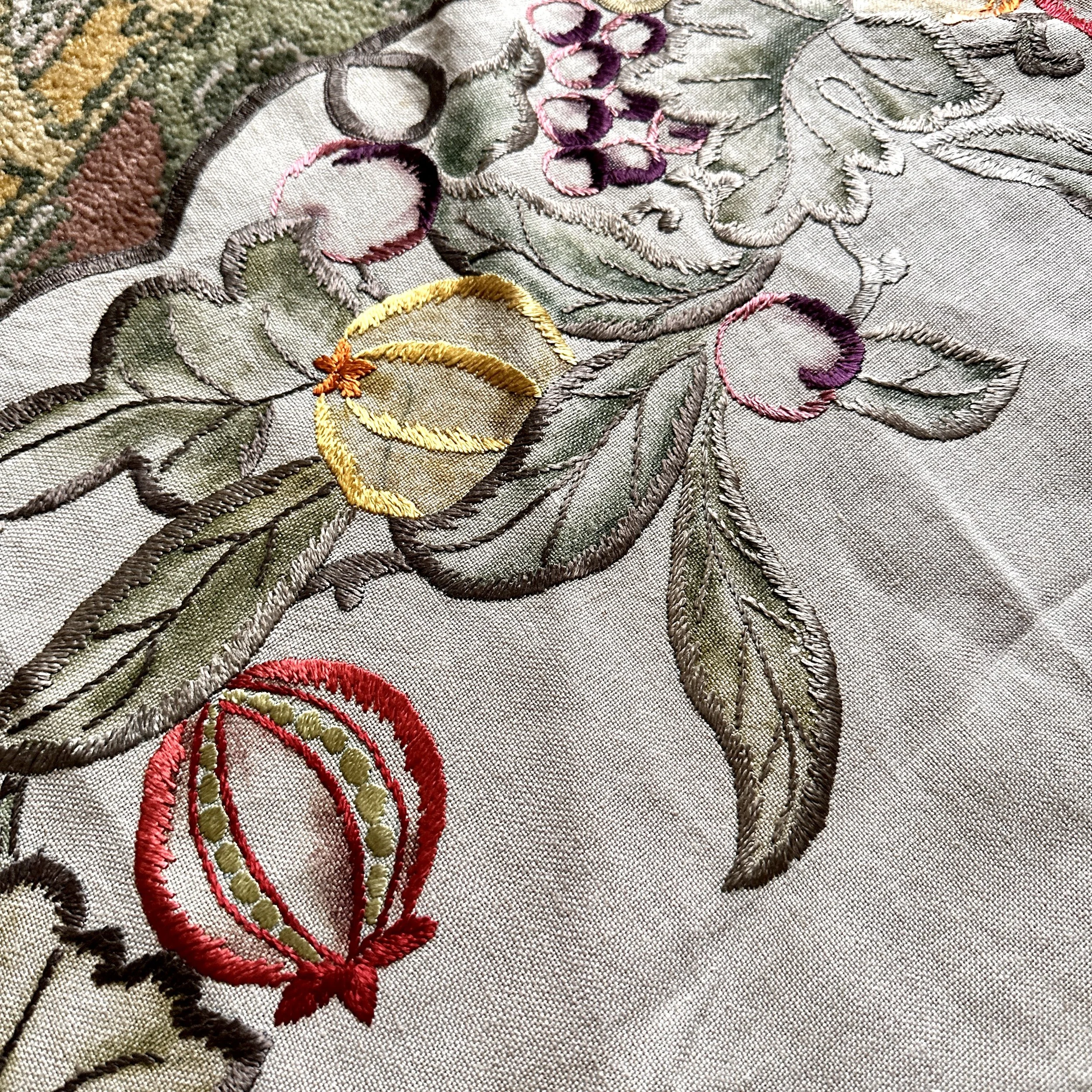 Arts & Crafts table linen circa 1915. A large linen embroidered with pomegranates, oranges and grapes. Embroidery accented with painted linen around patterns. Overall very good condition, no holes or major stains. Measures 44” across. $150