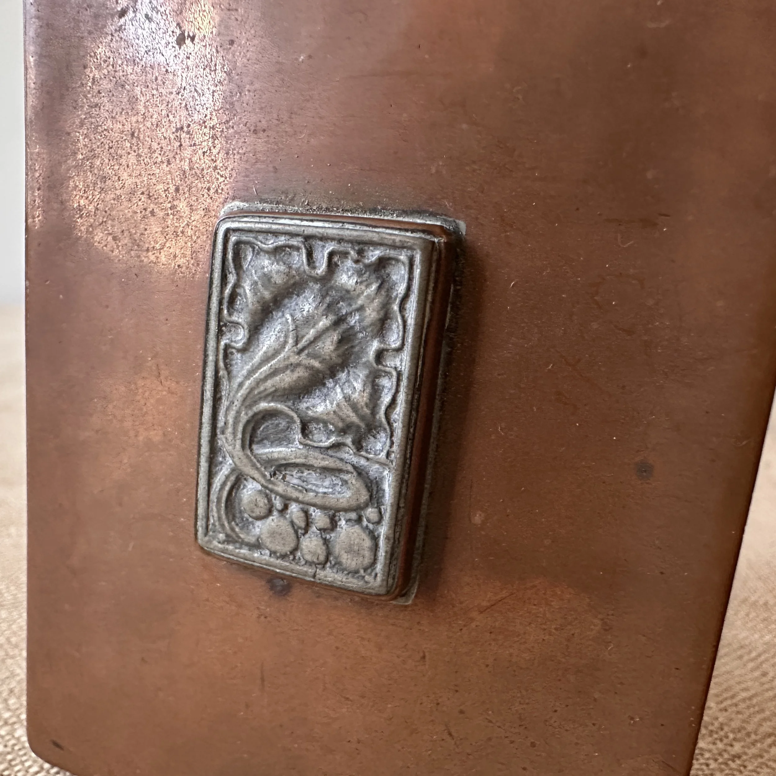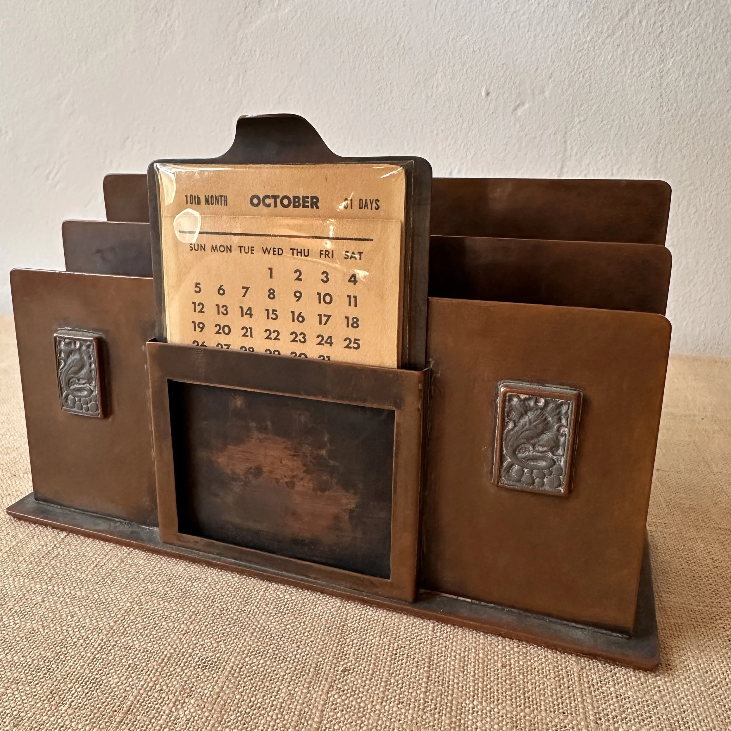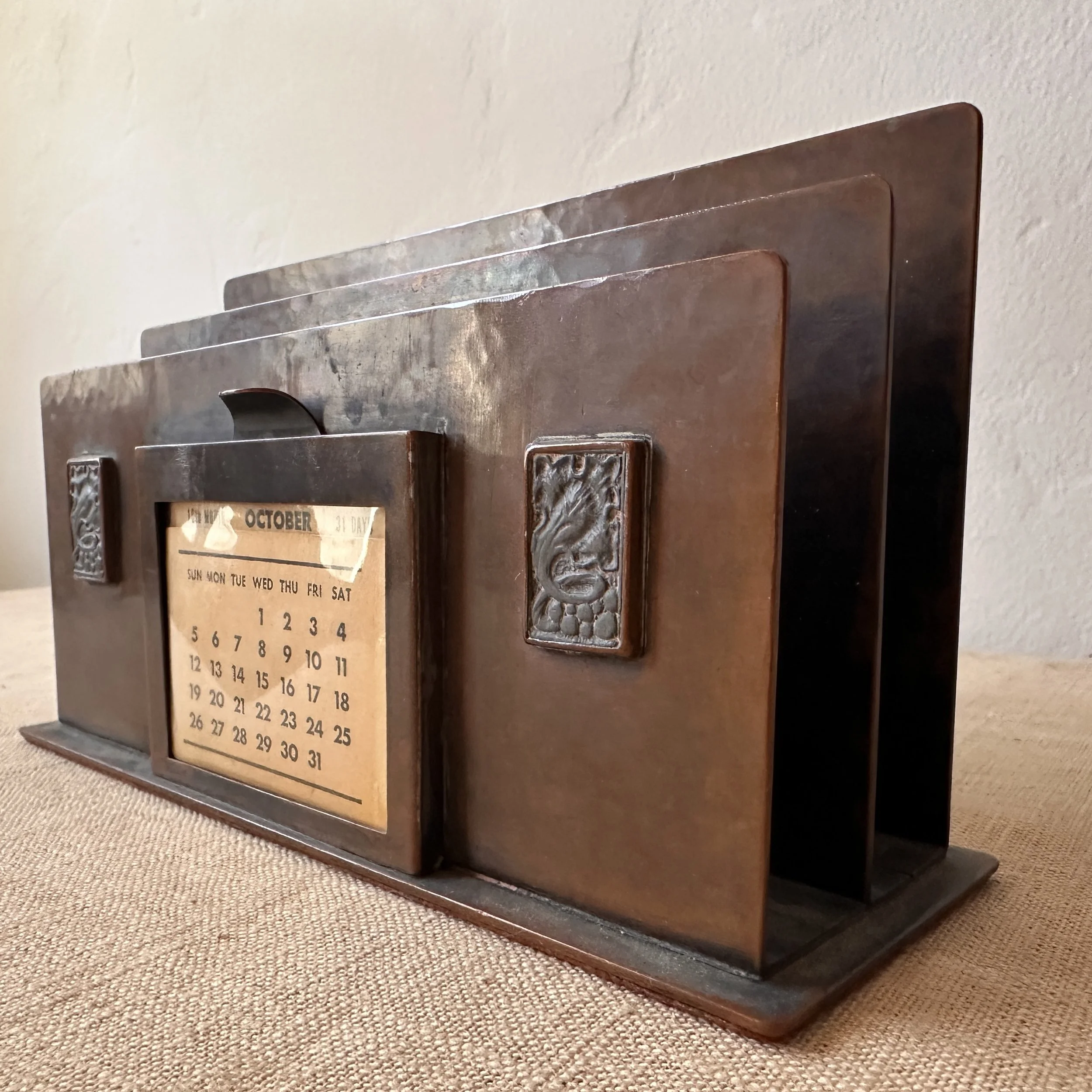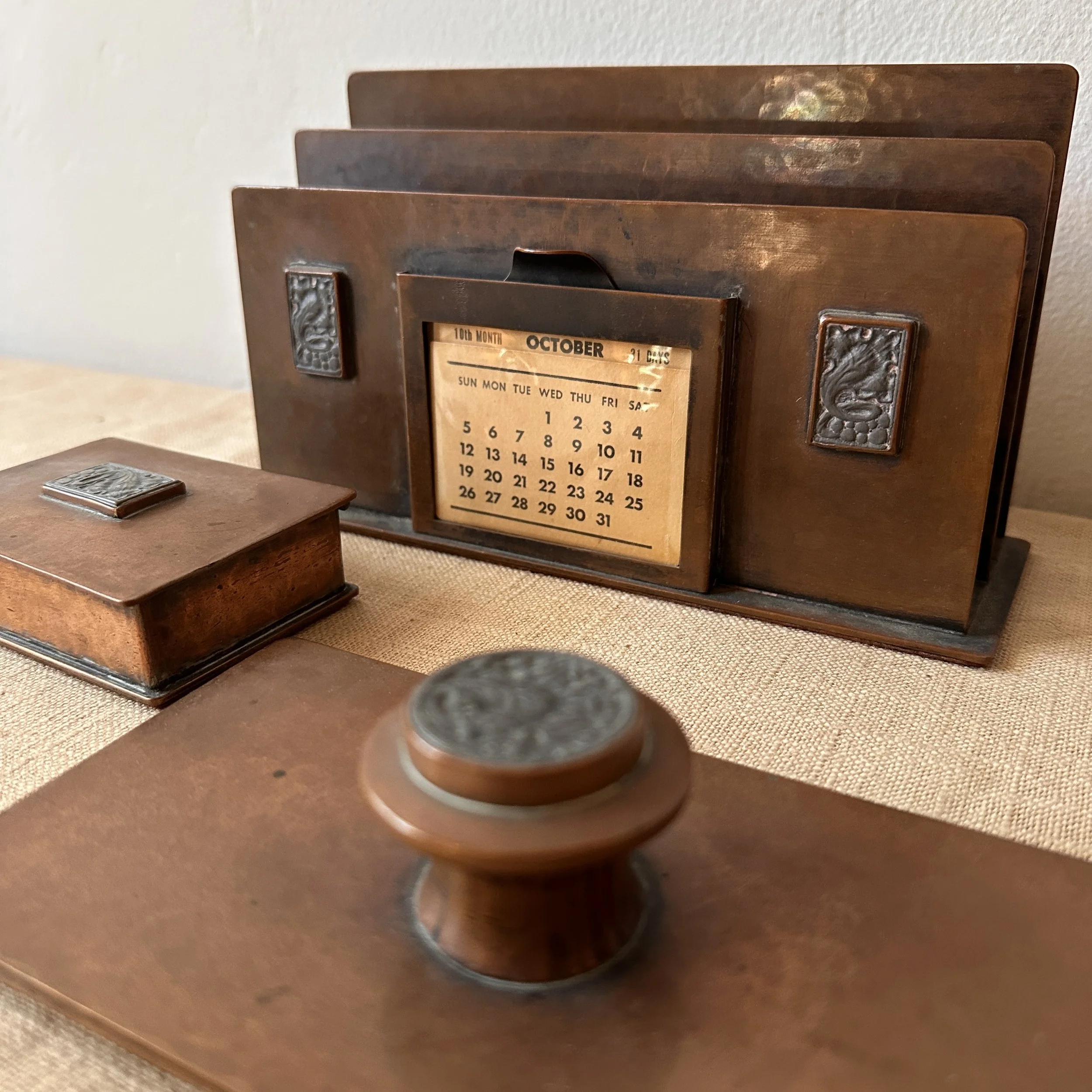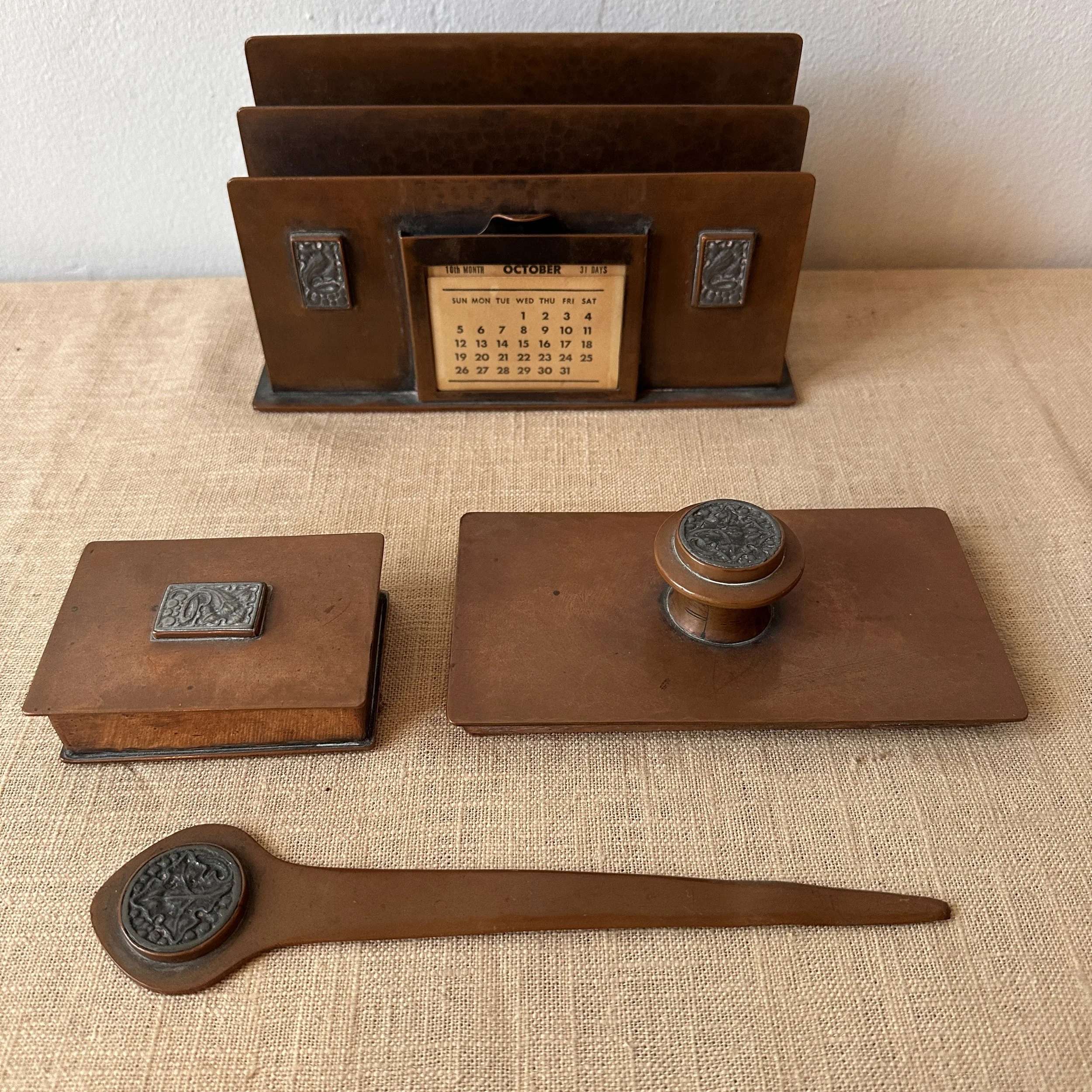 Potter Studio desk set, Cleveland OH circa 1915. A gorgeous hammered copper desk set consisting of a heavy letter holder with front calendar, stamp box, letter knife and paperweight. Each piece has a set piece of pewter with a floral pattern. The calendar has a copper finger handled fitter to pull the cards up and out, all cards present. Original condition, each with original brown felt on base, three pieces signed. Some light patina wear to stamp box. Exquisite workmanship and hammering. Holder measures 8” wide, 4.5” tall and 2.5” deep, knife is 8” long. $850/set