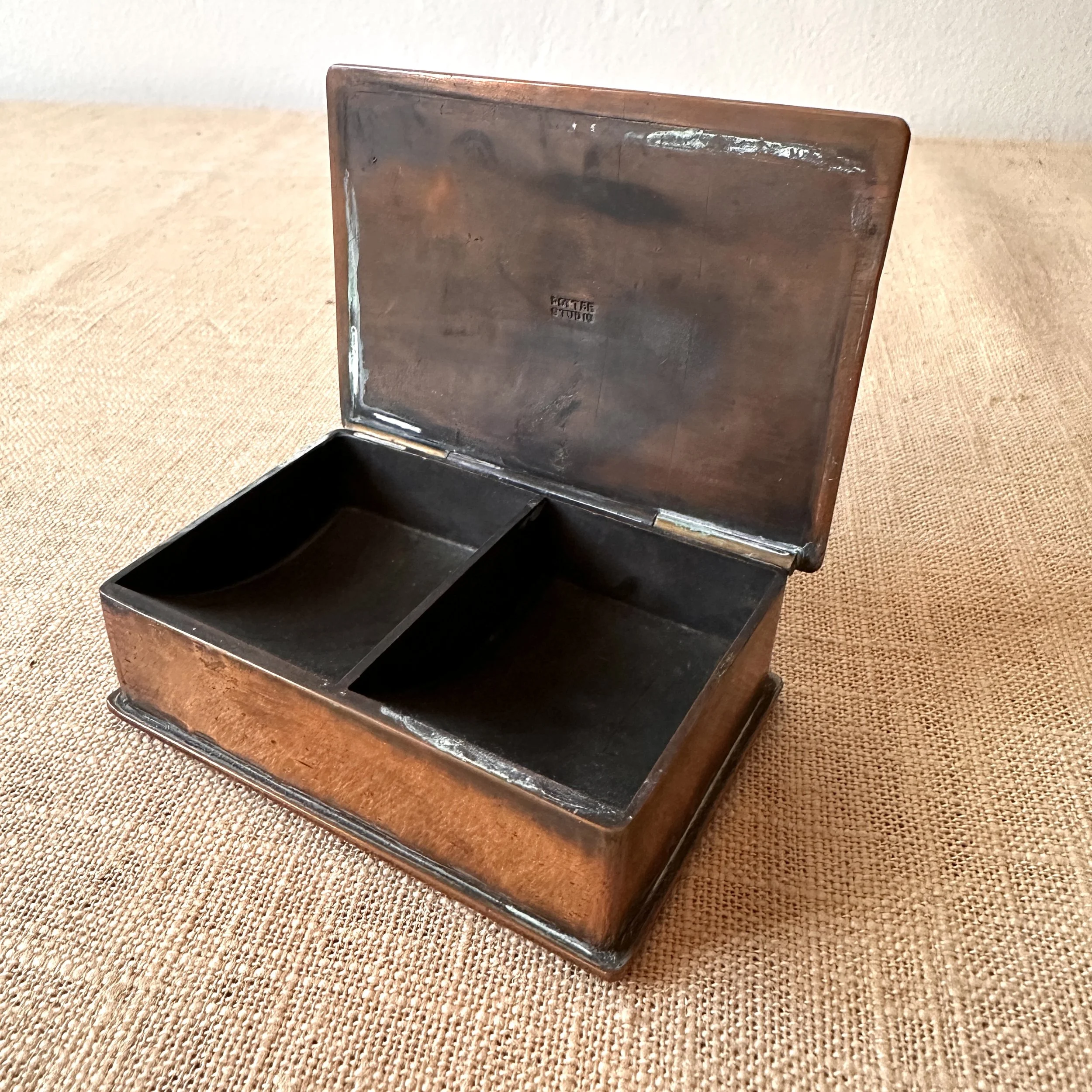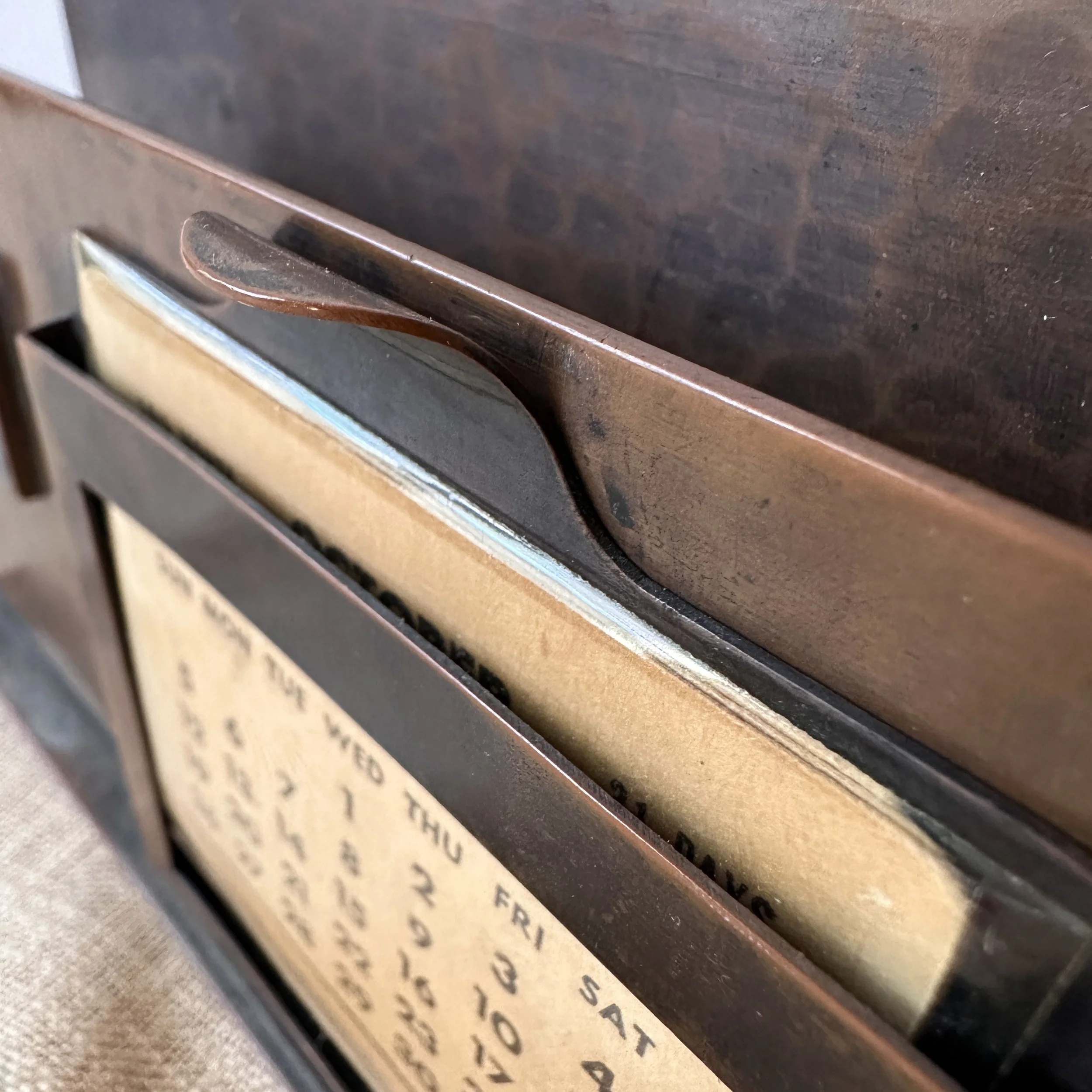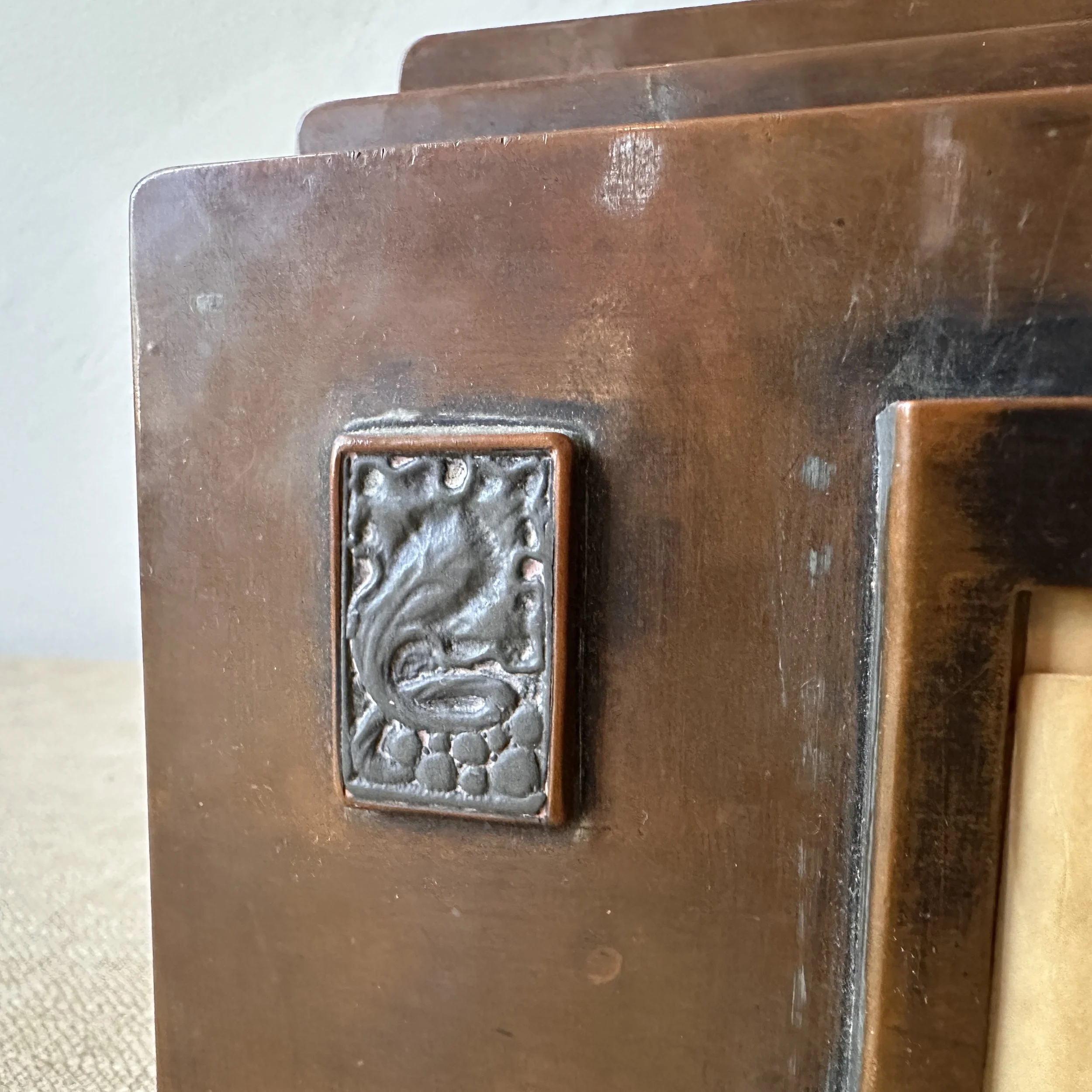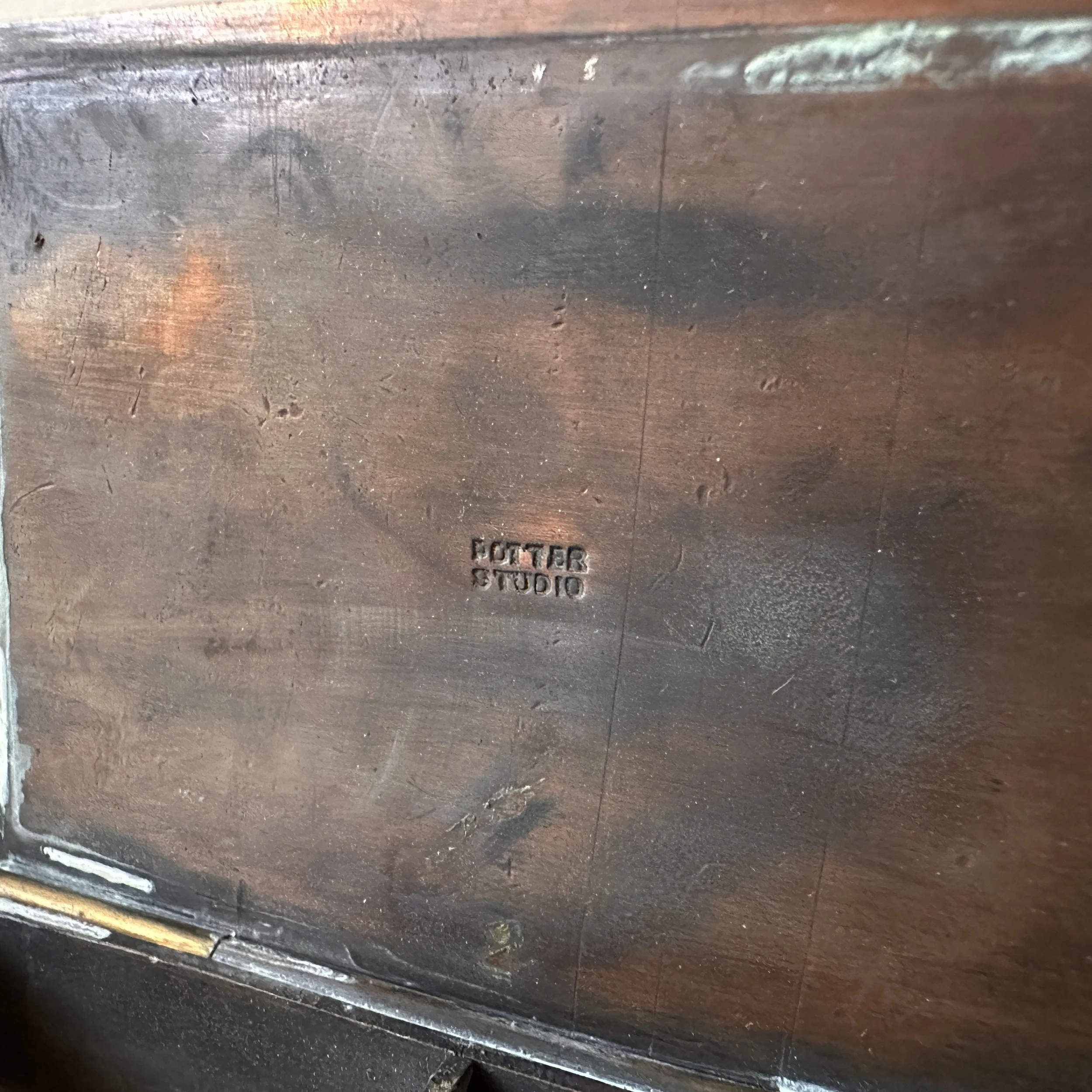 Potter Studio desk set, Cleveland OH circa 1915. A gorgeous hammered copper desk set consisting of a heavy letter holder with front calendar, stamp box, letter knife and paperweight. Each piece has a set piece of pewter with a floral pattern. The calendar has a copper finger handled fitter to pull the cards up and out, all cards present. Original condition, each with original brown felt on base, three pieces signed. Some light patina wear to stamp box. Exquisite workmanship and hammering. Holder measures 8” wide, 4.5” tall and 2.5” deep, knife is 8” long. $850/set