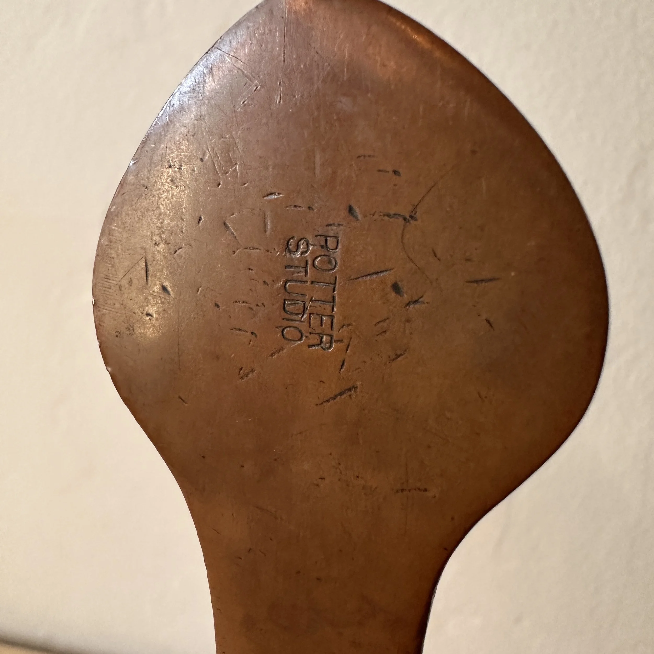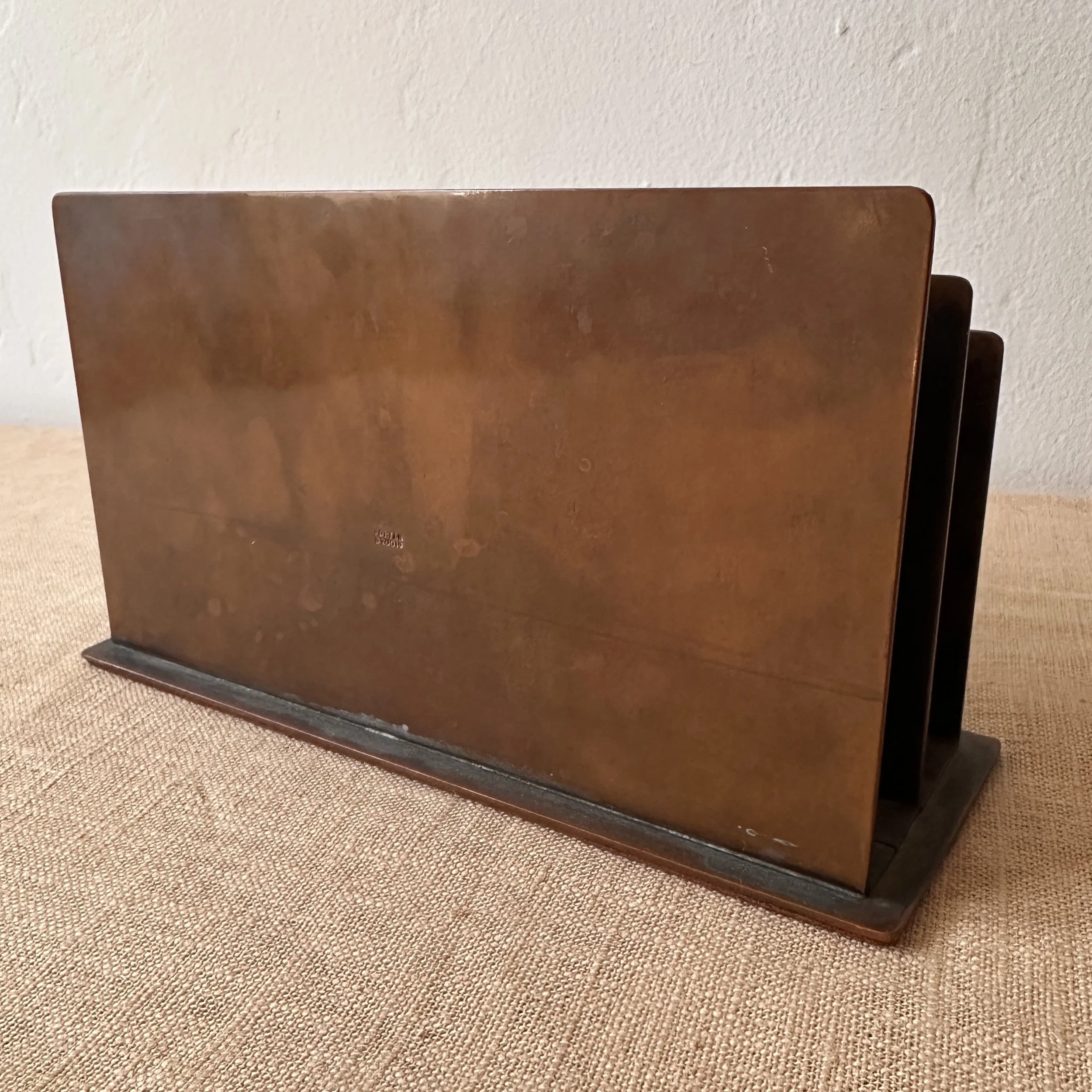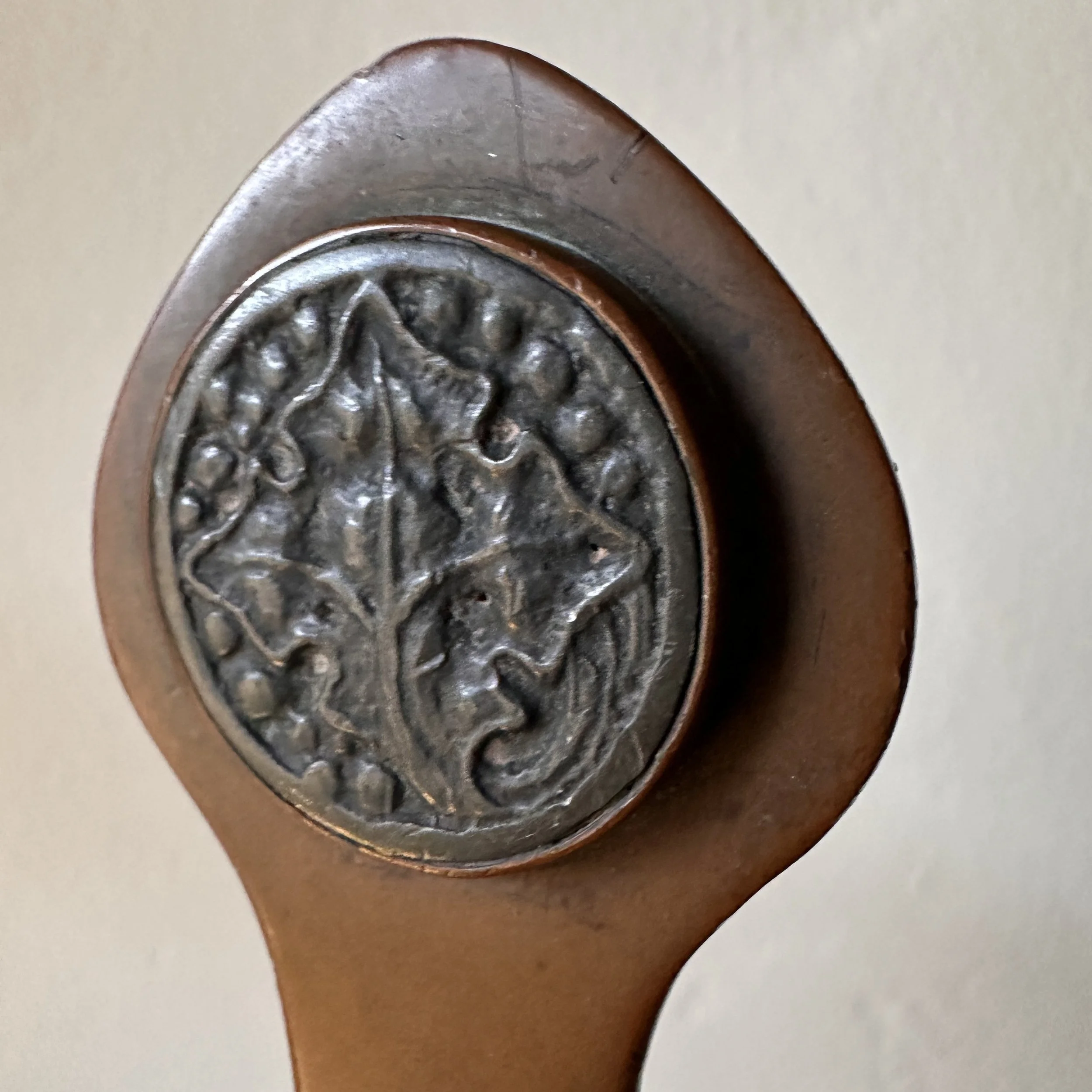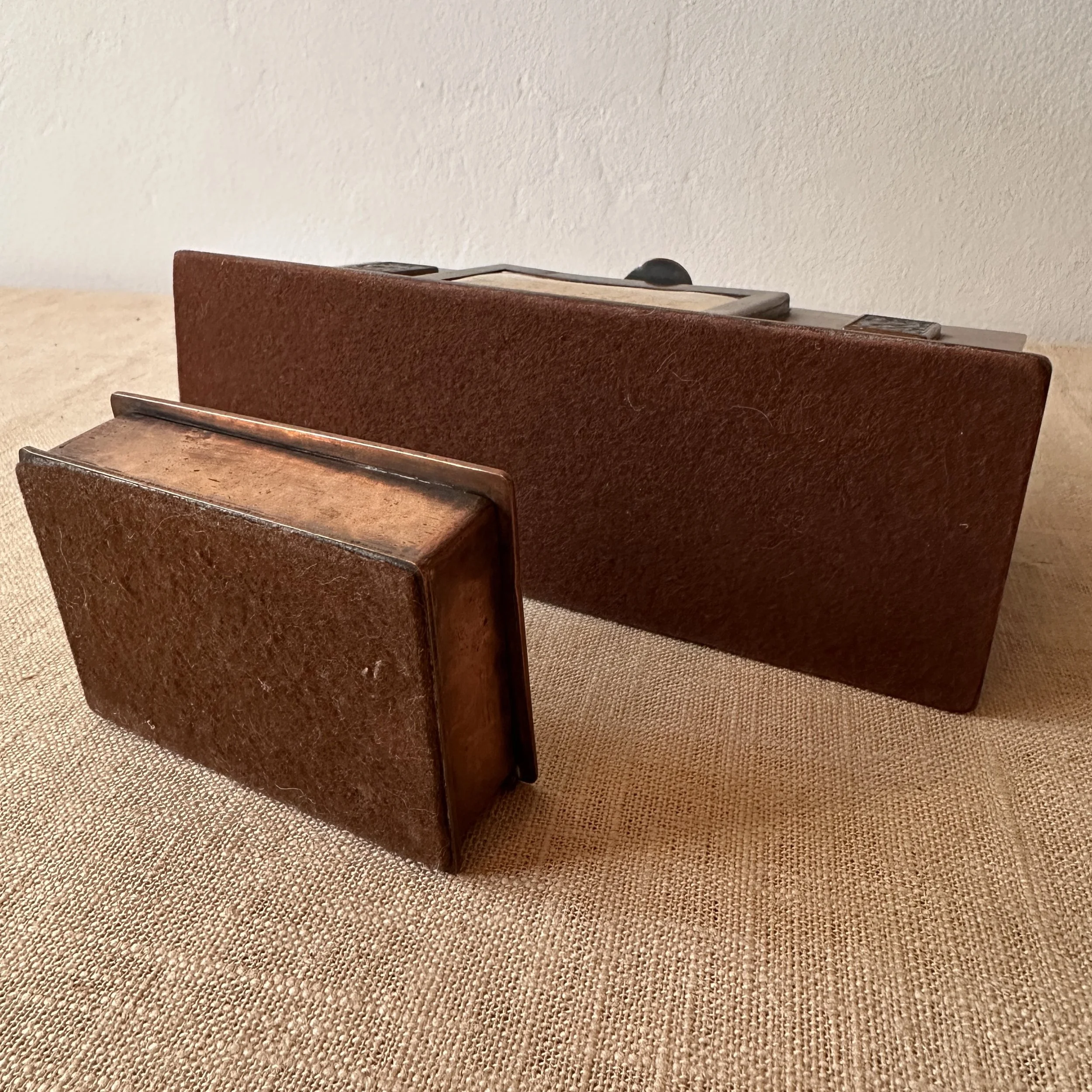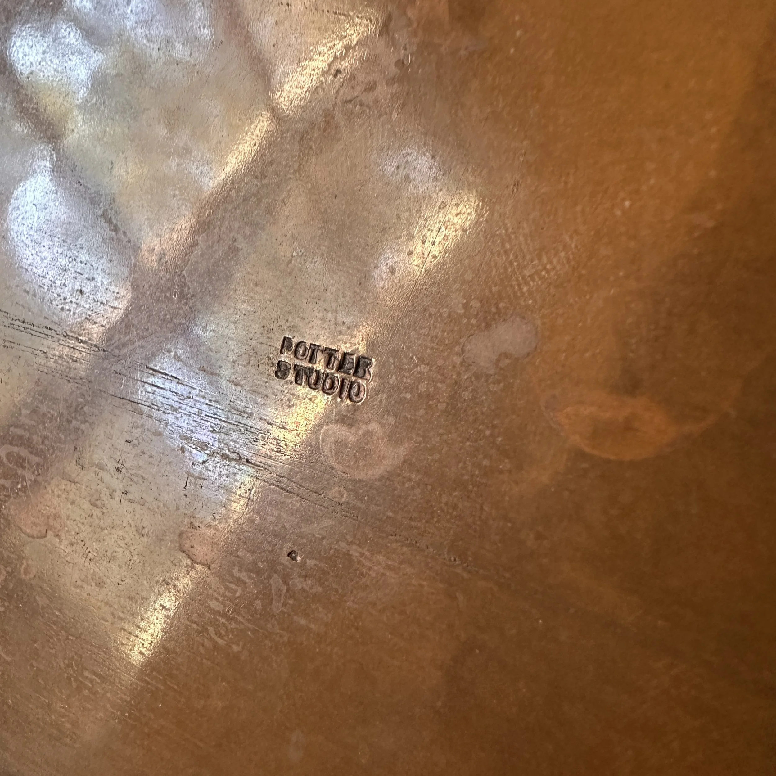 Potter Studio desk set, Cleveland OH circa 1915. A gorgeous hammered copper desk set consisting of a heavy letter holder with front calendar, stamp box, letter knife and paperweight. Each piece has a set piece of pewter with a floral pattern. The calendar has a copper finger handled fitter to pull the cards up and out, all cards present. Original condition, each with original brown felt on base, three pieces signed. Some light patina wear to stamp box. Exquisite workmanship and hammering. Holder measures 8” wide, 4.5” tall and 2.5” deep, knife is 8” long. $850/set