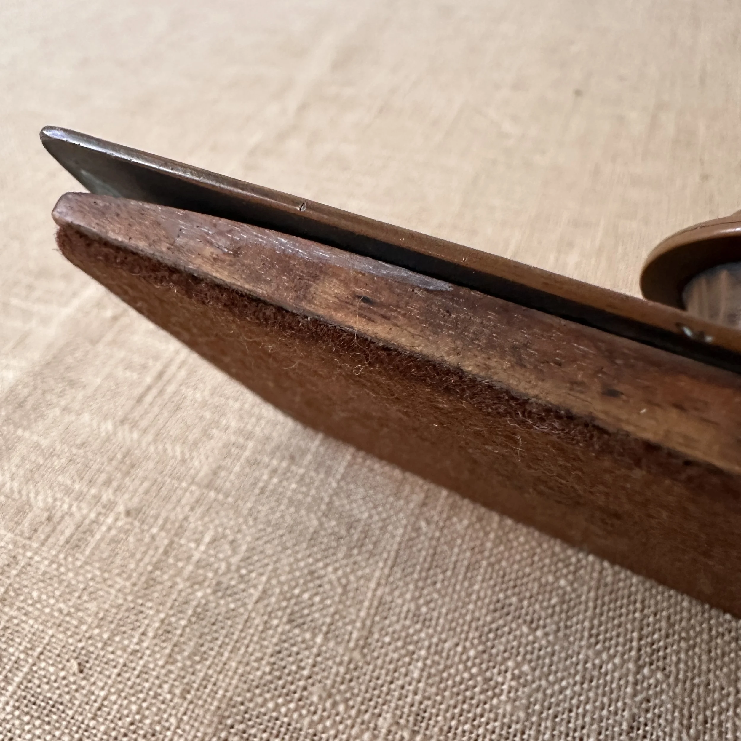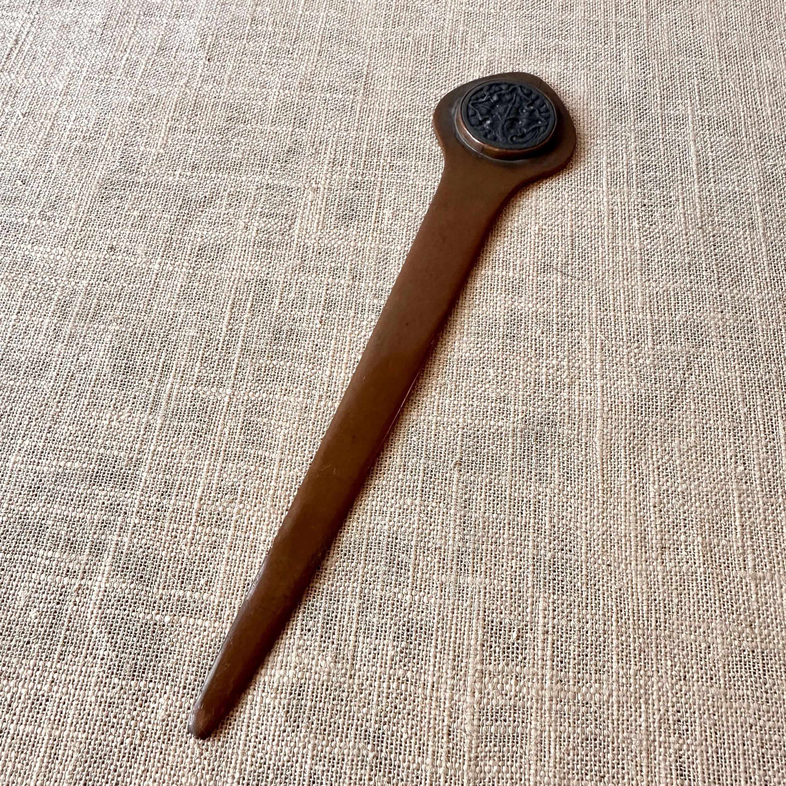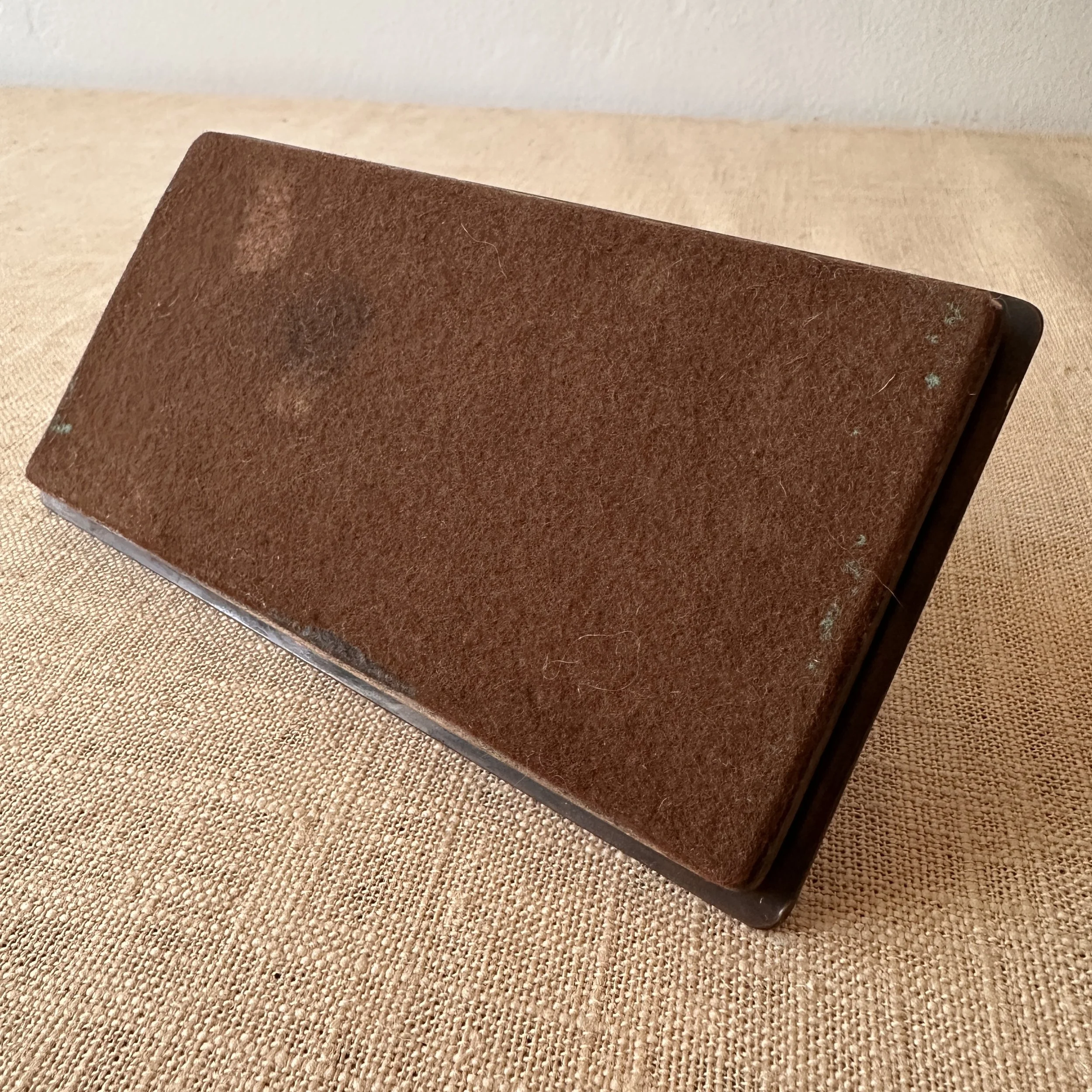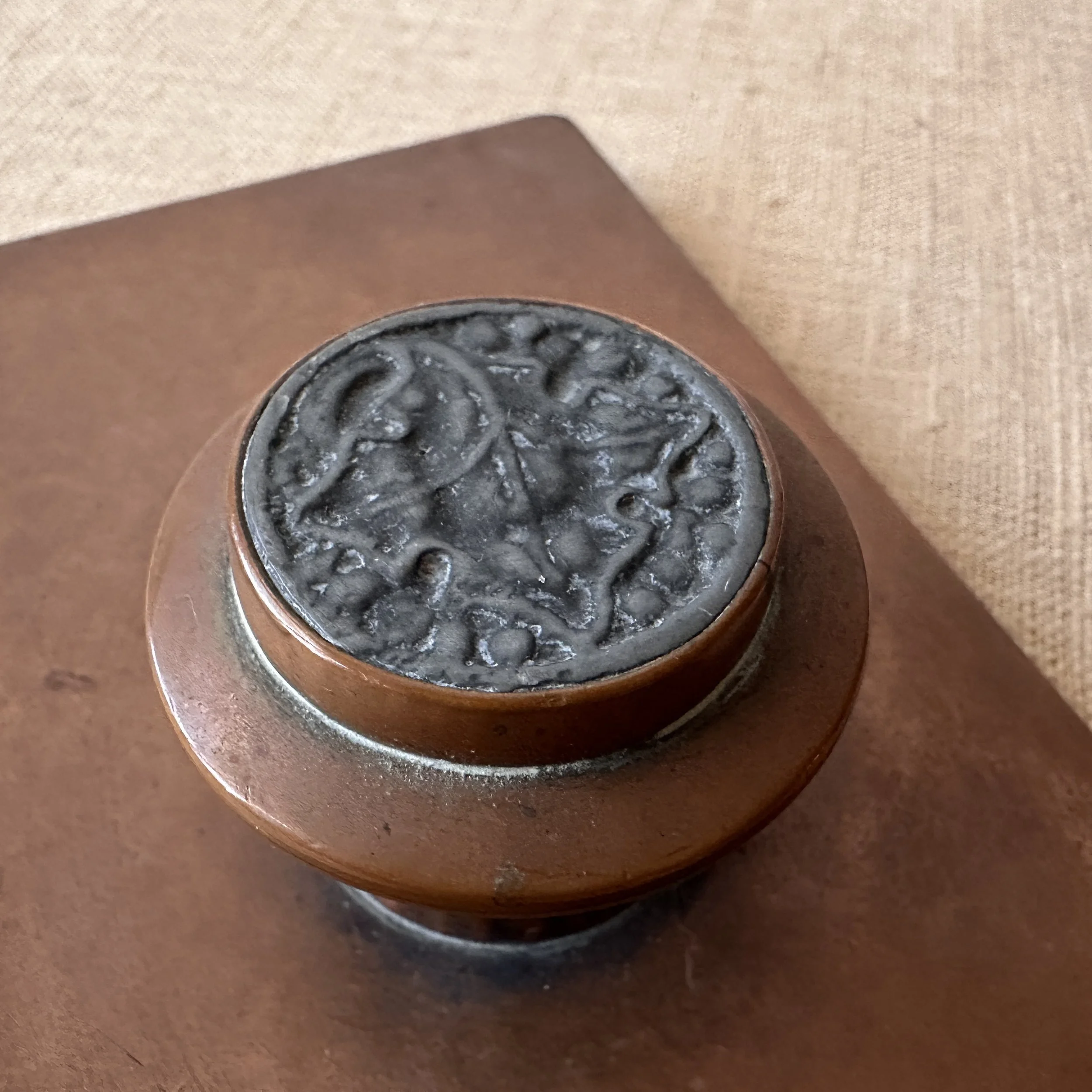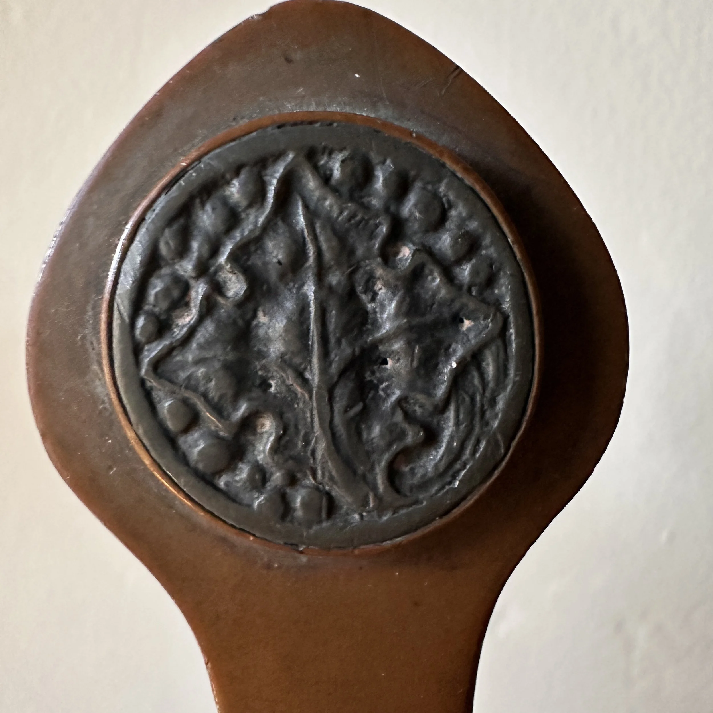 Potter Studio desk set, Cleveland OH circa 1915. A gorgeous hammered copper desk set consisting of a heavy letter holder with front calendar, stamp box, letter knife and paperweight. Each piece has a set piece of pewter with a floral pattern. The calendar has a copper finger handled fitter to pull the cards up and out, all cards present. Original condition, each with original brown felt on base, three pieces signed. Some light patina wear to stamp box. Exquisite workmanship and hammering. Holder measures 8” wide, 4.5” tall and 2.5” deep, knife is 8” long. $850/set