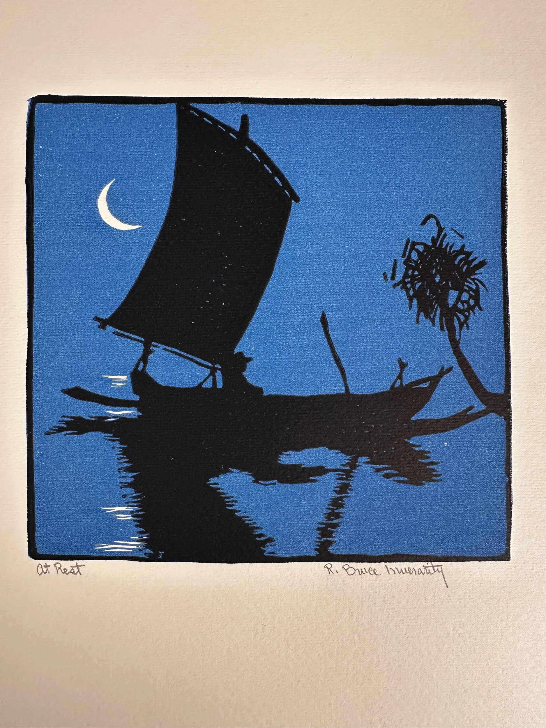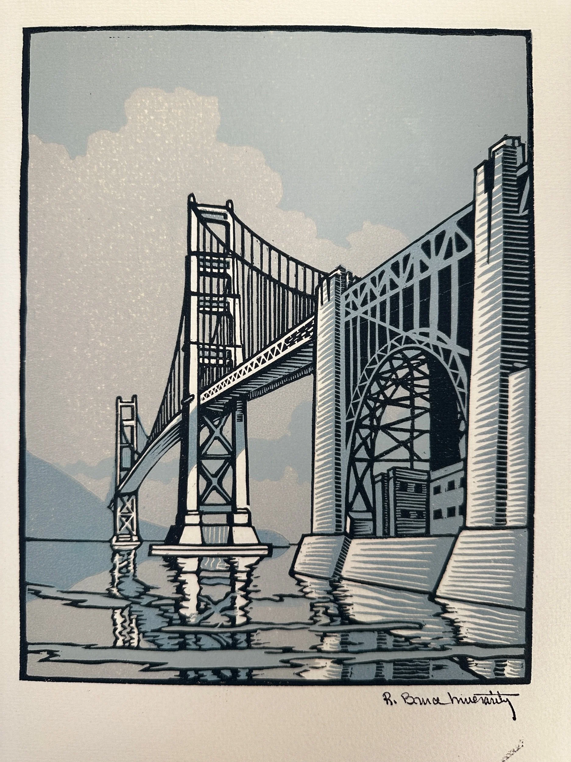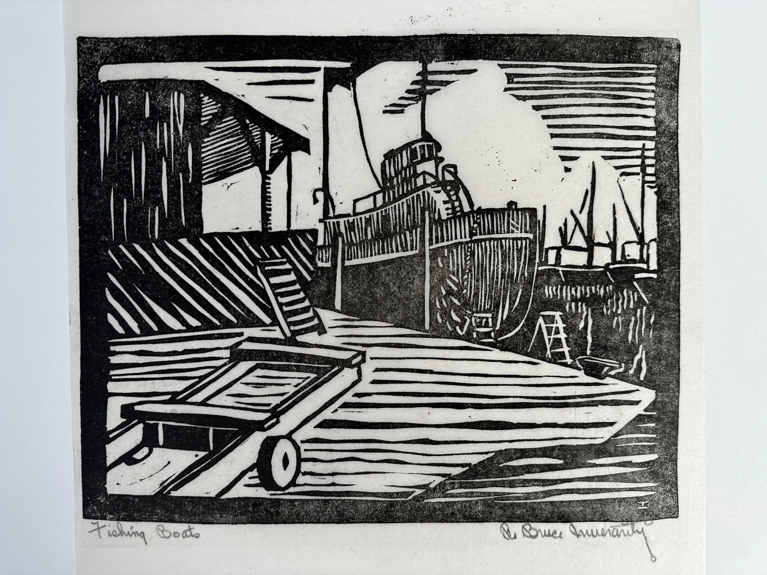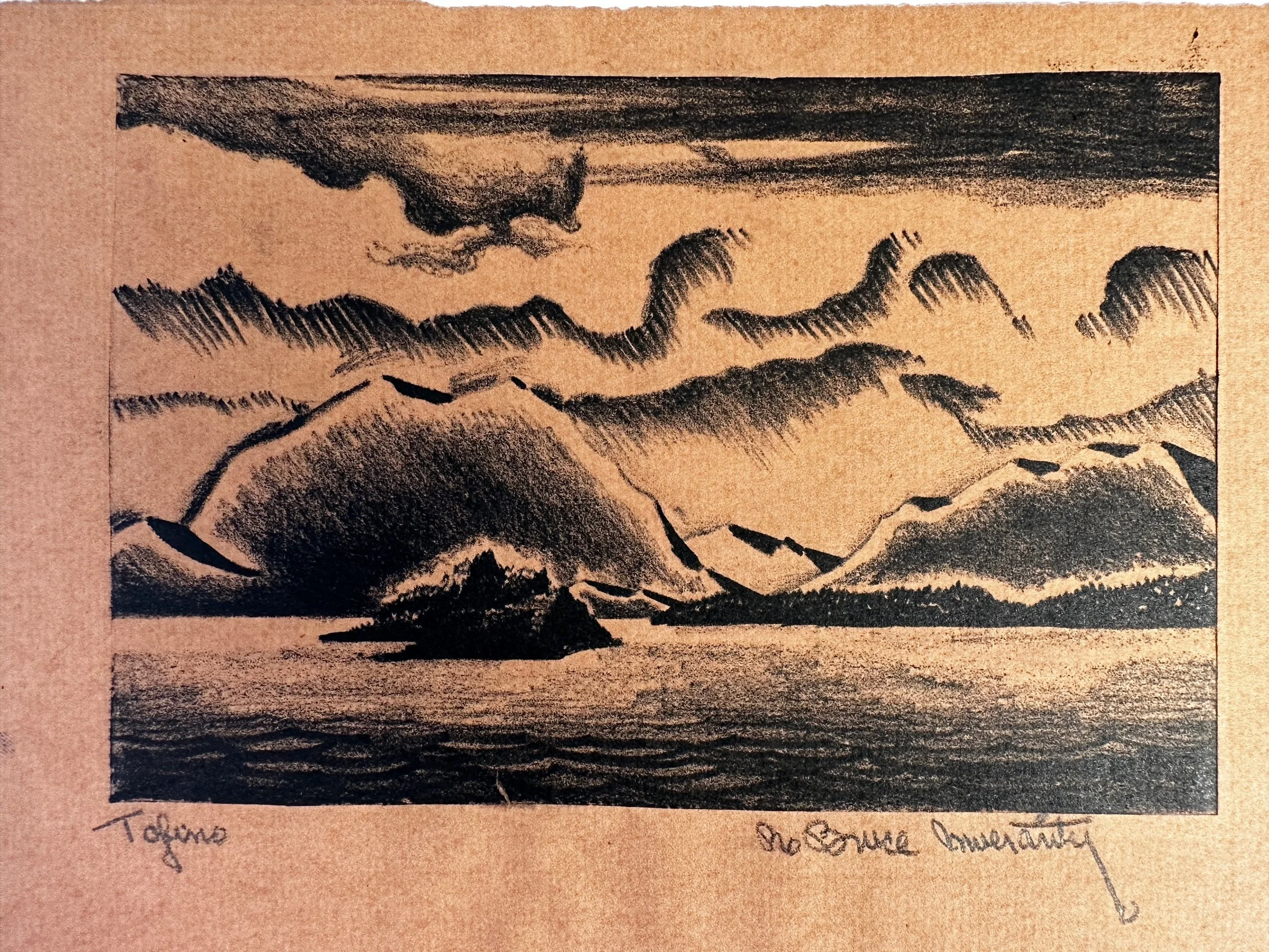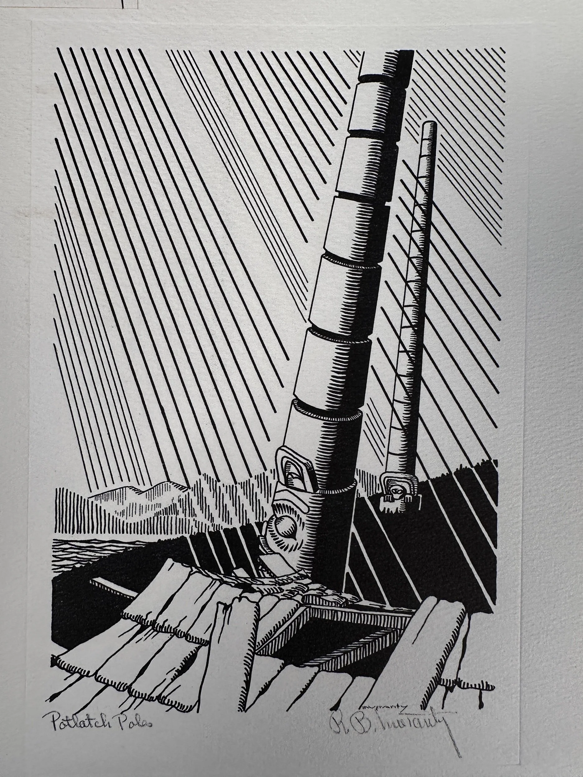 Many years ago I made a series of color block prints of San Francisco which sold very well. Then I did a series of etchings of Seattle which were sold by Lowman and Hanford then another series of color block prints of the northwest...after that I did a series of drawings with the thought in mind that they could be used to illustrate a book that I was writing. A friend of mine, at that time owner of Craftsman Press, and I thought these might also sell so we ran them off on a litho machine and I designed a little hand print as a symbol of the series. Well a few sold not well, as people were not interested in Indian things then. What you purchased at auction belongs to the last series. There was a color print of Lonely Sentinals and a two color print titled Lone Totem ...I have one of each...You are the only person who has ever mentioned them to me since about 1934 when they were made...there cannot have been too many copies in the beginning and certainly less now. Hope the above is of some help altho you and I may be the only people who have prints! We expect to be in Seattle agin this summer as I am working on a book and need to do some quick research..so we will have a chat then...