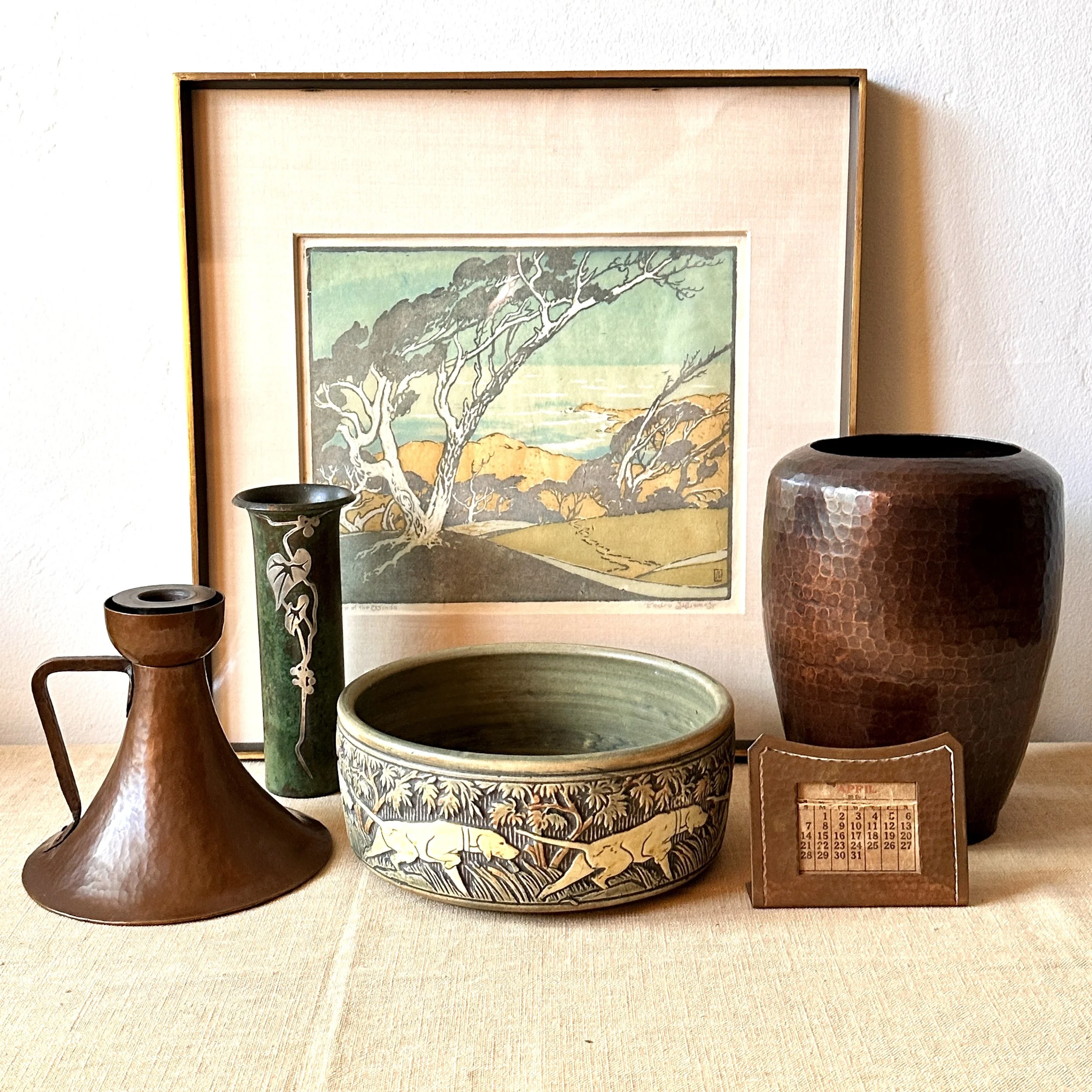 Roycroft Copper Shop calendar frame, East Aurora NY circa 1918. A hammered copper calendar frame with all the original inserts, nice caramel patina which appears original. Measures 4.25” by 3.5”. $175