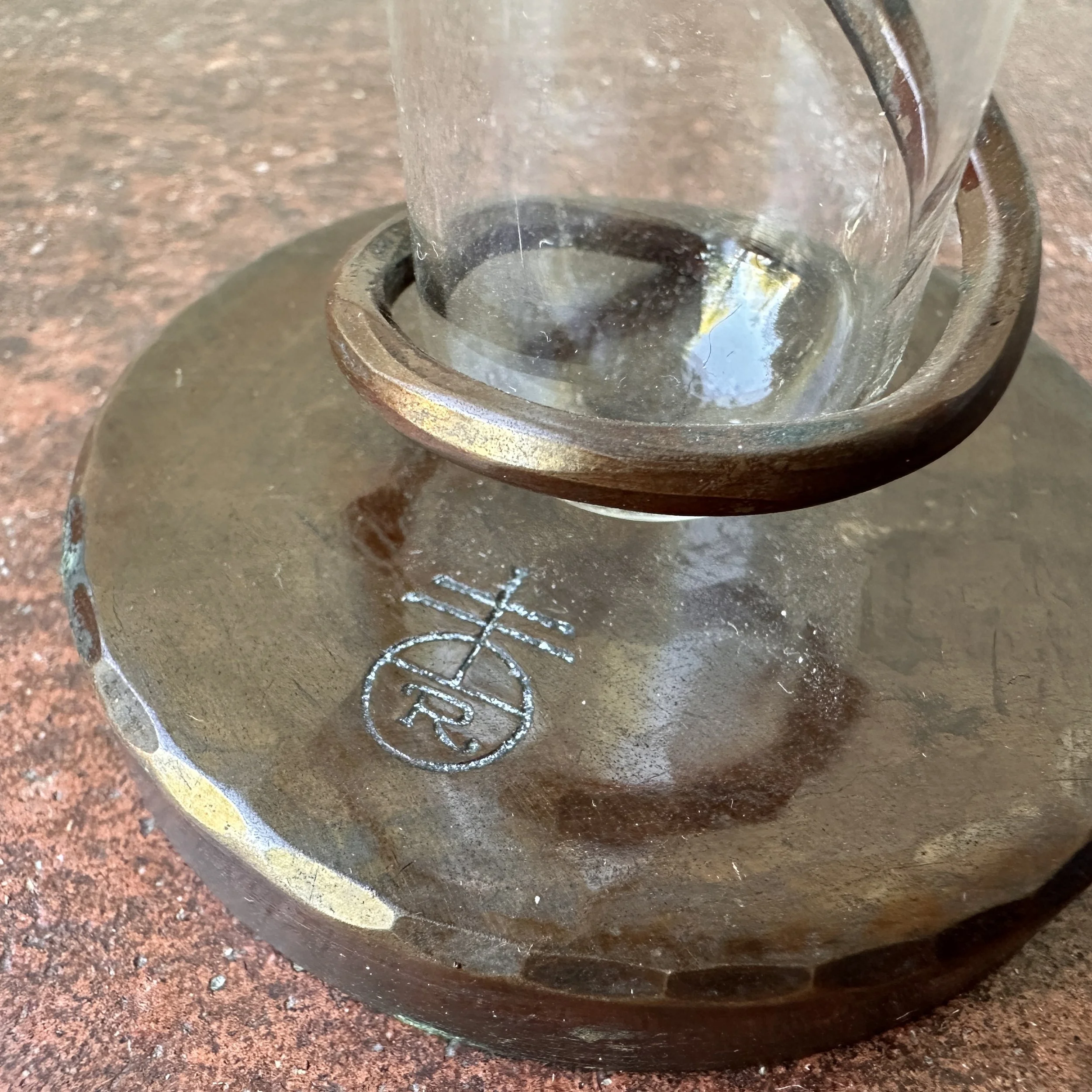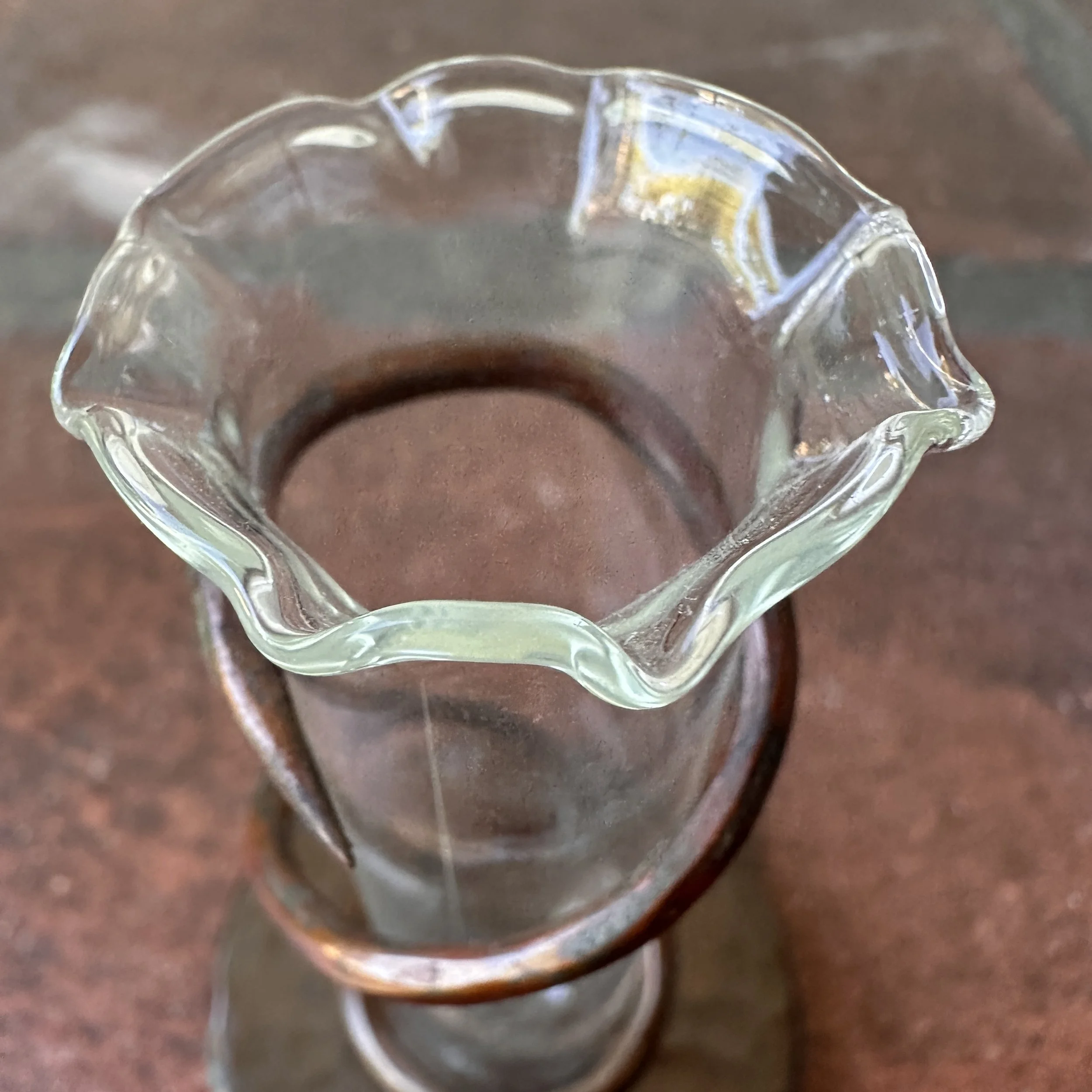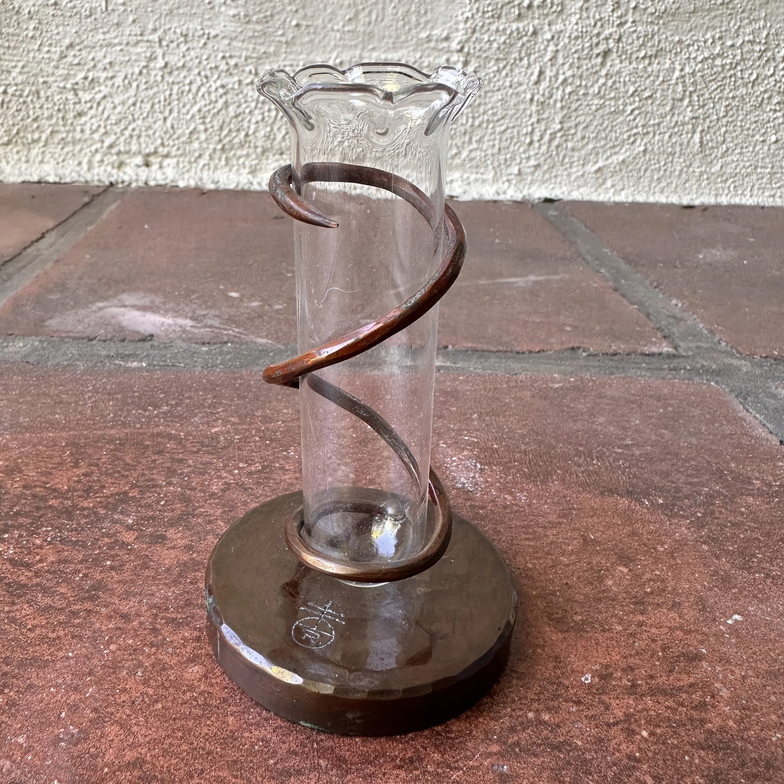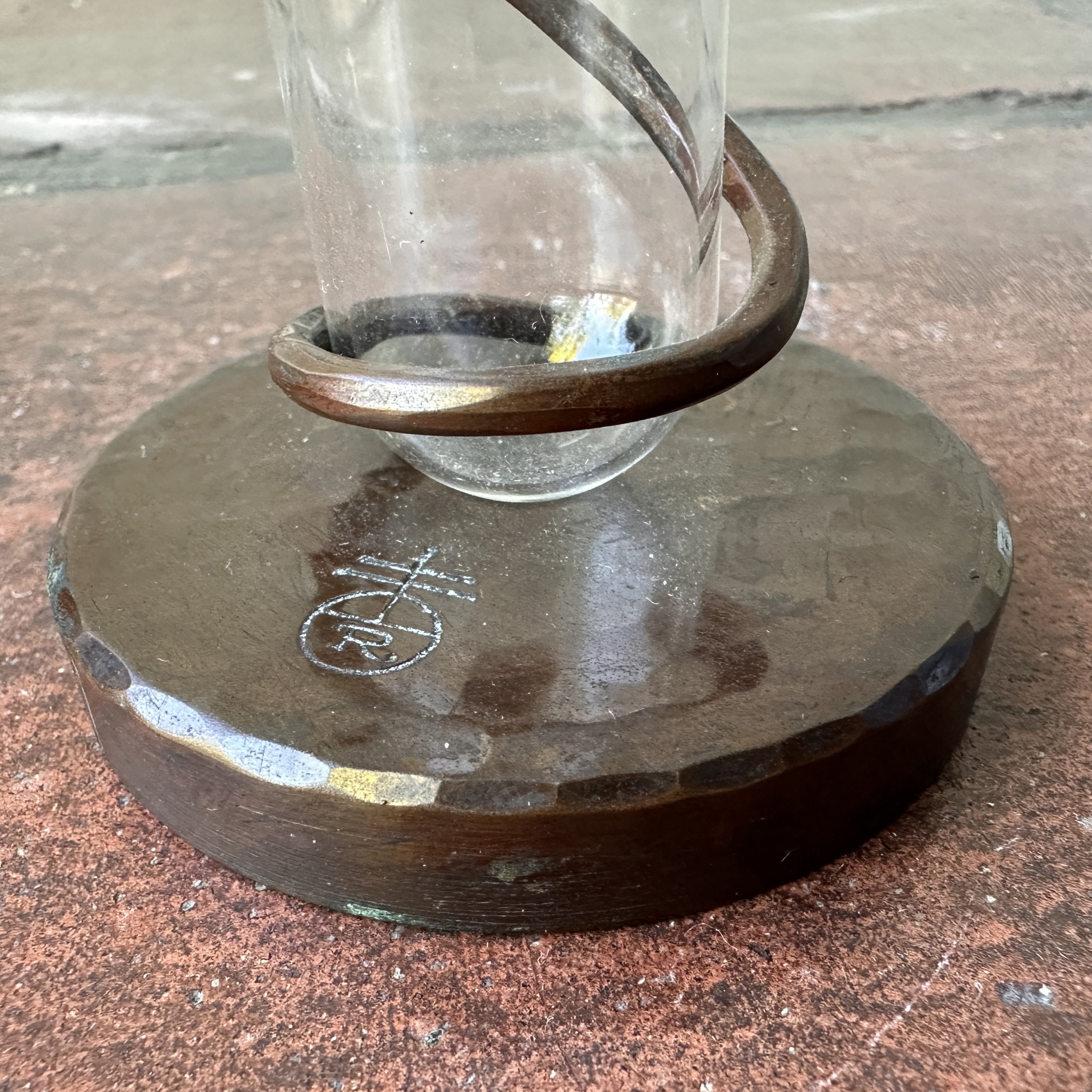 Roycroft Copper Shop bud vase, East Aurora NY circa 1912. The earliest cataloged bud vase from Roycroft, the hammered copper stand has a twisting copper thread supporting the original half size glass vase with ruffled rim. Original patina, signed with early mark. Small little undulation in the making, on bottom edge but not noticeable when seated. Measures 4.5” tall. SOLD