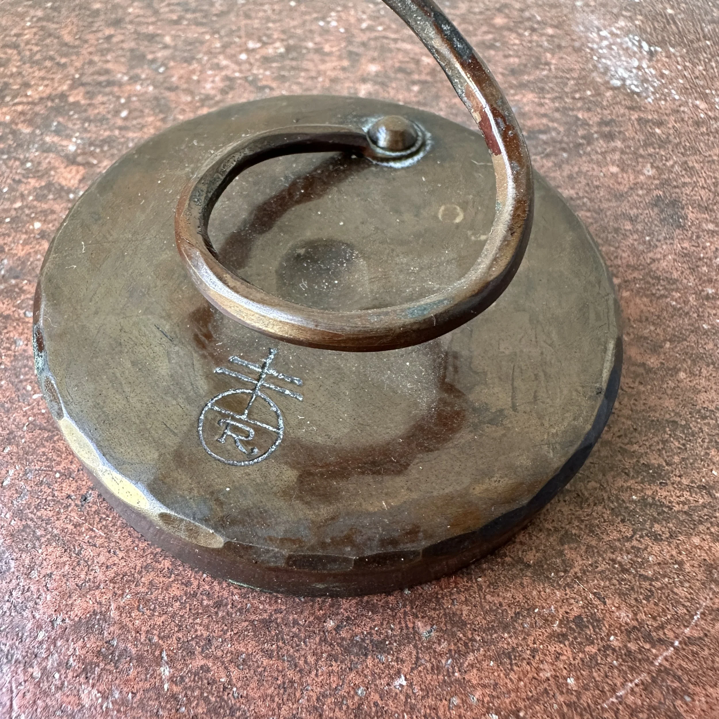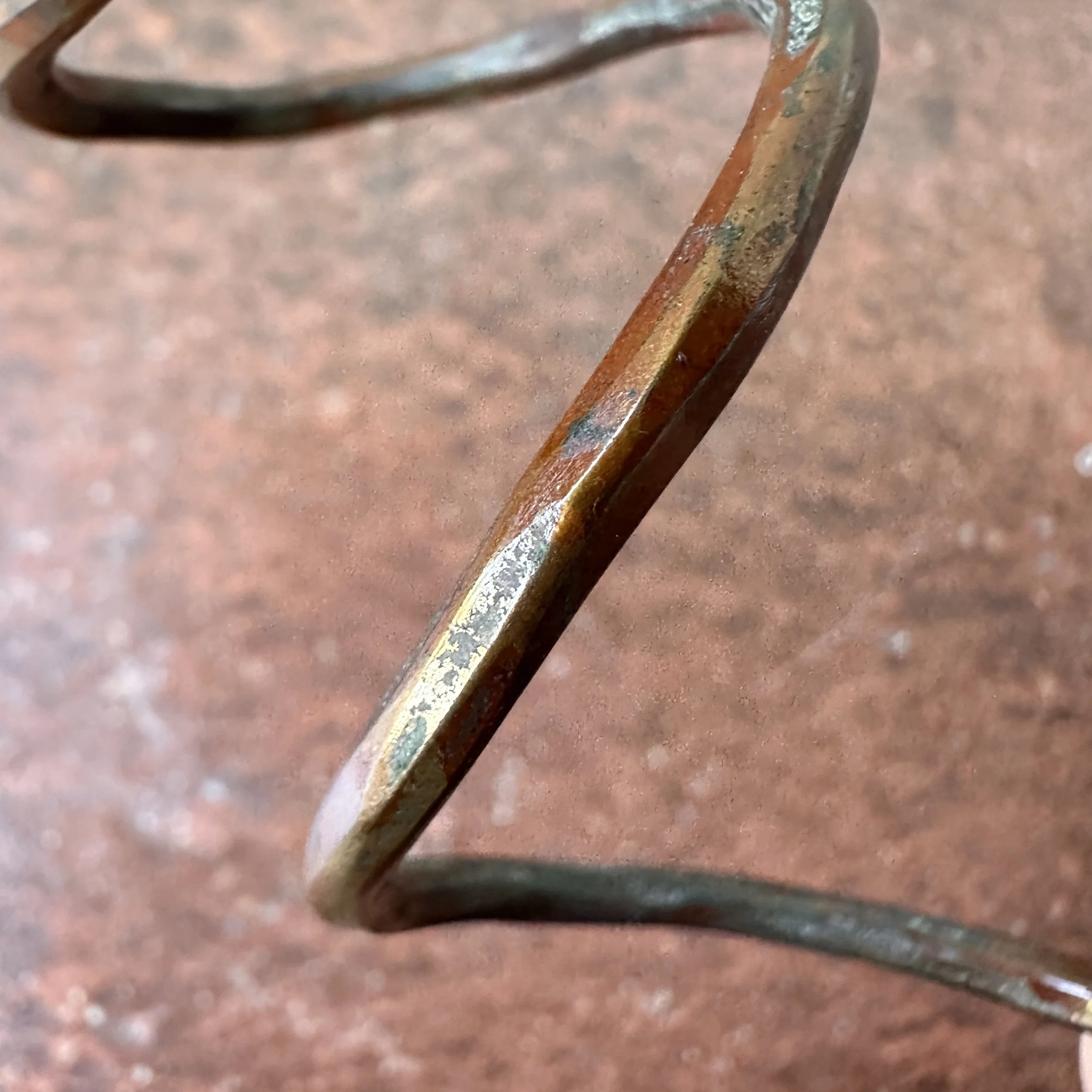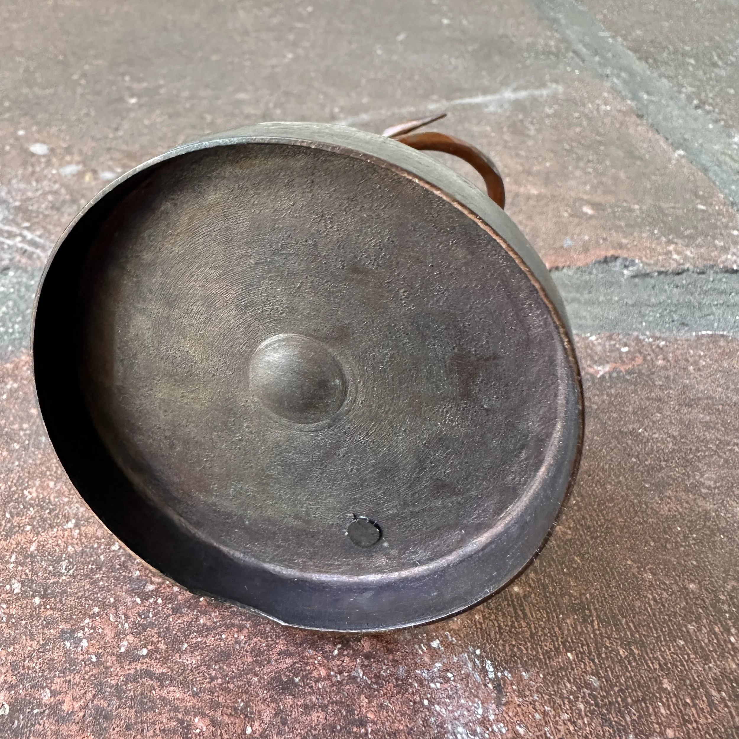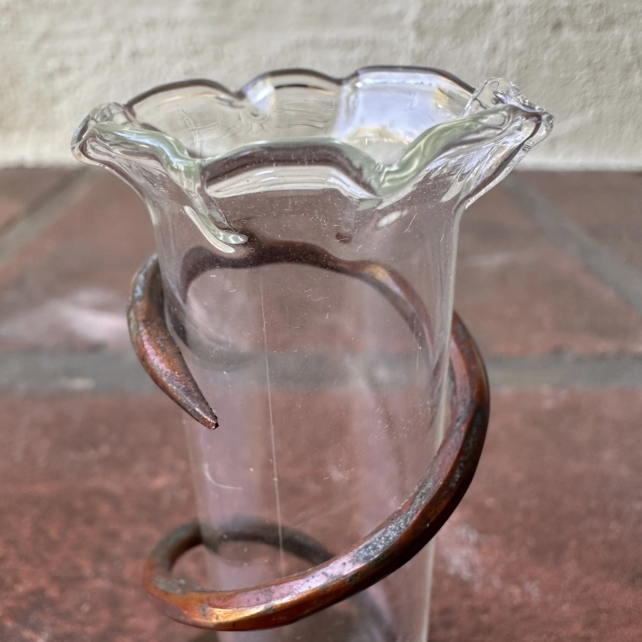Roycroft Copper Shop bud vase, East Aurora NY circa 1912. The earliest cataloged bud vase from Roycroft, the hammered copper stand has a twisting copper thread supporting the original half size glass vase with ruffled rim. Original patina, signed with early mark. Small little undulation in the making, on bottom edge but not noticeable when seated. Measures 4.5” tall. SOLD
