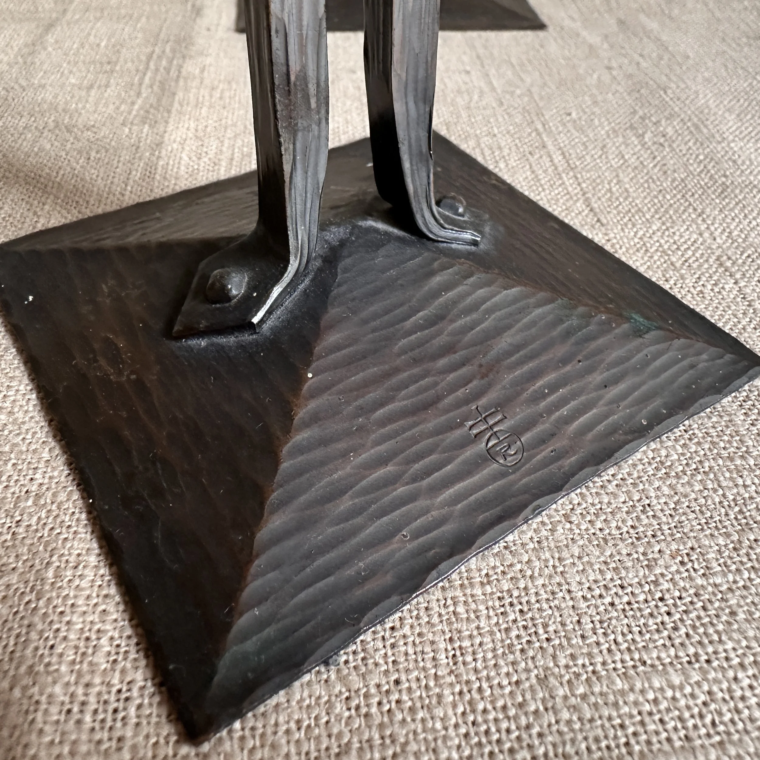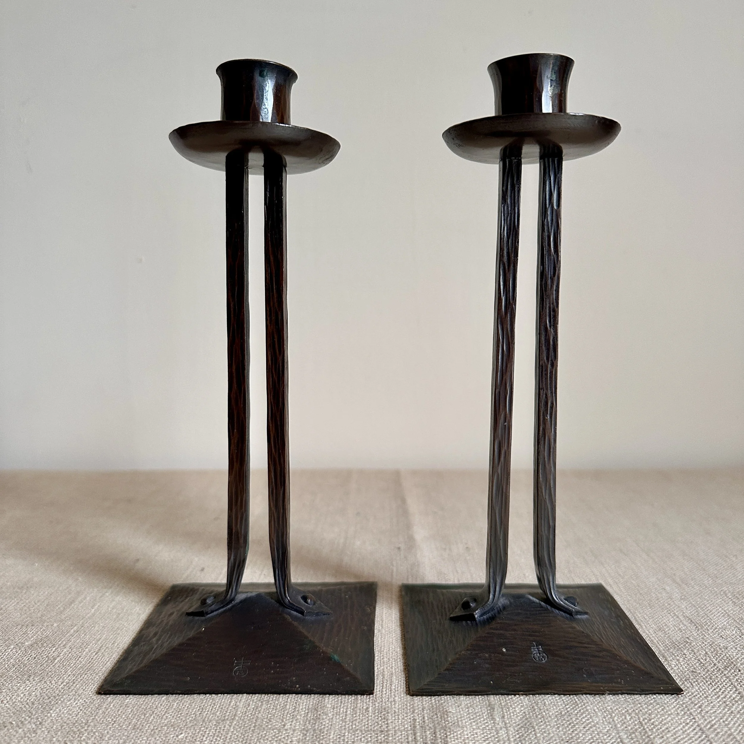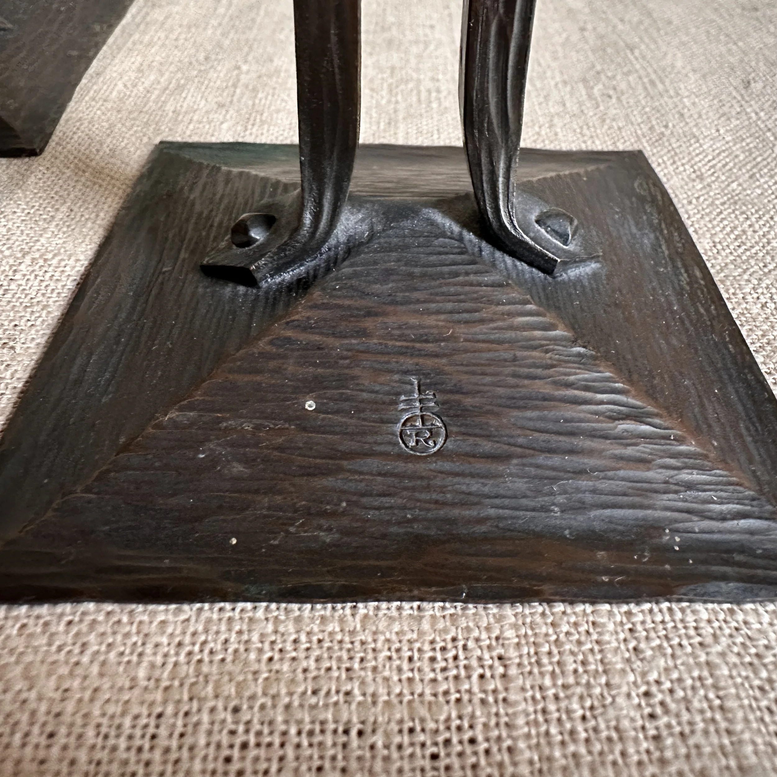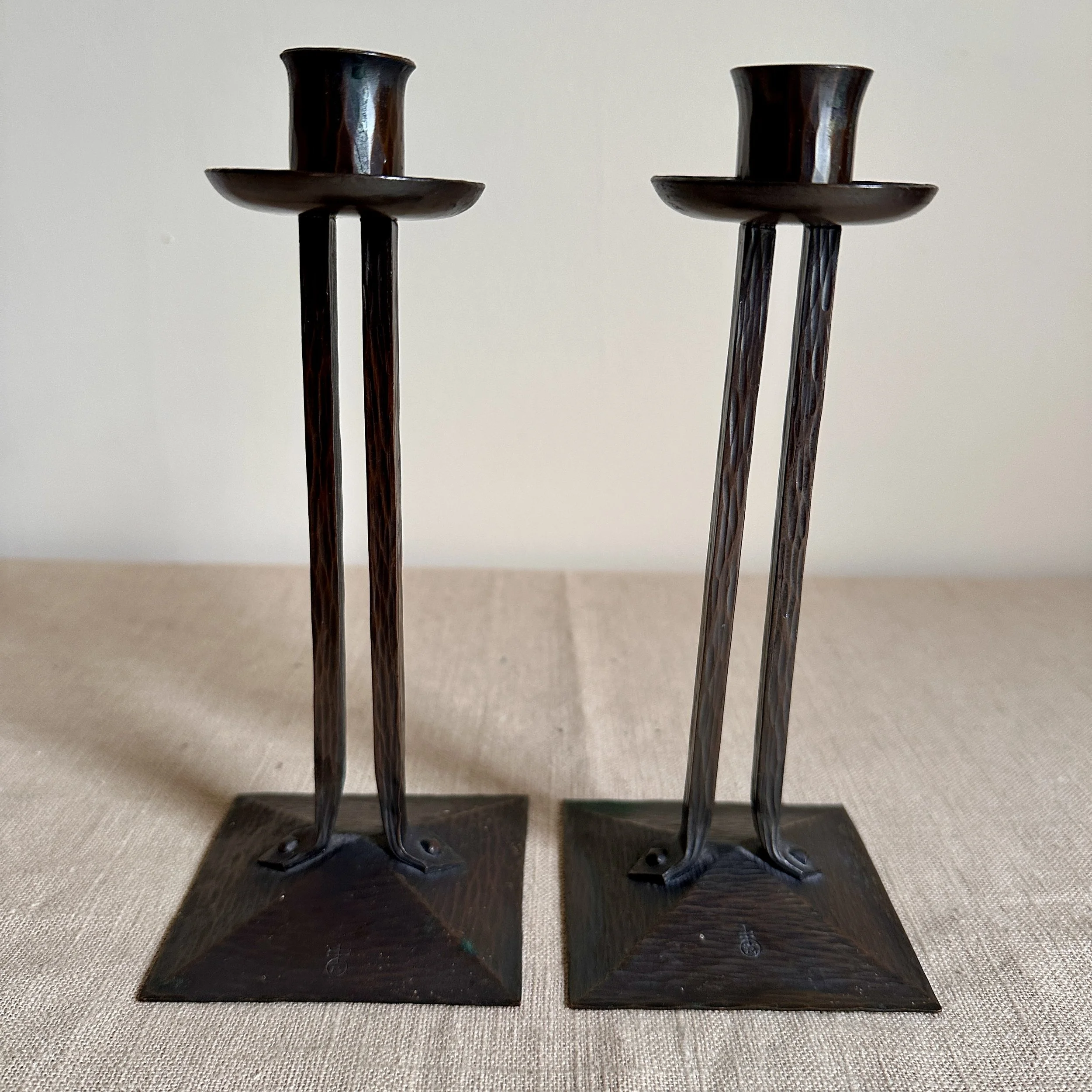 Roycroft “princess” candlesticks, East Aurora NY circa 1915. A mint pair of candlesticks with a fantastic original dark patina. Both signed on top of bases, excellent condition. Measure 7.5” tall and 3.25” square at base. $750