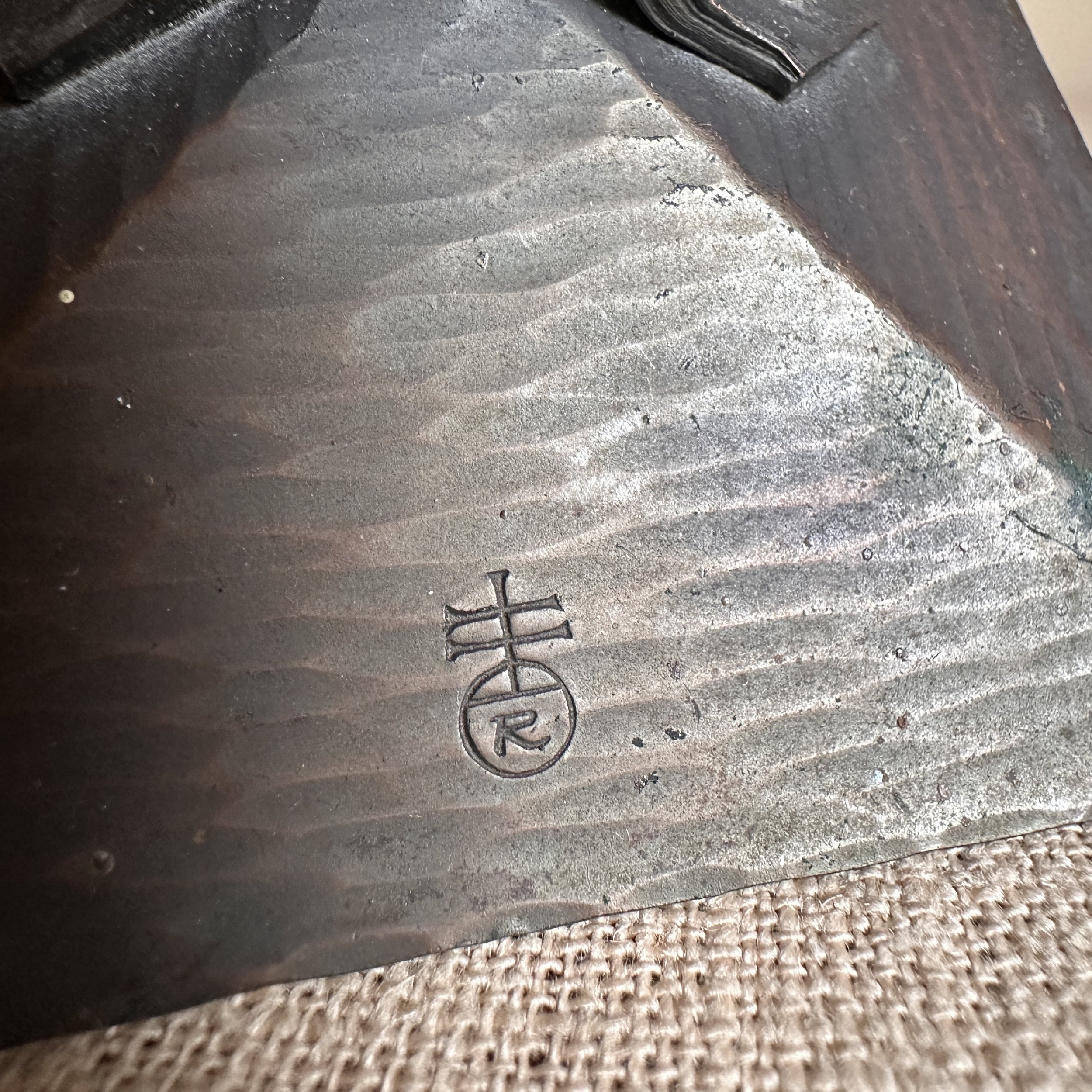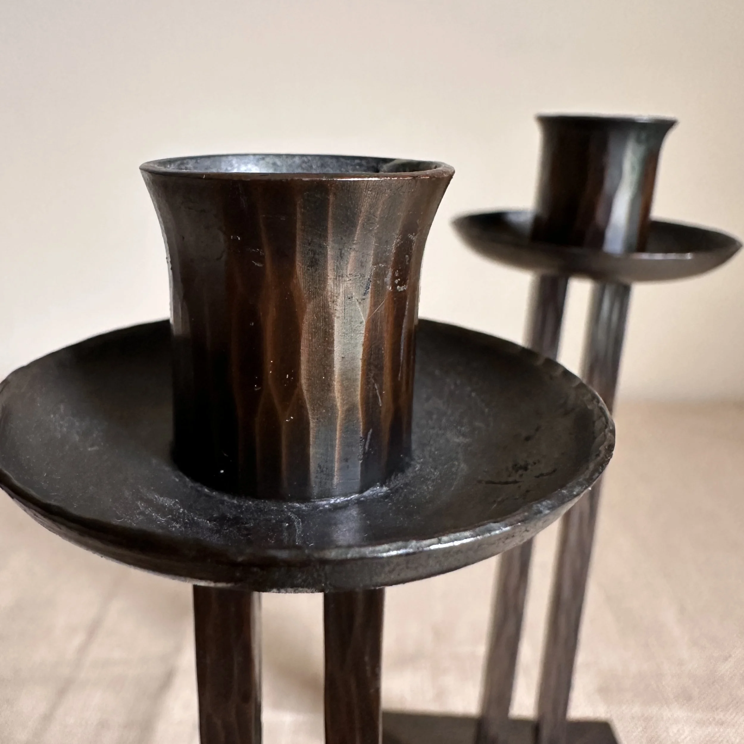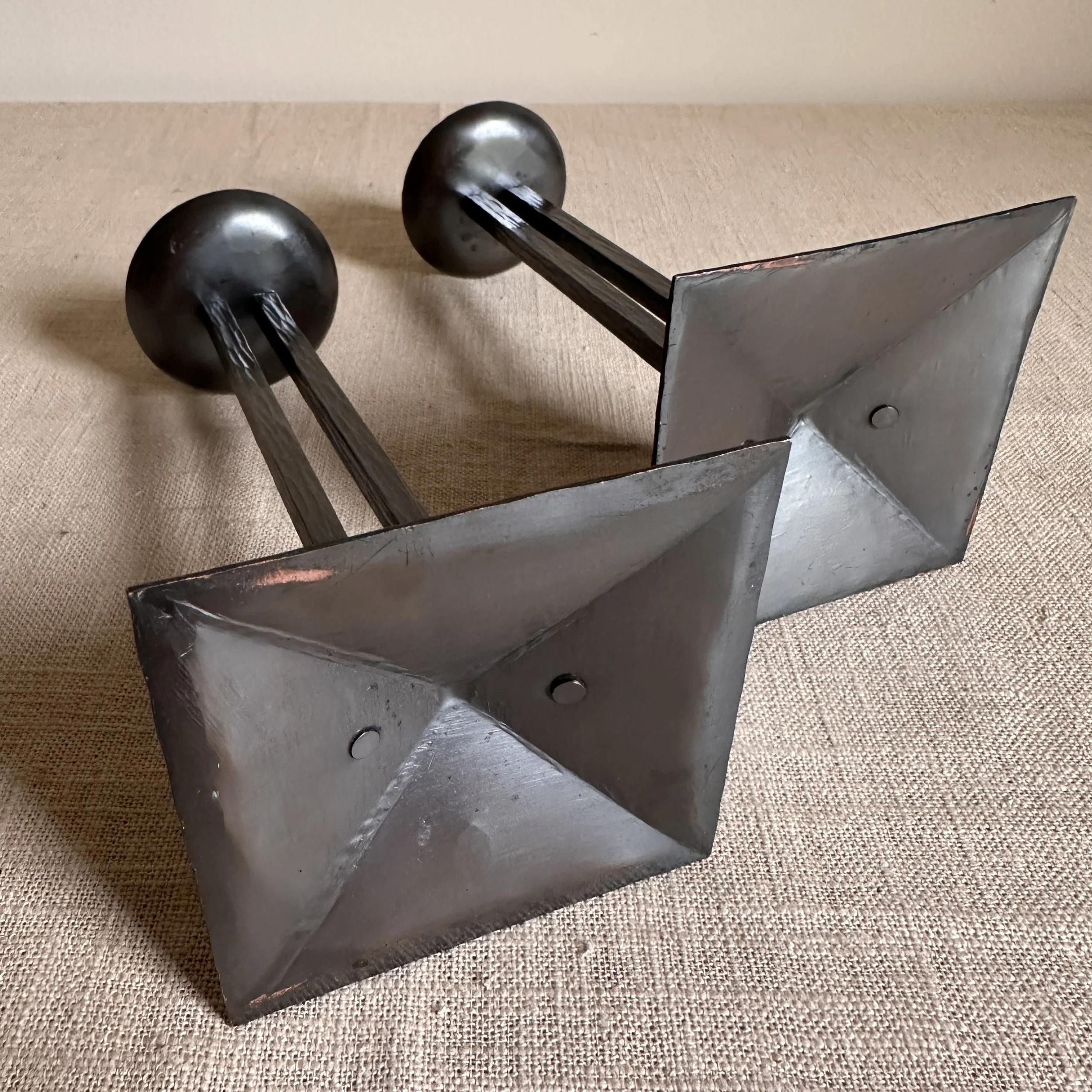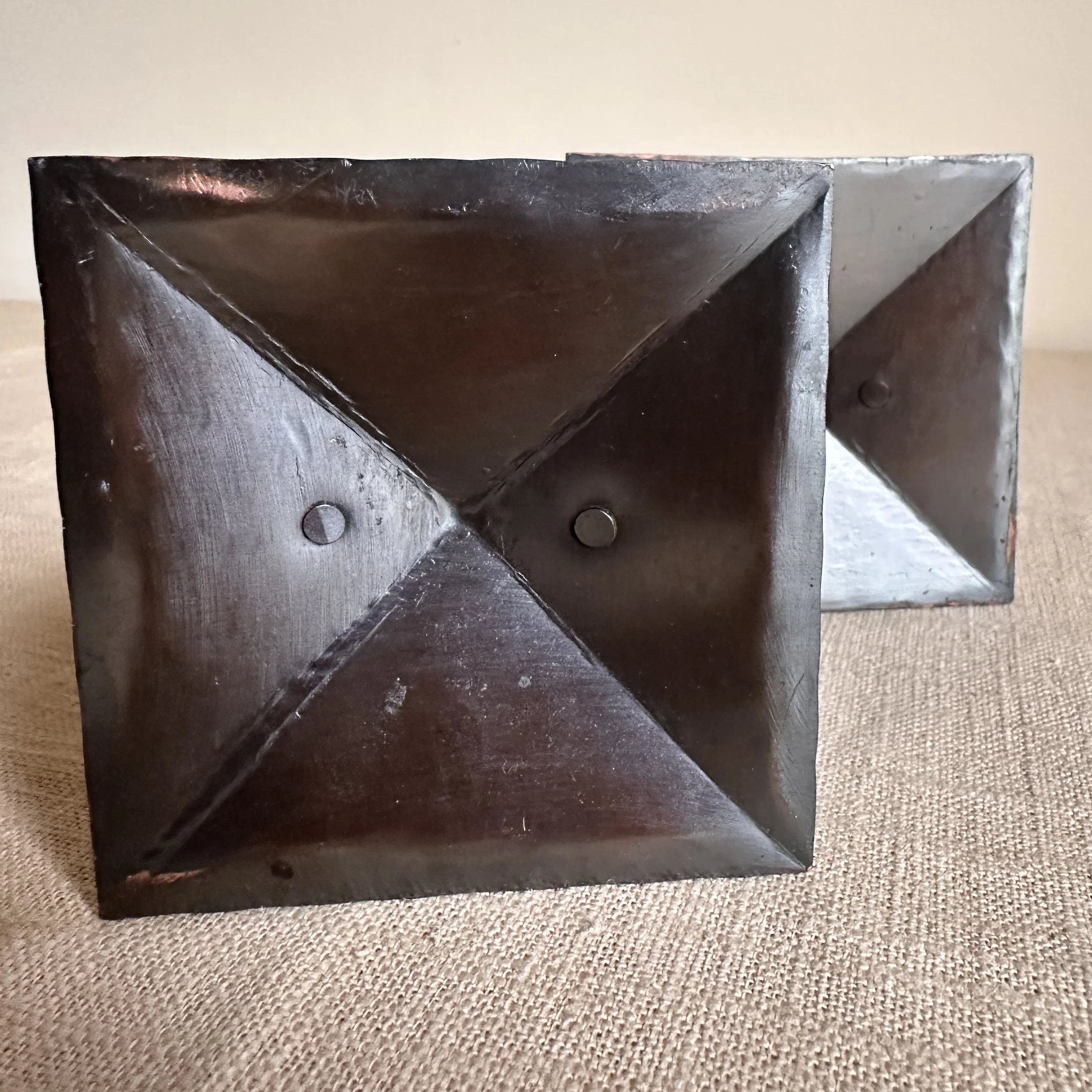 Roycroft “princess” candlesticks, East Aurora NY circa 1915. A mint pair of candlesticks with a fantastic original dark patina. Both signed on top of bases, excellent condition. Measure 7.5” tall and 3.25” square at base. $750