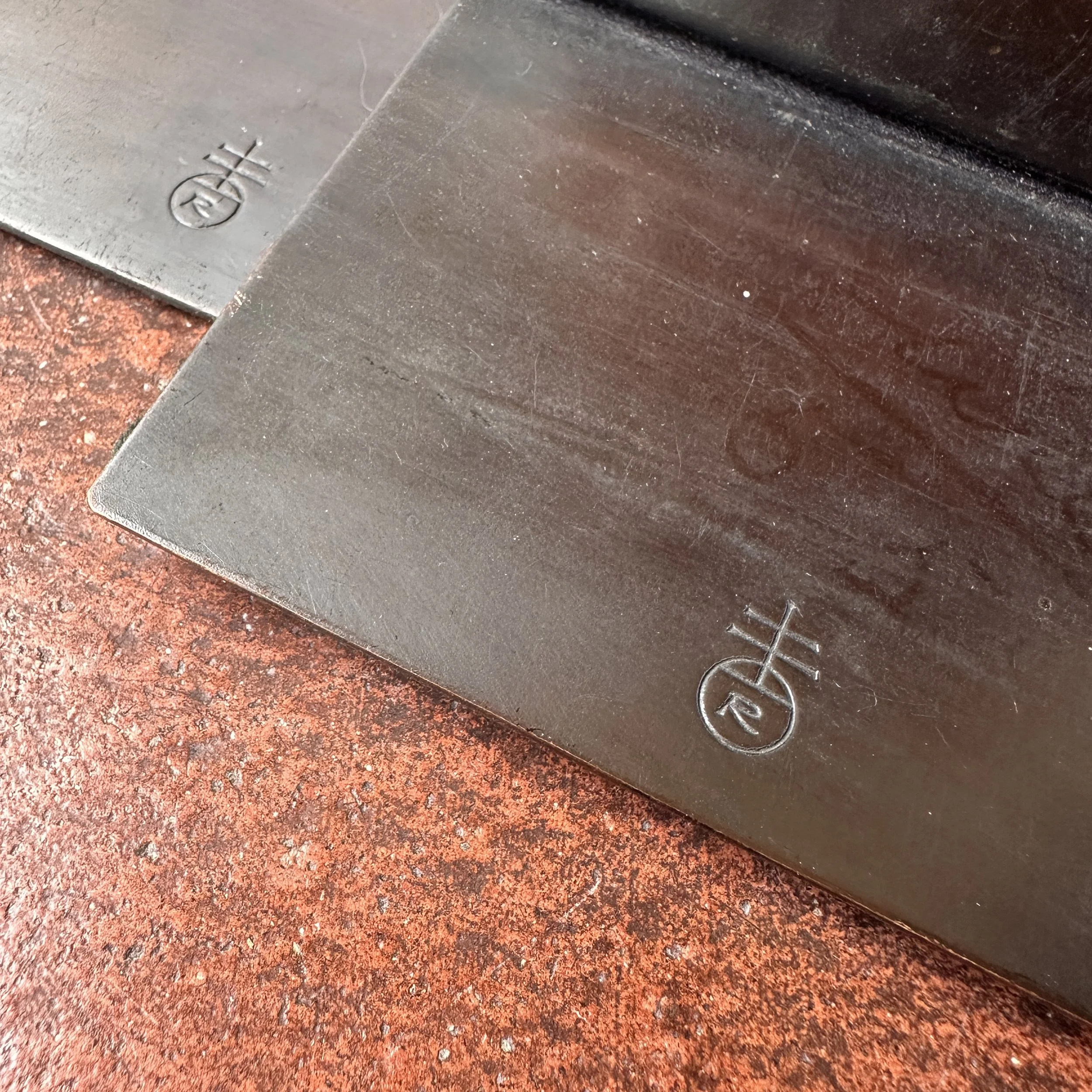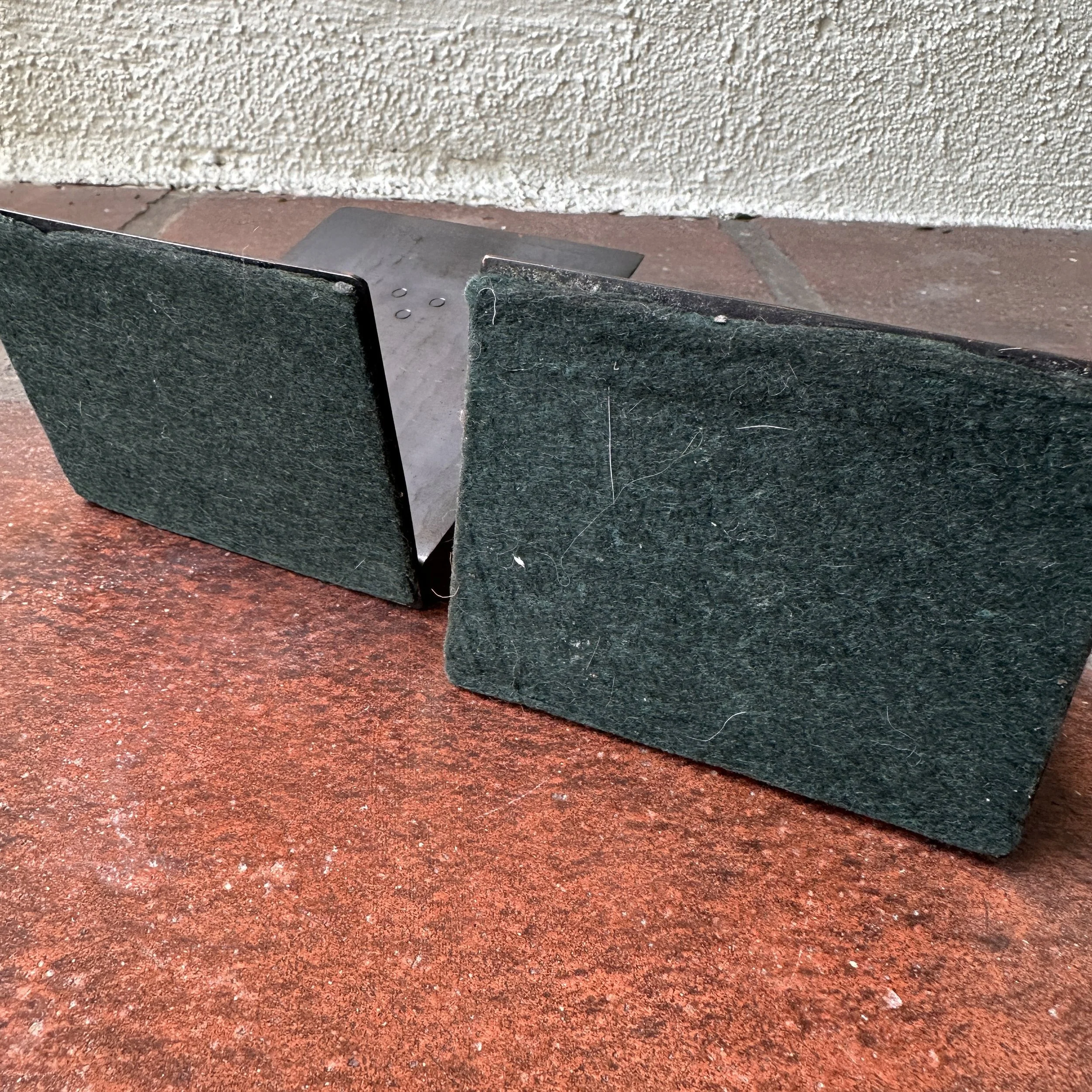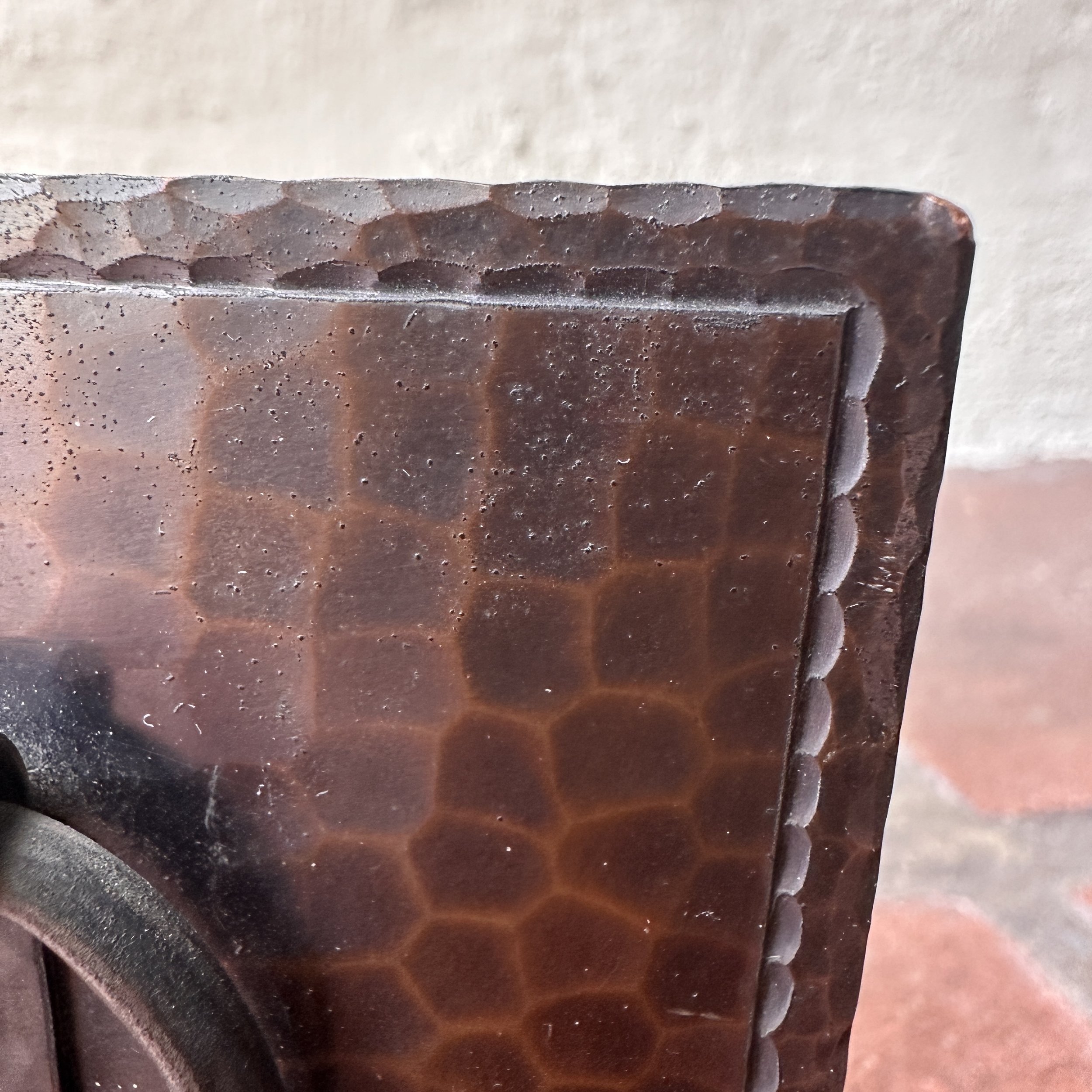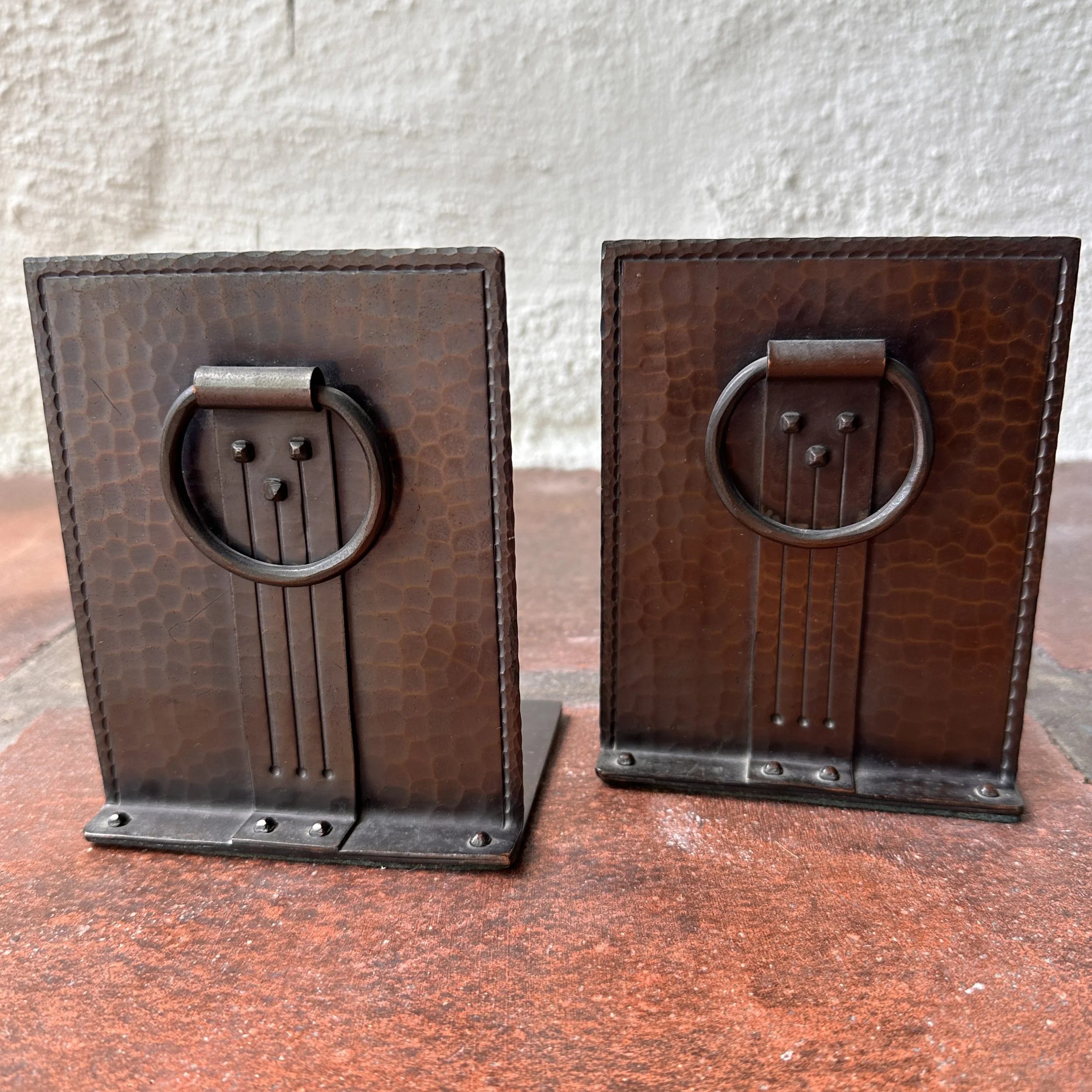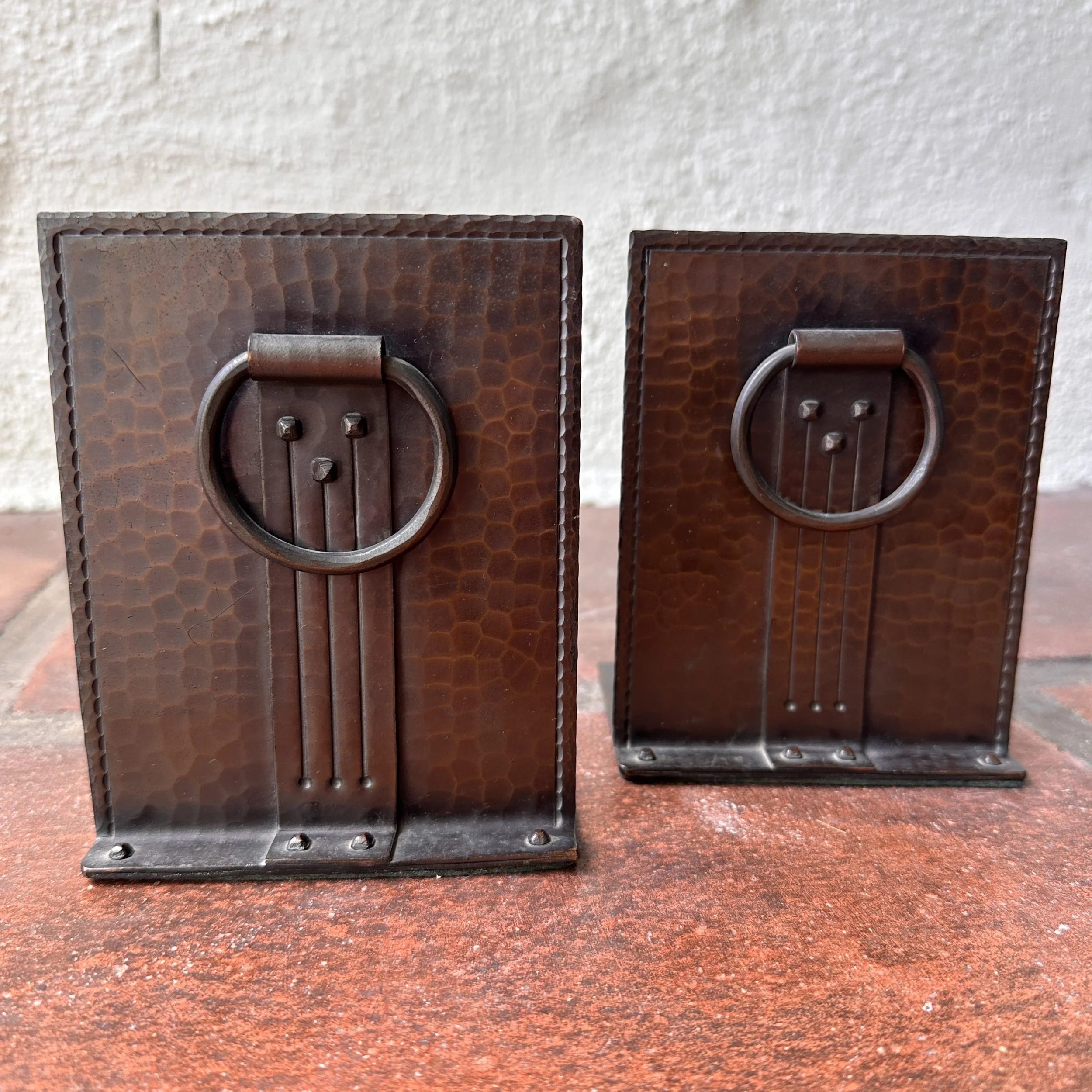 Roycroft Copper Shop bookends, East Aurora NY circa 1918. A nice pair of ring bookends with a very fine Aurora Brown patina. Signed with middle mark, excellent condition. Measures 5.5” tall, 4” wide and 3.25” deep. $275