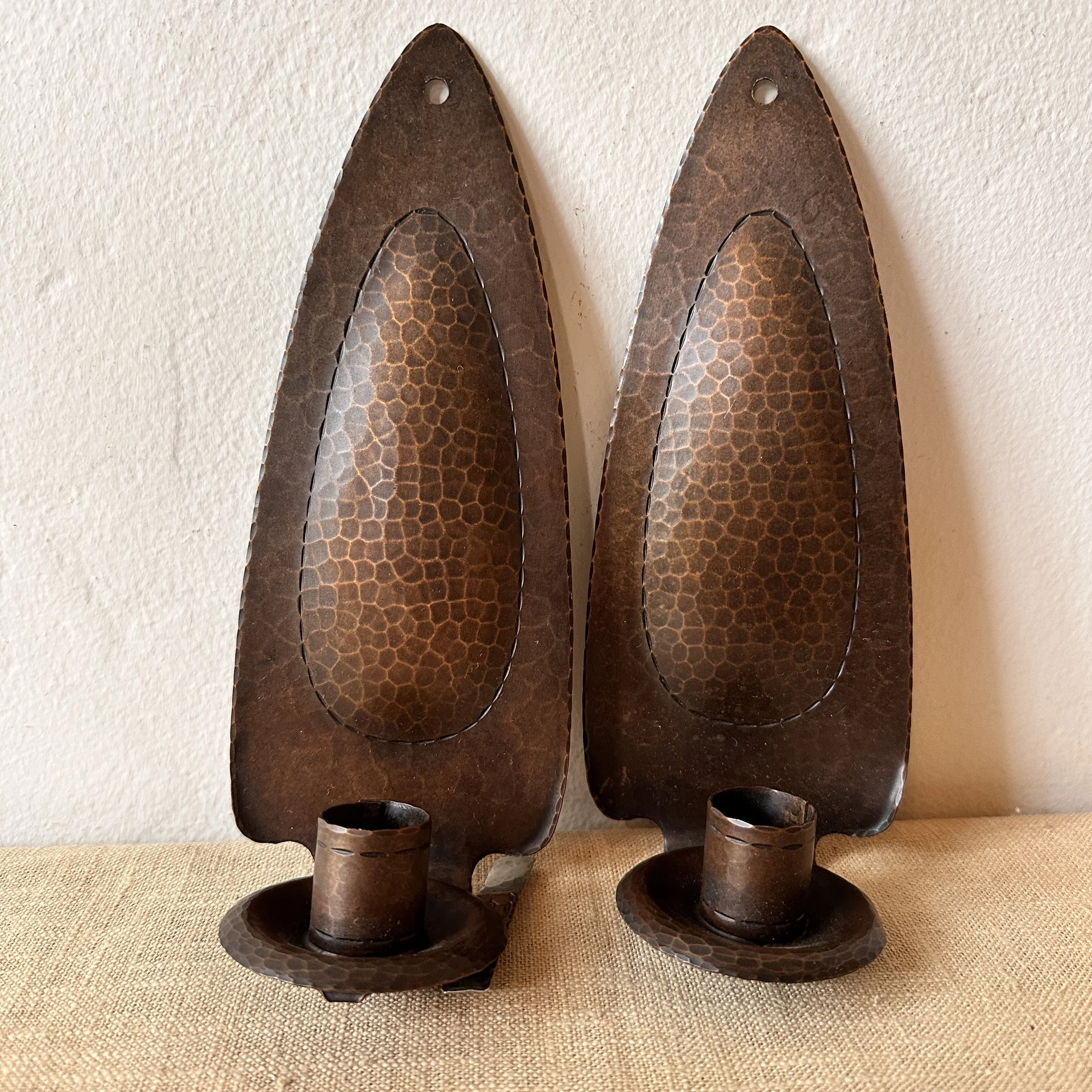 Roycroft Copper Shop sconces, East Aurora NY circa 1920. A pair of hammered copper sconces with a fine new patina. Unmarked. Measure 8” tall and 3.25” wide. SOLD
