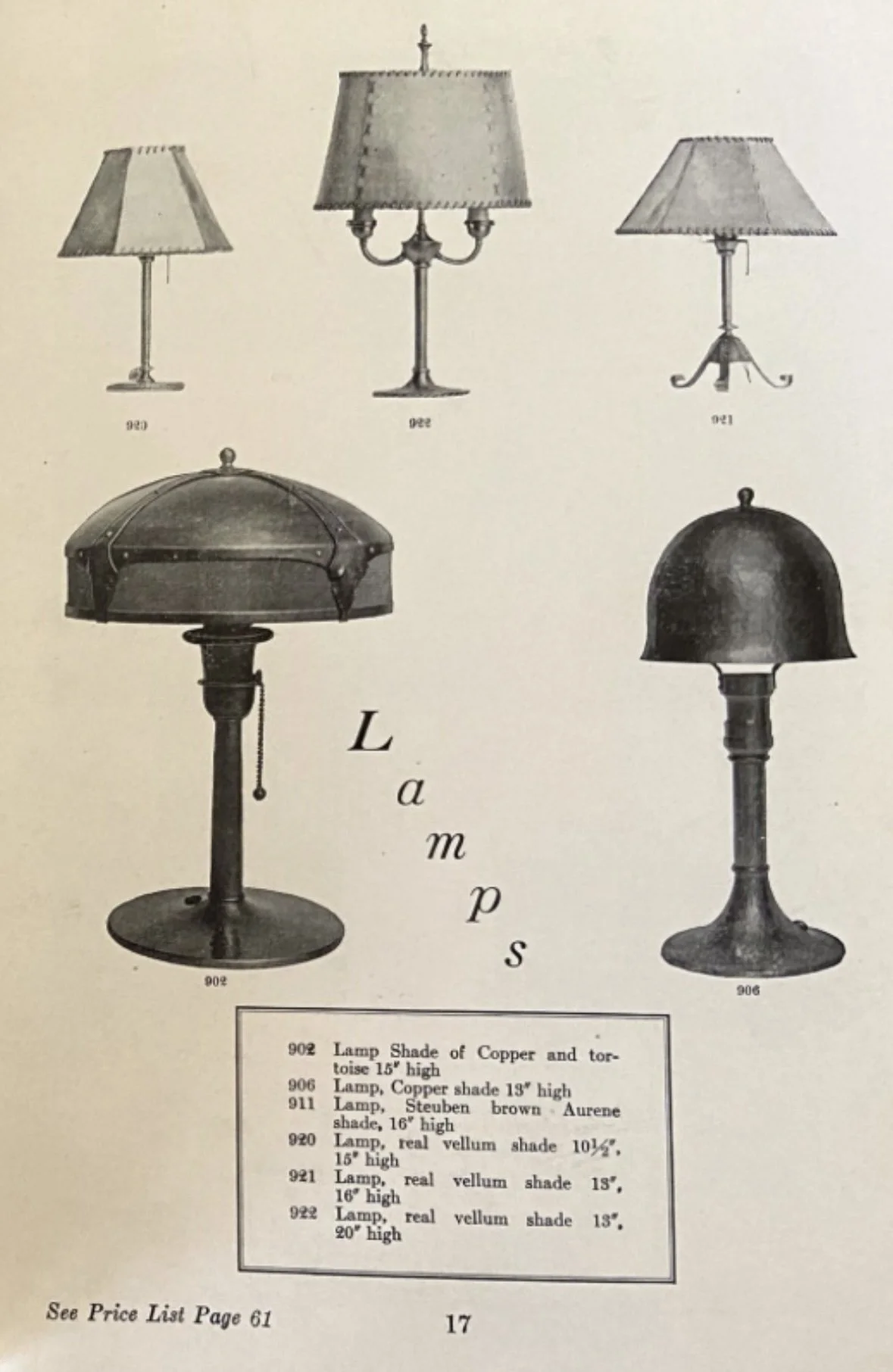 Roycroft Copper Shop No. 921 lamp, East Aurora NY circa 1920. This rare lamp is pictured in a Roycroft catalog from around 1920, this is the only version of this lamp we have seen turn up on the market. The catalog illustrates the lamp with a vellum shade, this version with a fine period leaded glass shade in white and green. The hammered copper lamp rests of three tripod legs around a detailed cone body and shaft to support socket and shade. Original patina with some color and wax added. Signed on underside of a leg. Excellent condition. Measures 16” tall, shade is 9.5” wide. SOLD