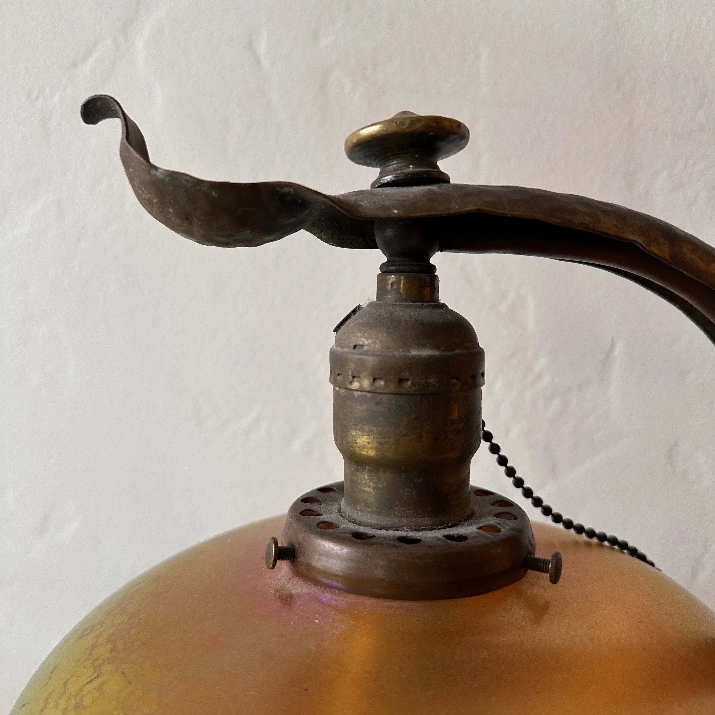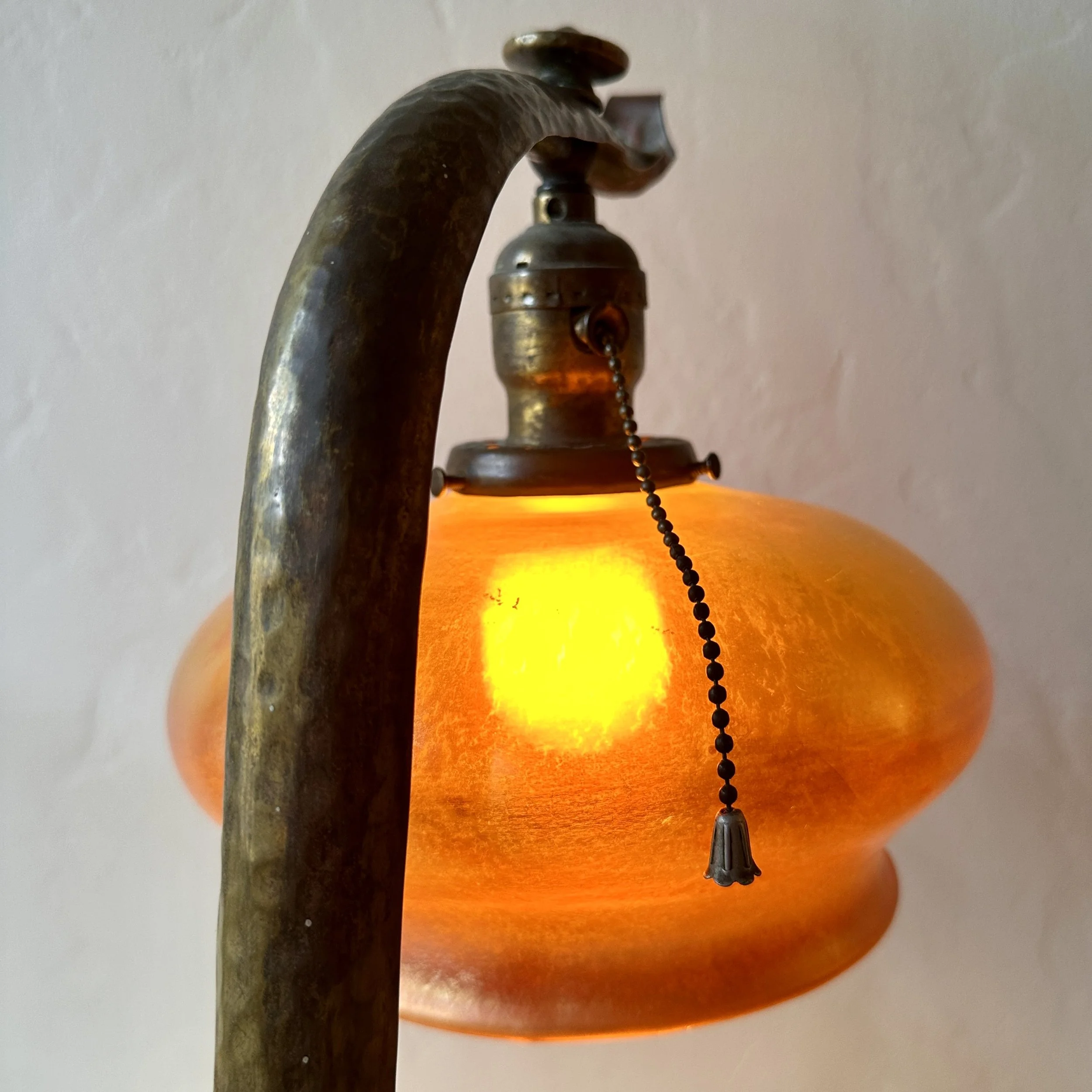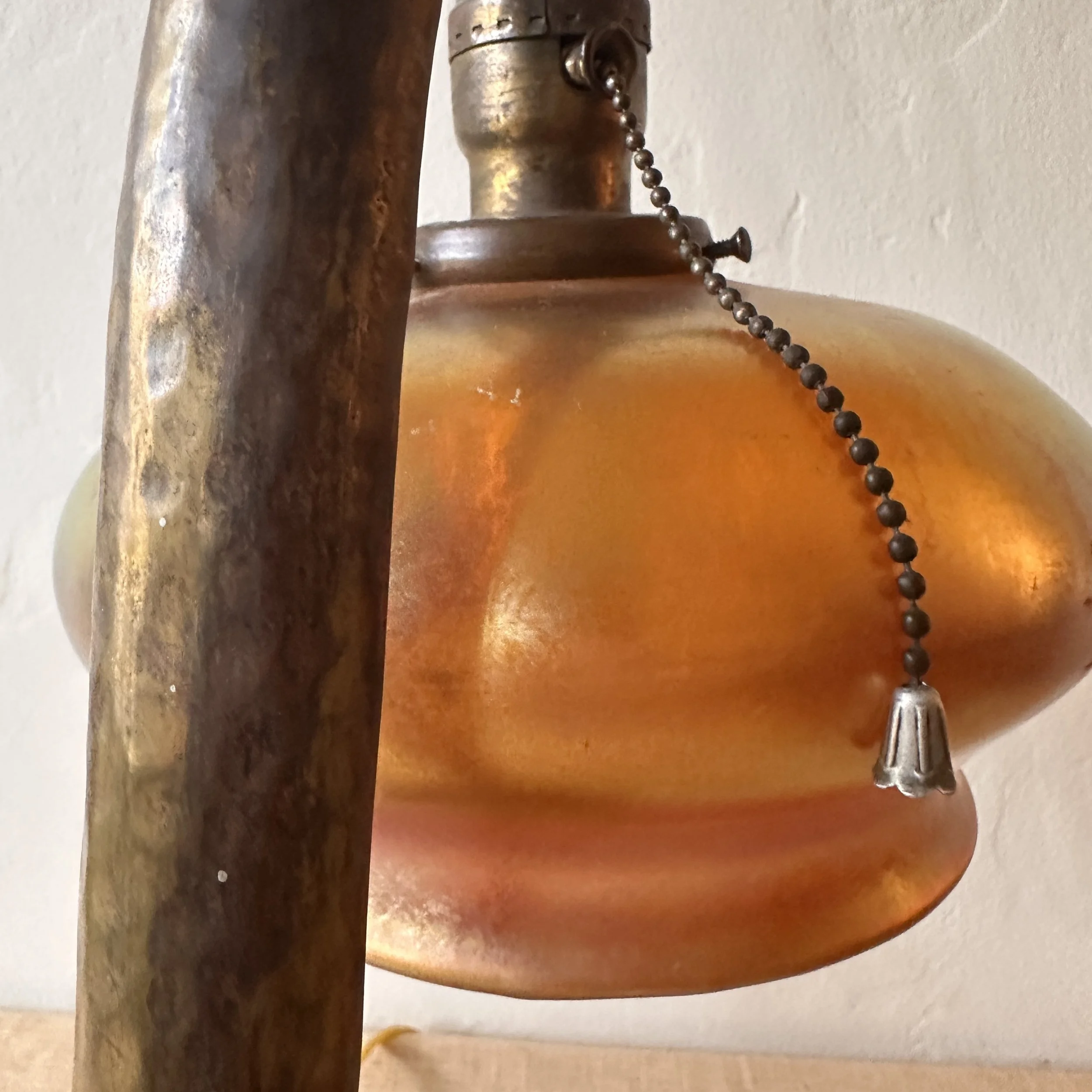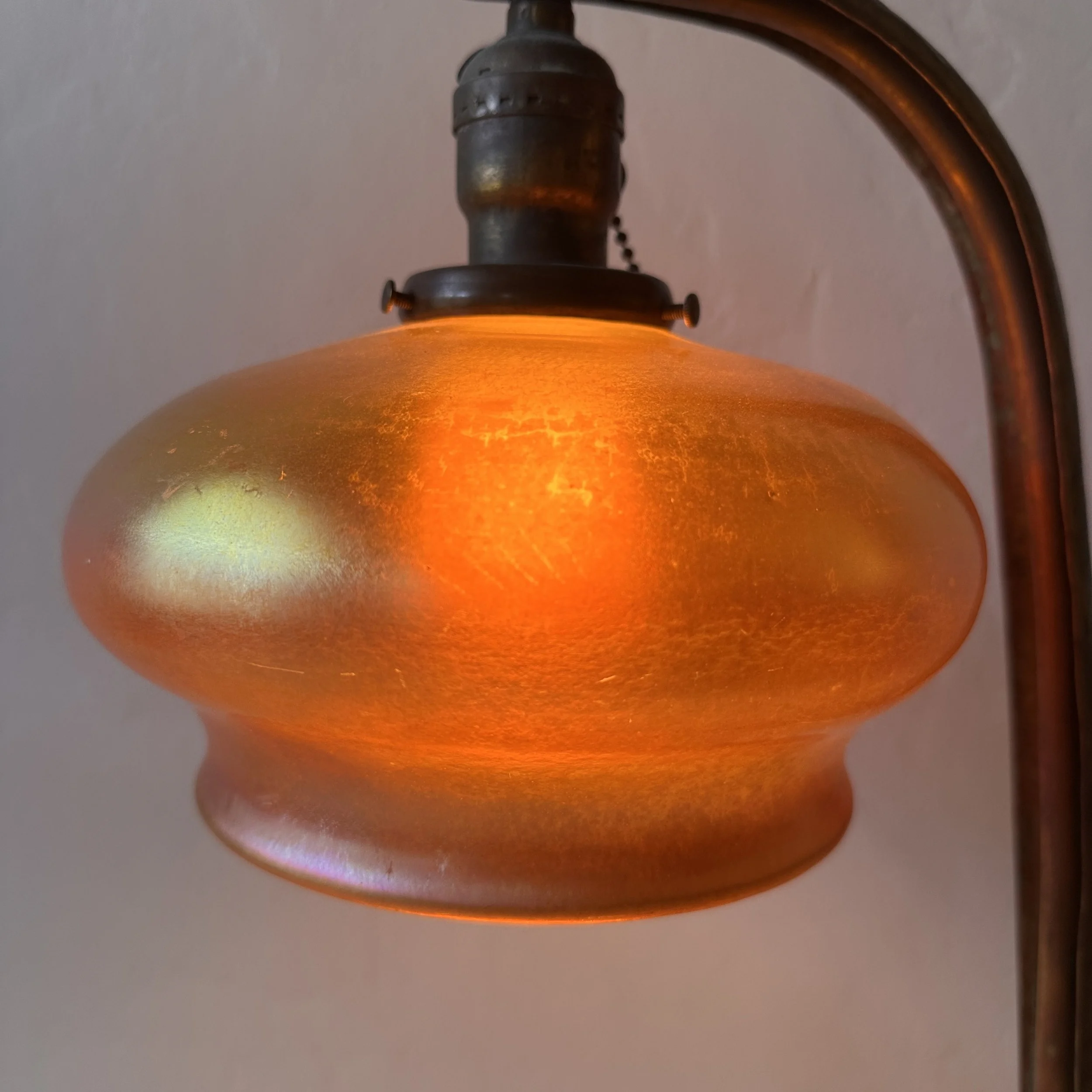 Philip-Semmer lamp, Pittsburgh PA circa 1912. The hammered brass body was mentioned in an article, “the Philip-Semmer glass company are showing a number of new effects in gas and electric portables. These are hand hammered brass and in a variety of sizes. Their new piano lamp in this design is a distinct novelty.” Here is another example with their leaded glass shade. The weighted base with the large dome holds the lamp perfectly in place, the ruffled edges lead to the shaft which supports the Quezal shade. The shape is reminiscent of a lily pad with a blooming flower. The base with an original patina, shade unsigned and in excellent condition. We have only seen a couple of these lamps over the past 30 years. Measures 18.5” tall, base is 10.5” deep and 6.75” wide. Shade is 8” wide and 4.5” tall. $1,250