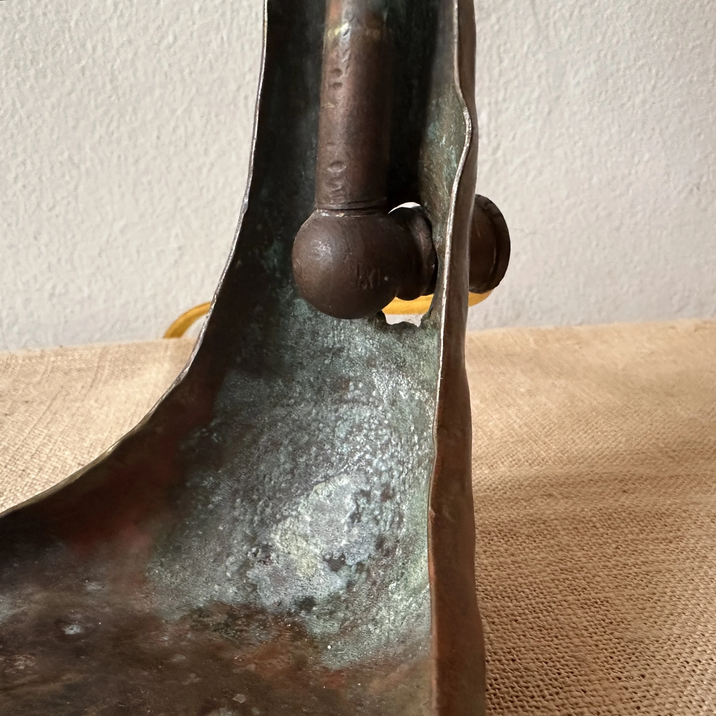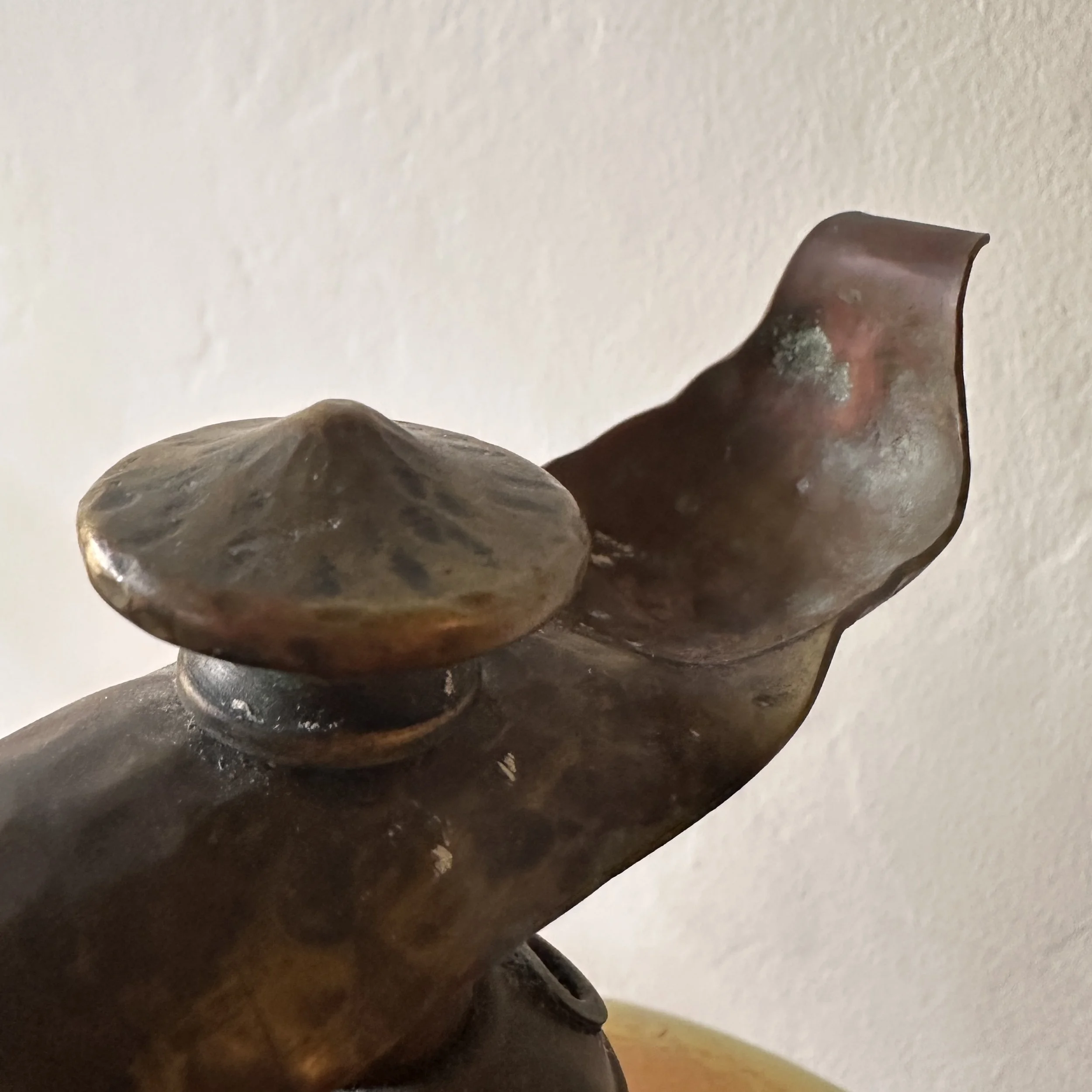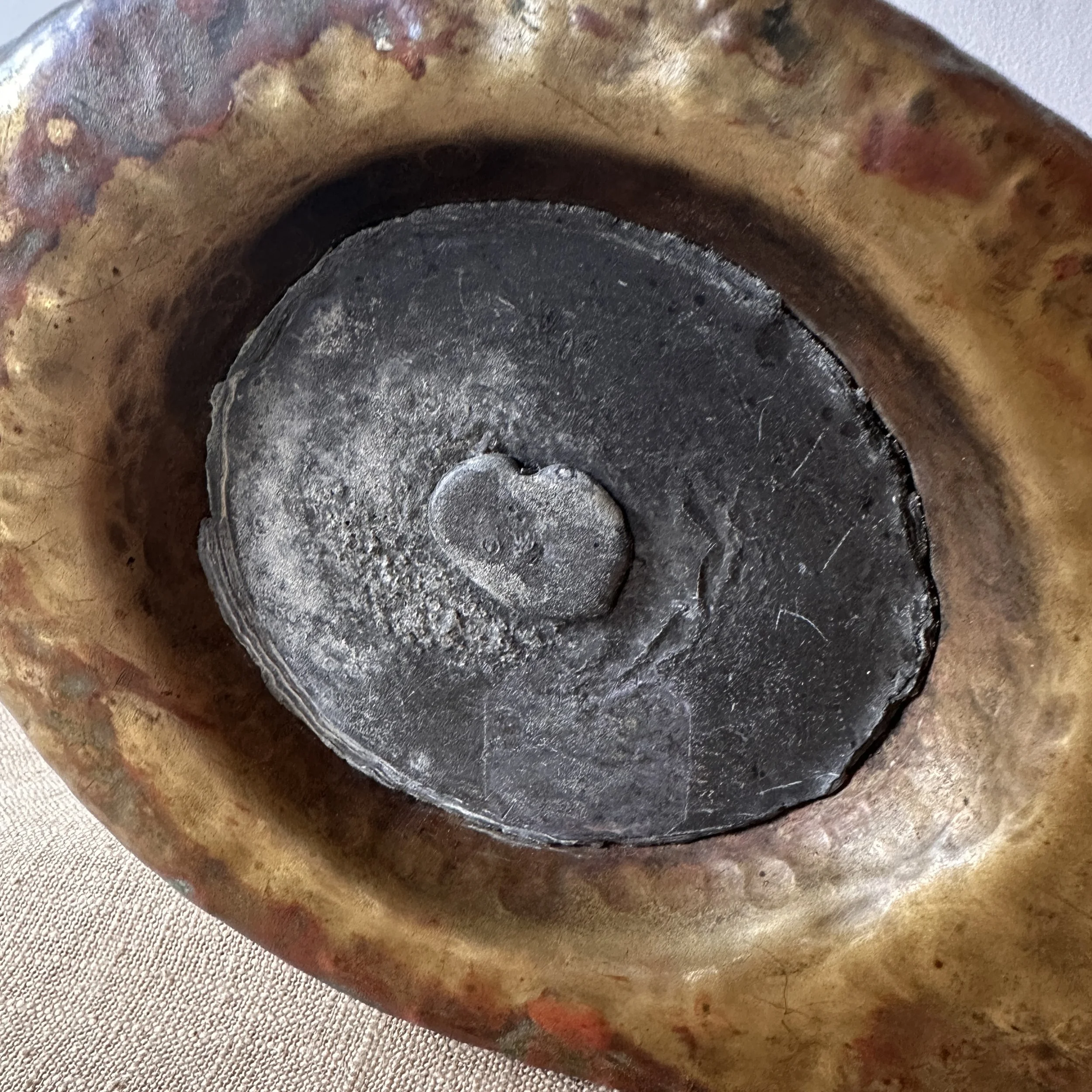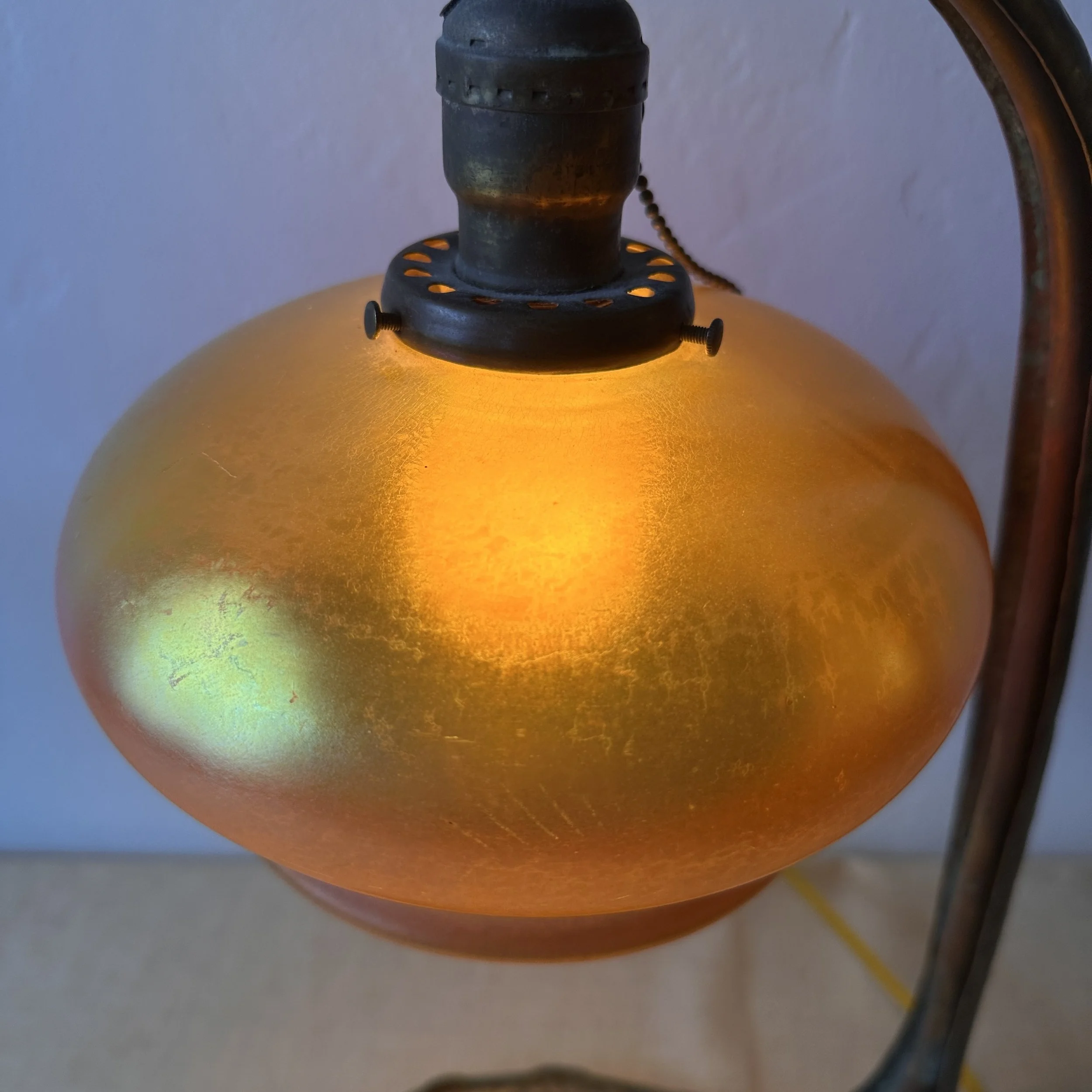 Philip-Semmer lamp, Pittsburgh PA circa 1912. The hammered brass body was mentioned in an article, “the Philip-Semmer glass company are showing a number of new effects in gas and electric portables. These are hand hammered brass and in a variety of sizes. Their new piano lamp in this design is a distinct novelty.” Here is another example with their leaded glass shade. The weighted base with the large dome holds the lamp perfectly in place, the ruffled edges lead to the shaft which supports the Quezal shade. The shape is reminiscent of a lily pad with a blooming flower. The base with an original patina, shade unsigned and in excellent condition. We have only seen a couple of these lamps over the past 30 years. Measures 18.5” tall, base is 10.5” deep and 6.75” wide. Shade is 8” wide and 4.5” tall. $1,250