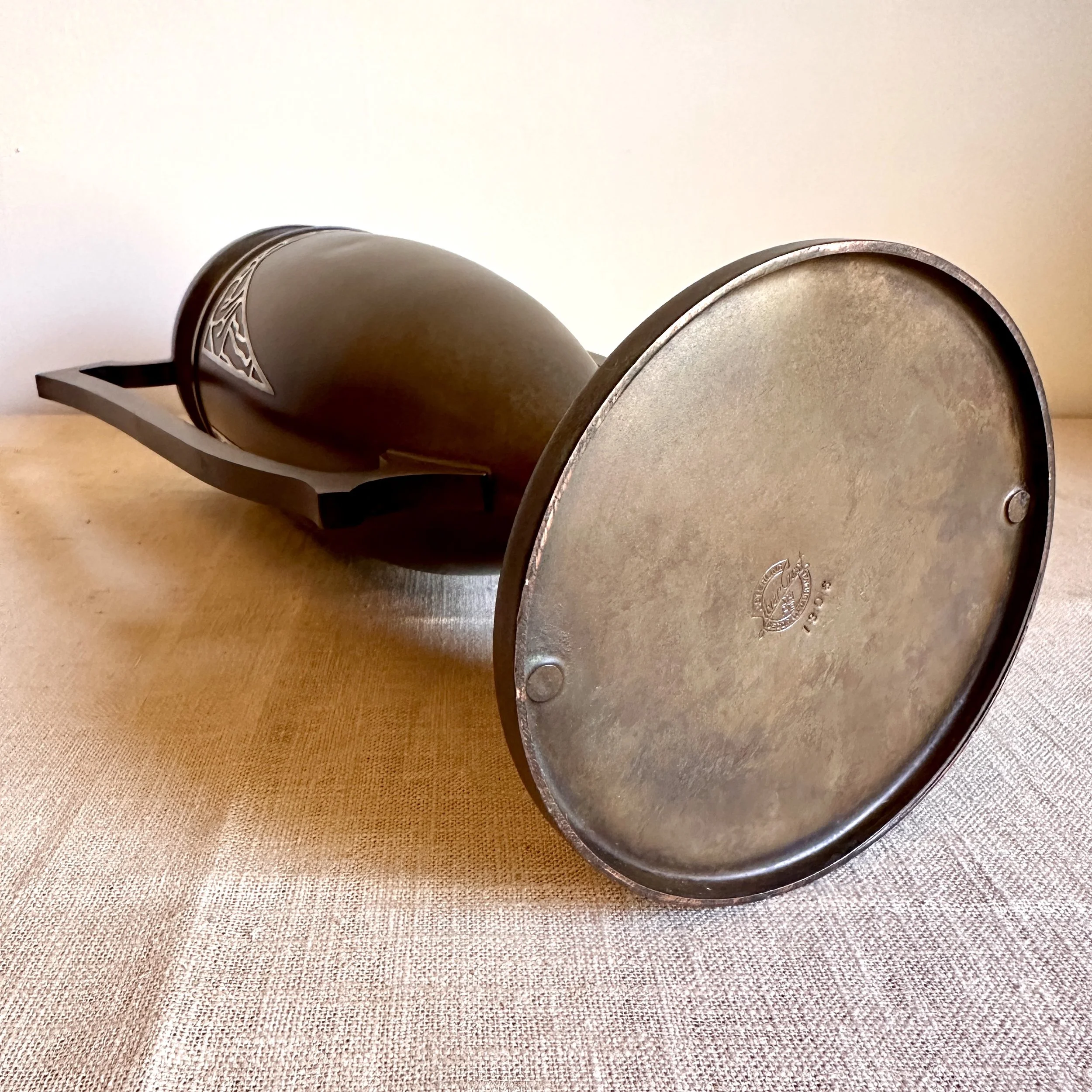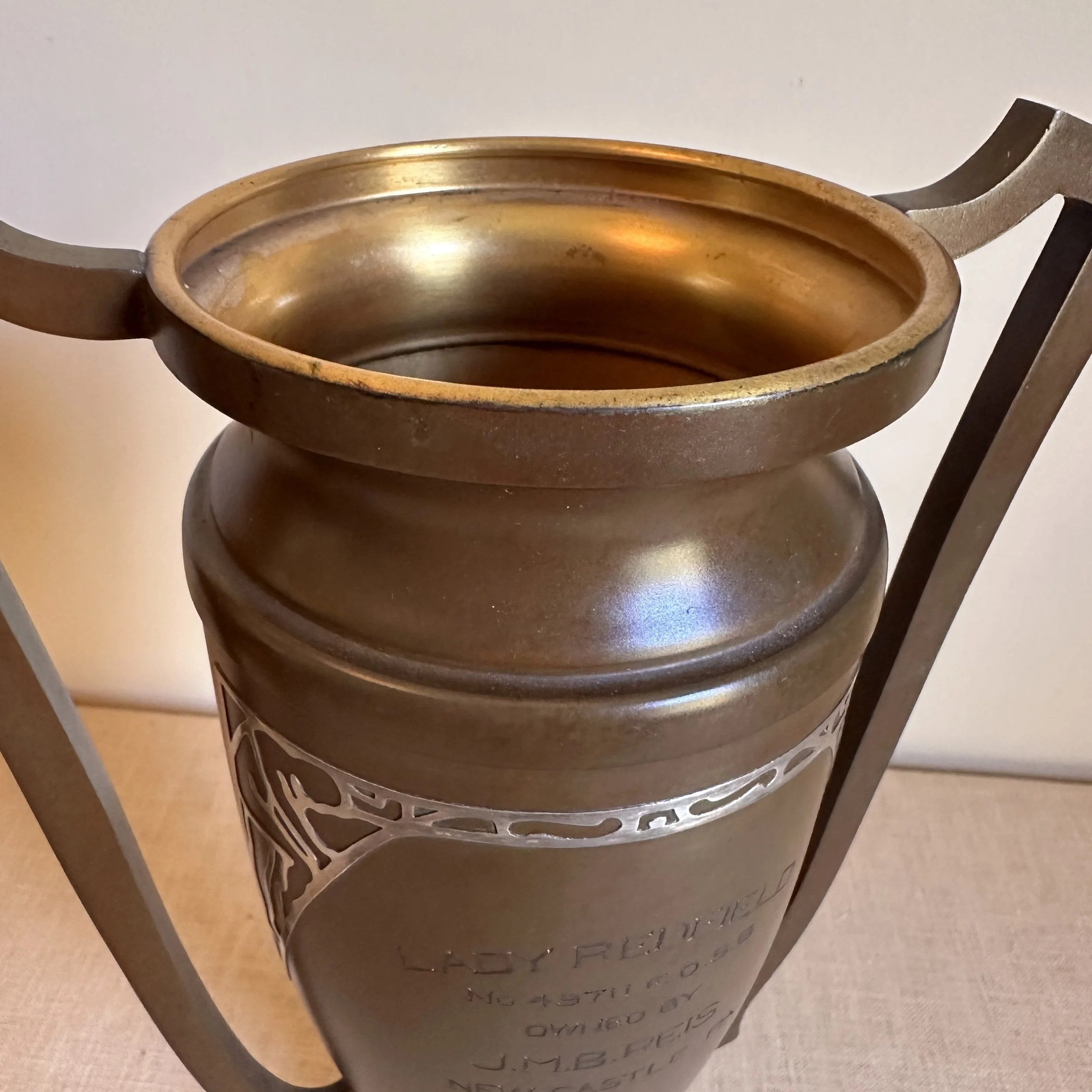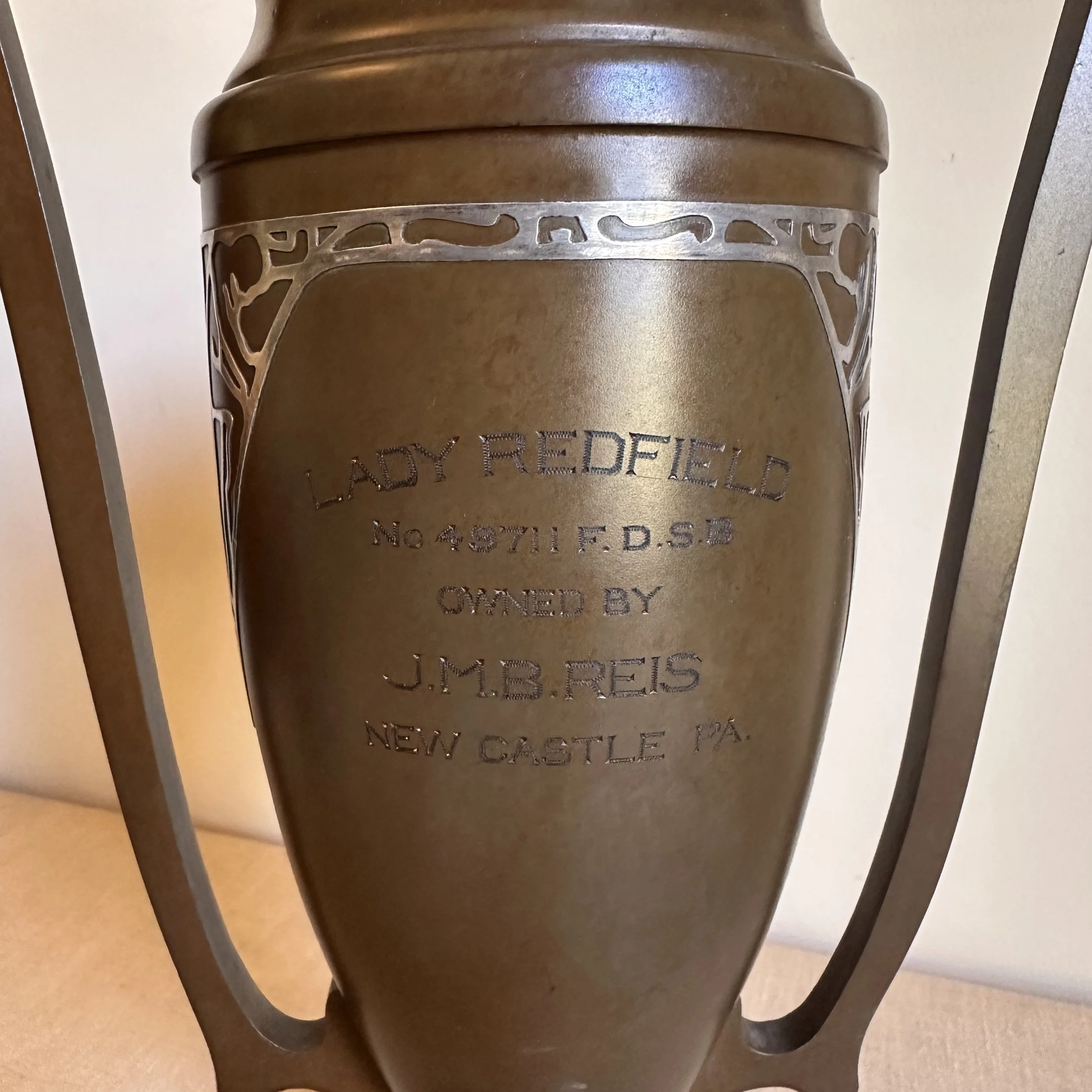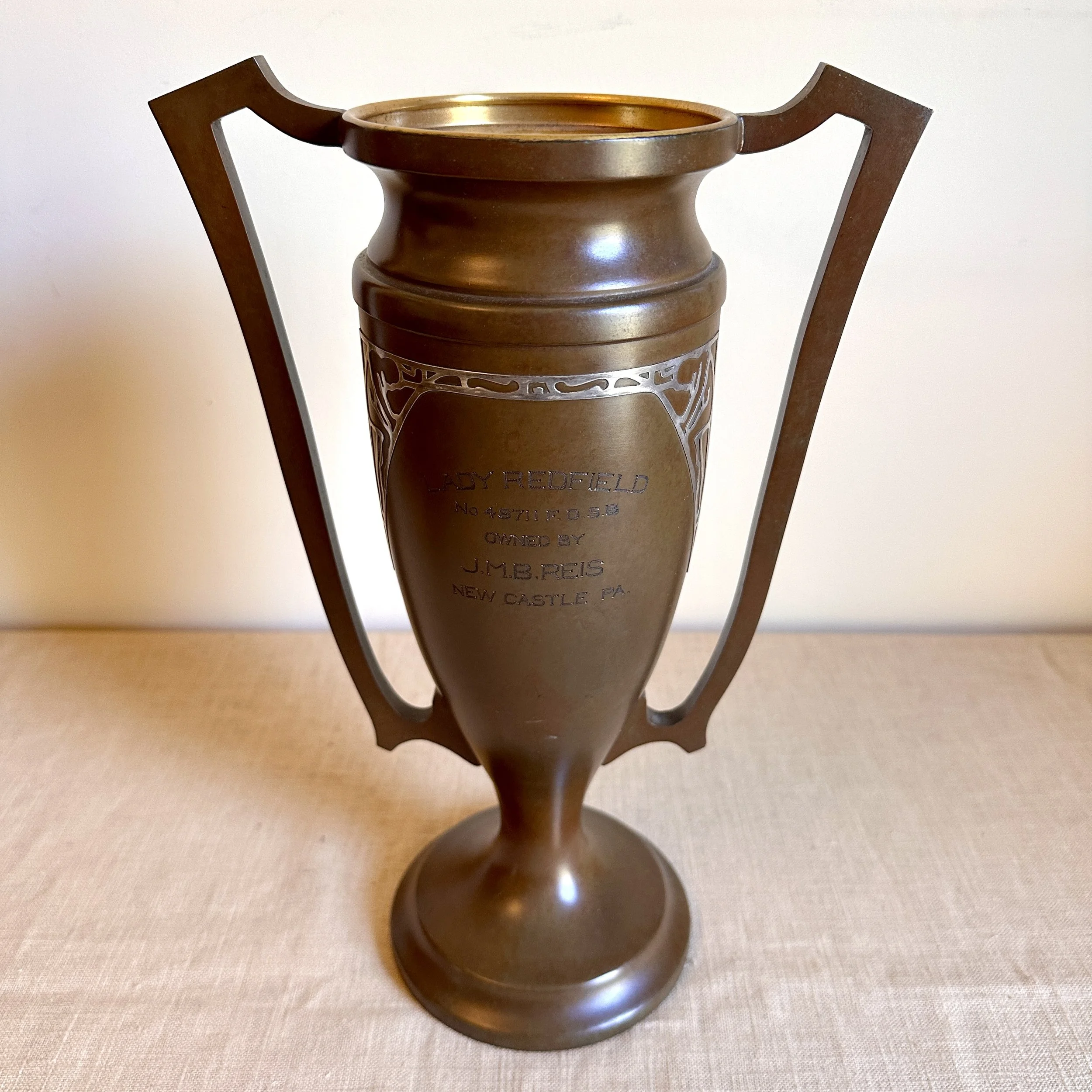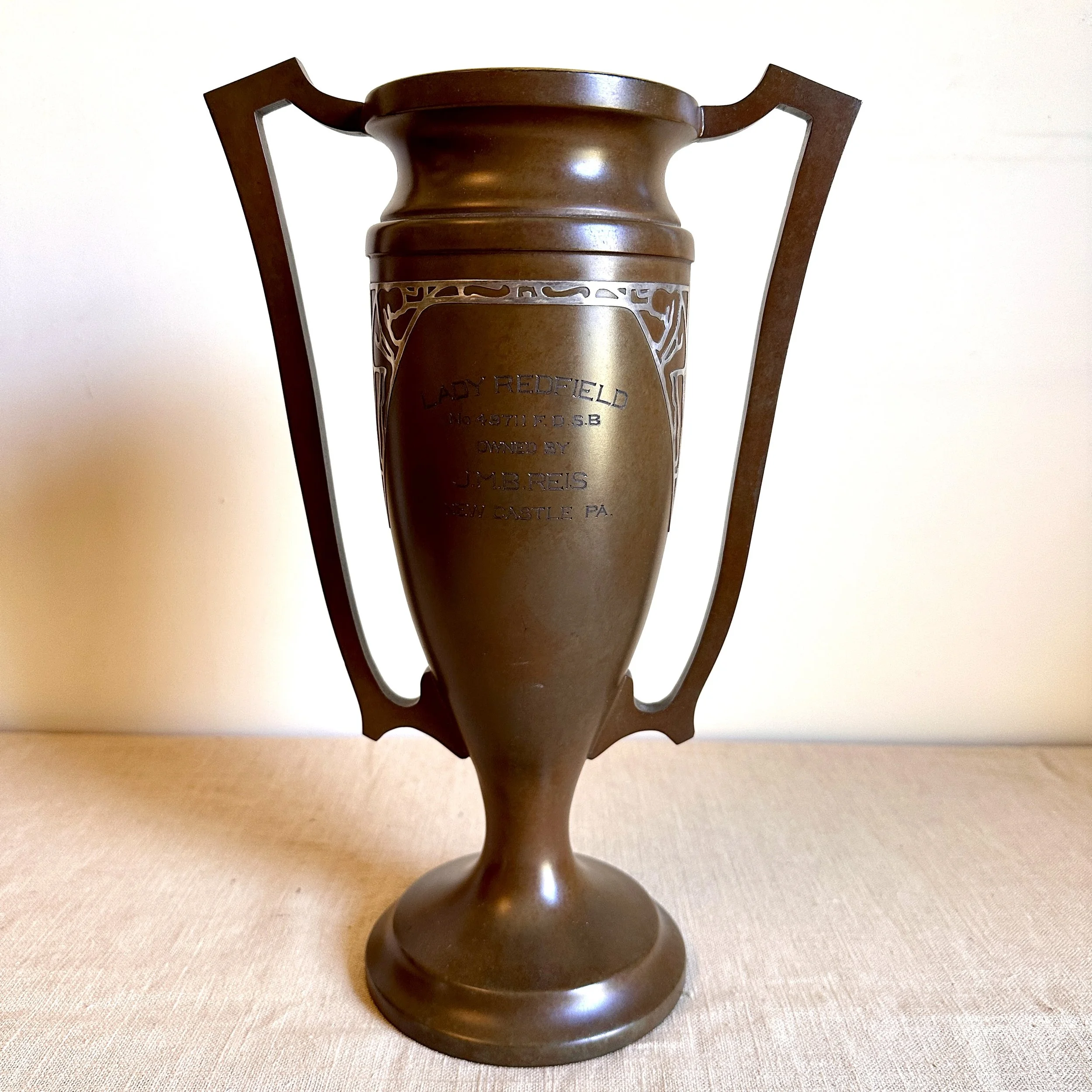 Silvercrest dog trophy, Buffalo NY circa 1920. A large bronze trophy with silver overlay of climbing male figures on each side. The inscription is for “Lady Redfield” of New Castle, PA; a champion English Setter who was well documented as a competitive dog under her owner, J.M.B. Reis. Original patina, one small dimple on reverse side, otherwise excellent condition. Measures 13” tall, 9” wide with handles and 5.25” wide at base. $275