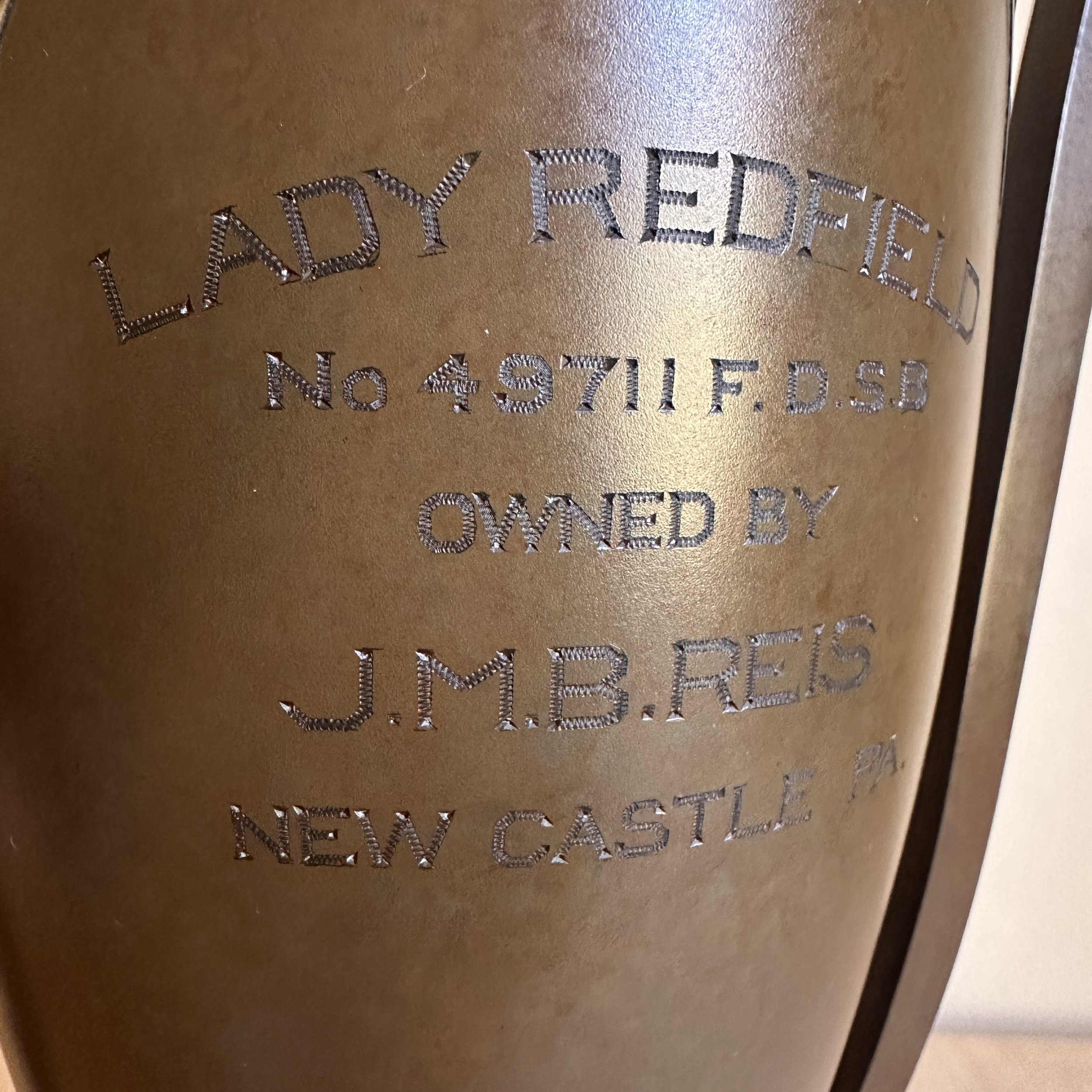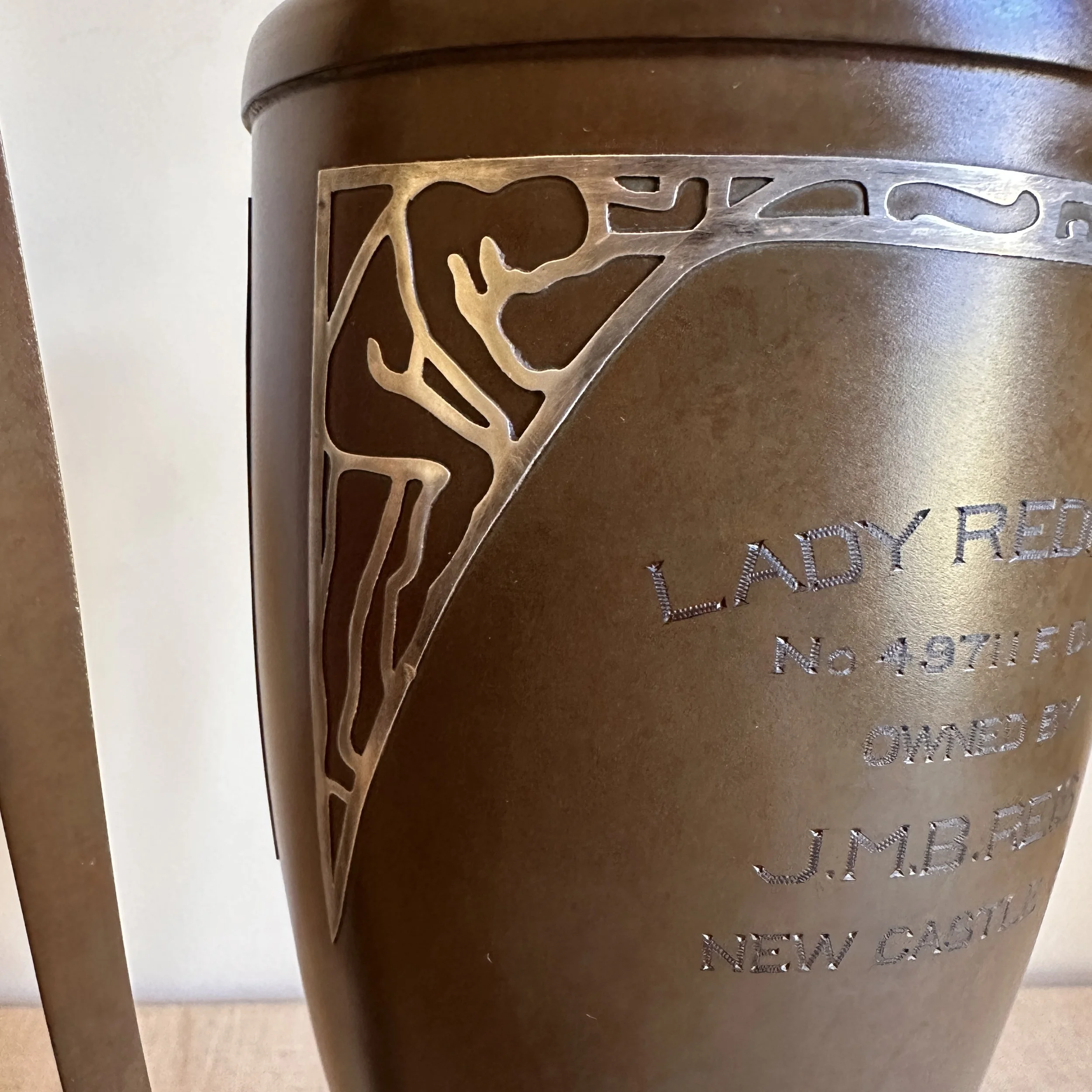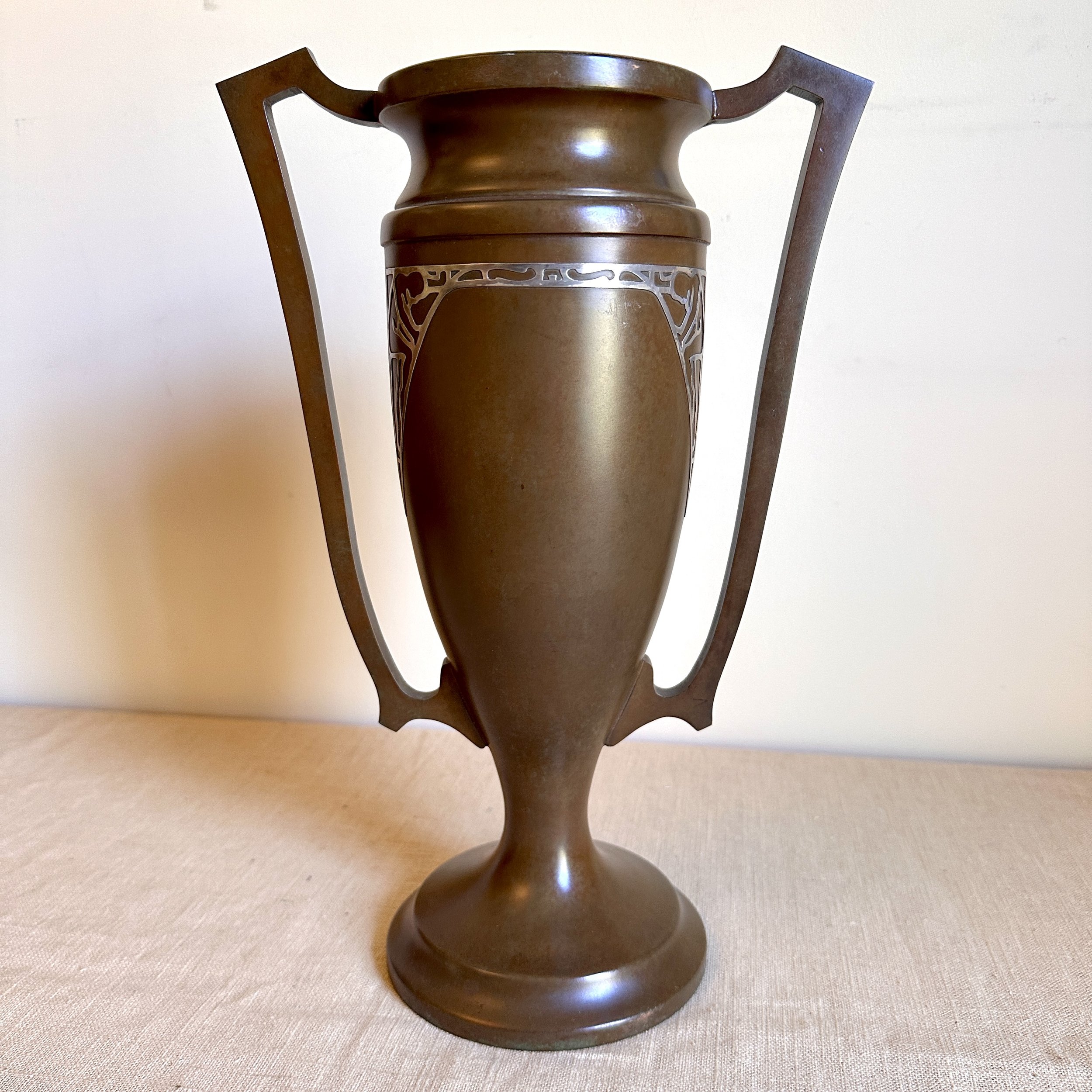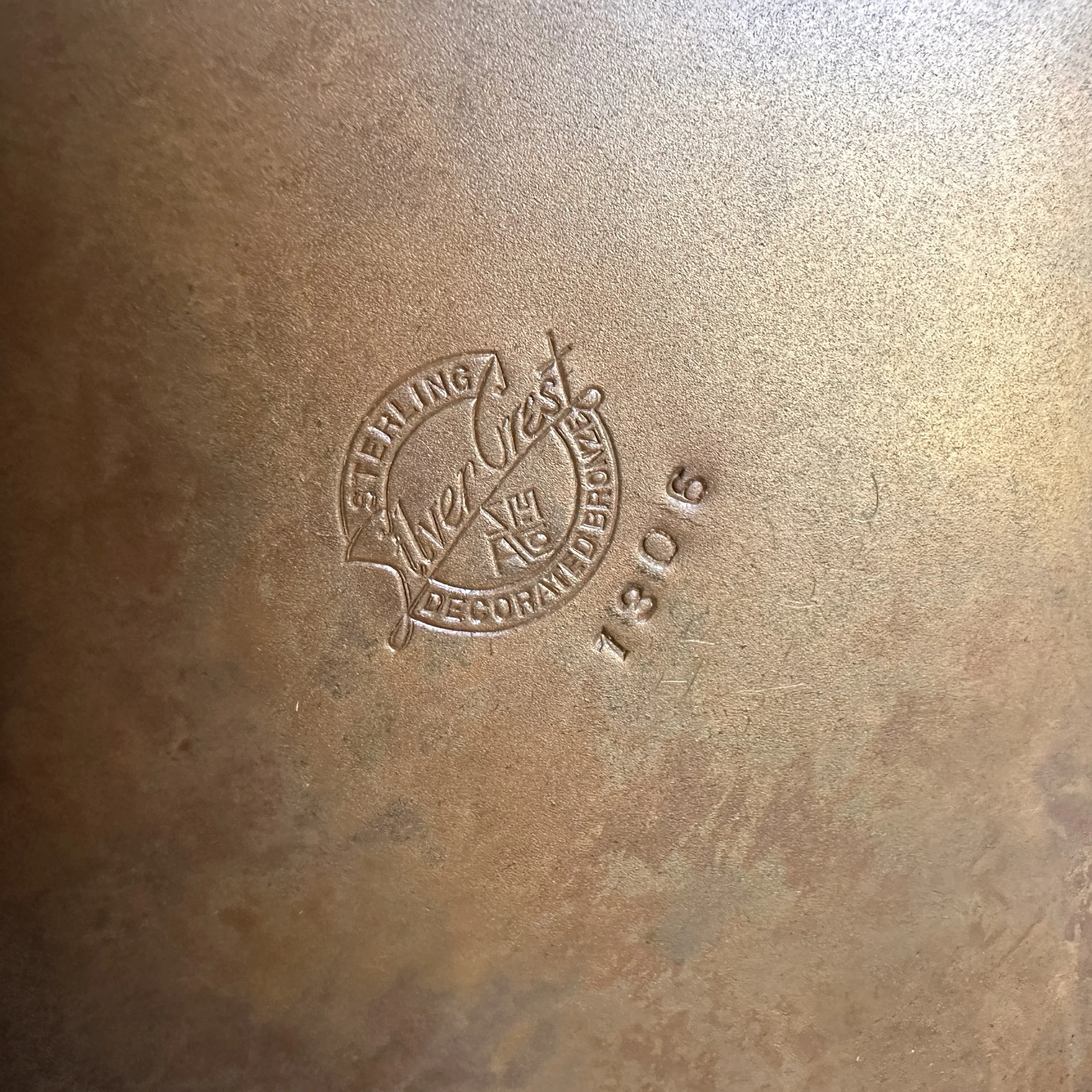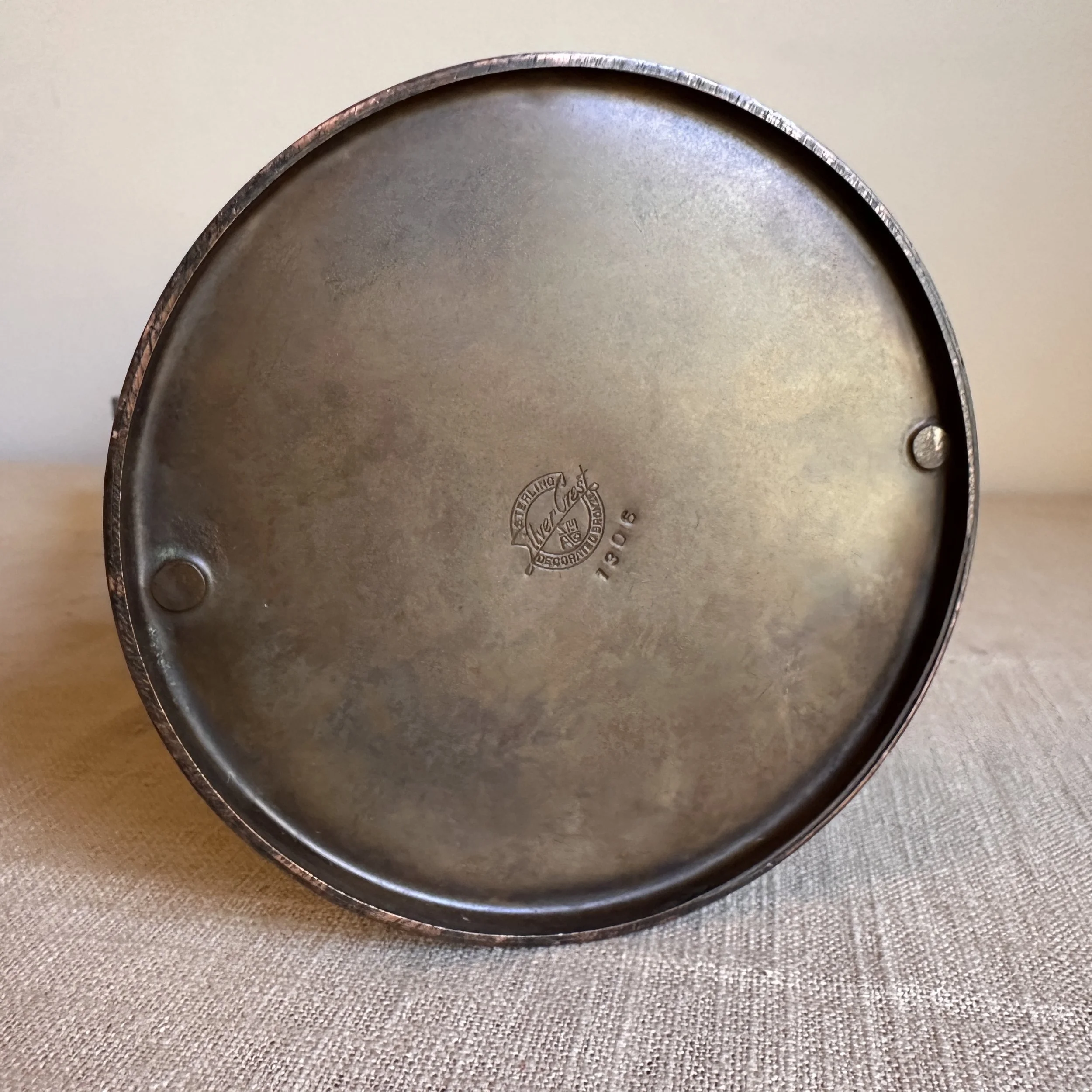 Silvercrest dog trophy, Buffalo NY circa 1920. A large bronze trophy with silver overlay of climbing male figures on each side. The inscription is for “Lady Redfield” of New Castle, PA; a champion English Setter who was well documented as a competitive dog under her owner, J.M.B. Reis. Original patina, one small dimple on reverse side, otherwise excellent condition. Measures 13” tall, 9” wide with handles and 5.25” wide at base. $275