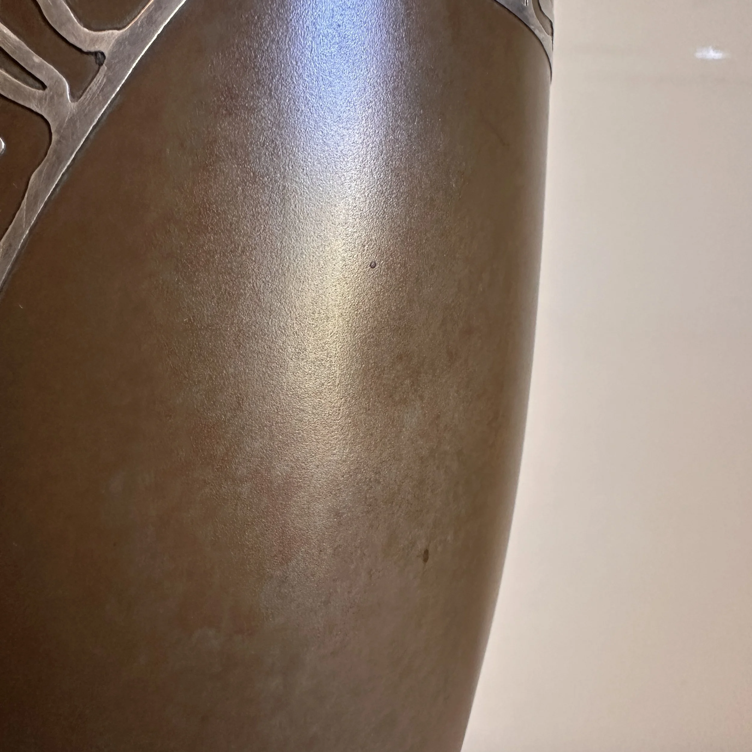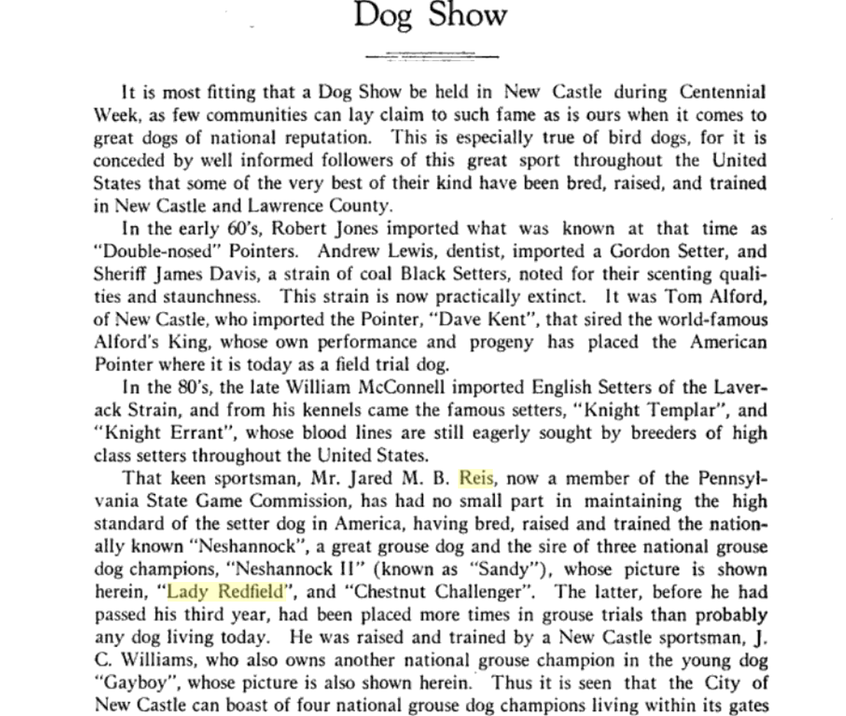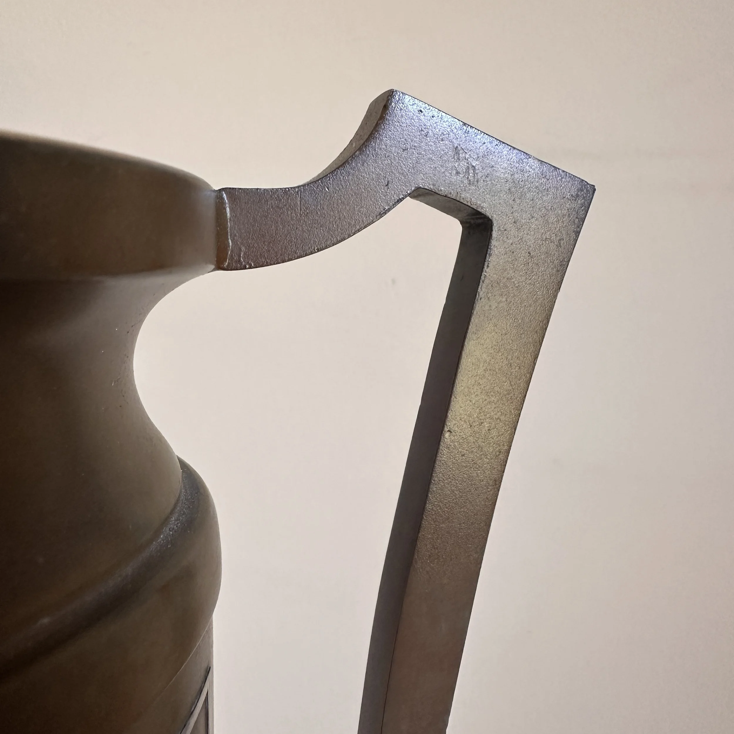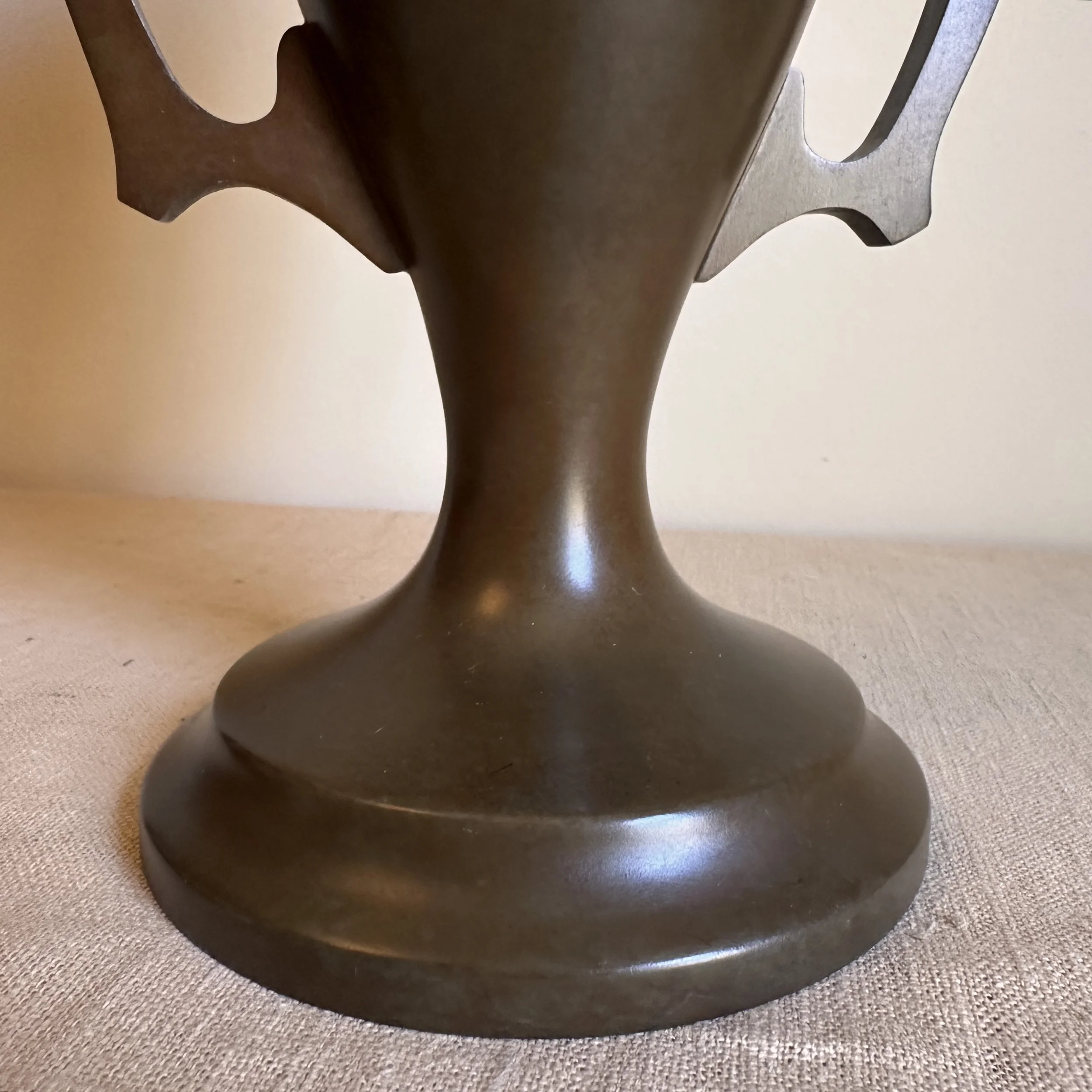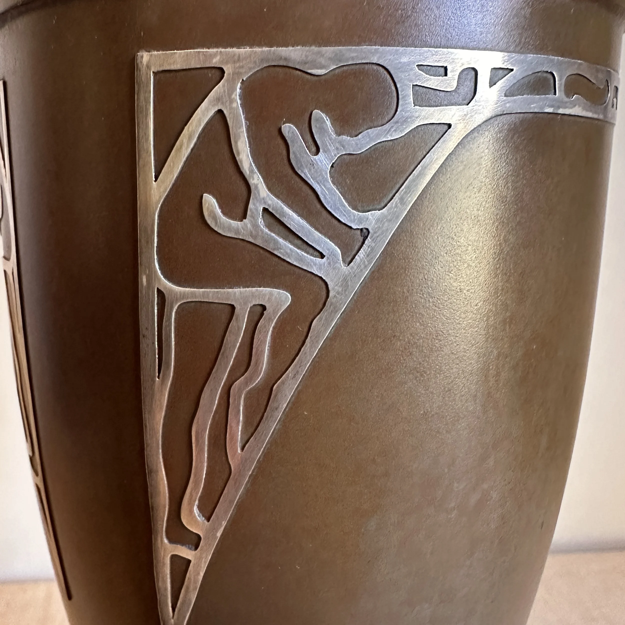 Silvercrest dog trophy, Buffalo NY circa 1920. A large bronze trophy with silver overlay of climbing male figures on each side. The inscription is for “Lady Redfield” of New Castle, PA; a champion English Setter who was well documented as a competitive dog under her owner, J.M.B. Reis. Original patina, one small dimple on reverse side, otherwise excellent condition. Measures 13” tall, 9” wide with handles and 5.25” wide at base. $275