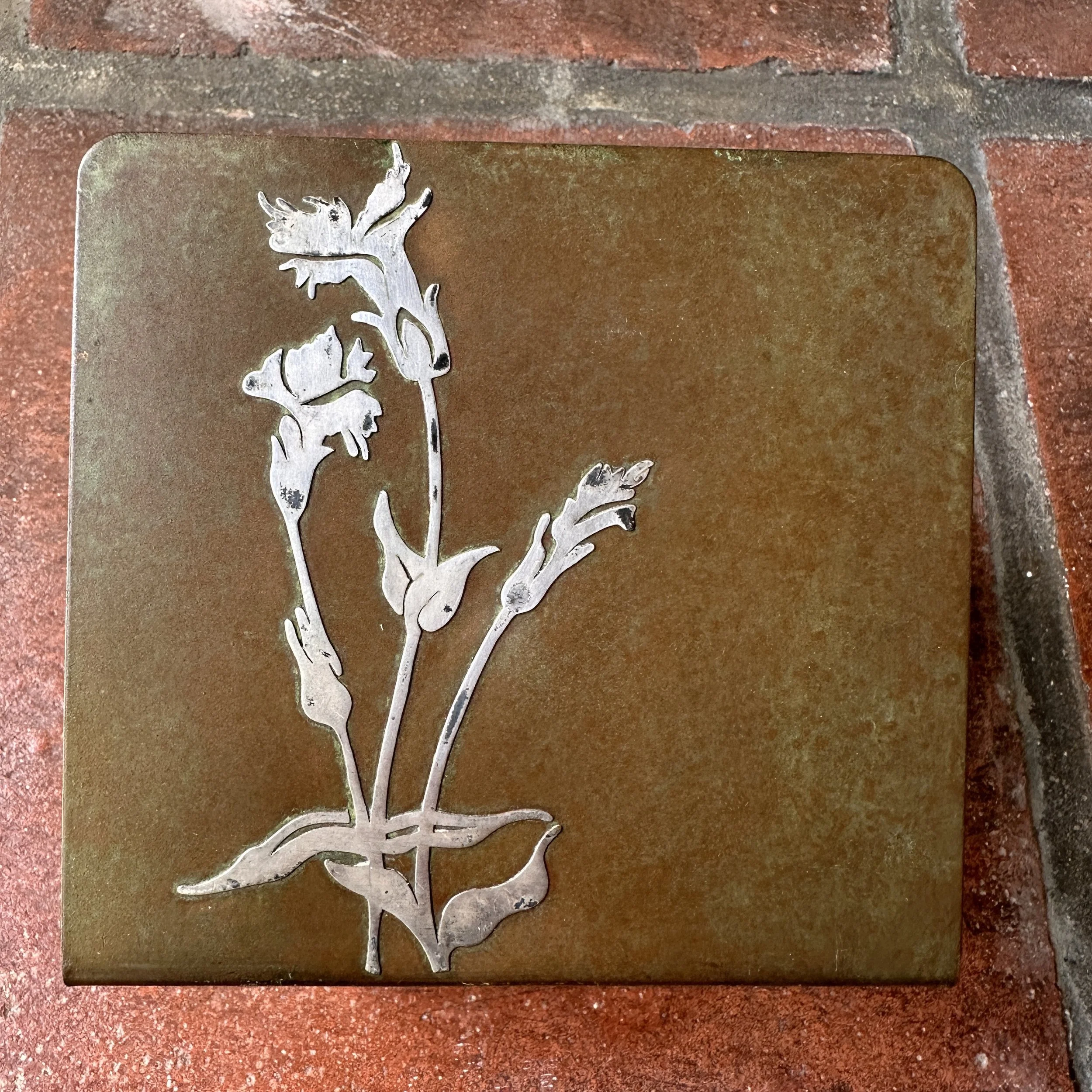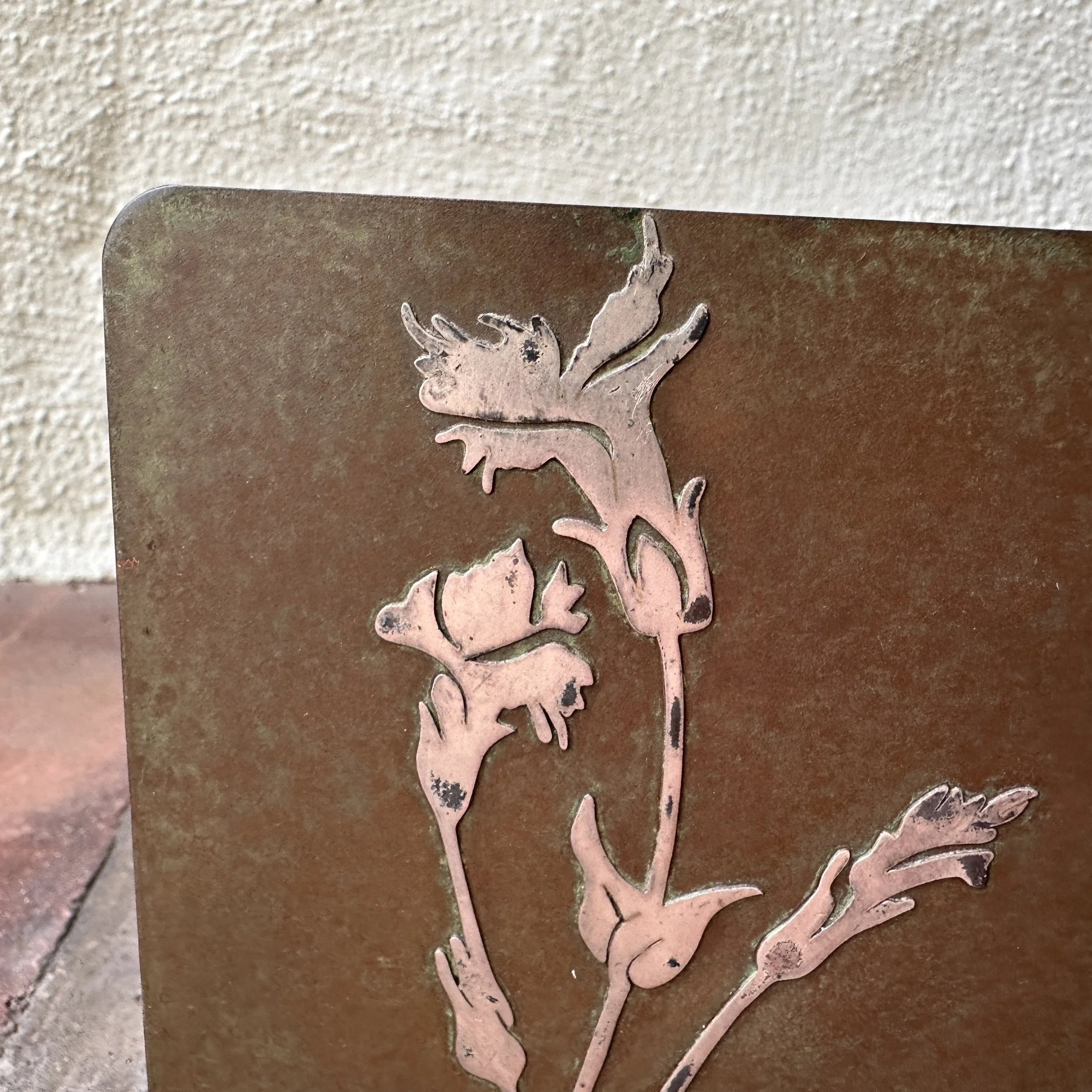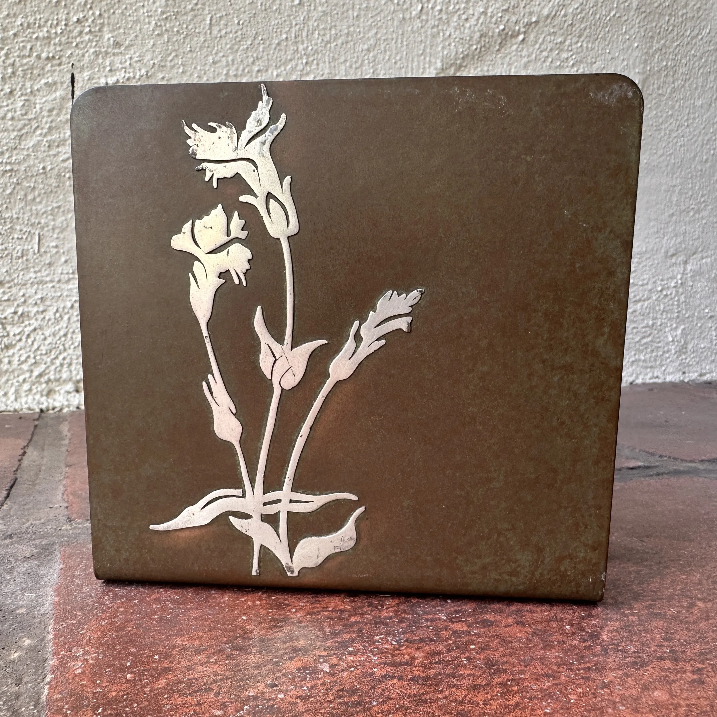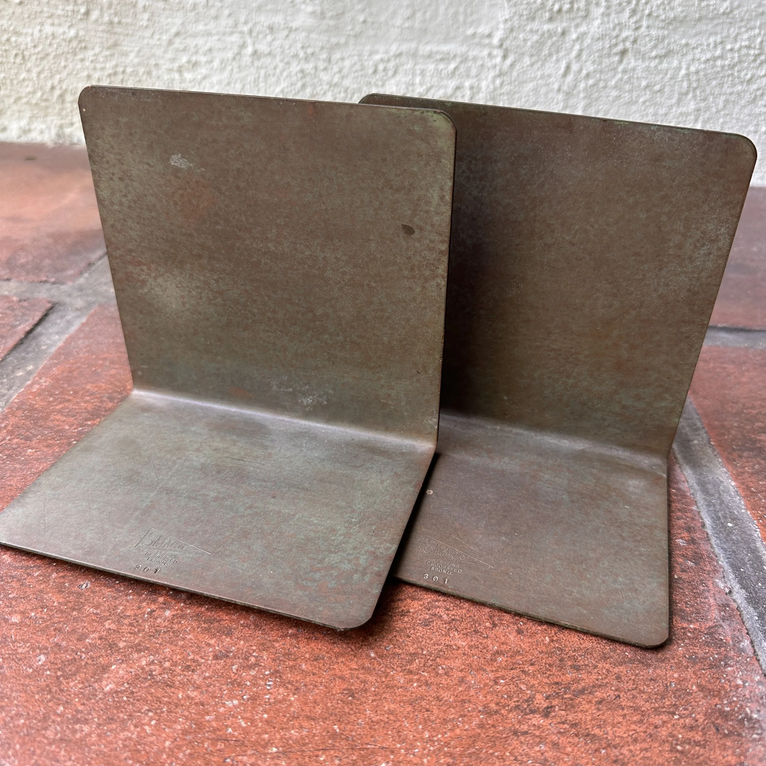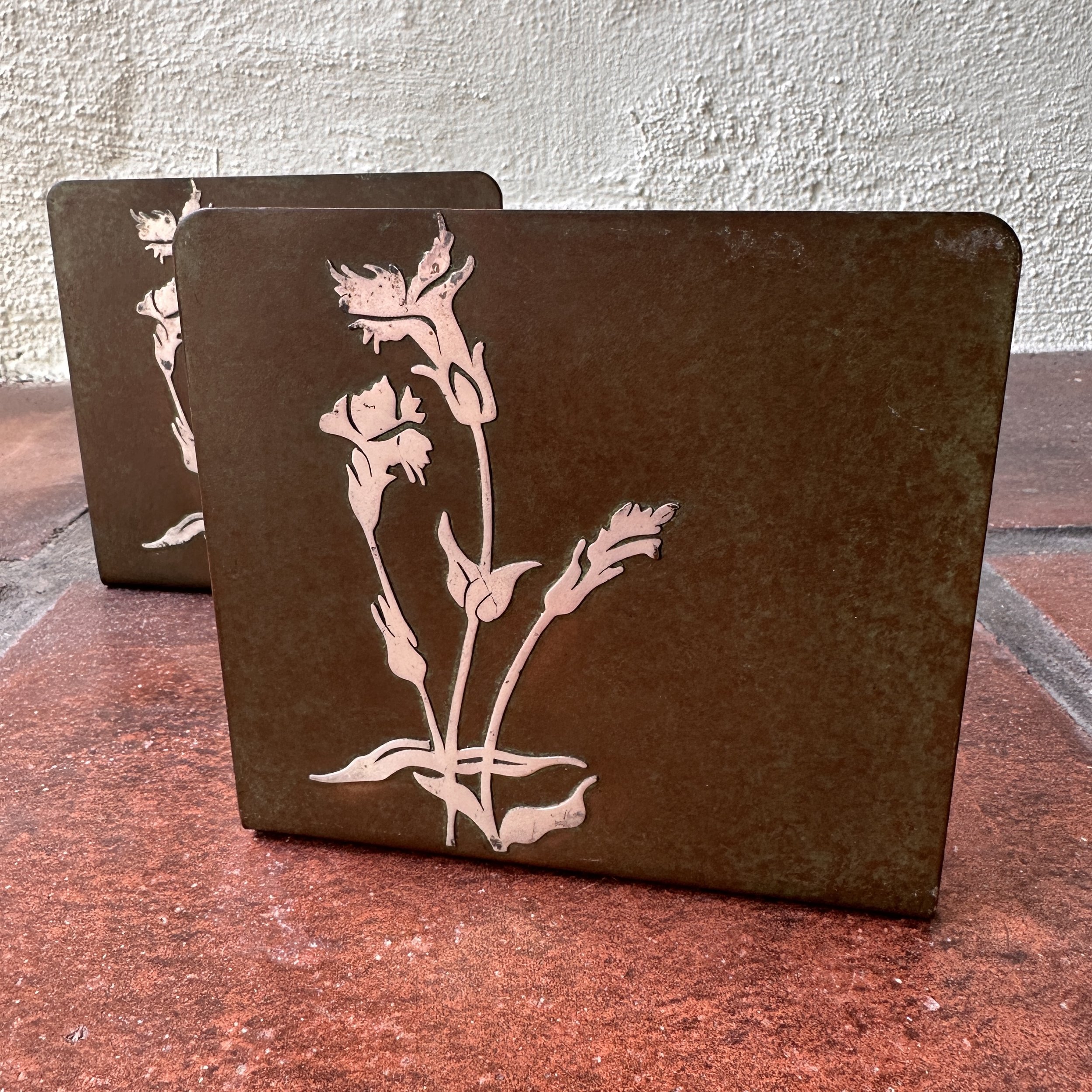 Smith Metal Art bookends, Buffalo NY circa 1924. A large pair of bronze bookends with floral silver overlay and a mottled green patina. Smith Metal was formerly Heintz Art Metal, these are signed with the SMACO mark. Excellent condition. Measure 5” tall, 5.5” wide and 4” deep. $175