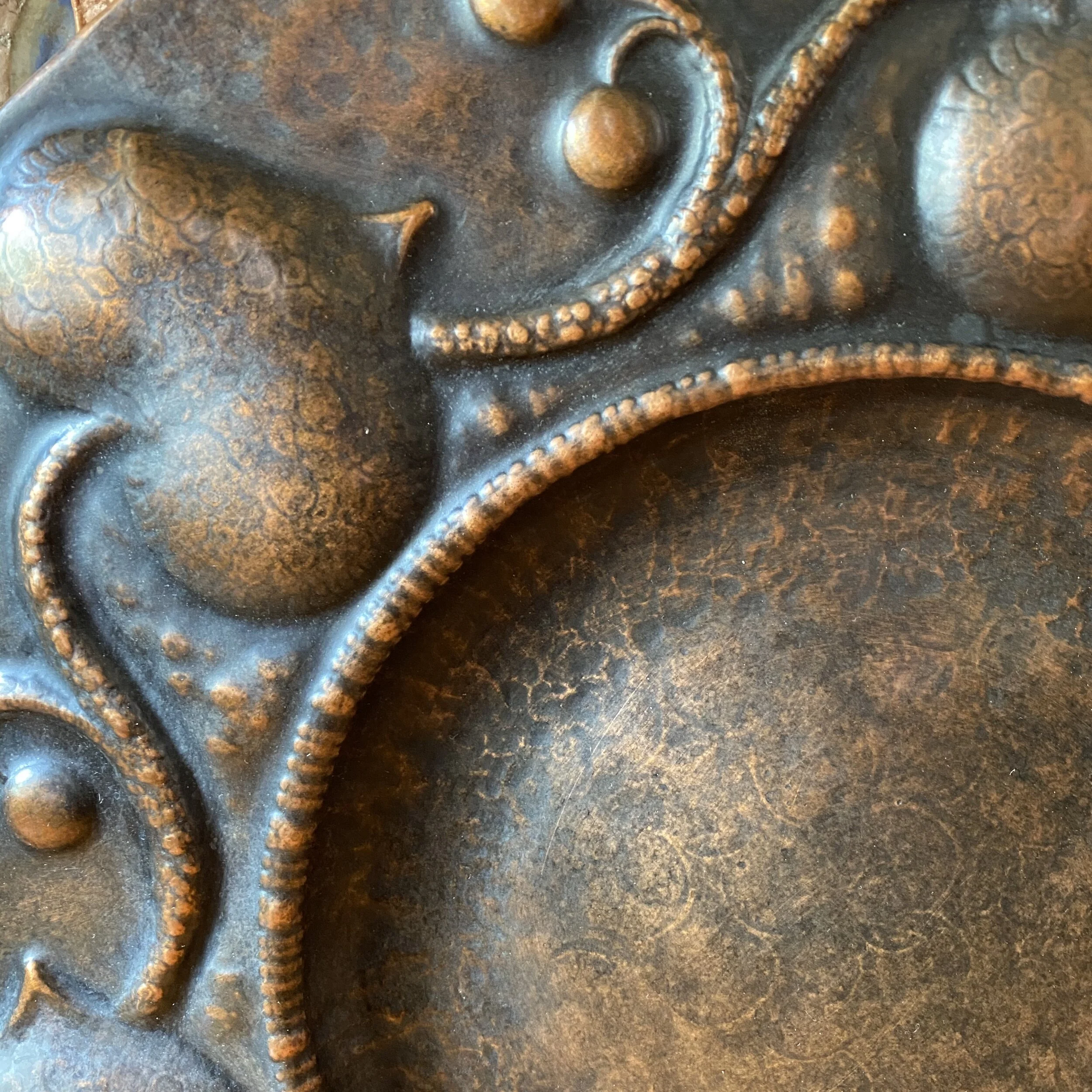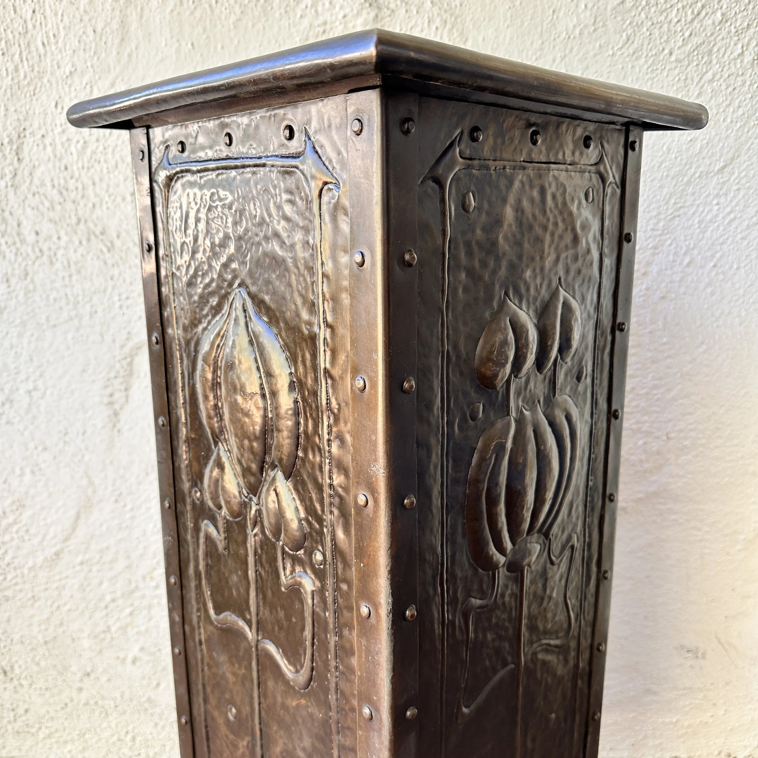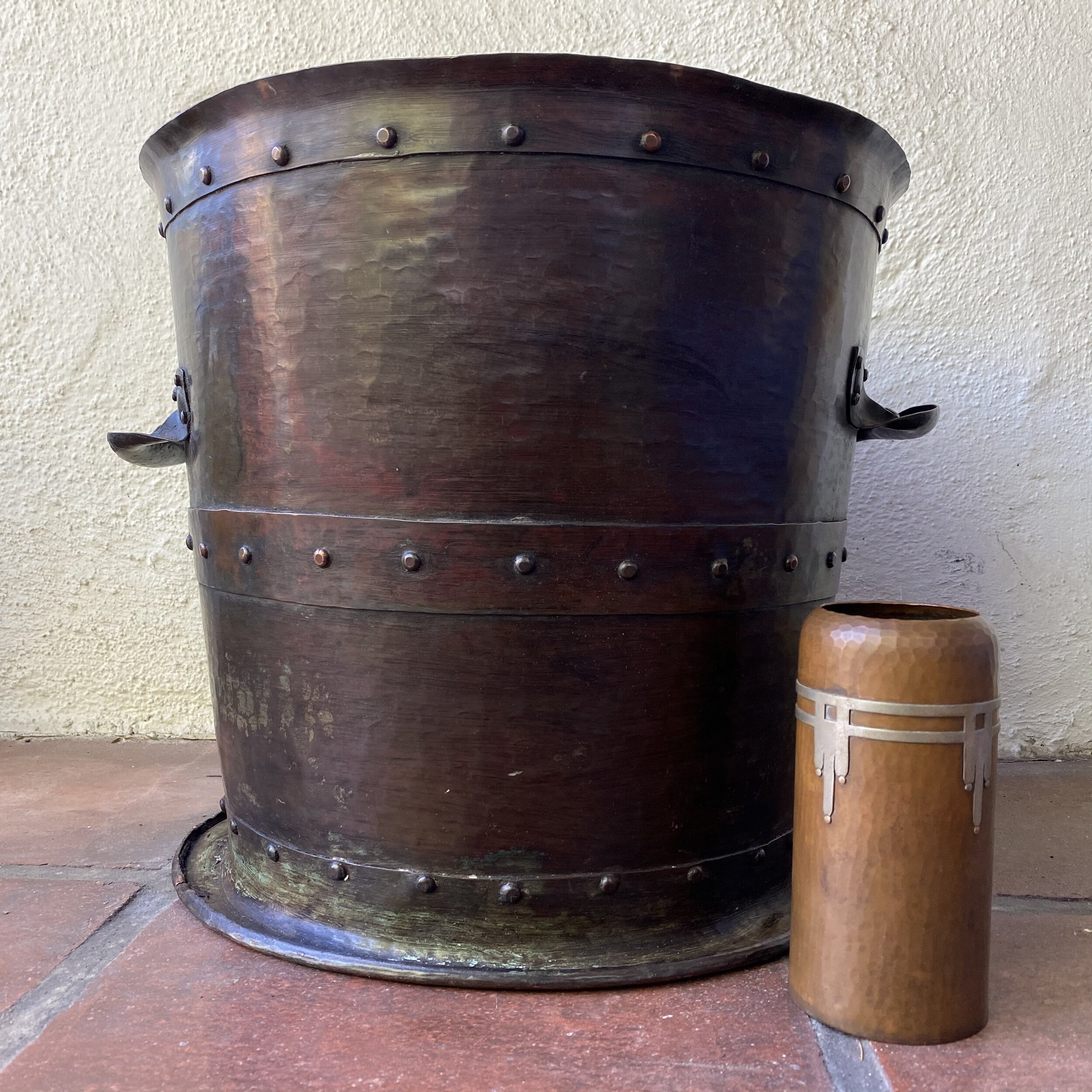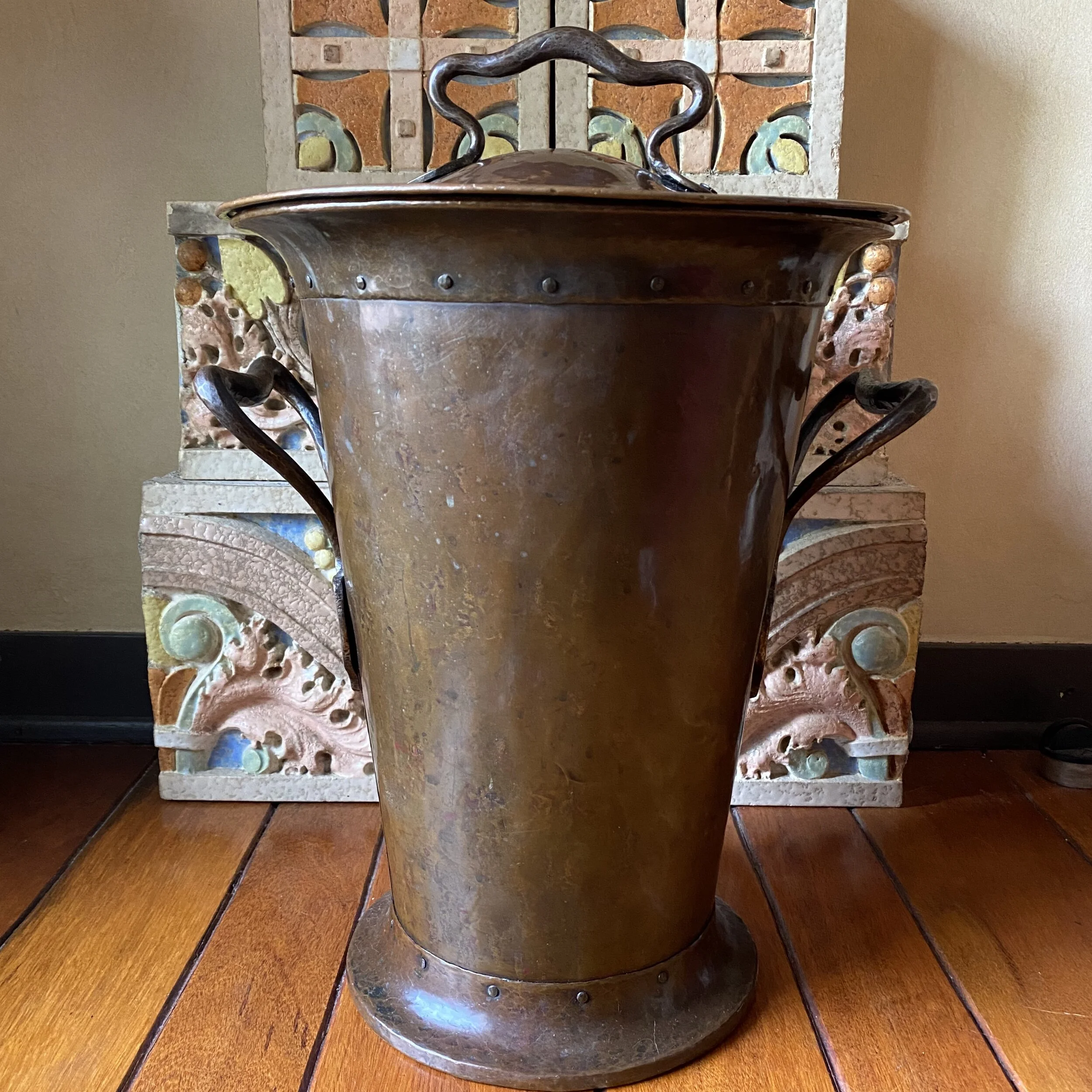 Norman & Ernest Spittle opened their metal shop in Birmingham England in the late 1890s. By 1900, The Studio Magazine was featuring their copper work and praising their designs & workmanship. A period catalog shows the depth of their line from household objects to lighting to architectural installations. It is believed the Art Fittings Ltd firm of London represented the Spittles work and this has likely lead to the confusion over the true origins of their work & its influence on the American work of Gustav Stickley.