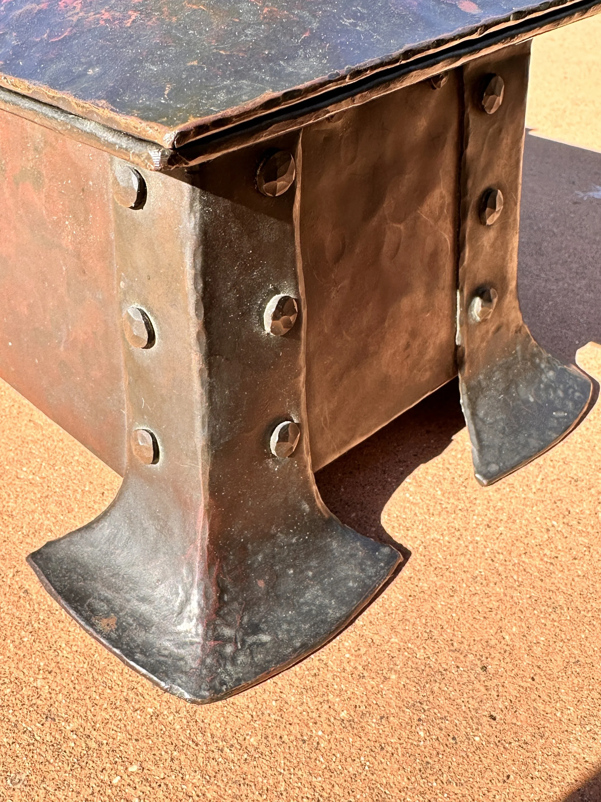 Spittle Brothers / Art Fittings Limited hammered copper cigar box, Birmingham England circa 1903. Designed and crafted by Norman Spittle and retailed by their London showroom, Art Fittings Ltd around 1902/4. In 1903, Gustav Stickley visited London and purchased a few dozen objects from Art Fittings, many of which became the foundation for his own metal shop designs. This rare copper cigar box form was purchased by Gustav Stickley on this trip and exhibited in his seminal Rochester show in 1904 (see photo). In 1905, Stickley published his first metalwork catalog and put this box into production, but opted for the version with the loop handle and removable lid. This box form is exceedingly rare, we have only ever seen two; both of which we purchased directly from a collector in Birmingham. Unsigned. Original red & brown patina & cedar interior box (no lid). 11.5″w x 7.5″d x 6.75″h. SOLD