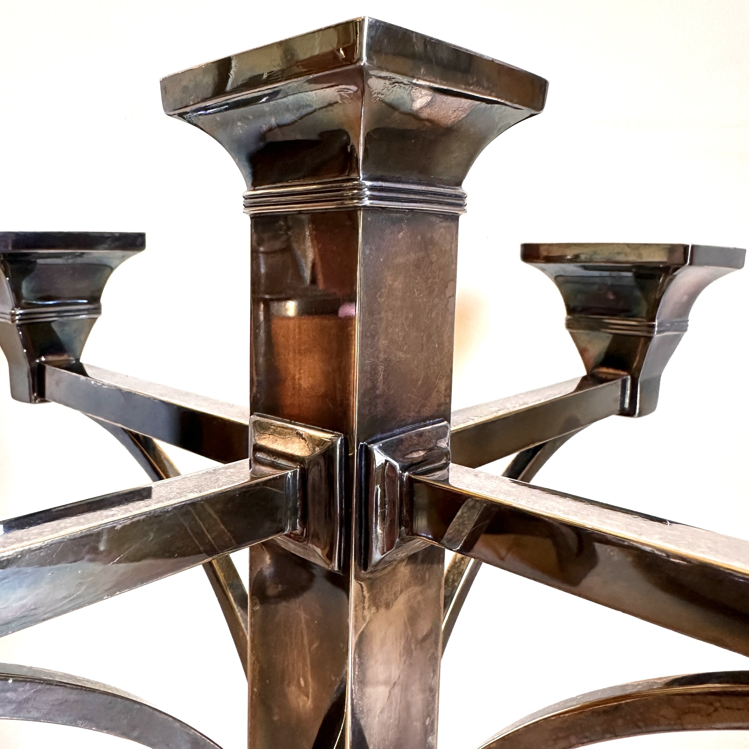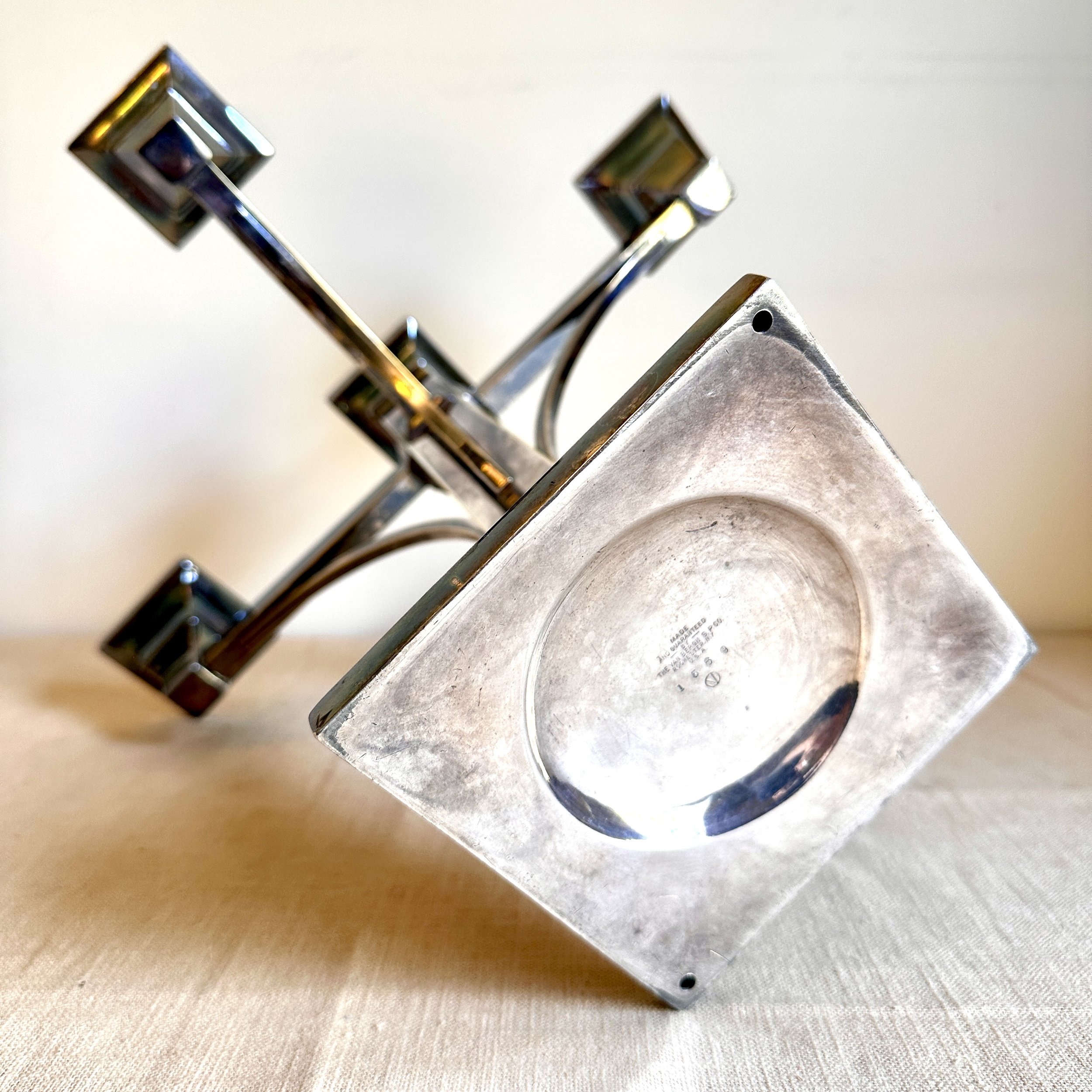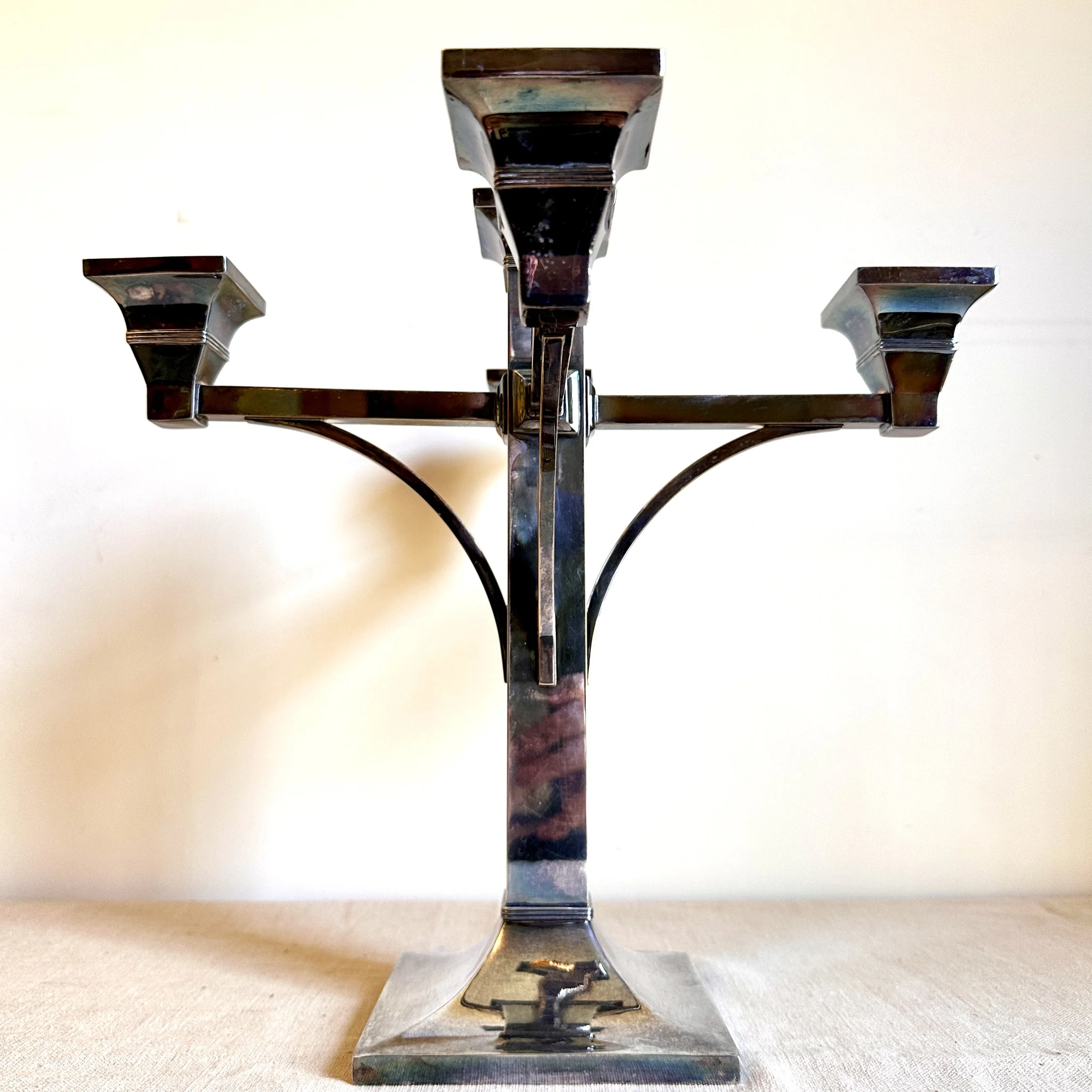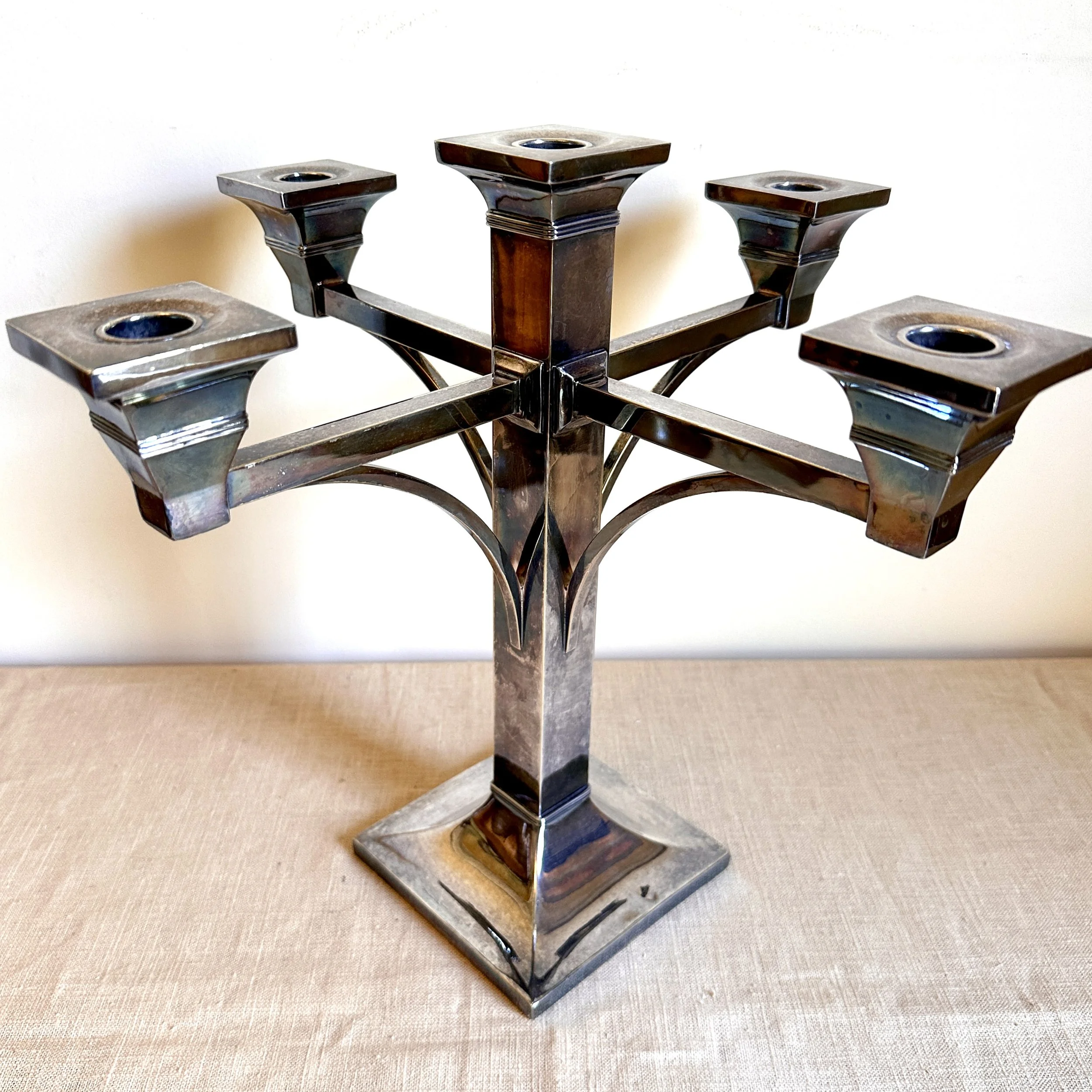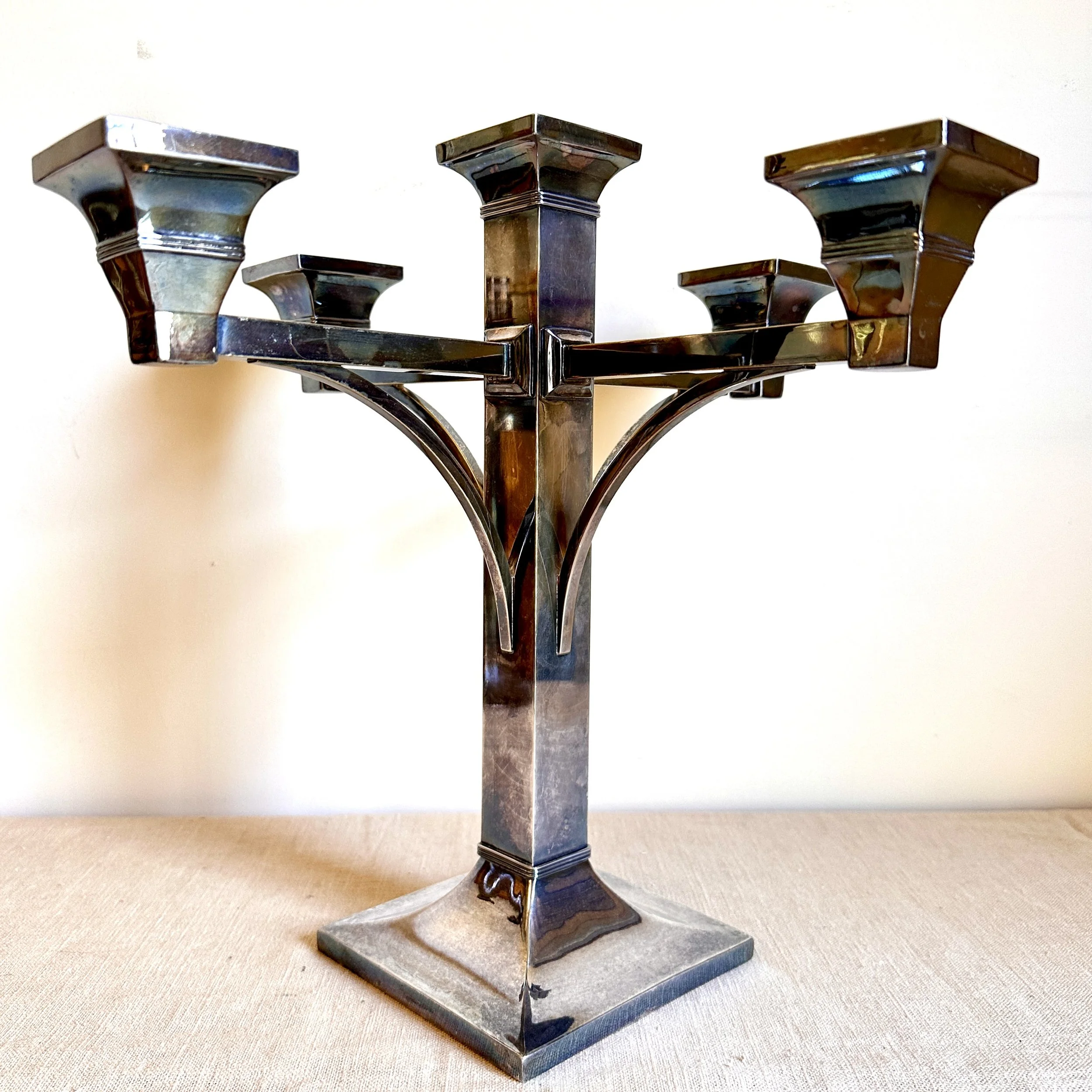 Van Bergh Silver Plate Company candelabra, Rochester NY circa 1905. A large and heavy five light candelabra in silver plated metal, the form heavily architectural in the design and would go well with a Prairie School collection. Lightly polished with some darkened areas, excellent condition. Measures 13” tall, 14,25” wide and 5.25” square at base. $450