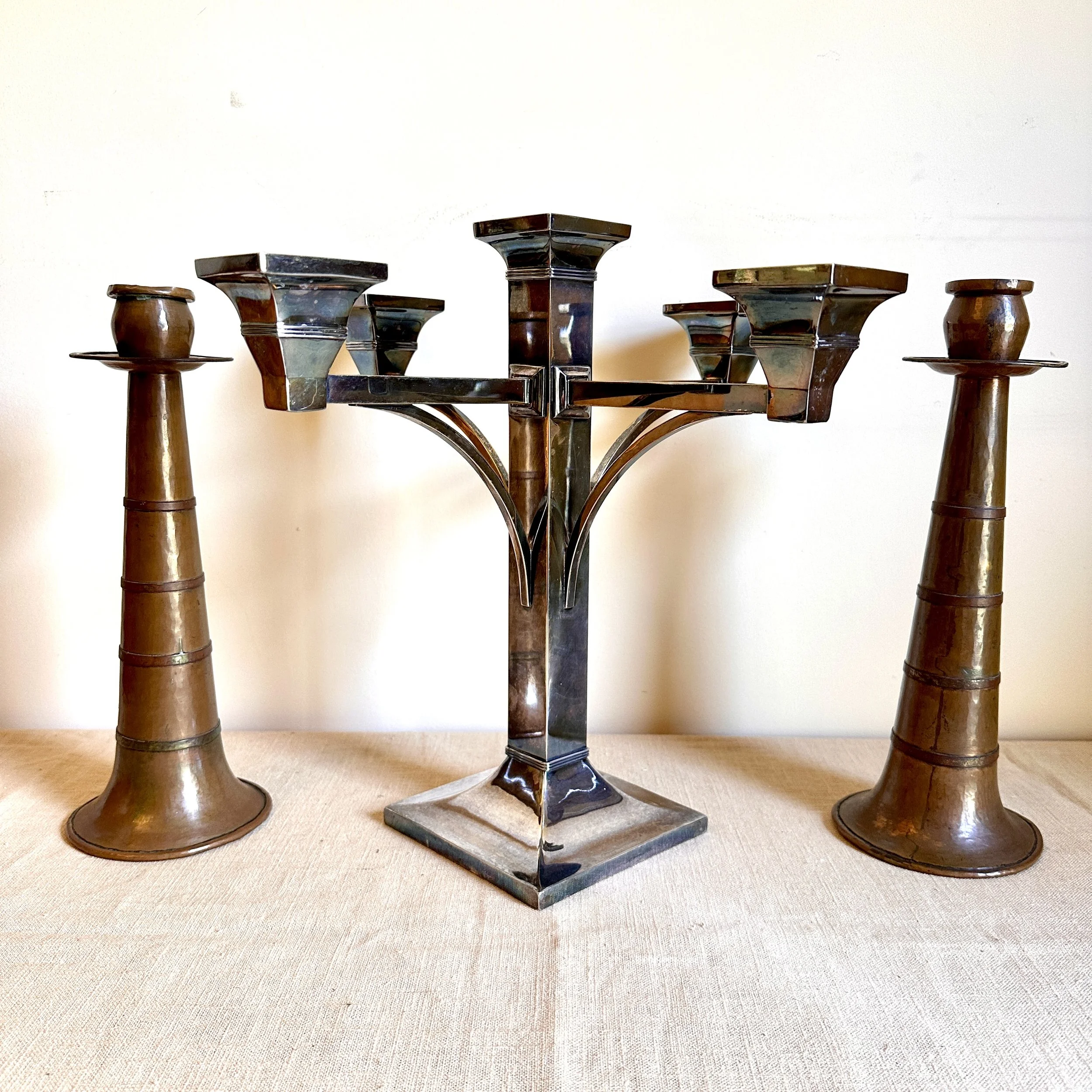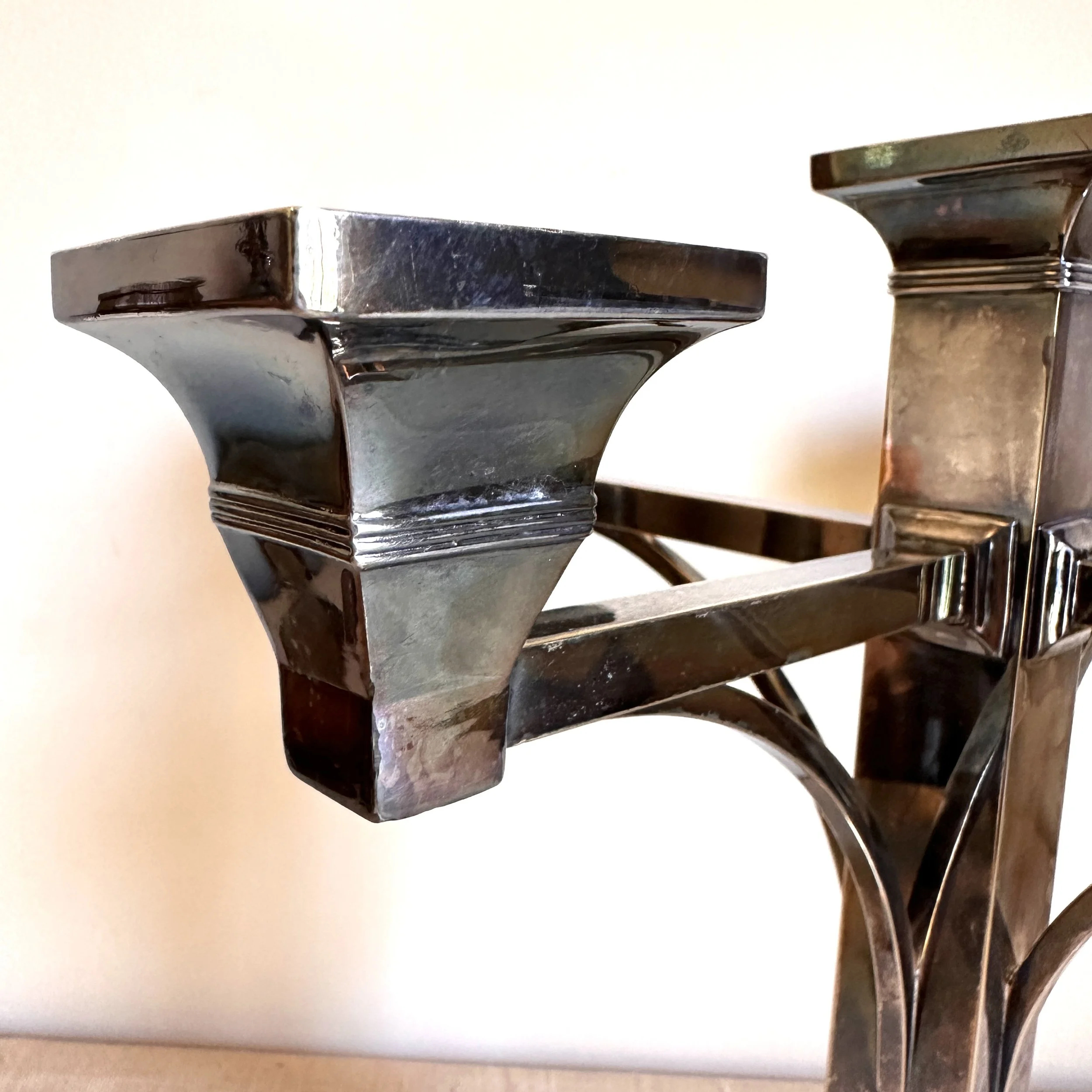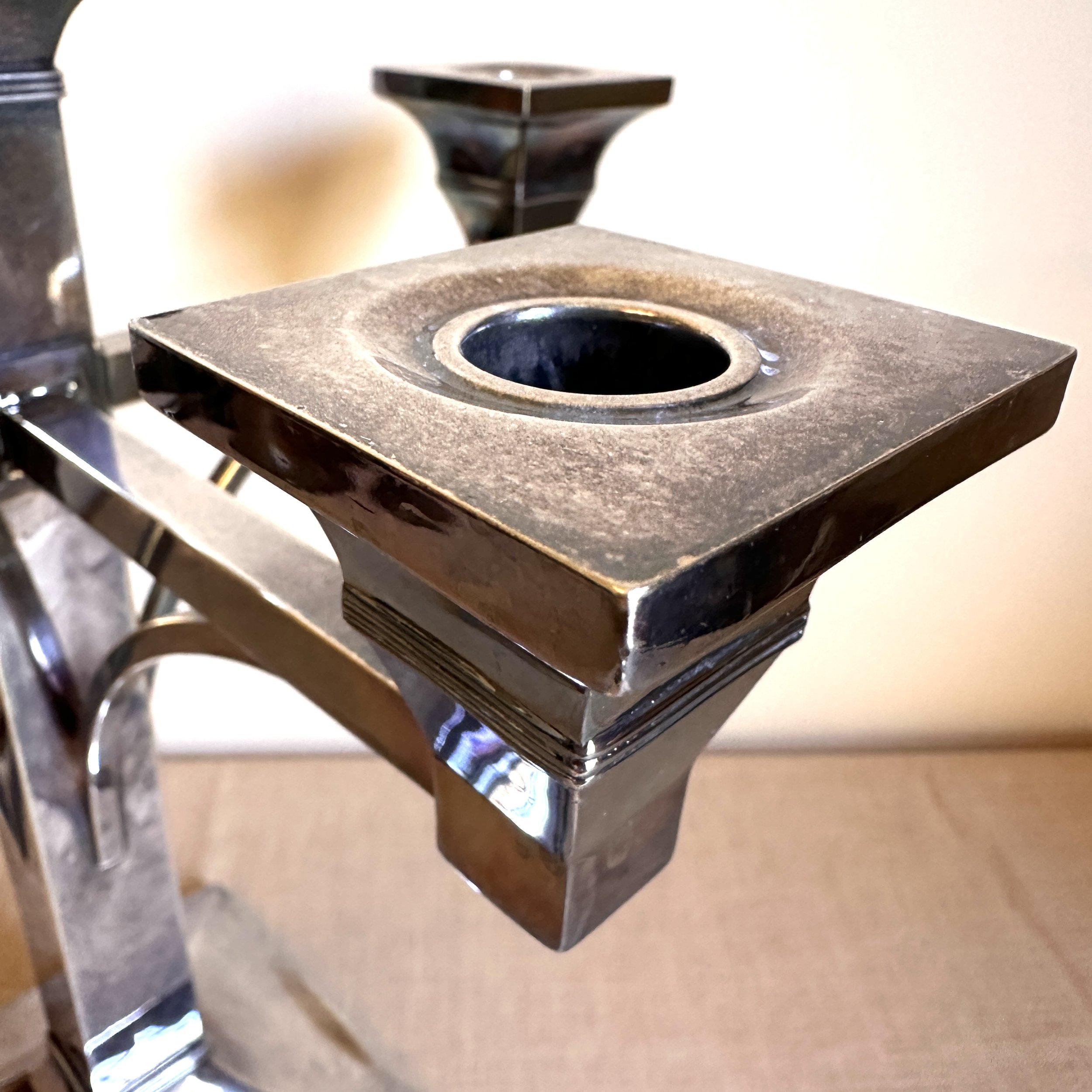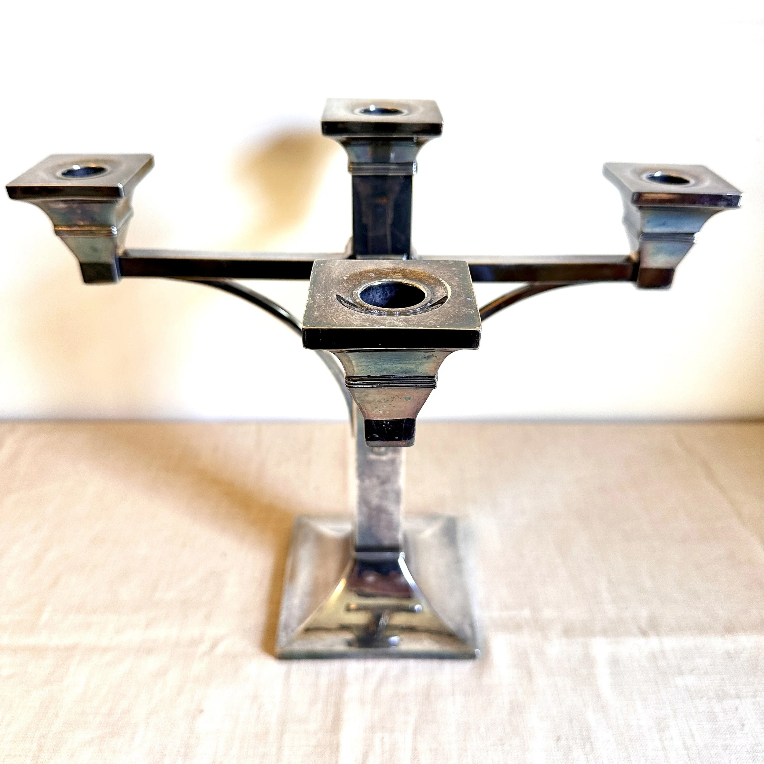 Van Bergh Silver Plate Company candelabra, Rochester NY circa 1905. A large and heavy five light candelabra in silver plated metal, the form heavily architectural in the design and would go well with a Prairie School collection. Lightly polished with some darkened areas, excellent condition. Measures 13” tall, 14,25” wide and 5.25” square at base. $450