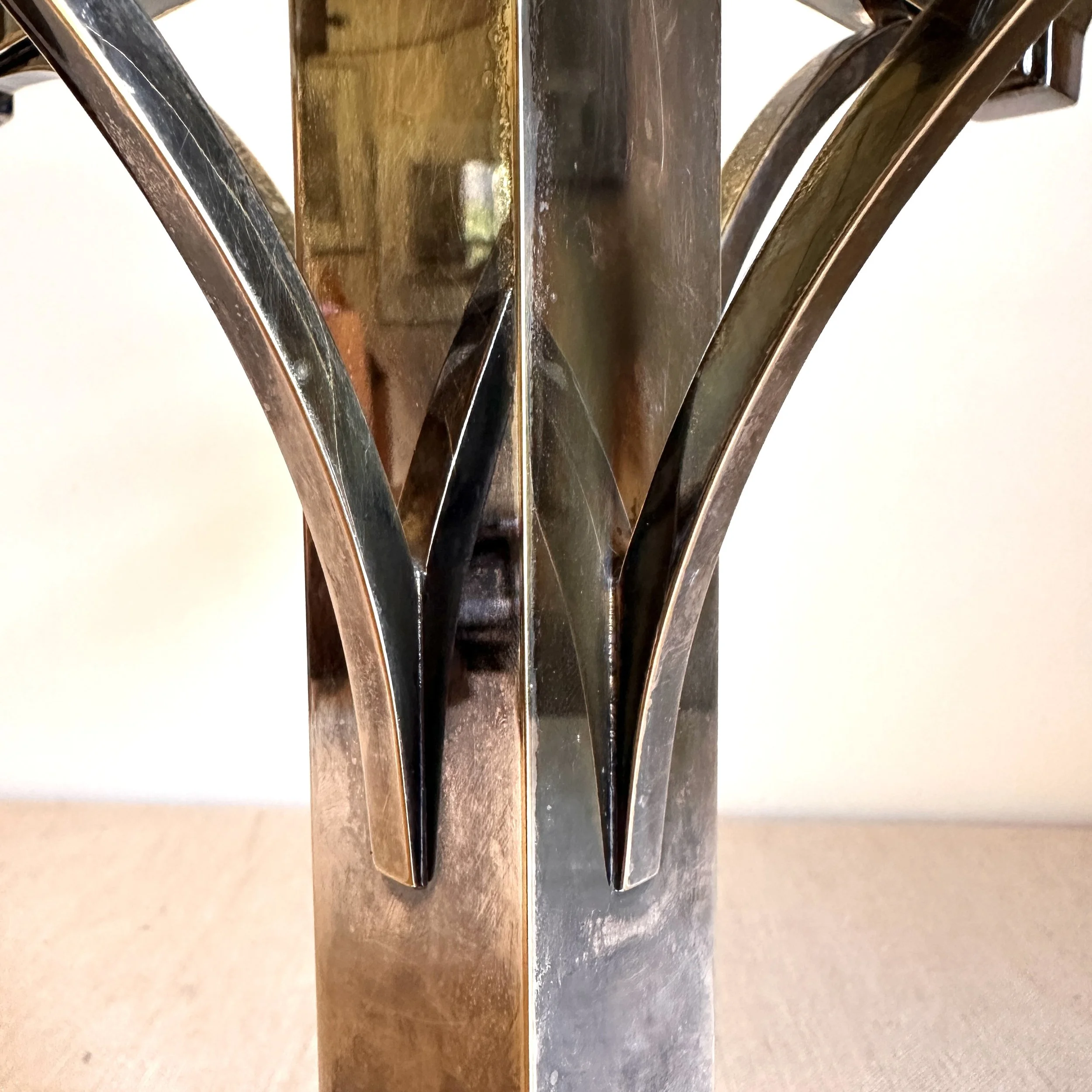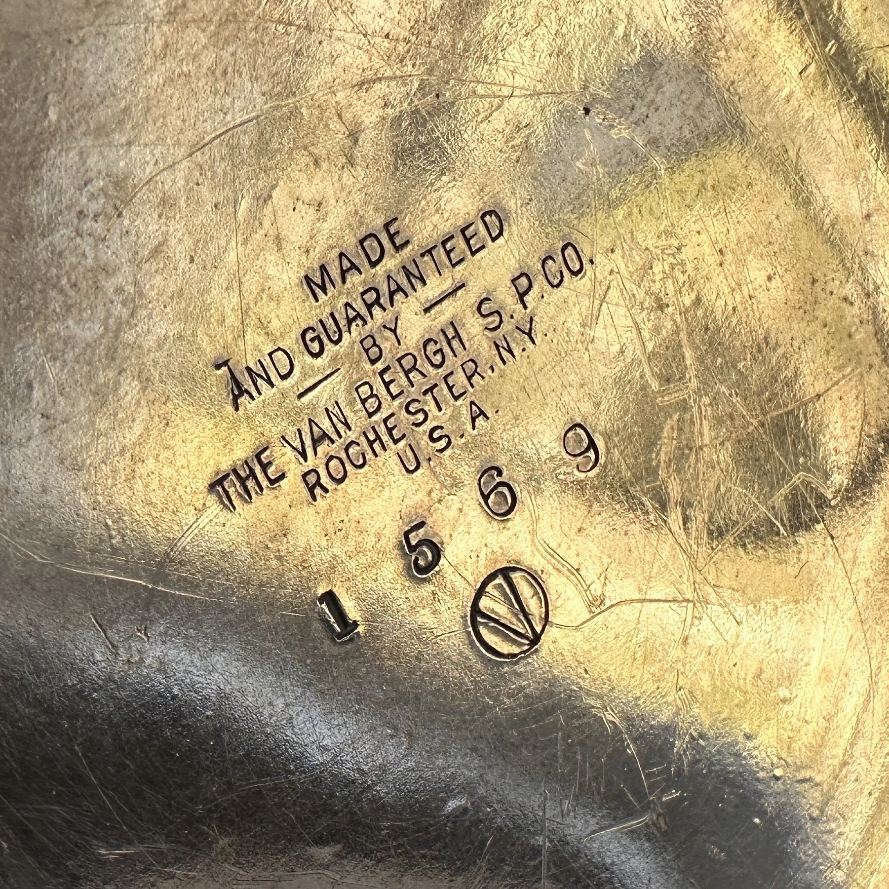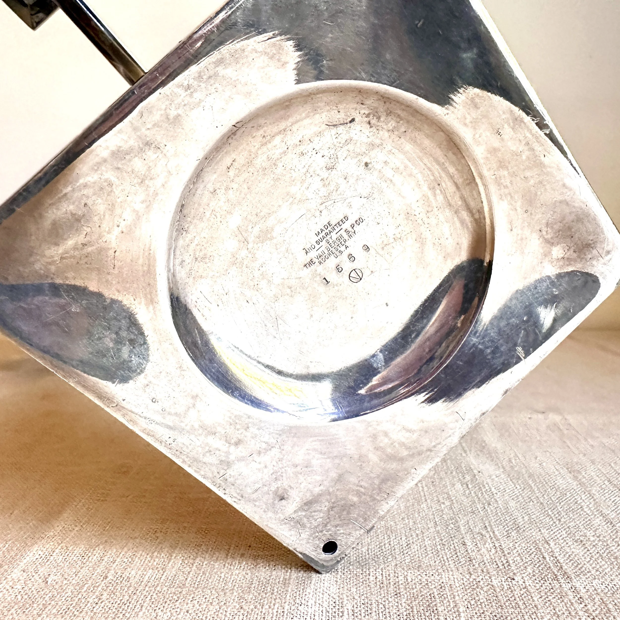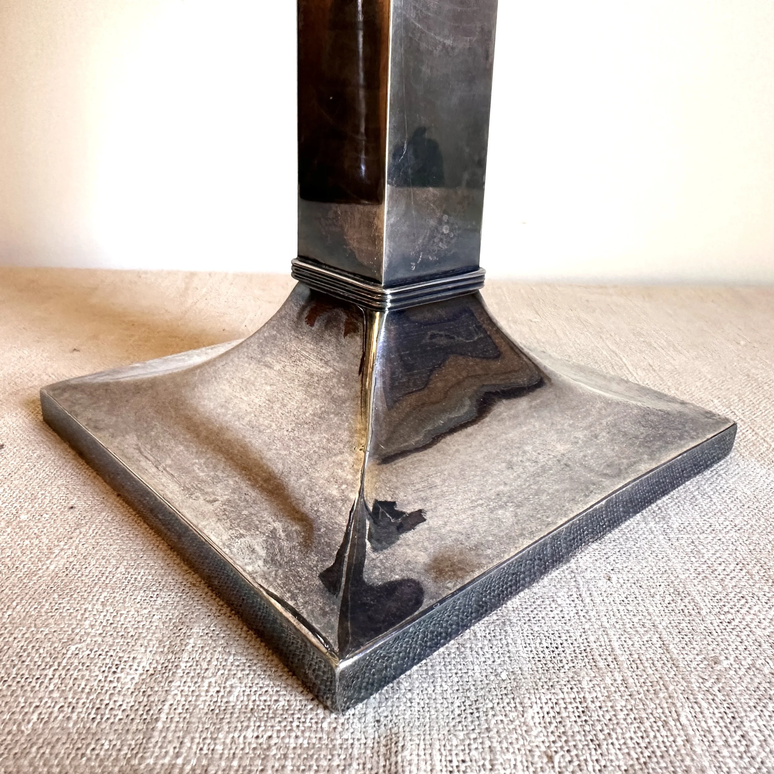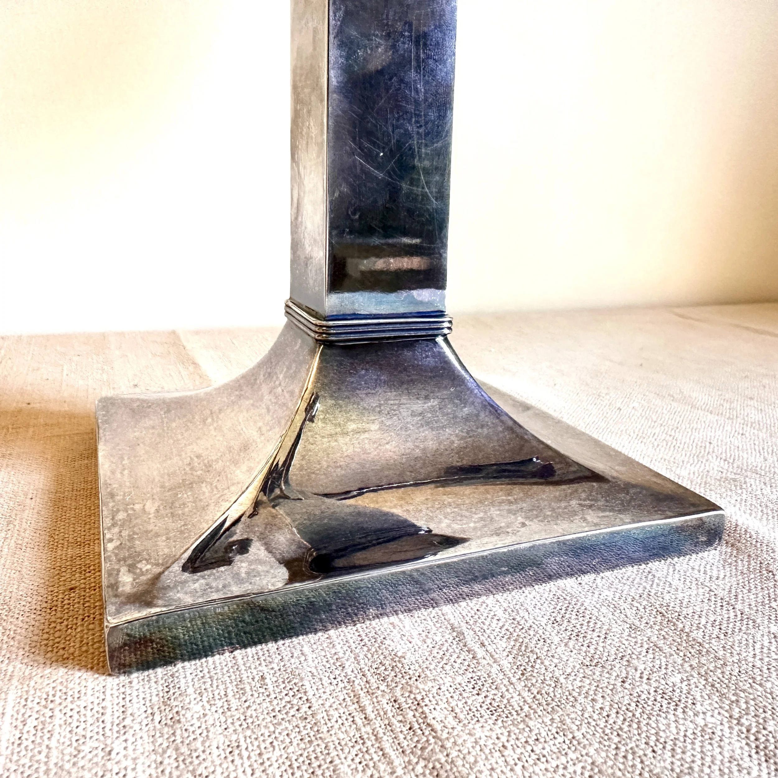 Van Bergh Silver Plate Company candelabra, Rochester NY circa 1905. A large and heavy five light candelabra in silver plated metal, the form heavily architectural in the design and would go well with a Prairie School collection. Lightly polished with some darkened areas, excellent condition. Measures 13” tall, 14,25” wide and 5.25” square at base. $450